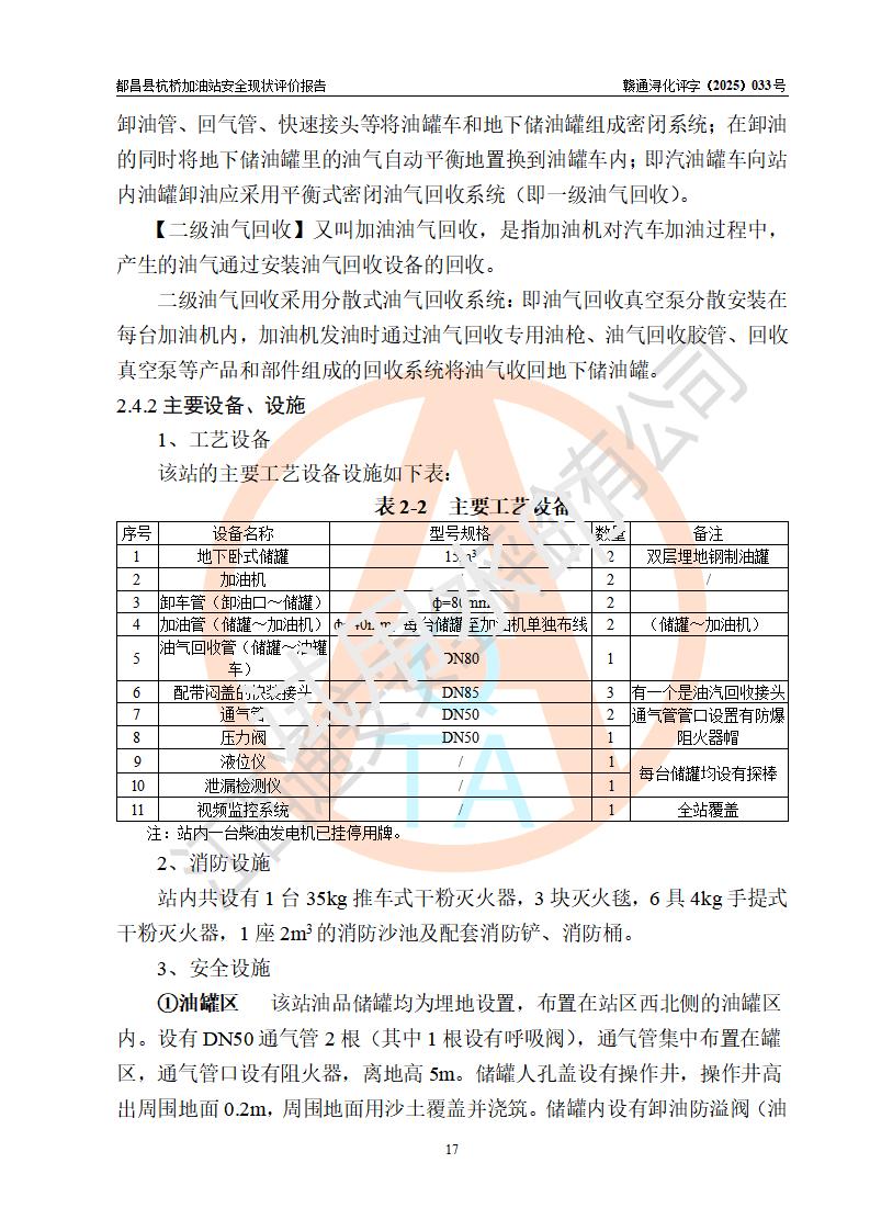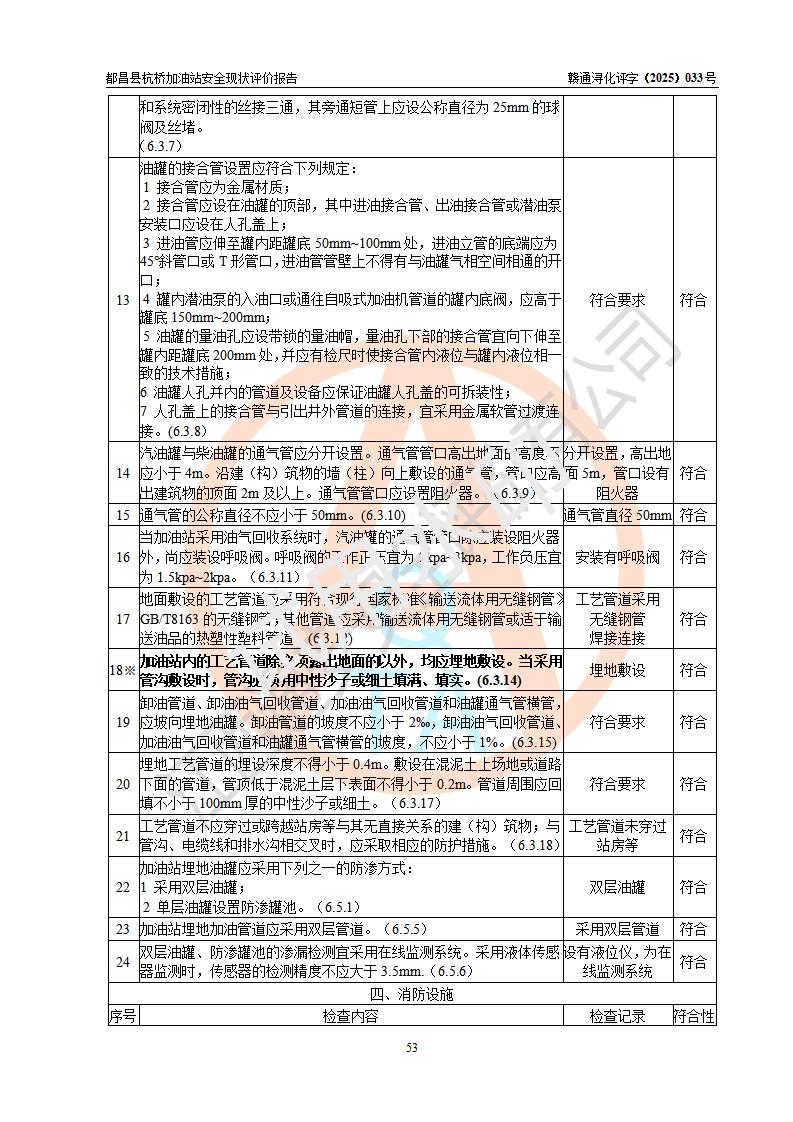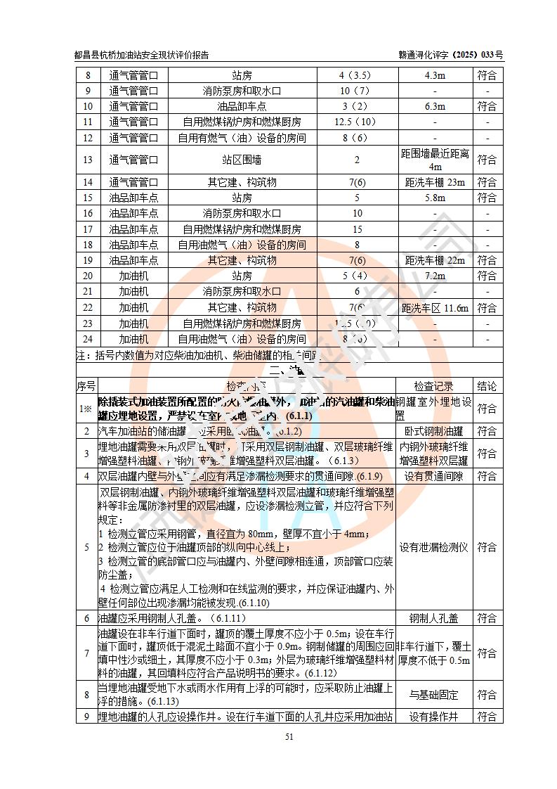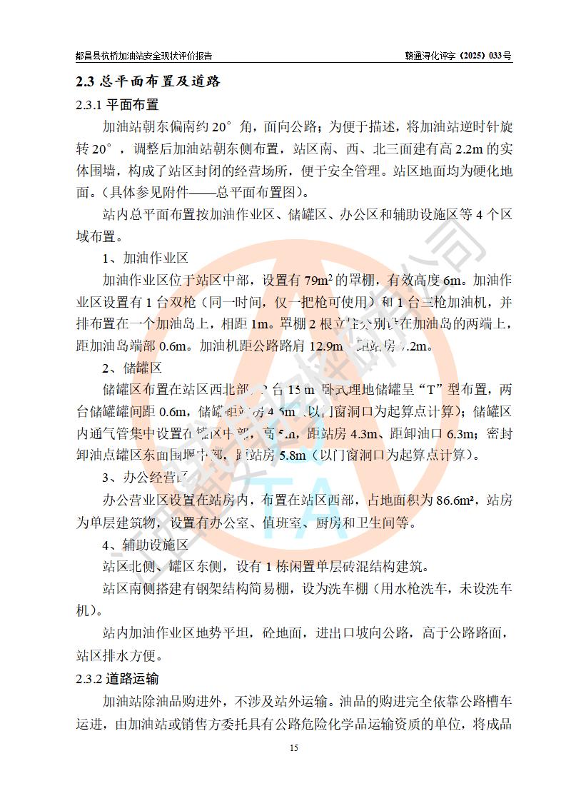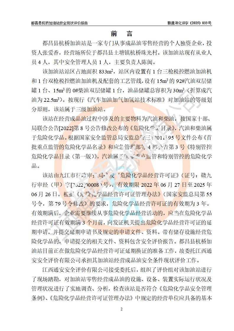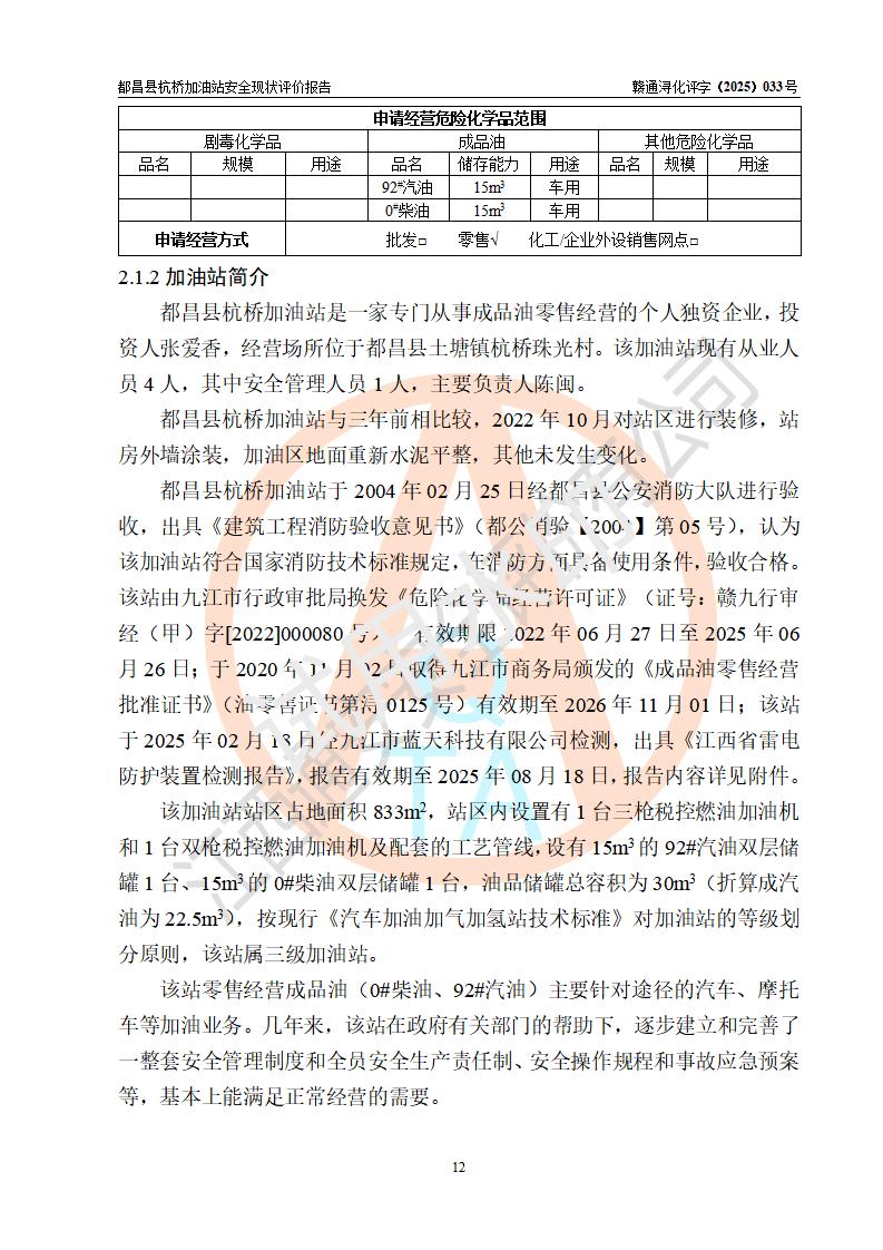 都昌县杭桥加油站是一家专门从事成品油零售经营的个人独资企业,投资人张爱香,经营场所位于都昌县土塘镇杭桥珠光村。该加油站现有从业人员4人,其中安全管理人员1人,主要负责人陈闽。 该加油站站区占地面积833m2,站区内设置有1台三枪税控燃油加油机和1台双枪税控燃油加油机及配套的工艺管线,设有15m3的92#汽油双层储罐1台、15m3的0#柴油双层储罐1台,油品储罐总容积为30m3(折算成汽油为22.5m3)。按现行《汽车加油加气加氢站技术标准》对加油站的等级划分原则,该站属于三级加油站。 该站由九江市行政审批局换发《危险化学品经营许可证》(证号:赣九行审经(甲)字[2022]000080号),**期限2022年06月27日至2025年06月26日。 |