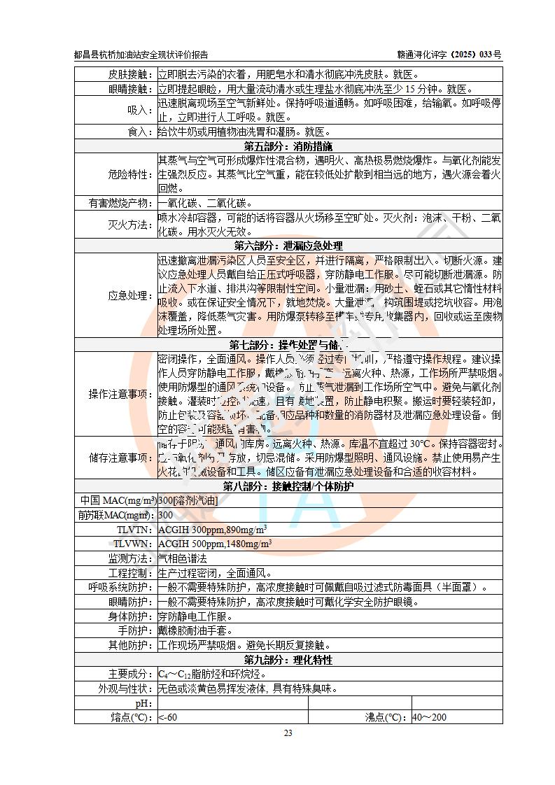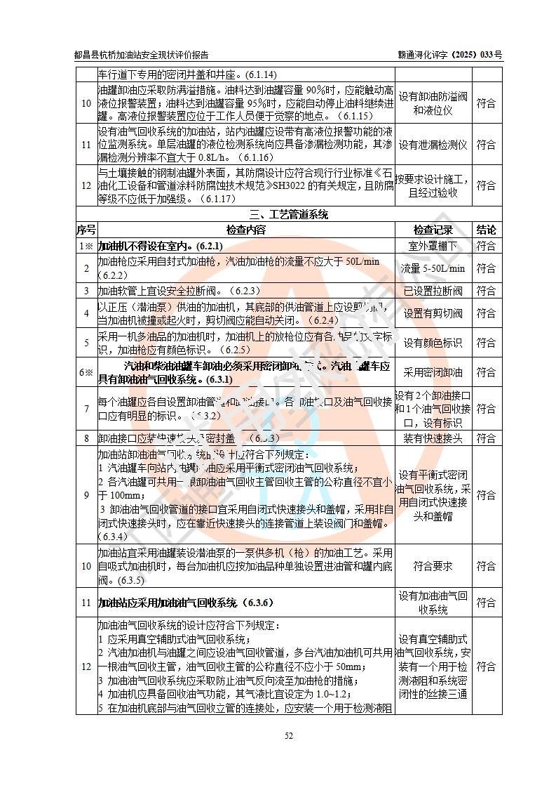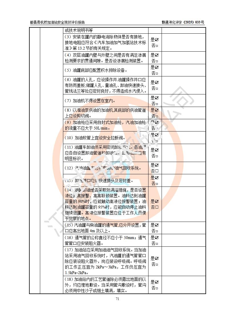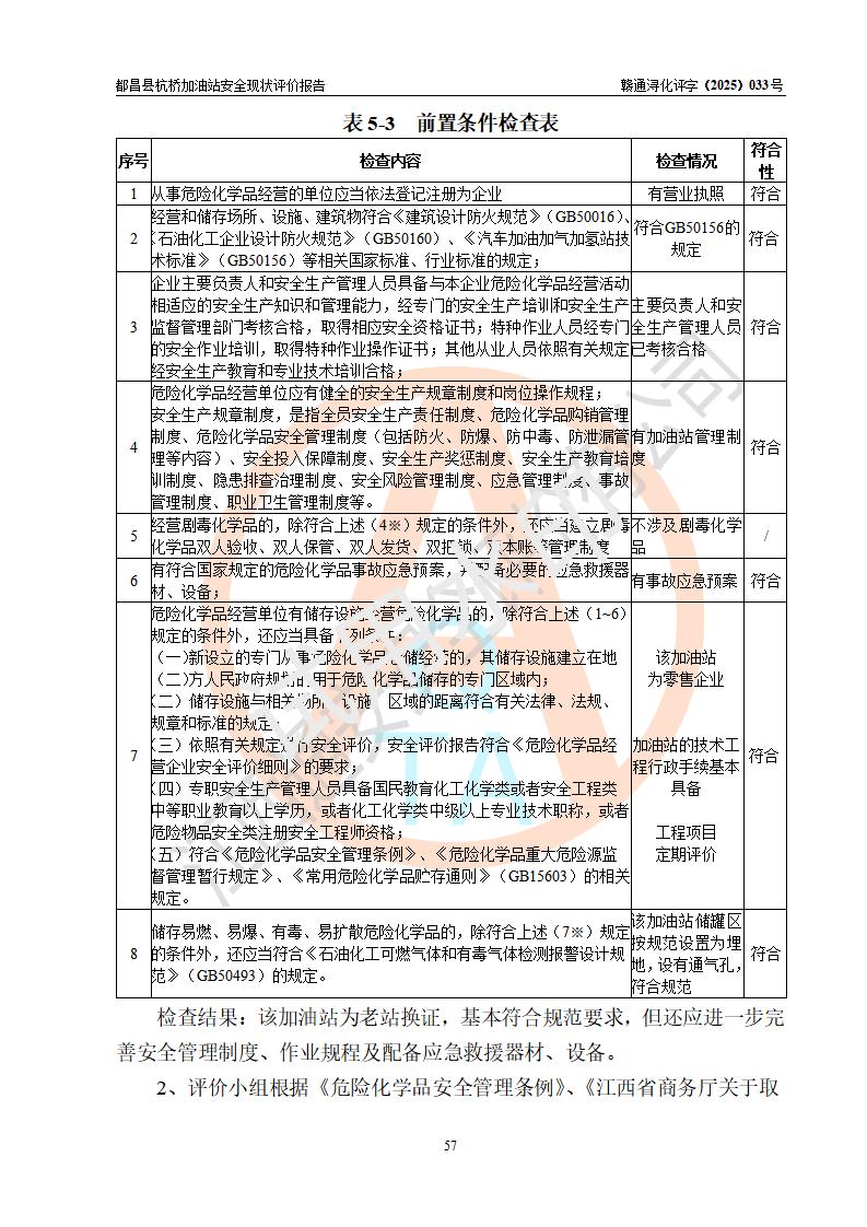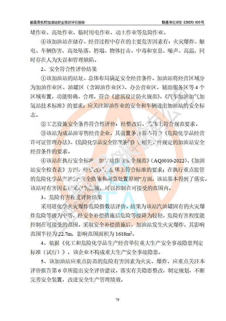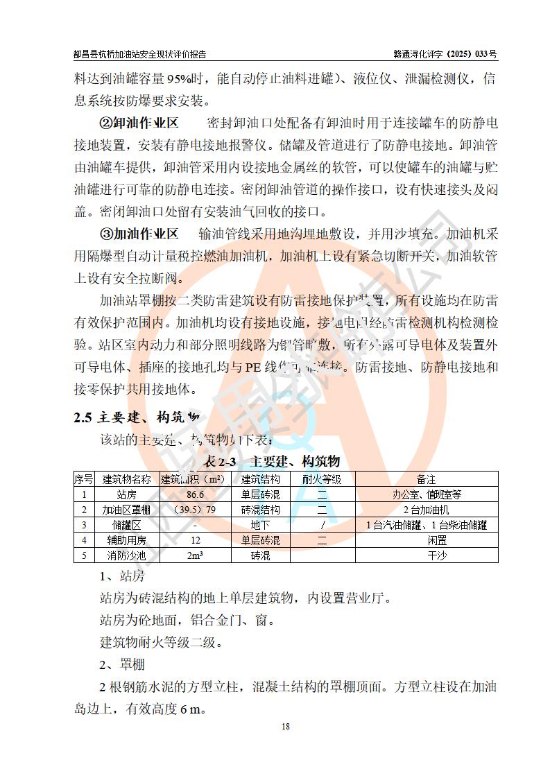 都昌县杭桥加油站是一家专门从事成品油零售经营的个人独资企业,投资人张爱香,经营场所位于都昌县土塘镇杭桥珠光村。该加油站现有从业人员4人,其中安全管理人员1人,主要负责人陈闽。 该加油站站区占地面积833m2,站区内设置有1台三枪税控燃油加油机和1台双枪税控燃油加油机及配套的工艺管线,设有15m3的92#汽油双层储罐1台、15m3的0#柴油双层储罐1台,油品储罐总容积为30m3(折算成汽油为22.5m3)。按现行《汽车加油加气加氢站技术标准》对加油站的等级划分原则,该站属于三级加油站。 该站由九江市行政审批局换发《危险化学品经营许可证》(证号:赣九行审经(甲)字[2022]000080号),**期限2022年06月27日至2025年06月26日。 |