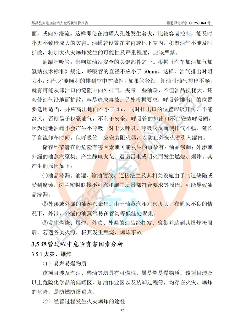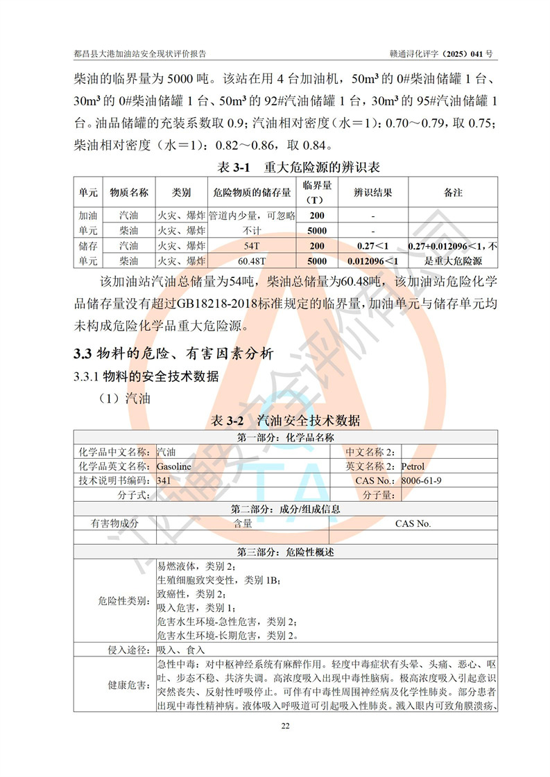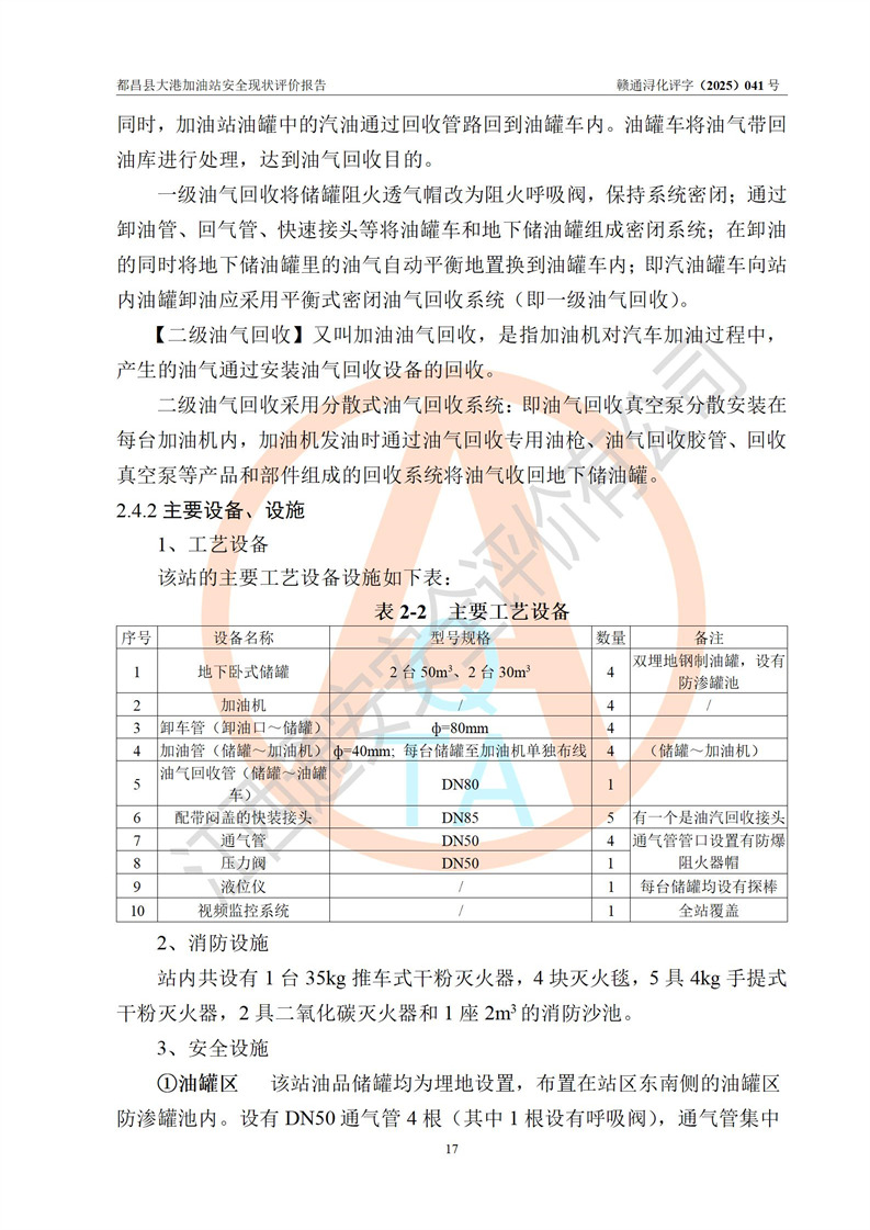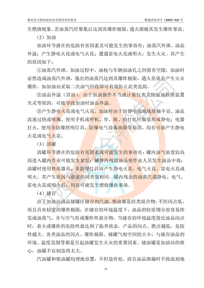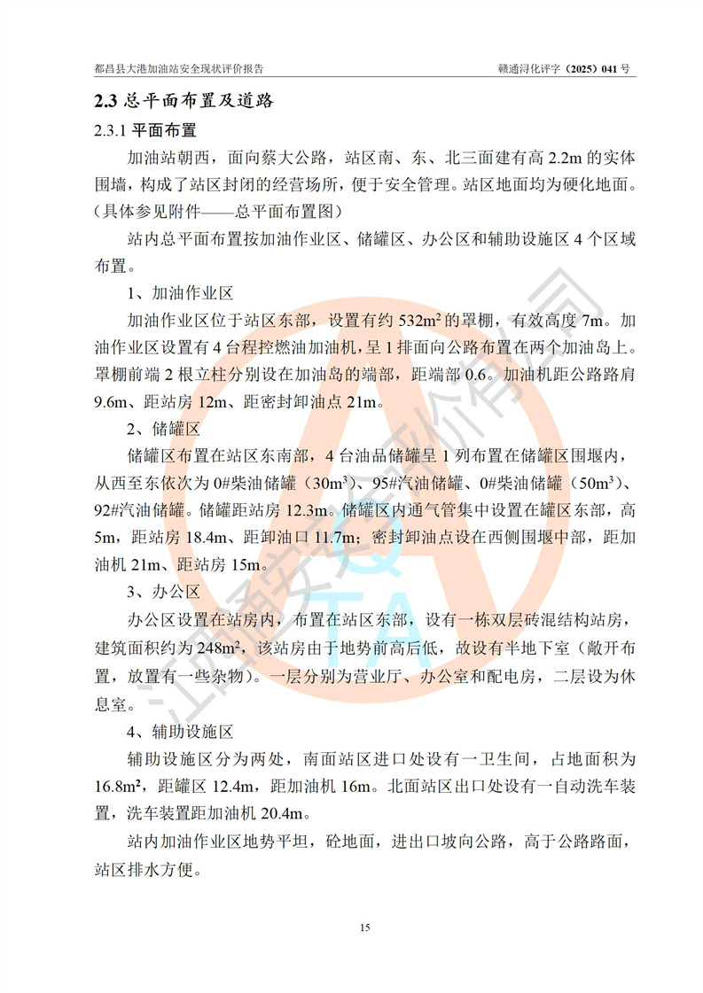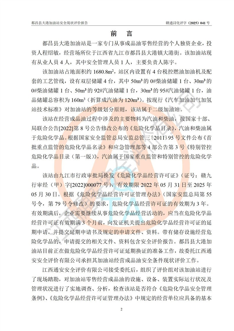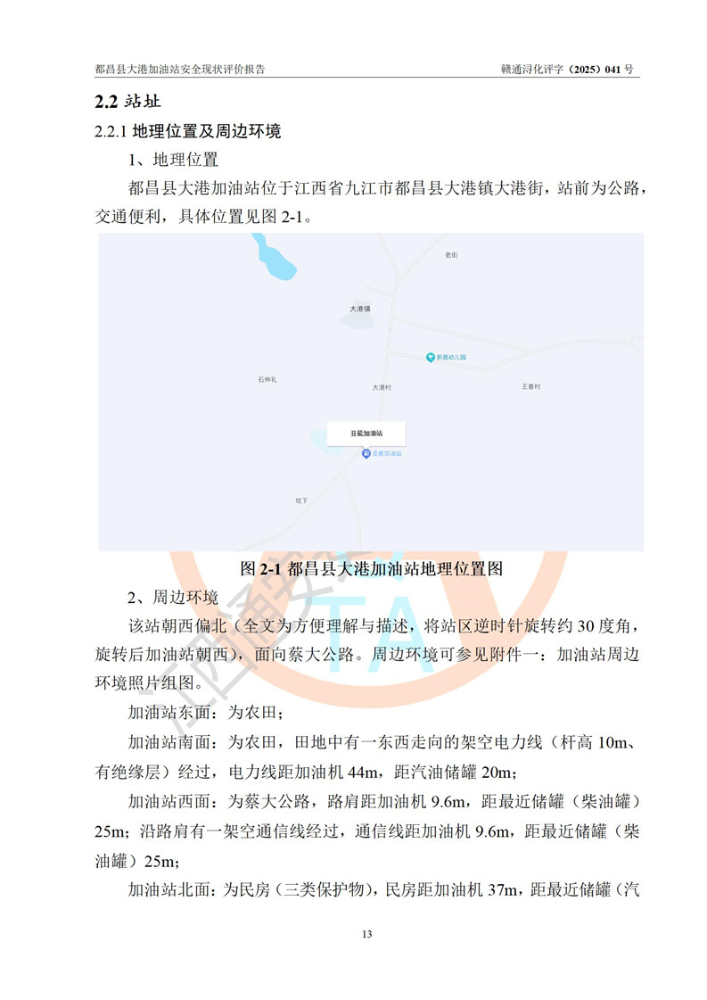 都昌县大港加油站是一家专门从事成品油零售经营的个人独资企业,投资人程绍敏,经营场所位于江西省九江市都昌县大港镇大港街。该加油站现有从业人员4人,其中安全管理人员1人,主要负责人陈宇。 该加油站占地面积约1680.8m2,站区内设置有4台税控燃油加油机及配套的工艺管线,设有双层储罐4台,其中50m3的0#柴油储罐1台、30m3的0#柴油储罐1台、50m3的92#汽油储罐1台,30m3的95#汽油储罐1台,油品储罐总容积为160m3(折算成汽油为120m3)。按现行《汽车加油加气加氢站技术标准》对加油站的等级划分原则,该站属于二级加油站。 该站在经营成品油过程中涉及的主要物料为汽油和柴油,按**十部、局联合公告[2022]第8号公告修改公布的《危险化学品目录》,汽油和柴油属于危险化学品。 |