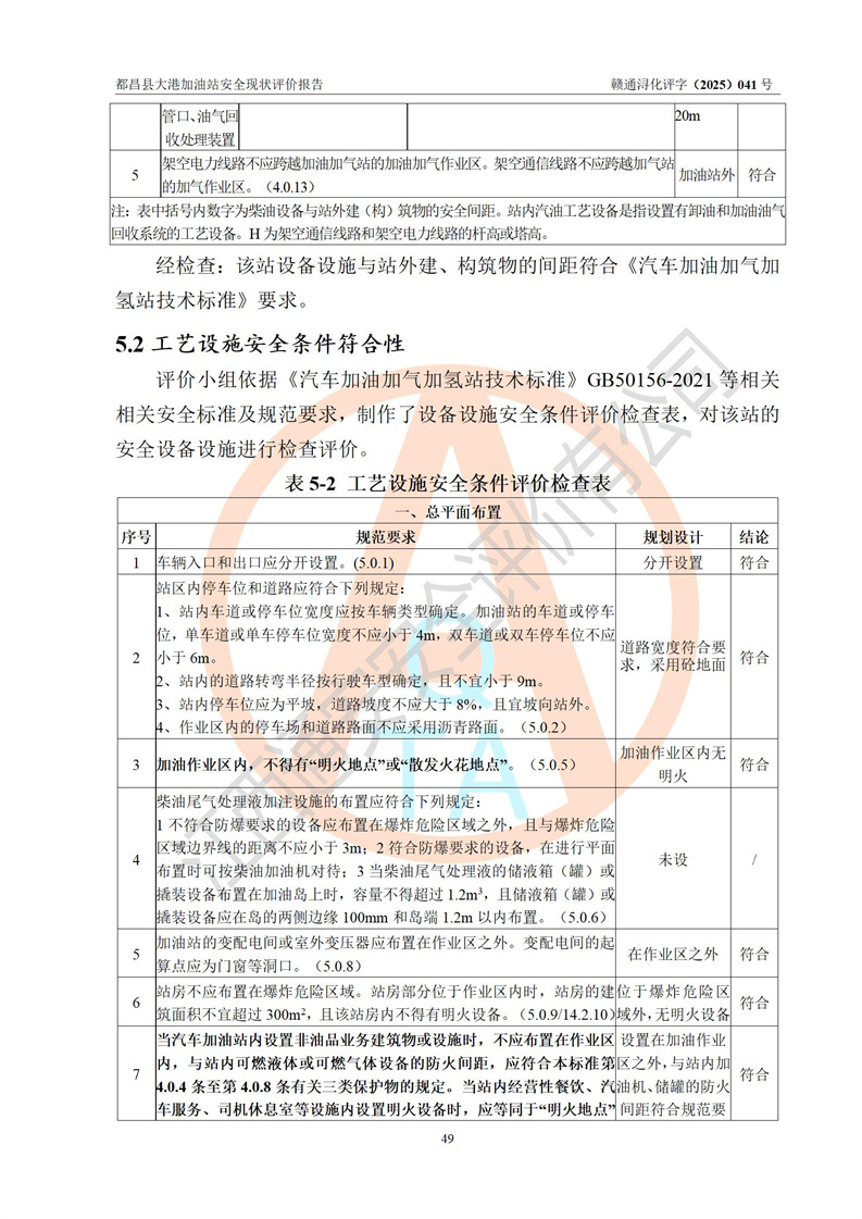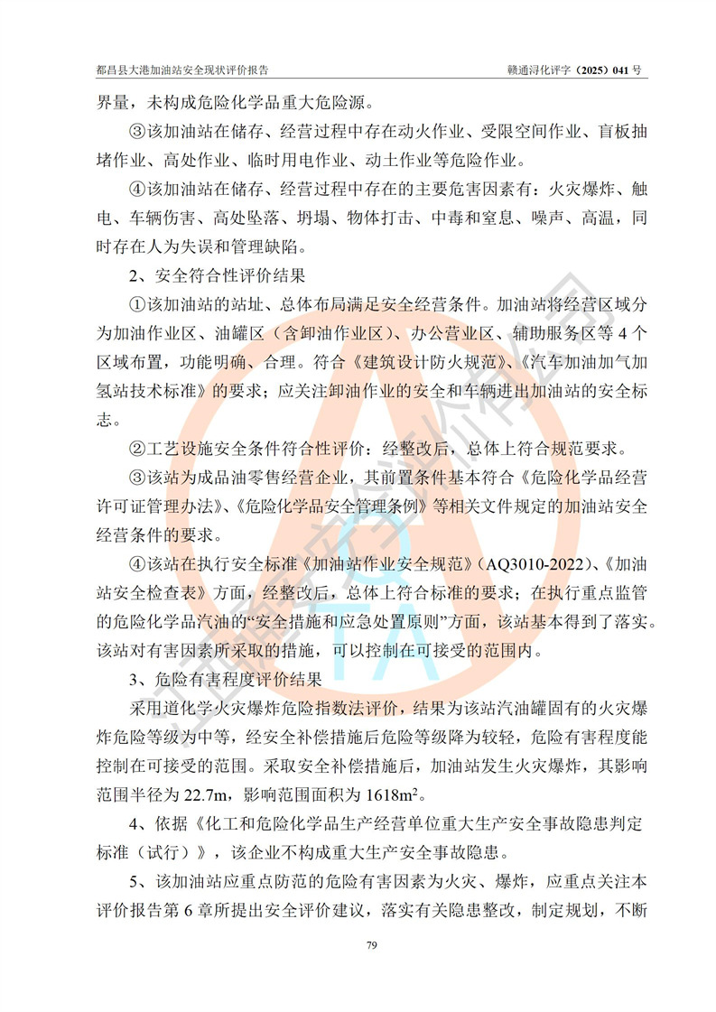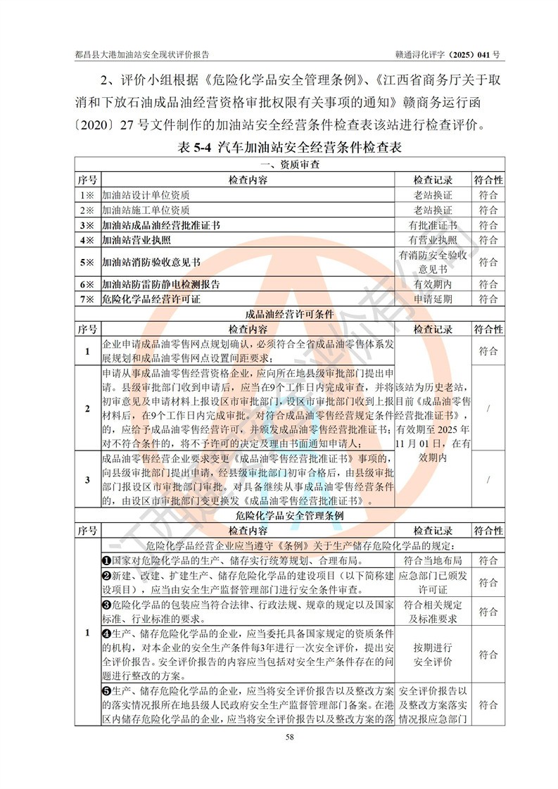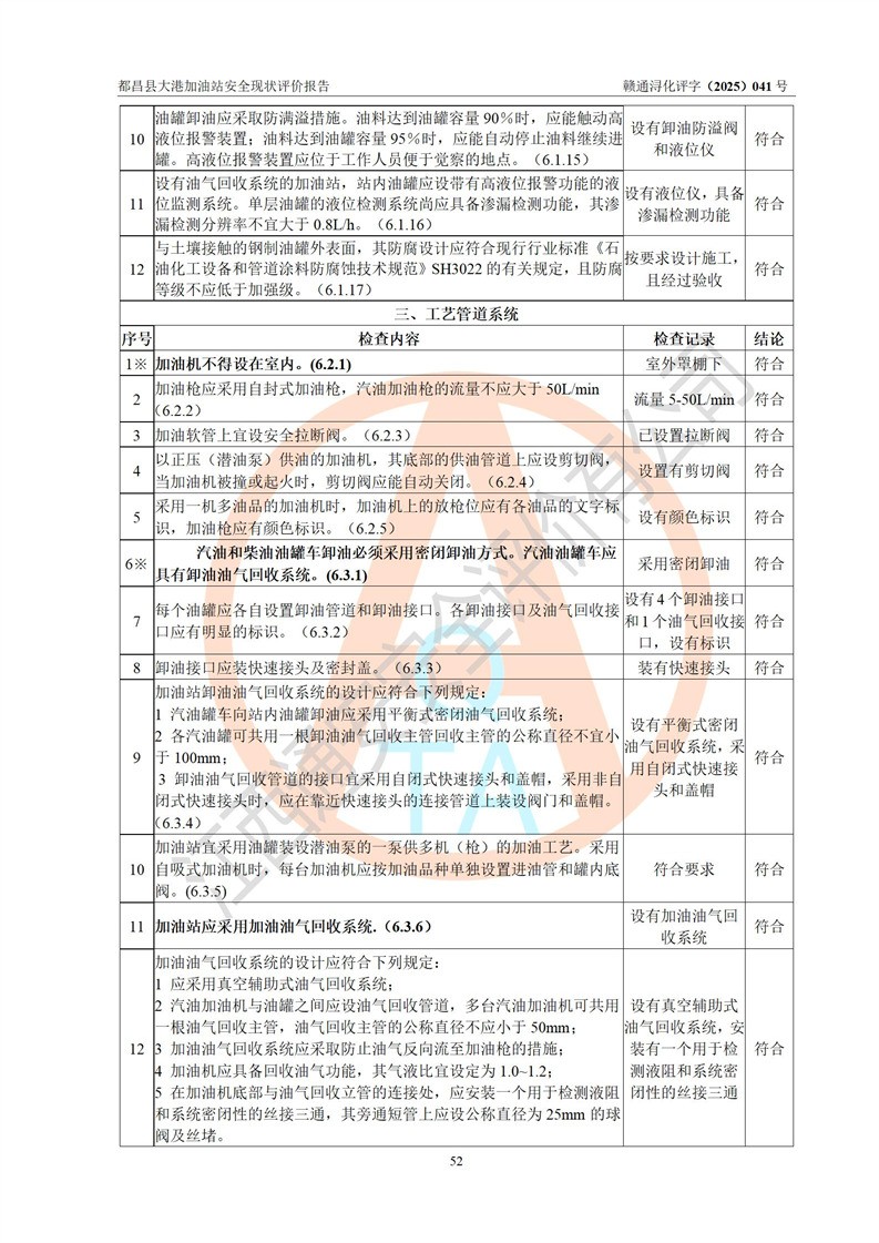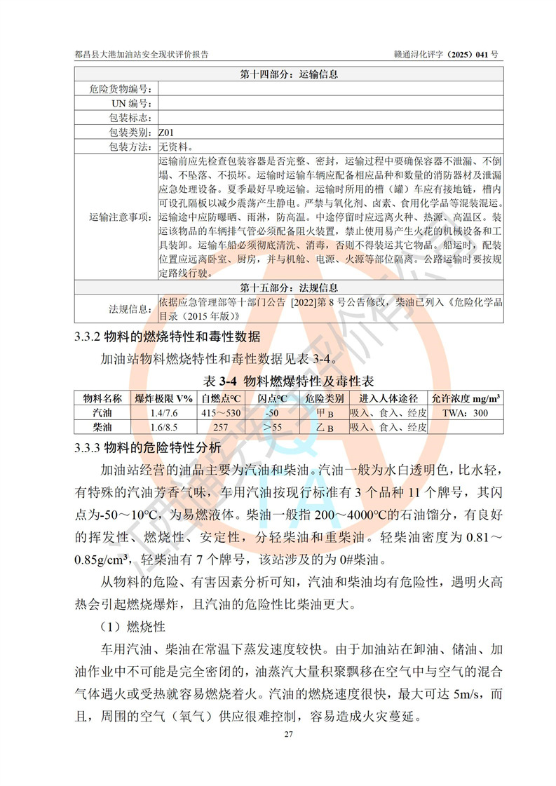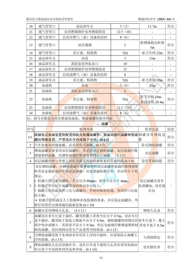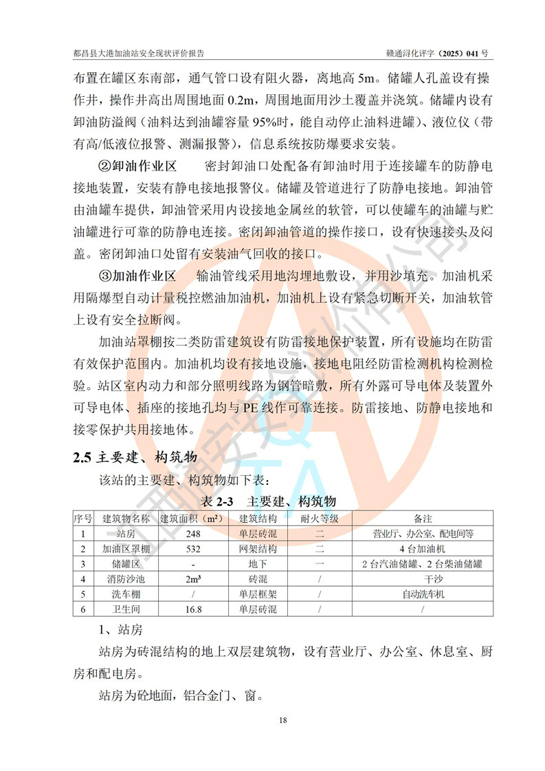 都昌县大港加油站是一家专门从事成品油零售经营的个人独资企业,投资人程绍敏,经营场所位于江西省九江市都昌县大港镇大港街。该加油站现有从业人员4人,其中安全管理人员1人,主要负责人陈宇。 该加油站占地面积约1680.8m2,站区内设置有4台税控燃油加油机及配套的工艺管线,设有双层储罐4台,其中50m3的0#柴油储罐1台、30m3的0#柴油储罐1台、50m3的92#汽油储罐1台,30m3的95#汽油储罐1台,油品储罐总容积为160m3(折算成汽油为120m3)。按现行《汽车加油加气加氢站技术标准》对加油站的等级划分原则,该站属于二级加油站。 该站在经营成品油过程中涉及的主要物料为汽油和柴油,按**十部、局联合公告[2022]第8号公告修改公布的《危险化学品目录》,汽油和柴油属于危险化学品。 |