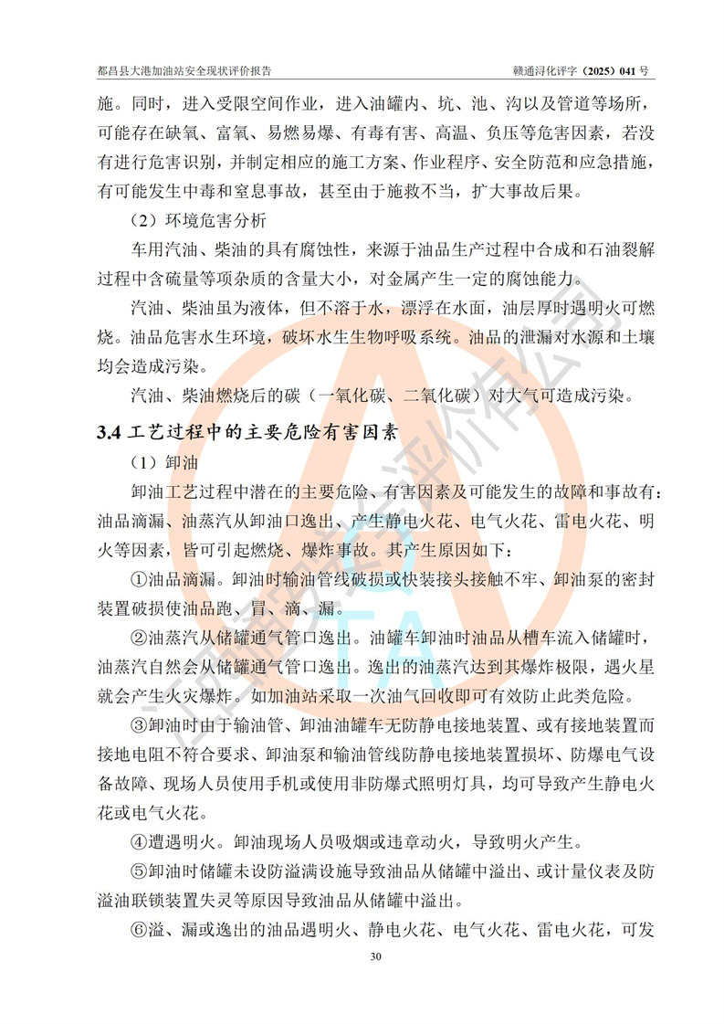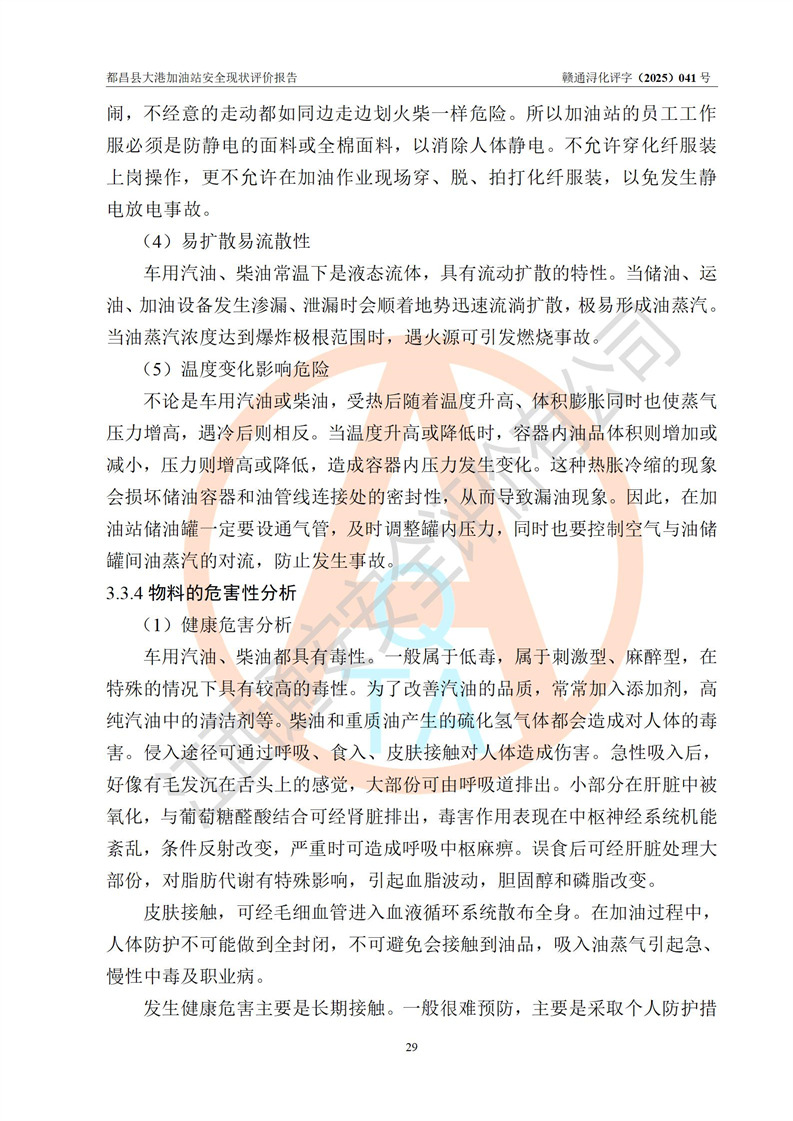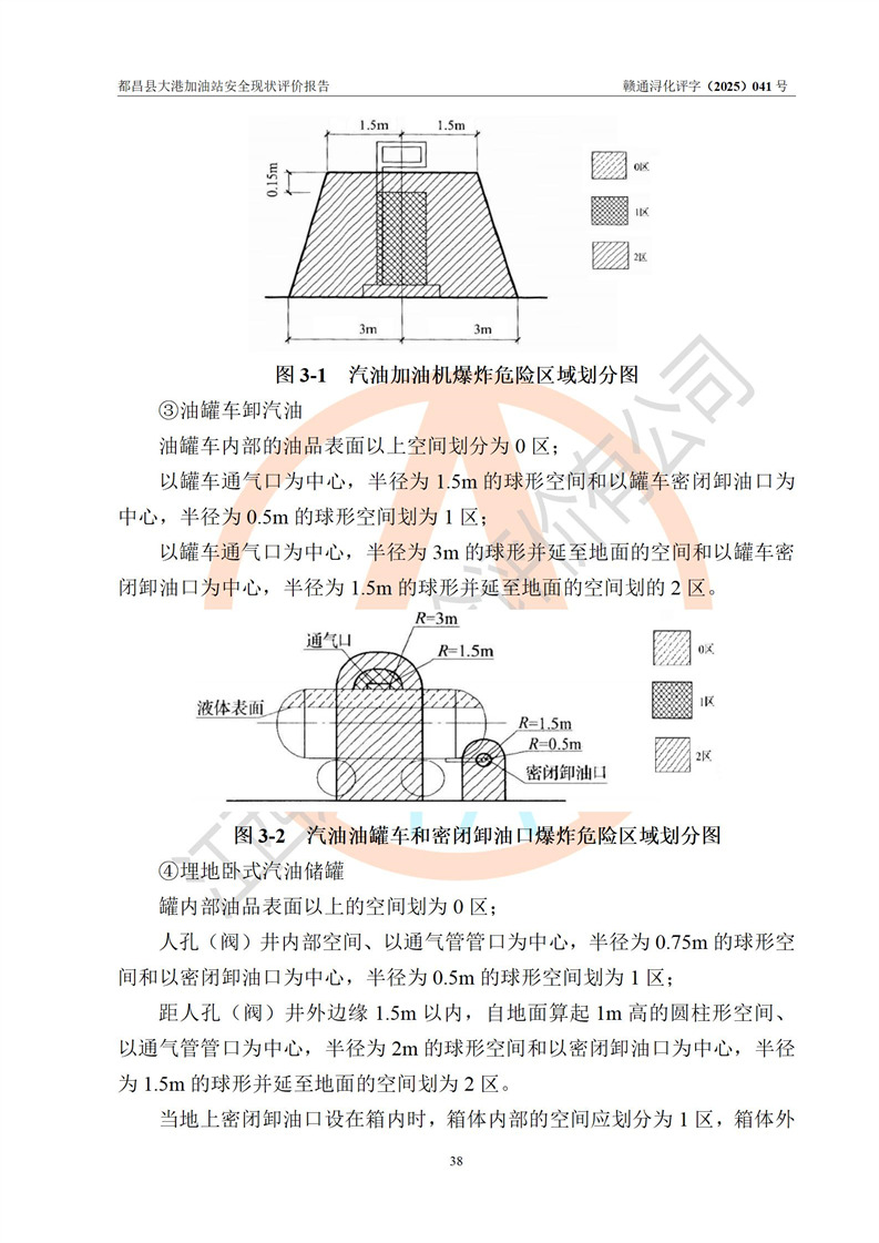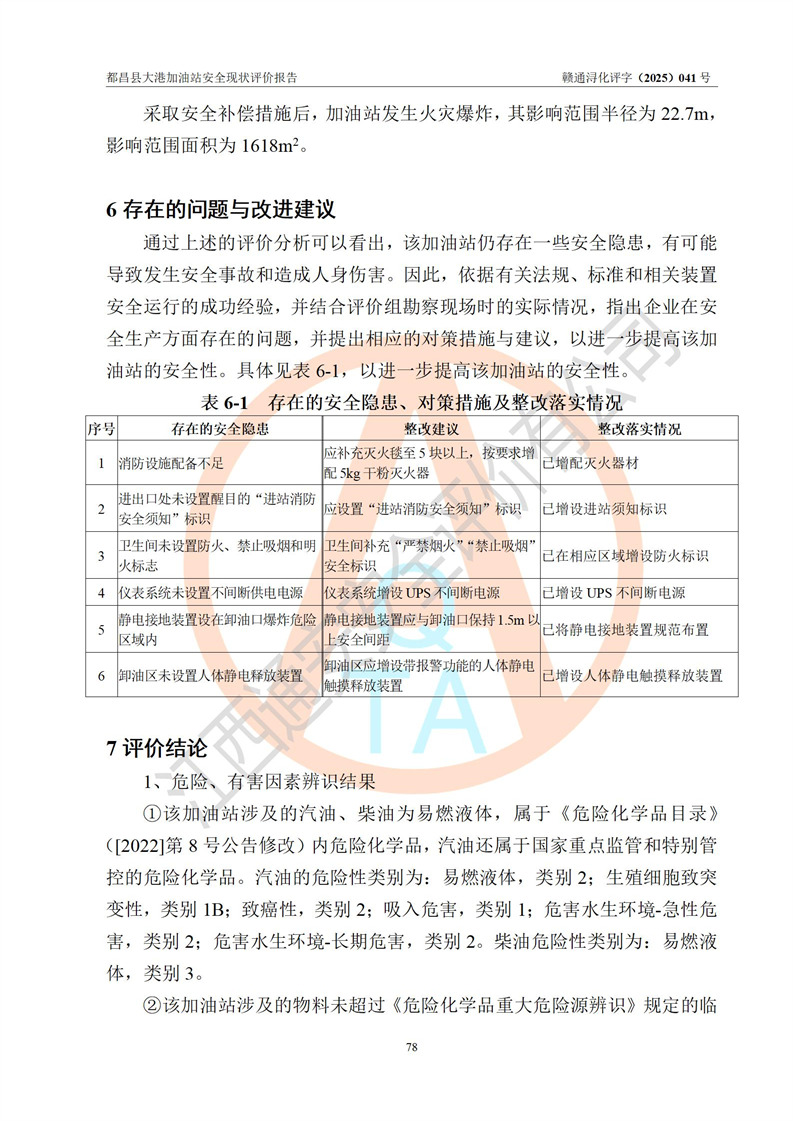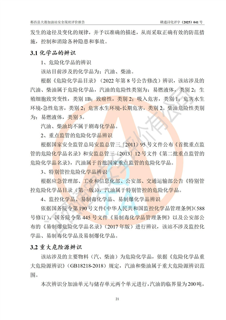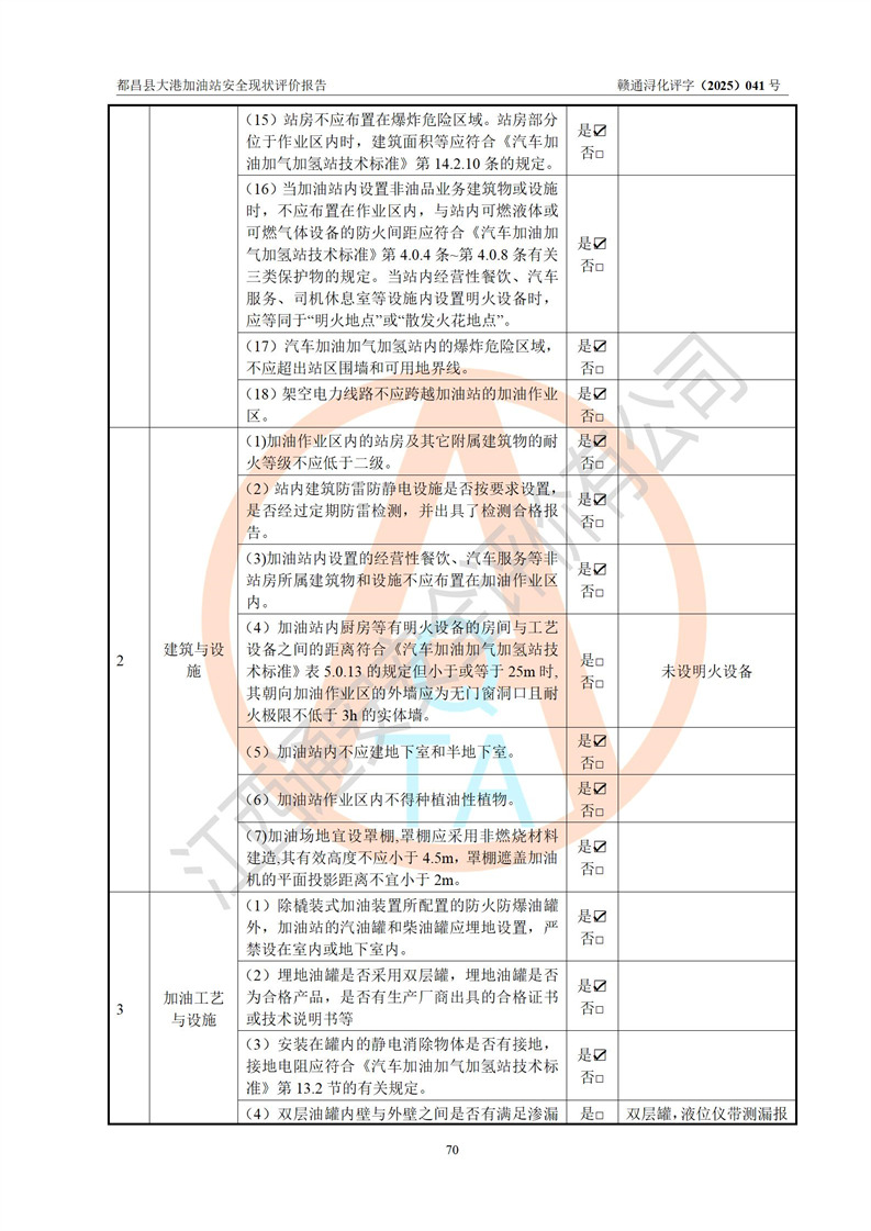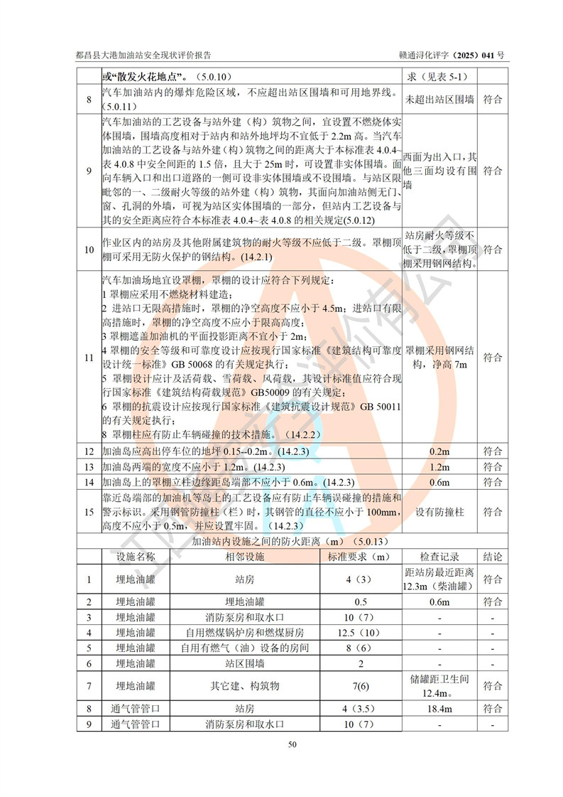 都昌县大港加油站是一家专门从事成品油零售经营的个人独资企业,投资人程绍敏,经营场所位于江西省九江市都昌县大港镇大港街。该加油站现有从业人员4人,其中安全管理人员1人,主要负责人陈宇。 该加油站占地面积约1680.8m2,站区内设置有4台税控燃油加油机及配套的工艺管线,设有双层储罐4台,其中50m3的0#柴油储罐1台、30m3的0#柴油储罐1台、50m3的92#汽油储罐1台,30m3的95#汽油储罐1台,油品储罐总容积为160m3(折算成汽油为120m3)。按现行《汽车加油加气加氢站技术标准》对加油站的等级划分原则,该站属于二级加油站。 该站在经营成品油过程中涉及的主要物料为汽油和柴油,按**十部、局联合公告[2022]第8号公告修改公布的《危险化学品目录》,汽油和柴油属于危险化学品。 |