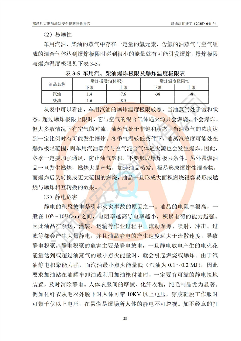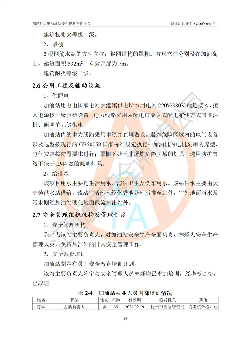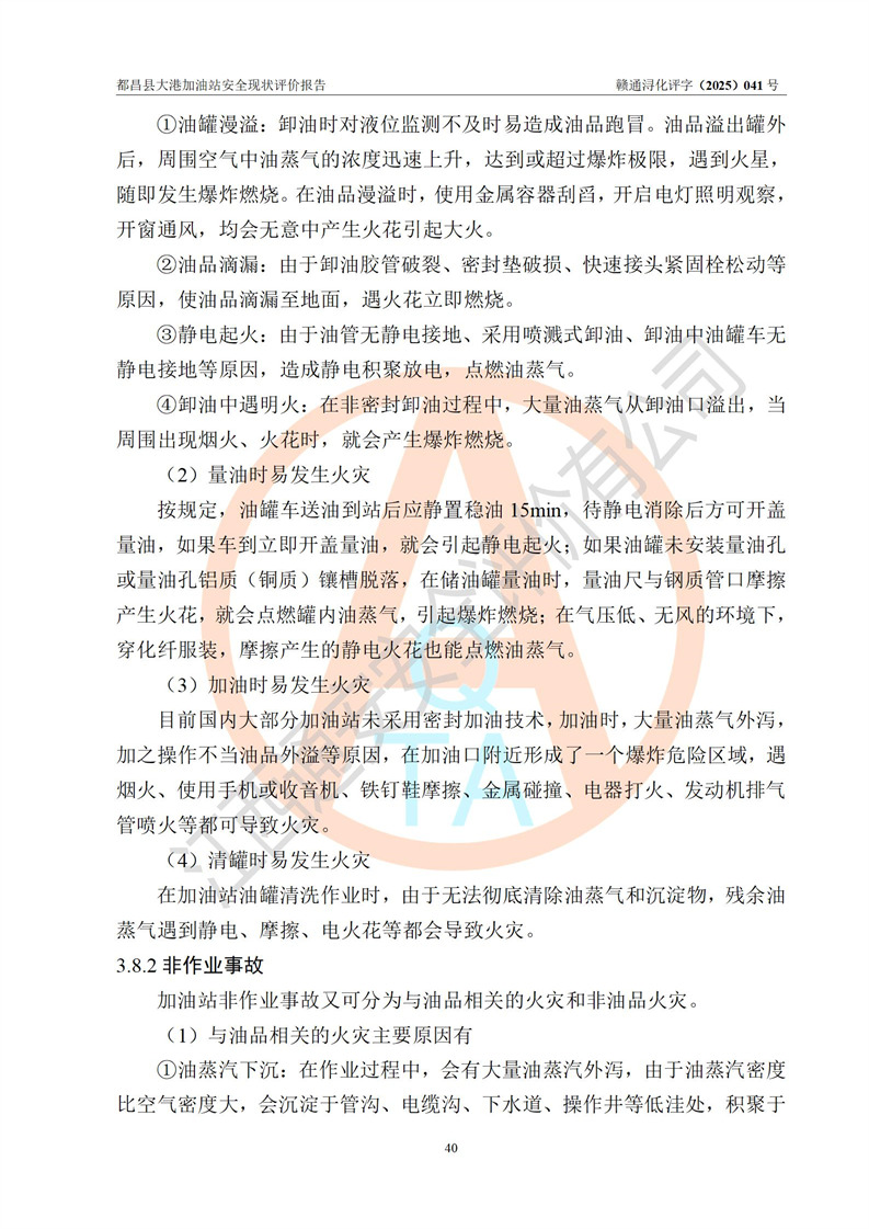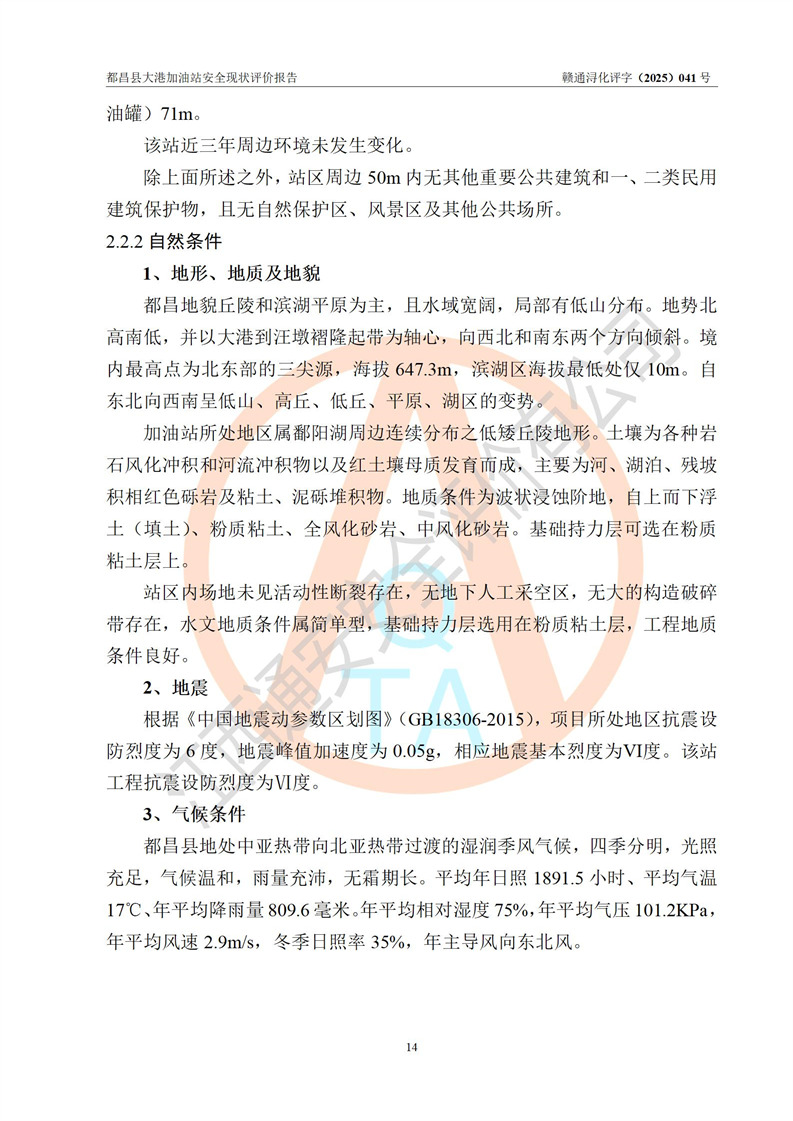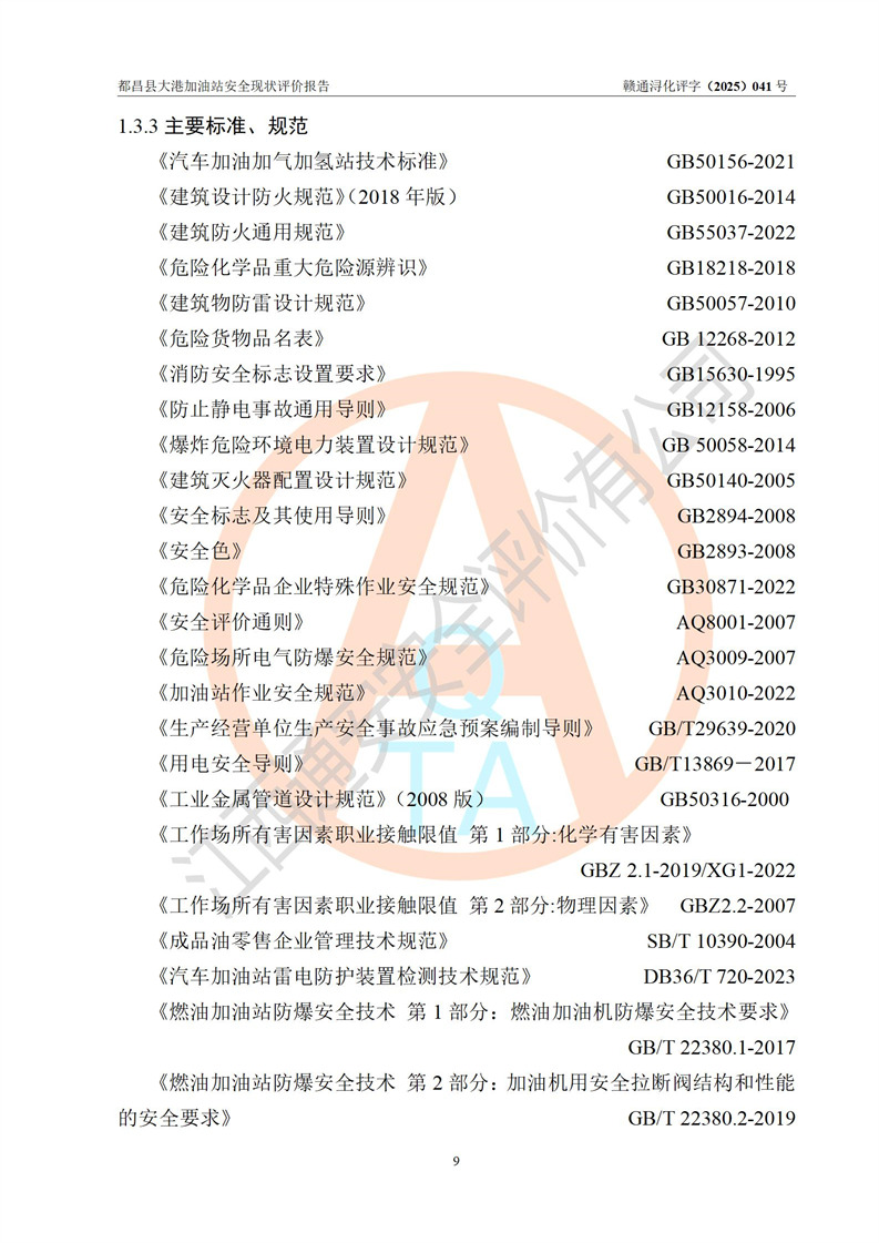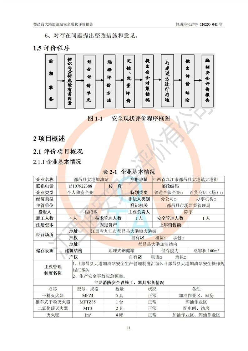 都昌县大港加油站是一家专门从事成品油零售经营的个人独资企业,投资人程绍敏,经营场所位于江西省九江市都昌县大港镇大港街。该加油站现有从业人员4人,其中安全管理人员1人,主要负责人陈宇。 该加油站占地面积约1680.8m2,站区内设置有4台税控燃油加油机及配套的工艺管线,设有双层储罐4台,其中50m3的0#柴油储罐1台、30m3的0#柴油储罐1台、50m3的92#汽油储罐1台,30m3的95#汽油储罐1台,油品储罐总容积为160m3(折算成汽油为120m3)。按现行《汽车加油加气加氢站技术标准》对加油站的等级划分原则,该站属于二级加油站。 该站在经营成品油过程中涉及的主要物料为汽油和柴油,按**十部、局联合公告[2022]第8号公告修改公布的《危险化学品目录》,汽油和柴油属于危险化学品。 |