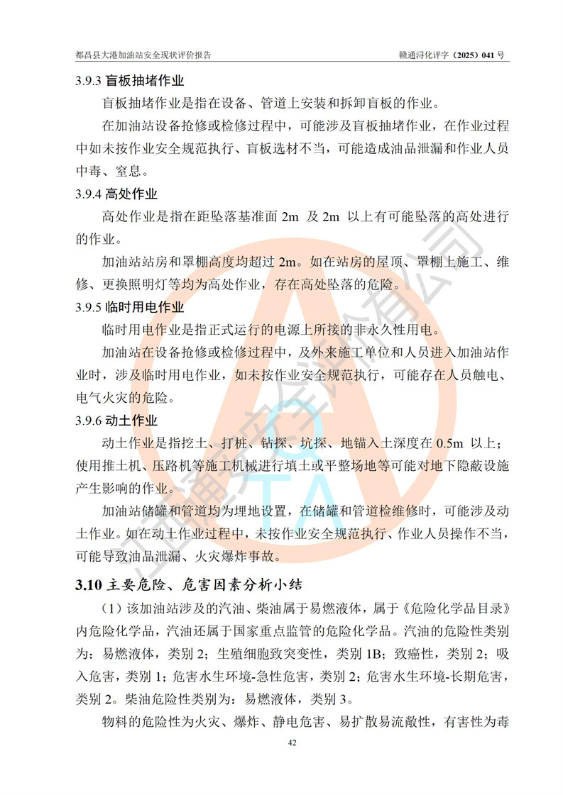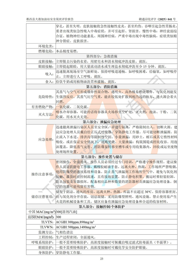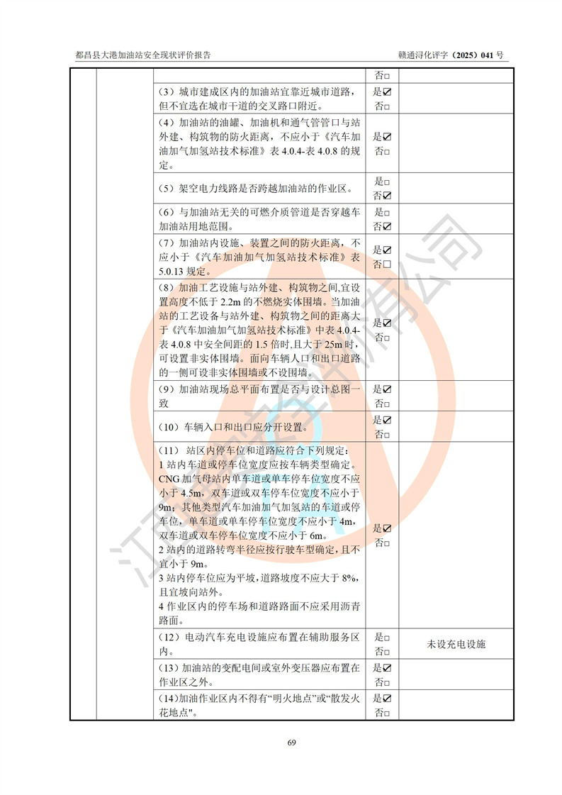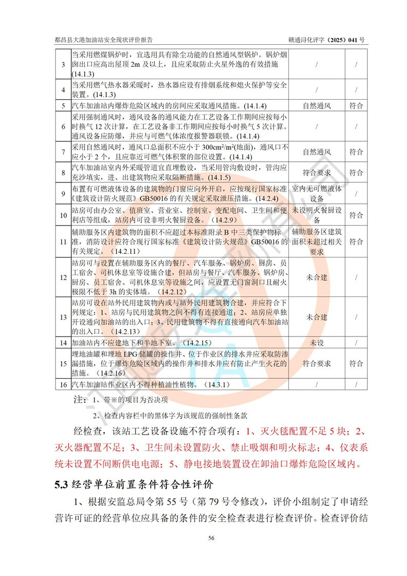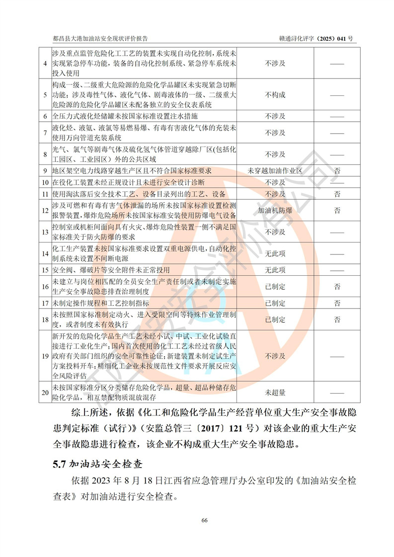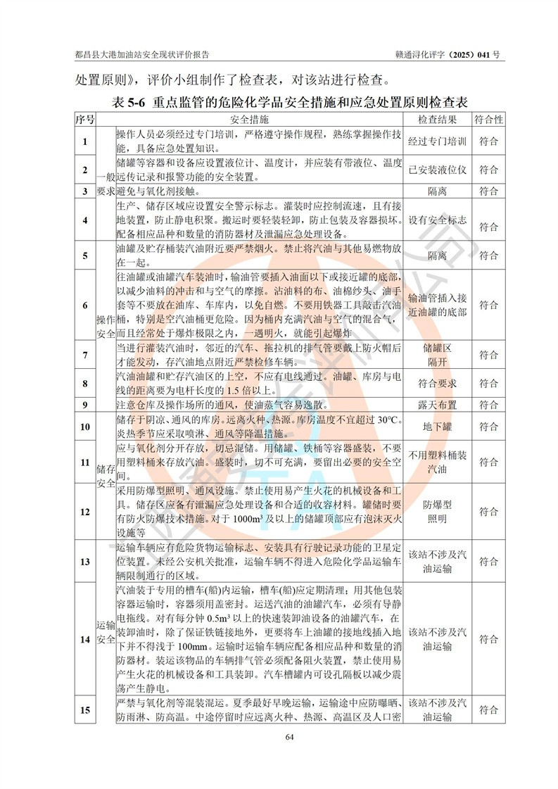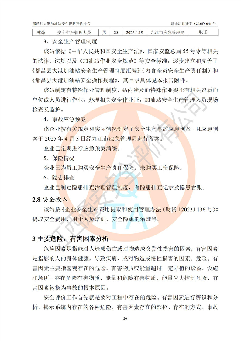 都昌县大港加油站是一家专门从事成品油零售经营的个人独资企业,投资人程绍敏,经营场所位于江西省九江市都昌县大港镇大港街。该加油站现有从业人员4人,其中安全管理人员1人,主要负责人陈宇。 该加油站占地面积约1680.8m2,站区内设置有4台税控燃油加油机及配套的工艺管线,设有双层储罐4台,其中50m3的0#柴油储罐1台、30m3的0#柴油储罐1台、50m3的92#汽油储罐1台,30m3的95#汽油储罐1台,油品储罐总容积为160m3(折算成汽油为120m3)。按现行《汽车加油加气加氢站技术标准》对加油站的等级划分原则,该站属于二级加油站。 该站在经营成品油过程中涉及的主要物料为汽油和柴油,按**十部、局联合公告[2022]第8号公告修改公布的《危险化学品目录》,汽油和柴油属于危险化学品。 |