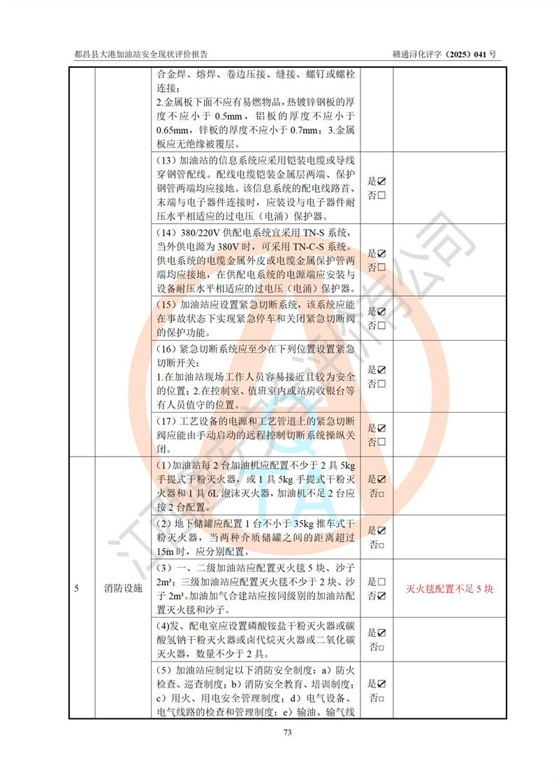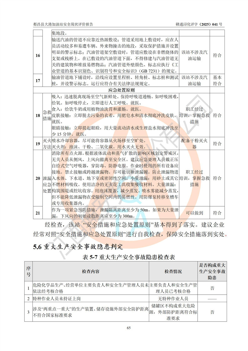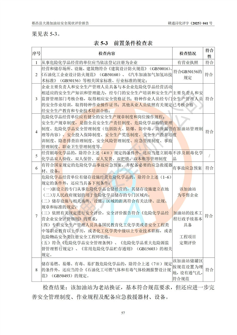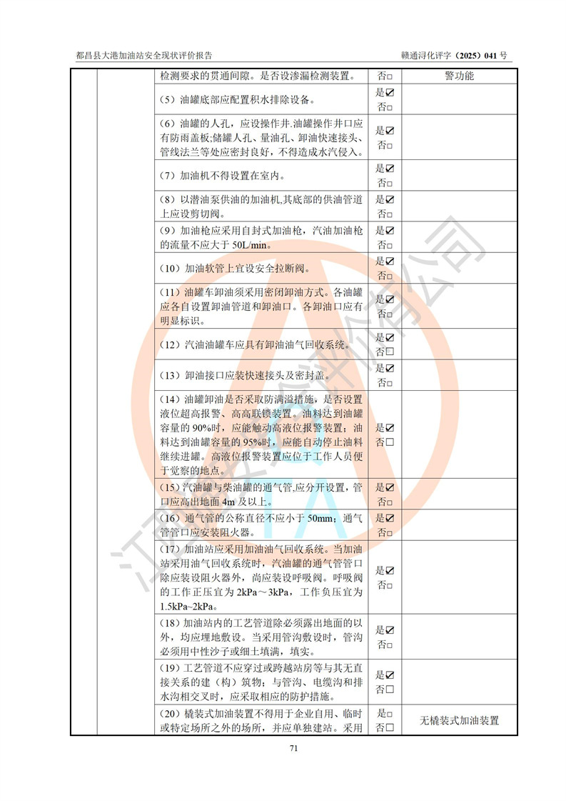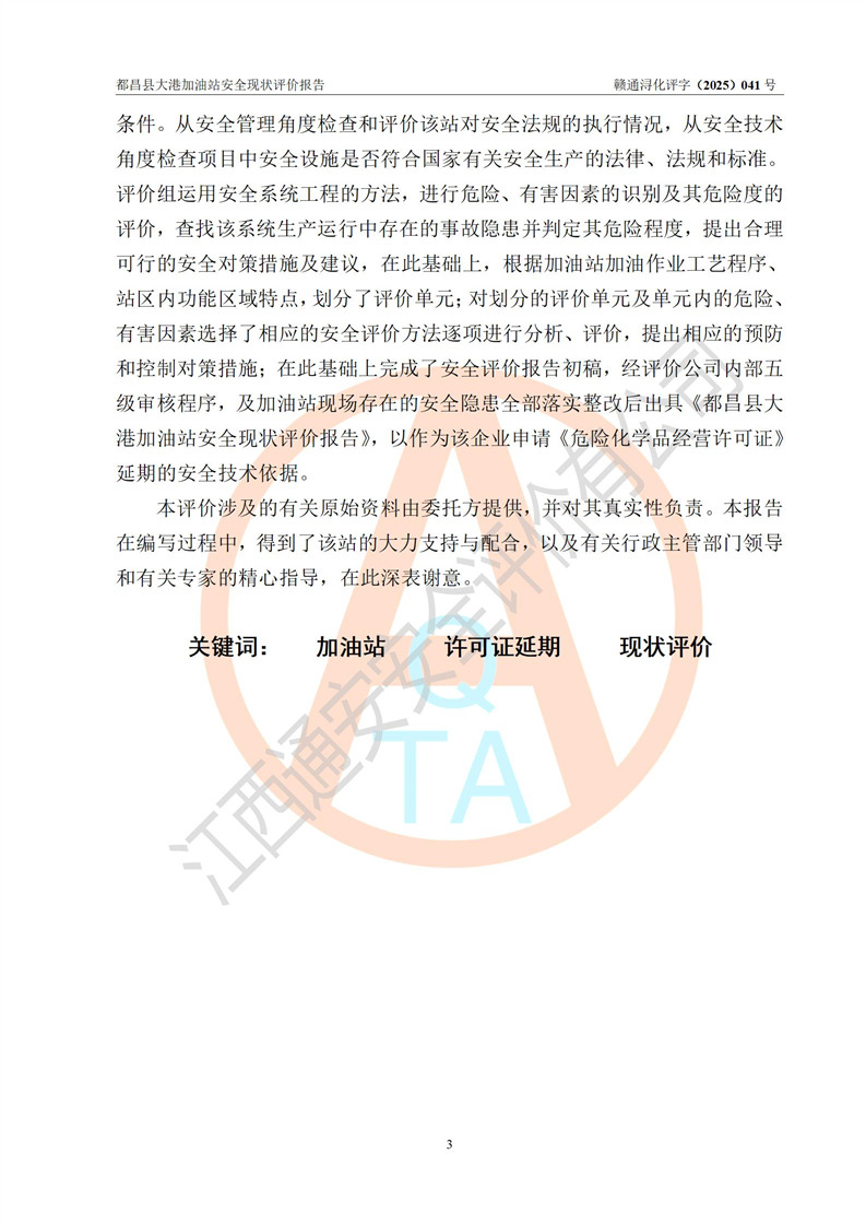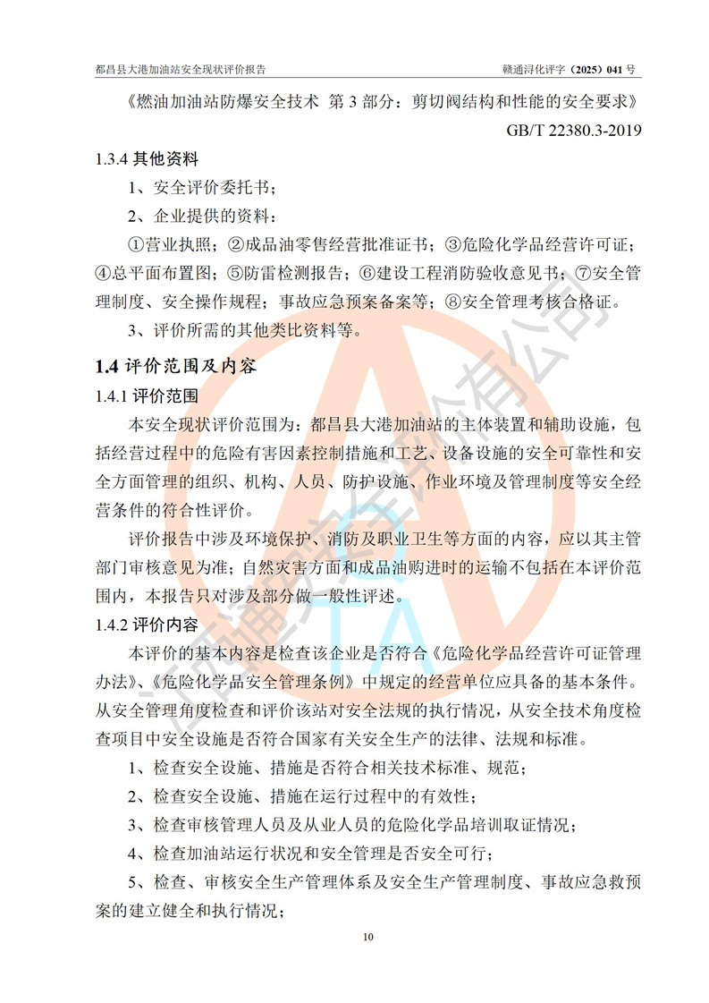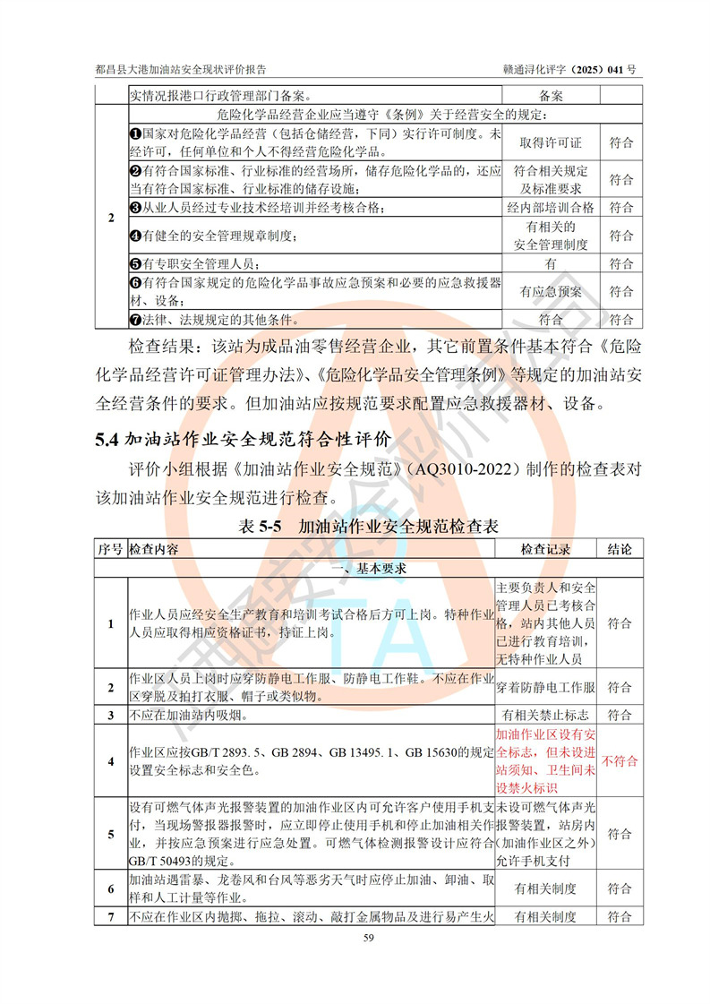 都昌县大港加油站是一家专门从事成品油零售经营的个人独资企业,投资人程绍敏,经营场所位于江西省九江市都昌县大港镇大港街。该加油站现有从业人员4人,其中安全管理人员1人,主要负责人陈宇。 该加油站占地面积约1680.8m2,站区内设置有4台税控燃油加油机及配套的工艺管线,设有双层储罐4台,其中50m3的0#柴油储罐1台、30m3的0#柴油储罐1台、50m3的92#汽油储罐1台,30m3的95#汽油储罐1台,油品储罐总容积为160m3(折算成汽油为120m3)。按现行《汽车加油加气加氢站技术标准》对加油站的等级划分原则,该站属于二级加油站。 该站在经营成品油过程中涉及的主要物料为汽油和柴油,按**十部、局联合公告[2022]第8号公告修改公布的《危险化学品目录》,汽油和柴油属于危险化学品。 |