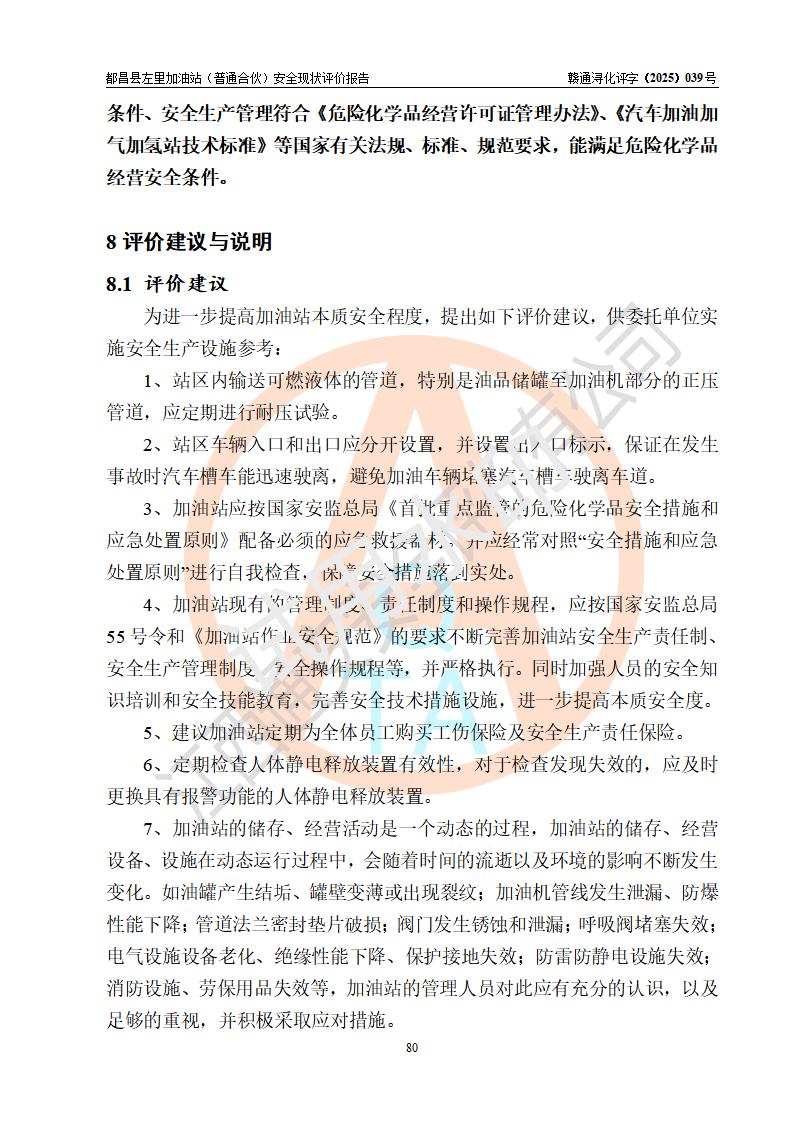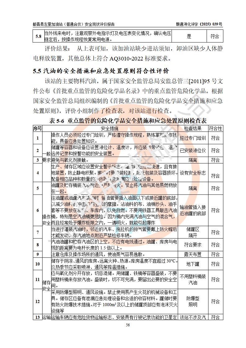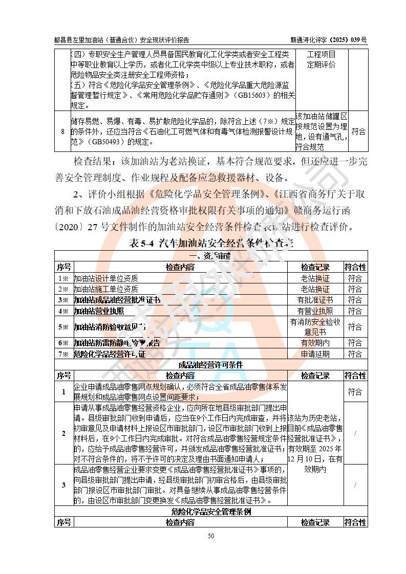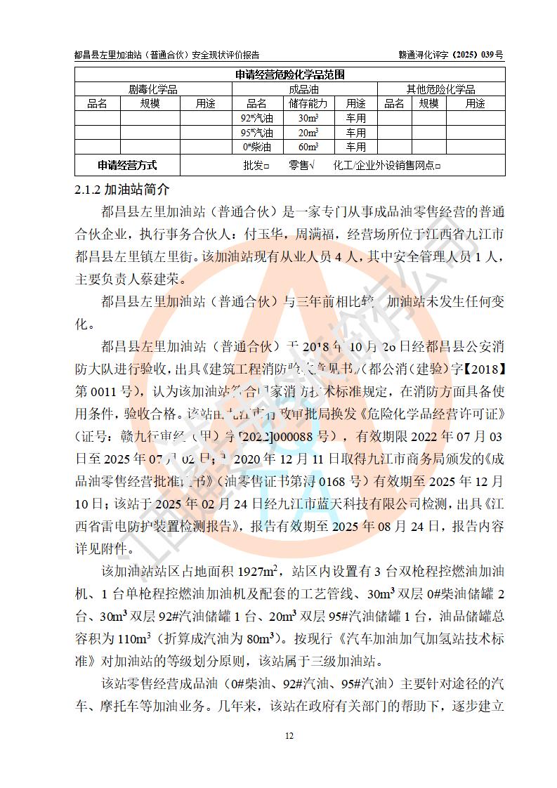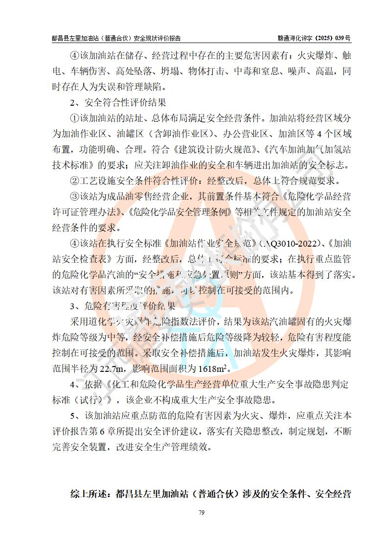 评价结论 | 都昌县左里加油站(普通合伙)涉及的安全条件、安全经营条件、安全生产管理符合《危险化学品经营许可证管理办法》、《汽车加油加气加氢站技术标准》等**有关法规、标准、规范要求,能满足危险化学品经营安全条件。 | |||