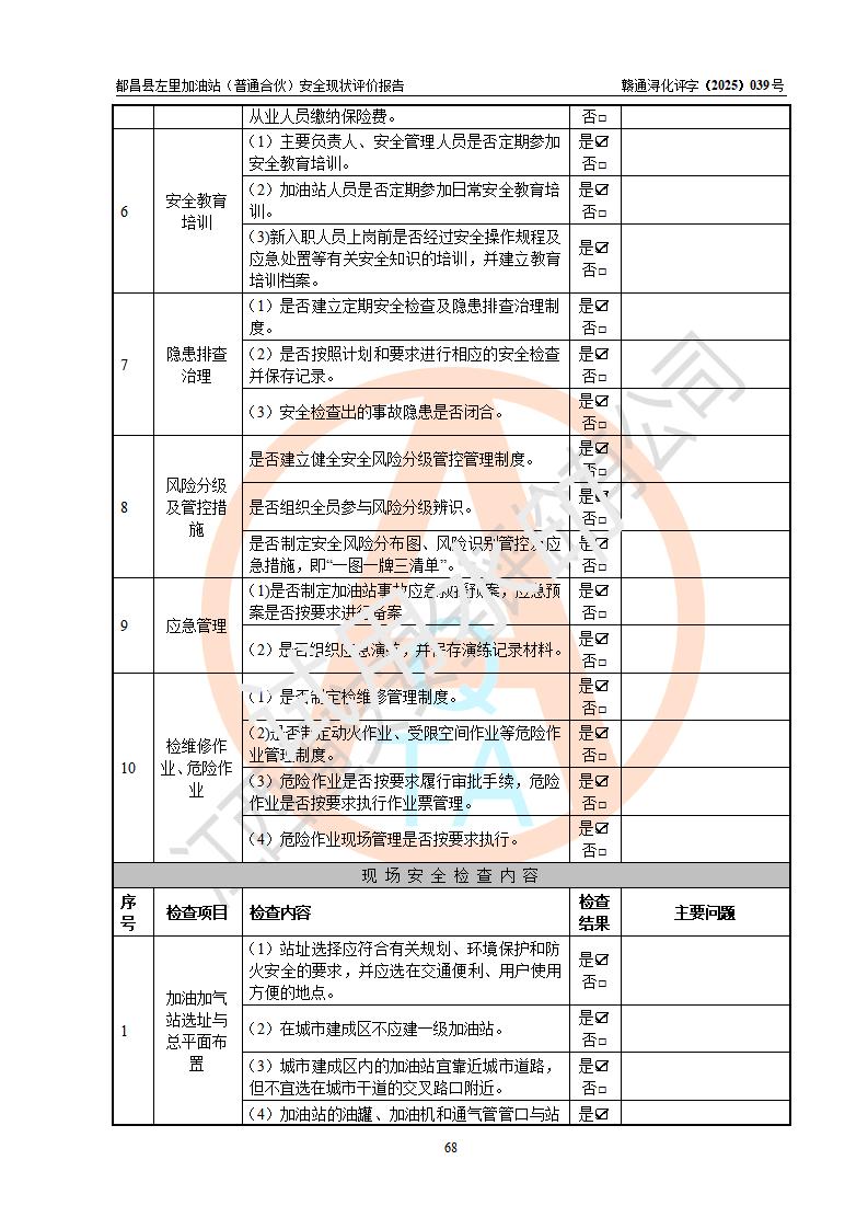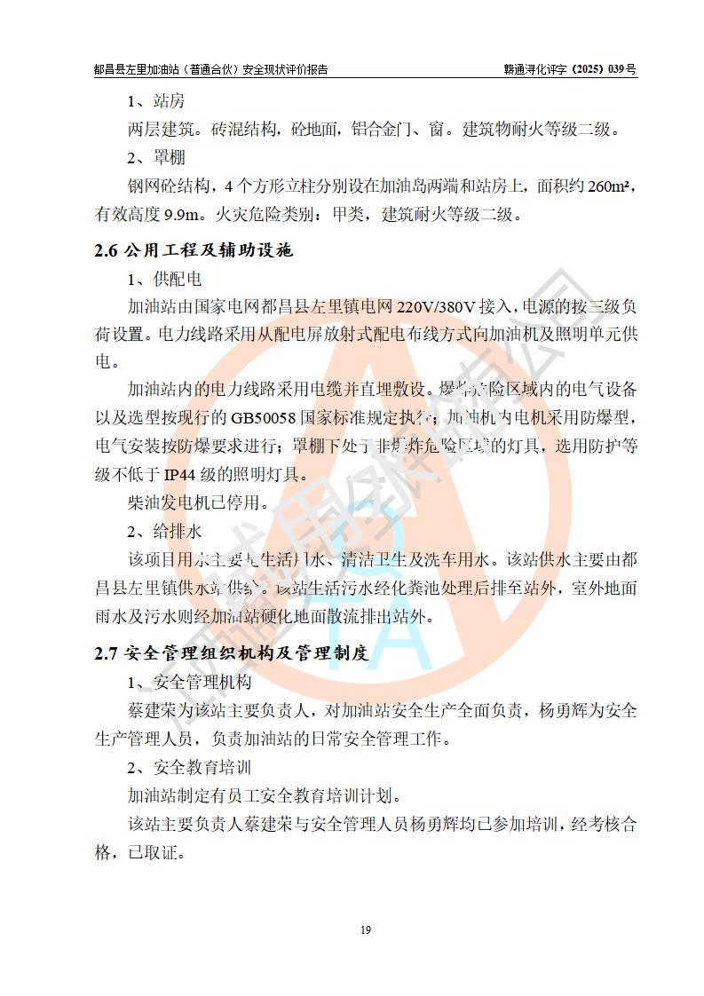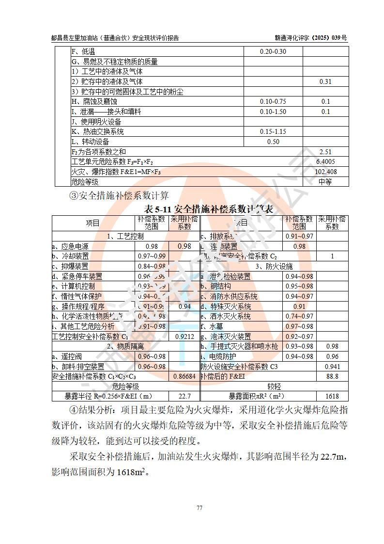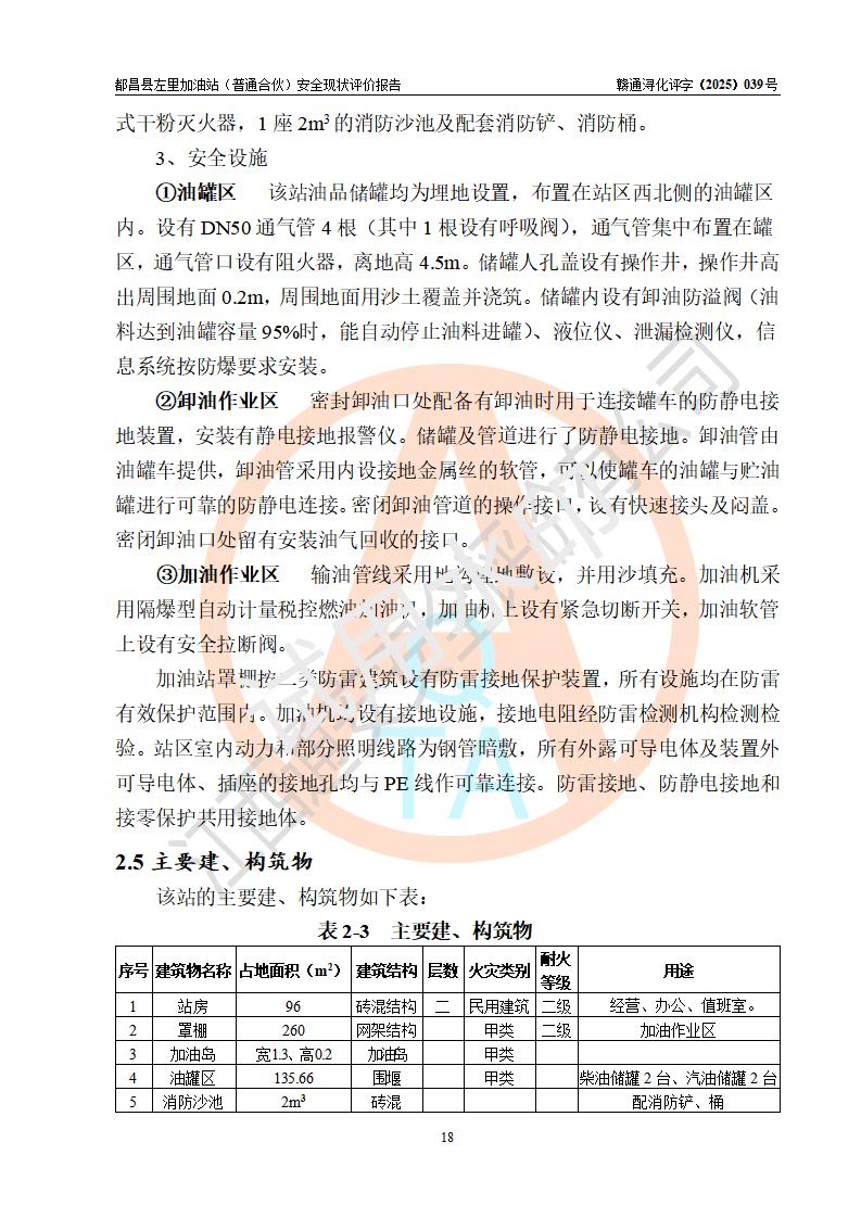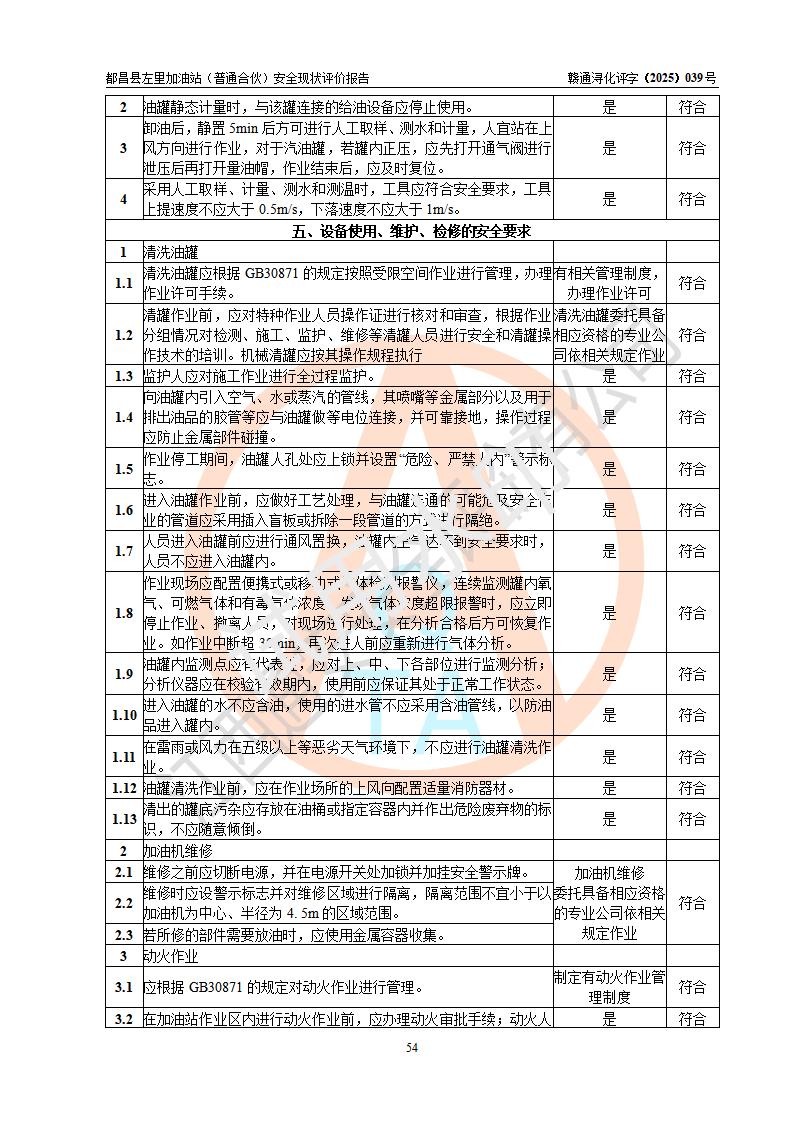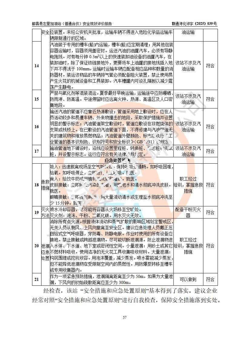 评价结论 | 都昌县左里加油站(普通合伙)涉及的安全条件、安全经营条件、安全生产管理符合《危险化学品经营许可证管理办法》、《汽车加油加气加氢站技术标准》等**有关法规、标准、规范要求,能满足危险化学品经营安全条件。 | |||