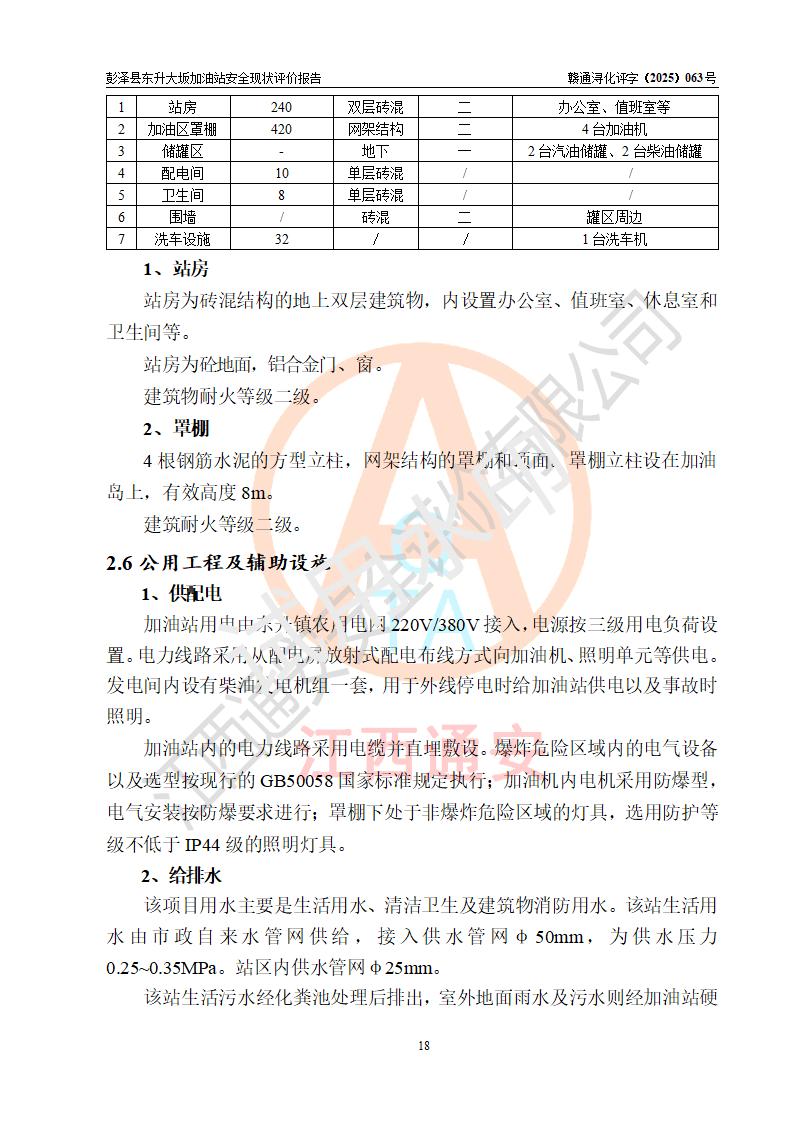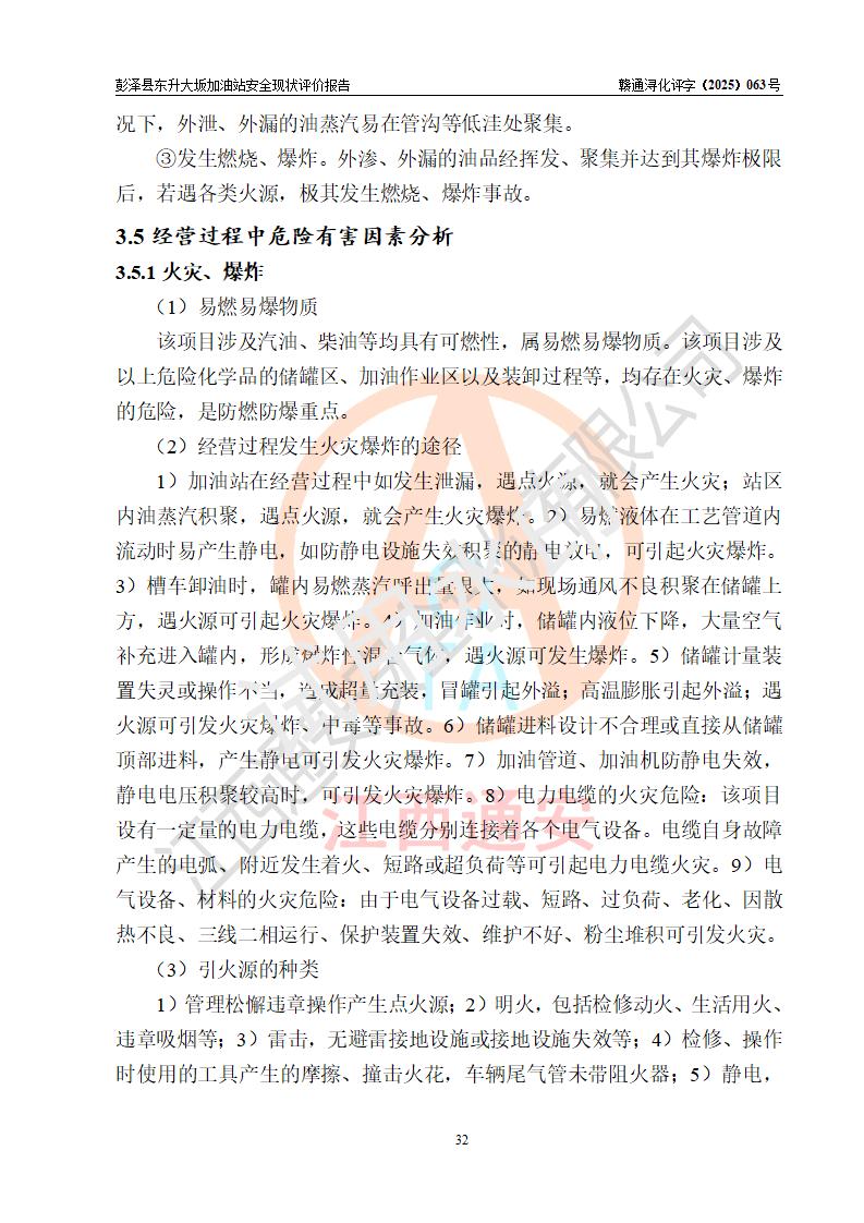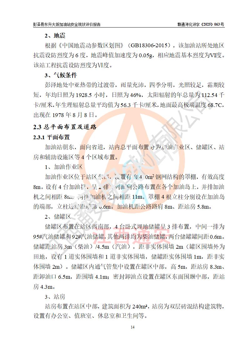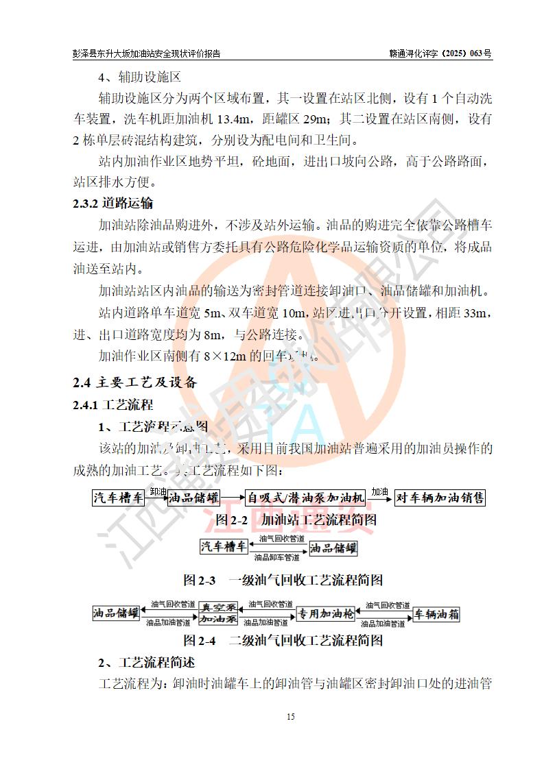 项目简介 | 彭泽县东升大坂加油站是一家专门从事成品油零售经营的个人独资企业,经营场所位于江西省九江市彭泽县东升镇大坂村。现有从业人员3名,其中安全管理人员1人,加油站负责人程霄雁。 该加油站占地面积约1288m2,站区内设置有3台双枪和1台四枪程控燃油加油机及配套的工艺管线、设有SF双层储罐4台,其中40m3的0#柴油储罐2台、30m3的92#汽油储罐1台,20m3的95#汽油储罐1台,油品储罐总容积为130m3(折算成汽油为90m3),按现行《汽车加油加气加氢站技术标准》对加油站的等级划分原则,属三级加油站。 该站由九江市行政审批局换发《危险化学品经营许可证》(证号:赣九行审经(甲)字[2022]0000165号),**期限2022年09月30日至2025年09月29日。 | |||