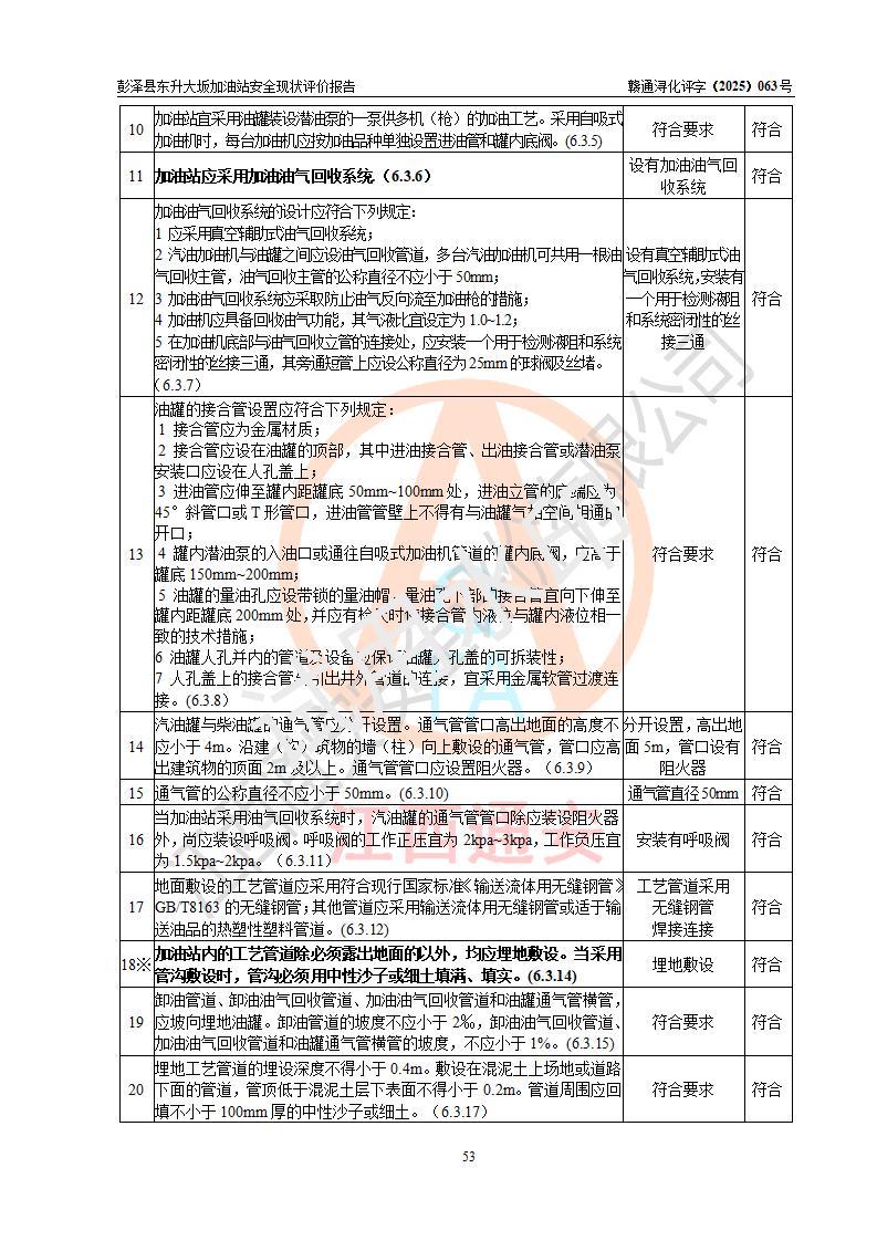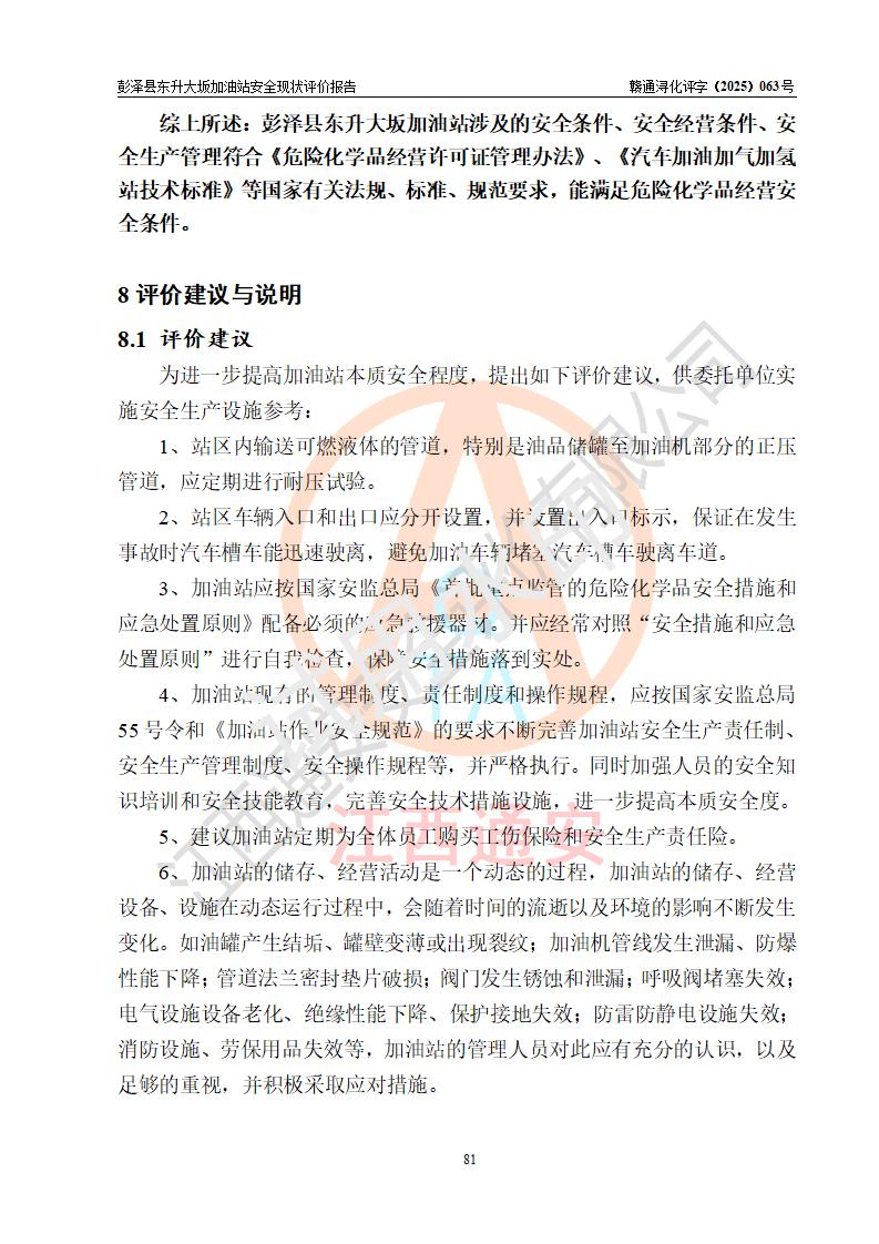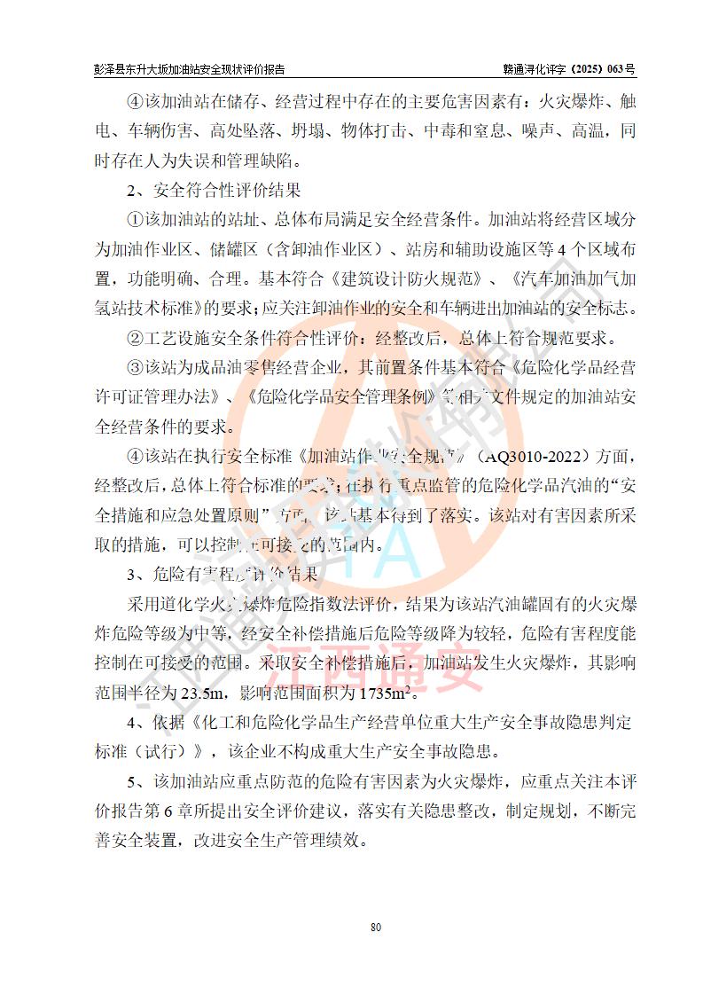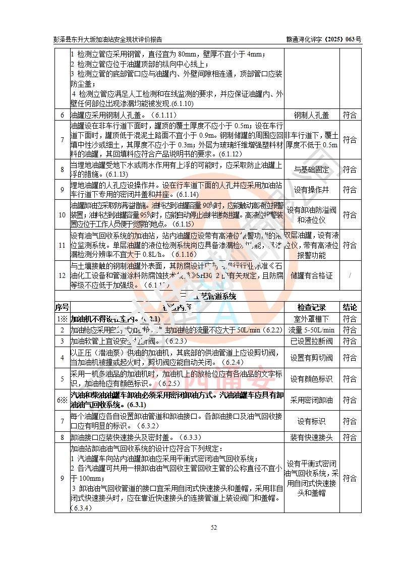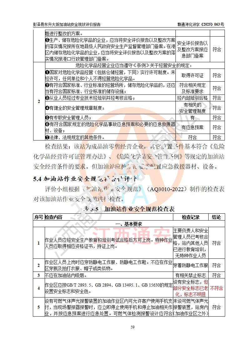 评价结论 | 彭泽县东升大坂加油站涉及的安全条件、安全经营条件、安全生产管理符合《危险化学品经营许可证管理办法》、《汽车加油加气加氢站技术标准》等**有关法规、标准、规范要求,能满足危险化学品经营安全条件。 | |||