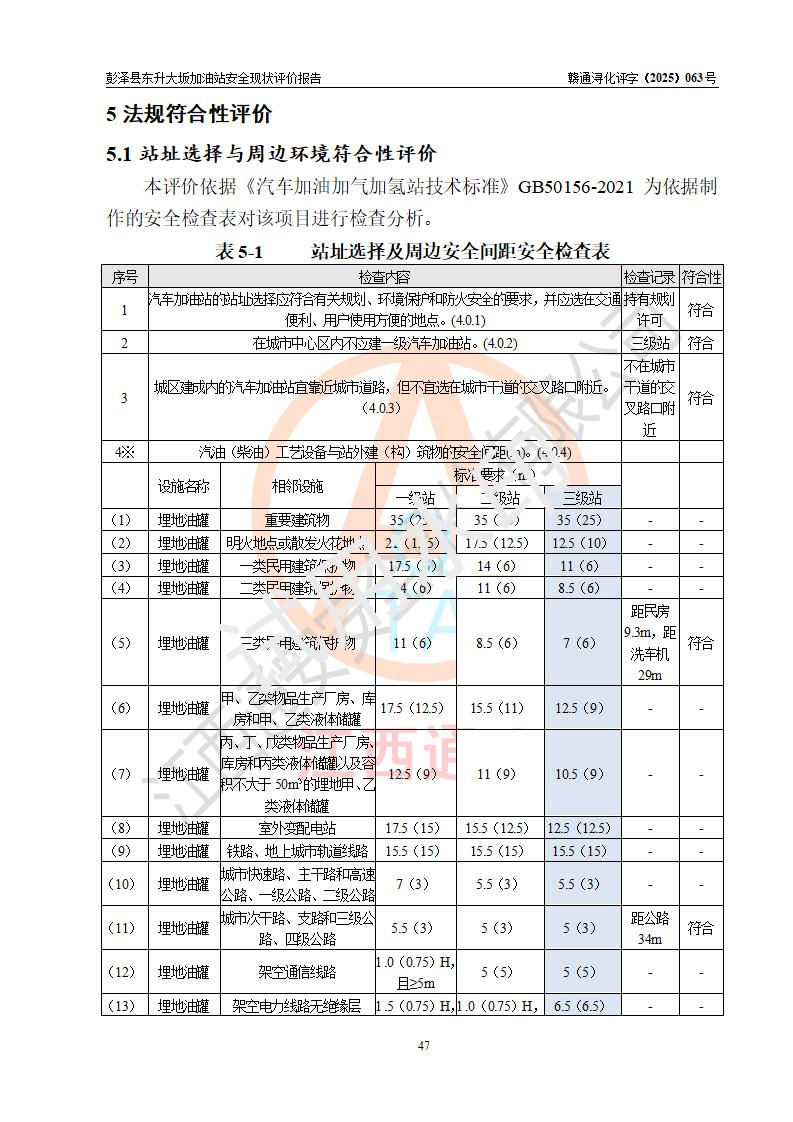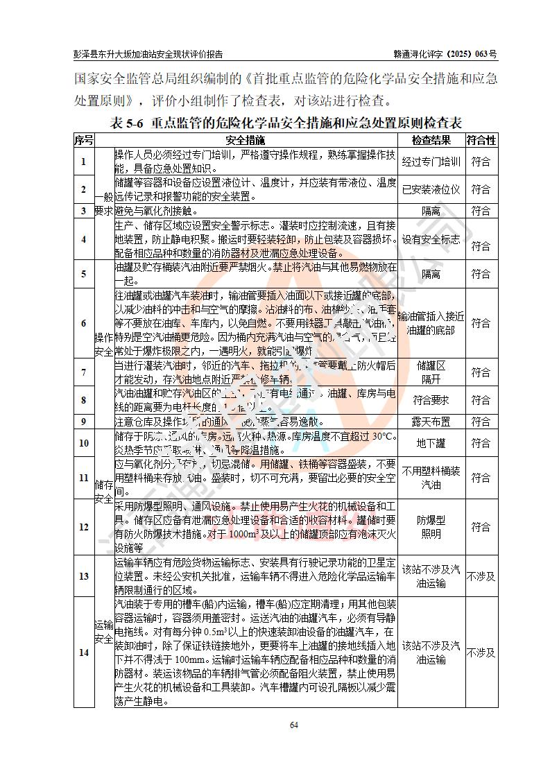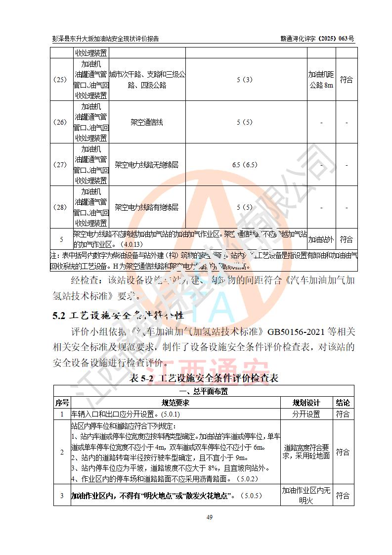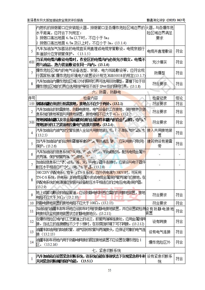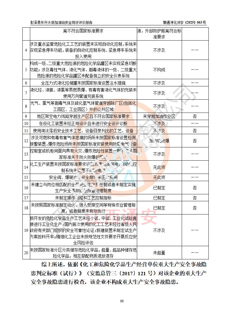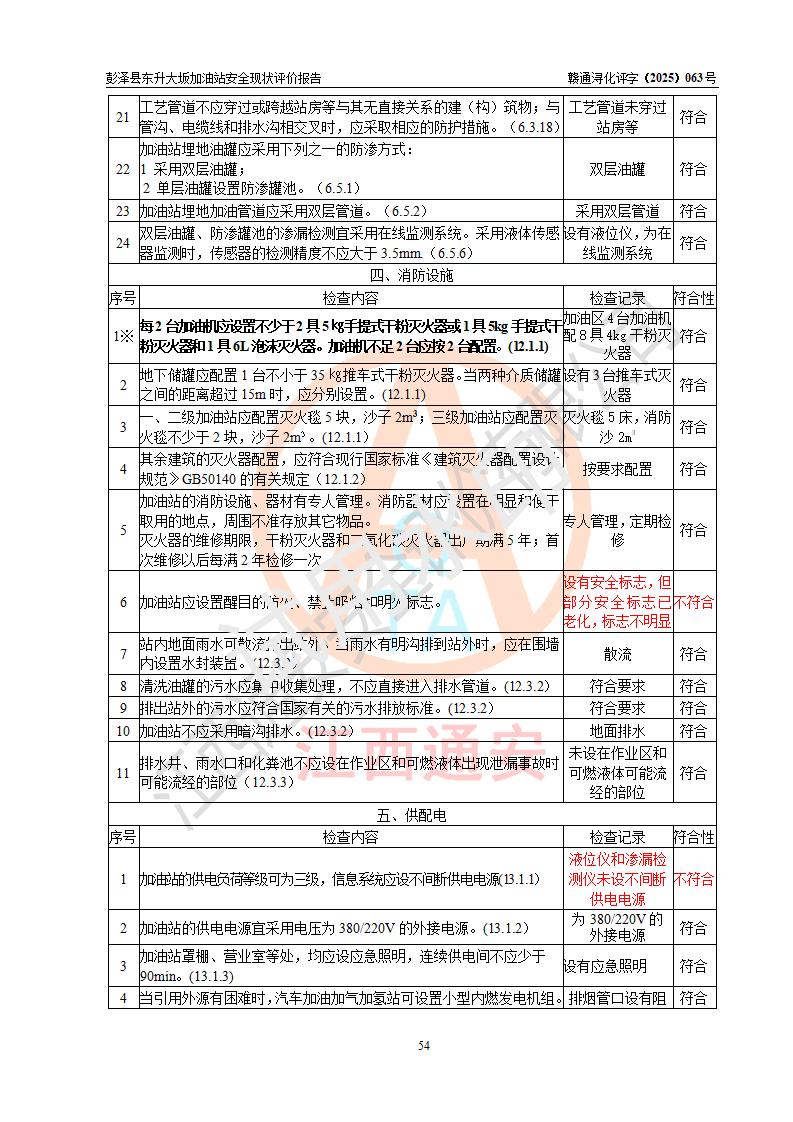 评价结论 | 彭泽县东升大坂加油站涉及的安全条件、安全经营条件、安全生产管理符合《危险化学品经营许可证管理办法》、《汽车加油加气加氢站技术标准》等**有关法规、标准、规范要求,能满足危险化学品经营安全条件。 | |||