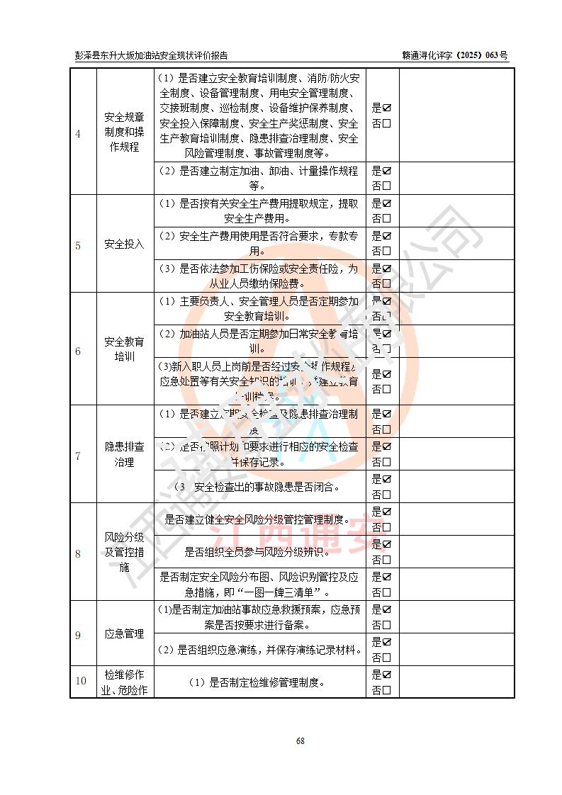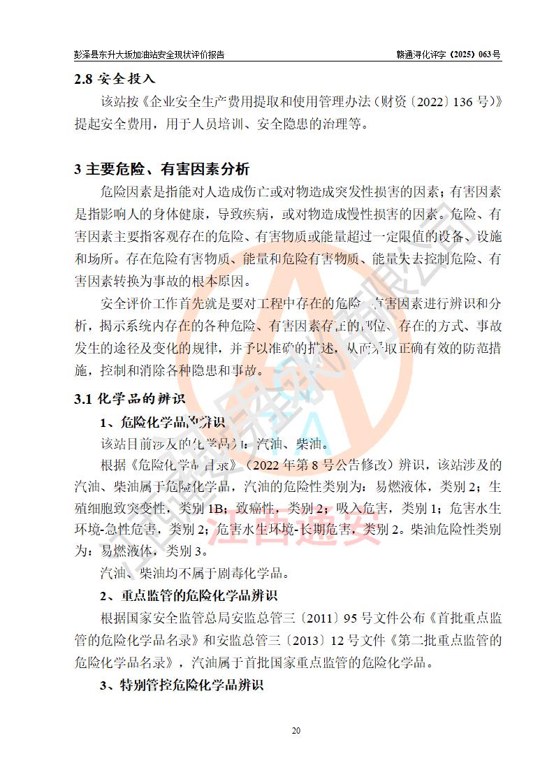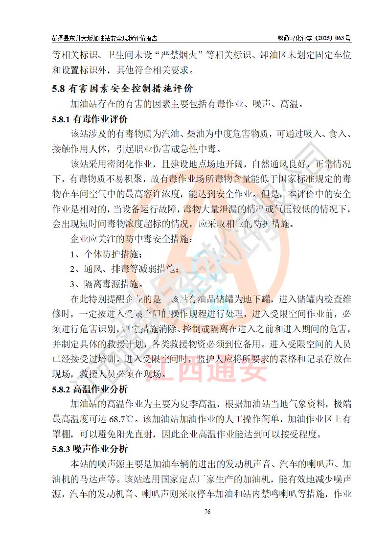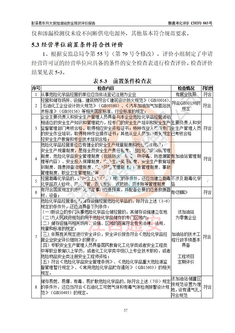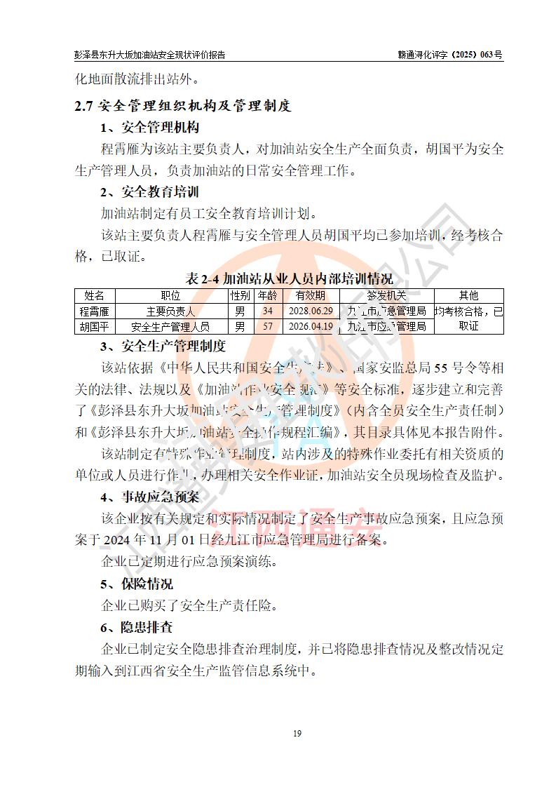 评价结论 | 彭泽县东升大坂加油站涉及的安全条件、安全经营条件、安全生产管理符合《危险化学品经营许可证管理办法》、《汽车加油加气加氢站技术标准》等**有关法规、标准、规范要求,能满足危险化学品经营安全条件。 | |||