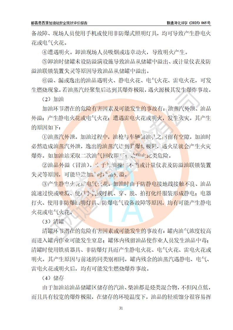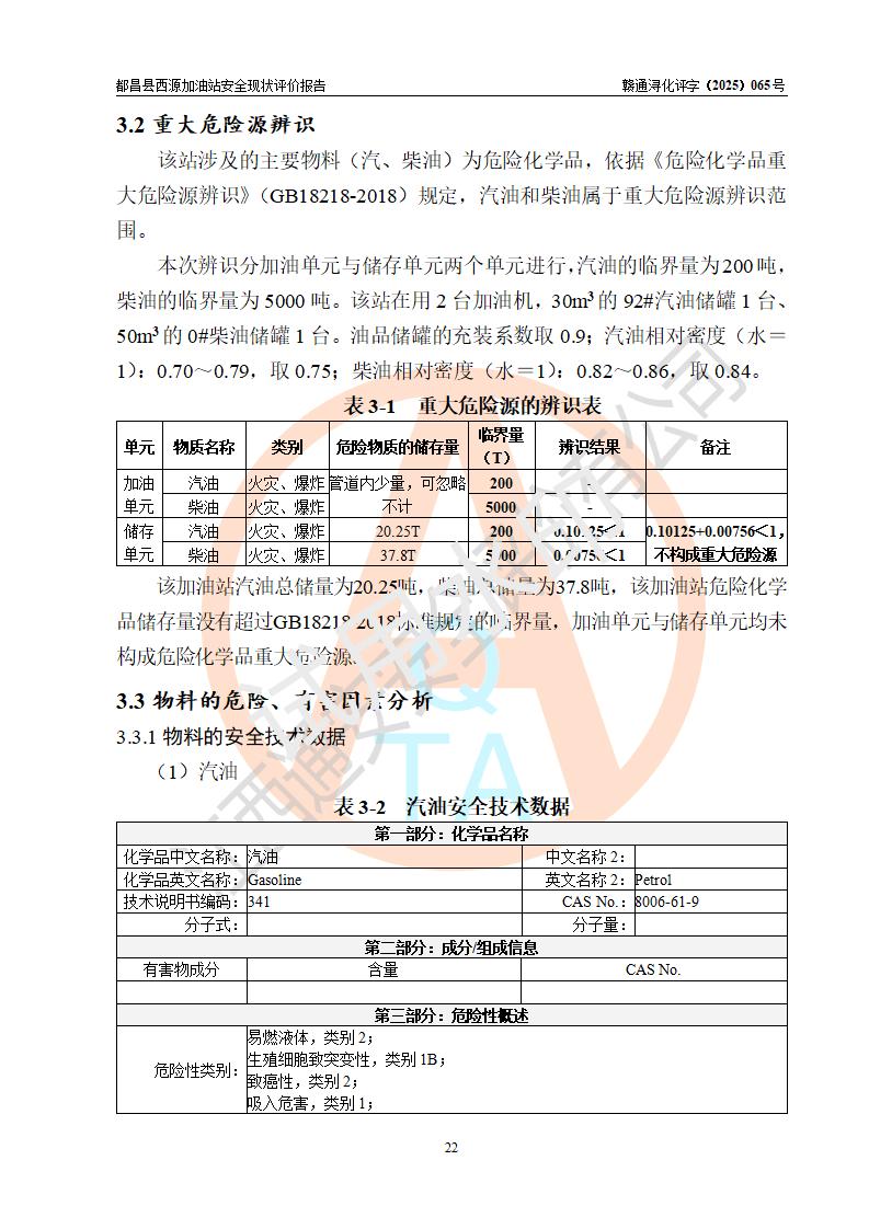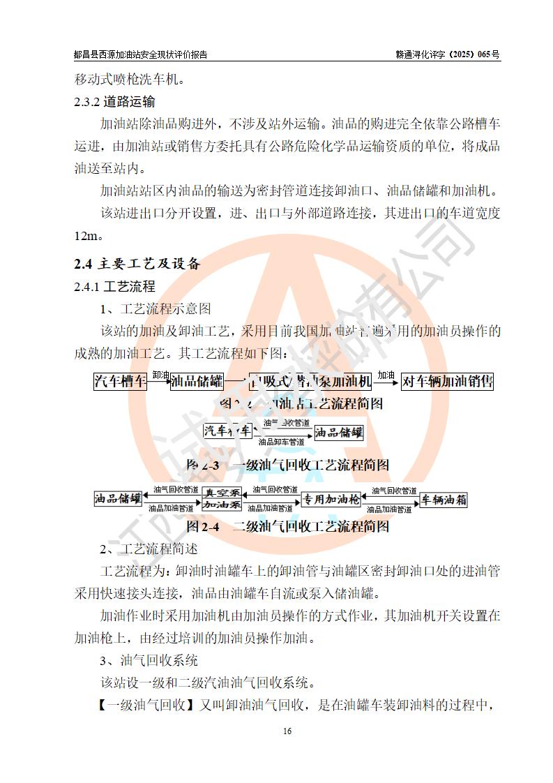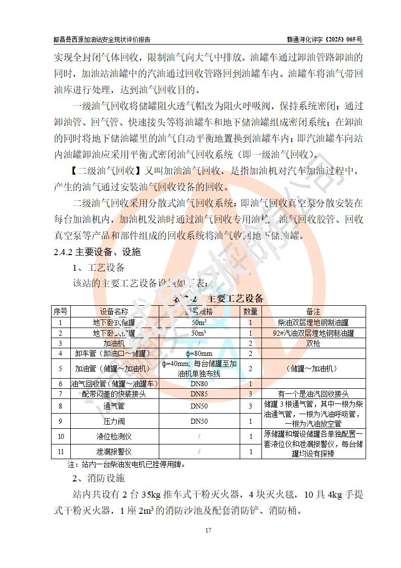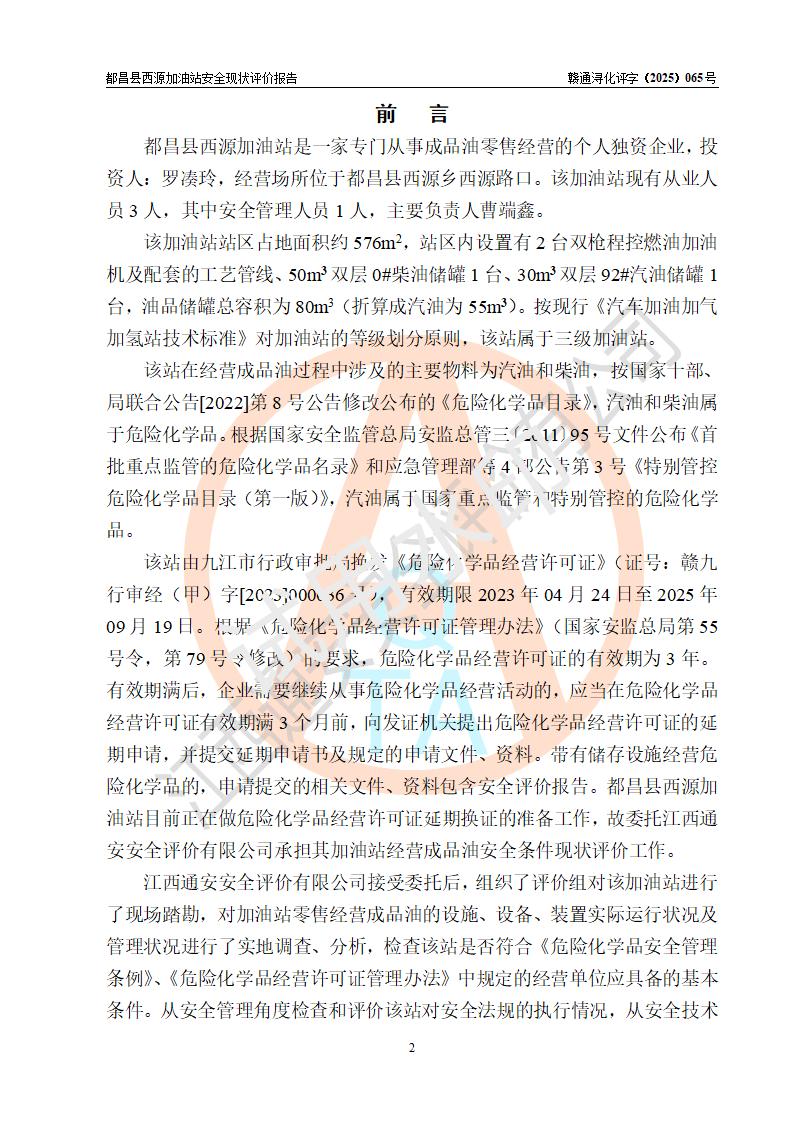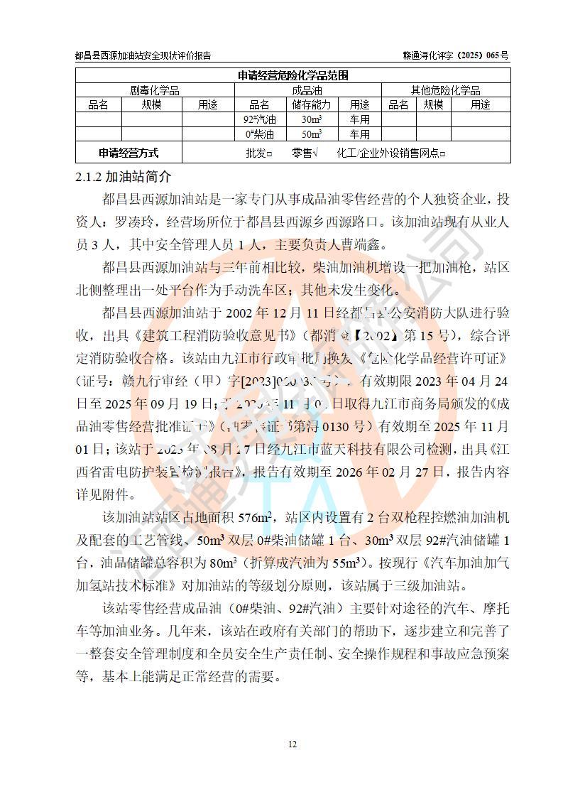 项目简介 | 都昌县西源加油站是一家专门从事成品油零售经营的个人独资企业,投资人:罗凑玲,经营场所位于都昌县西源乡西源路口。该加油站现有从业人员3人,其中安全管理人员1人,主要负责人曹端鑫。 该加油站站区占地面积约576m2,站区内设置有2台双枪程控燃油加油机及配套的工艺管线、50m3双层0#柴油储罐1台、30m3双层92#汽油储罐1台,油品储罐总容积为80m3(折算成汽油为55m3)。按现行《汽车加油加气加氢站技术标准》对加油站的等级划分原则,该站属于三级加油站。 该站由九江市行政审批局换发《危险化学品经营许可证》(证号:赣九行审经(甲)字[2023]000036号),**期限2023年04月24日至2025年09月19日。 | |||