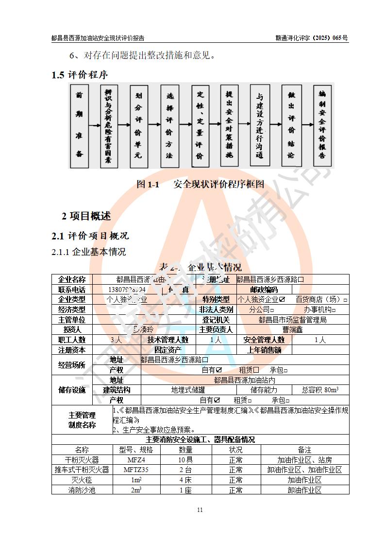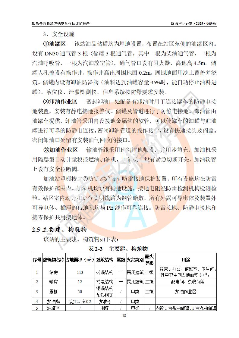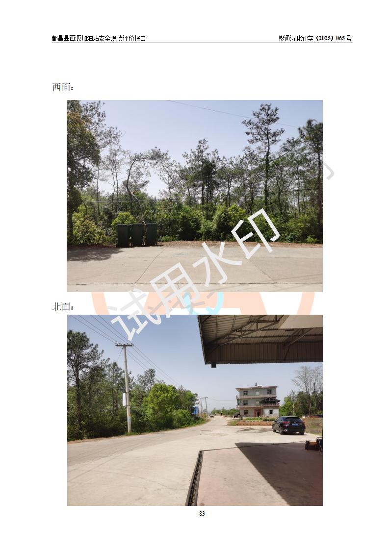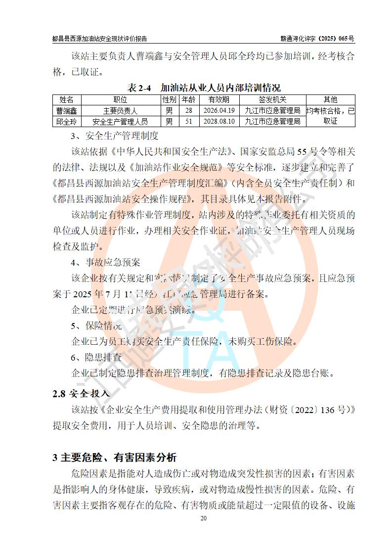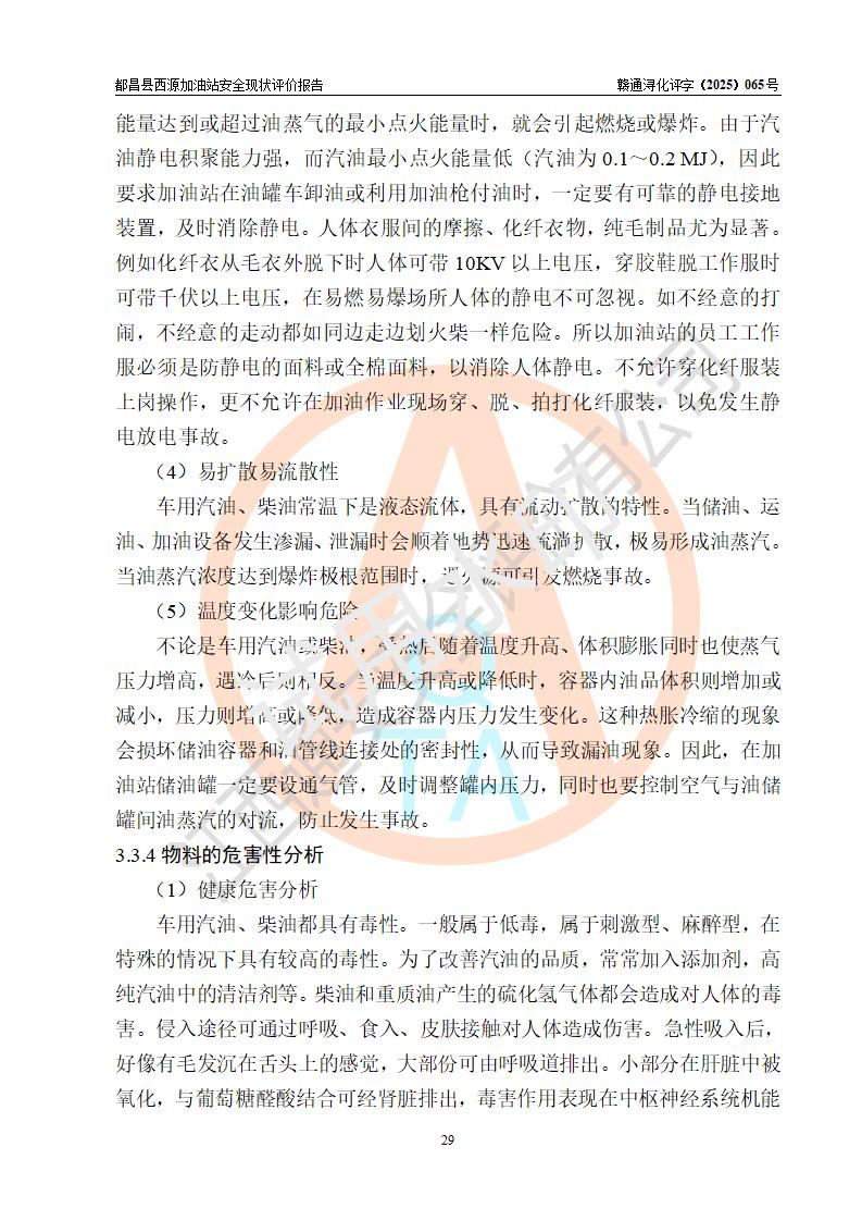 项目简介 | 都昌县西源加油站是一家专门从事成品油零售经营的个人独资企业,投资人:罗凑玲,经营场所位于都昌县西源乡西源路口。该加油站现有从业人员3人,其中安全管理人员1人,主要负责人曹端鑫。 该加油站站区占地面积约576m2,站区内设置有2台双枪程控燃油加油机及配套的工艺管线、50m3双层0#柴油储罐1台、30m3双层92#汽油储罐1台,油品储罐总容积为80m3(折算成汽油为55m3)。按现行《汽车加油加气加氢站技术标准》对加油站的等级划分原则,该站属于三级加油站。 该站由九江市行政审批局换发《危险化学品经营许可证》(证号:赣九行审经(甲)字[2023]000036号),**期限2023年04月24日至2025年09月19日。 | |||
