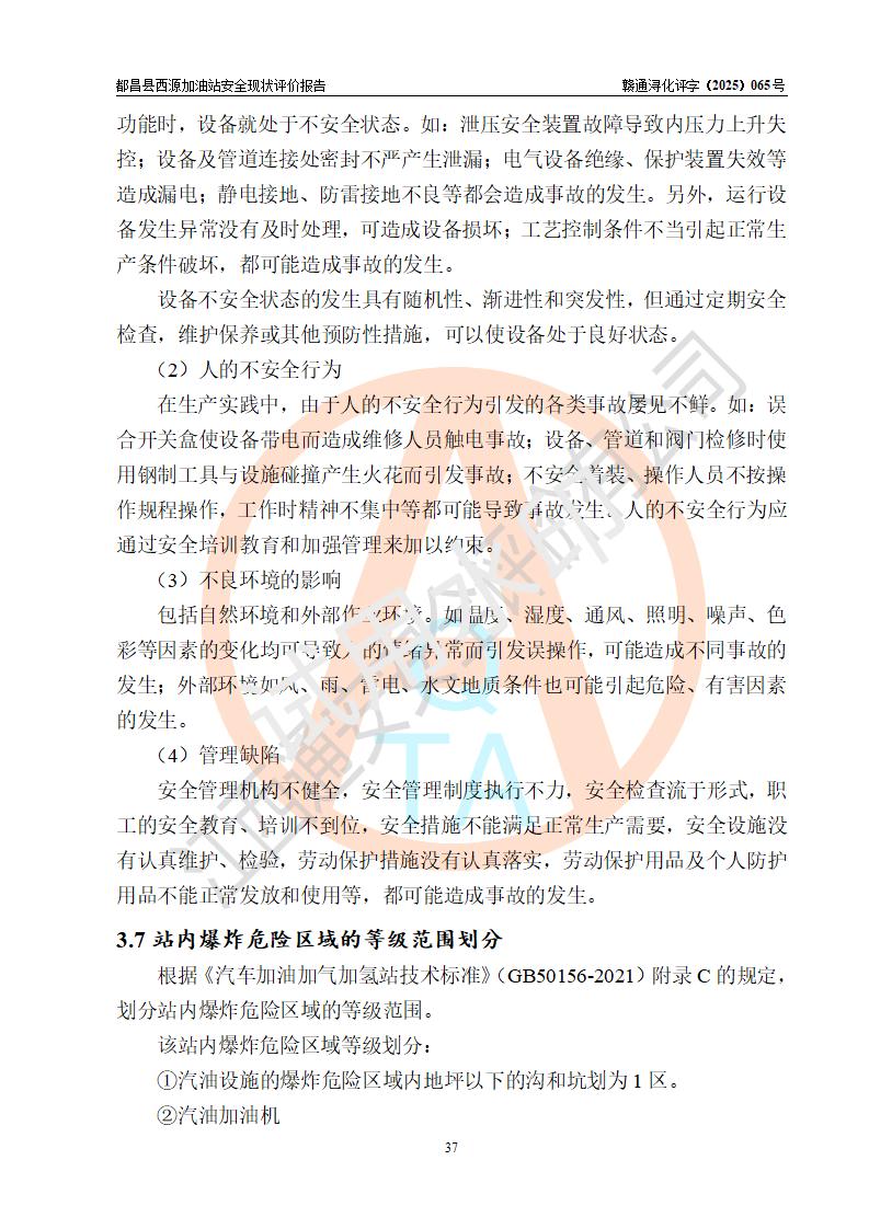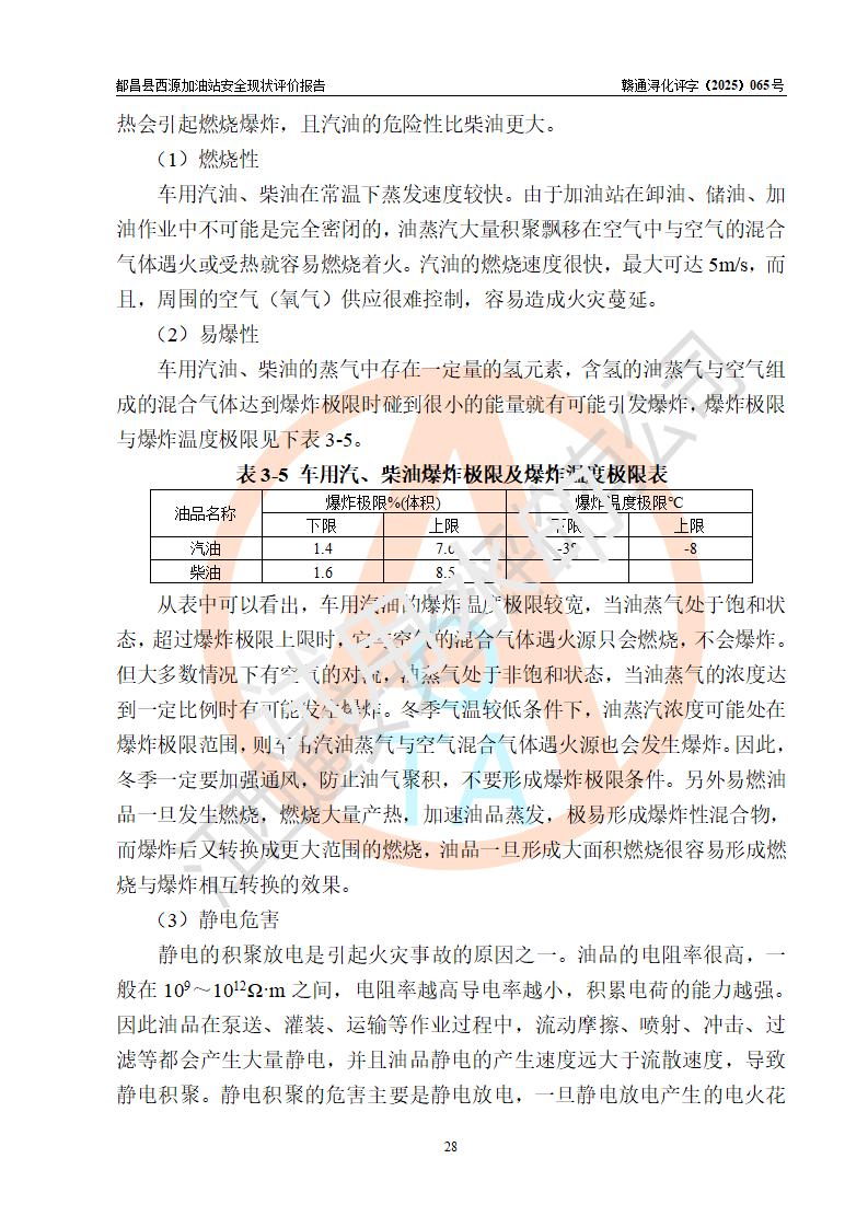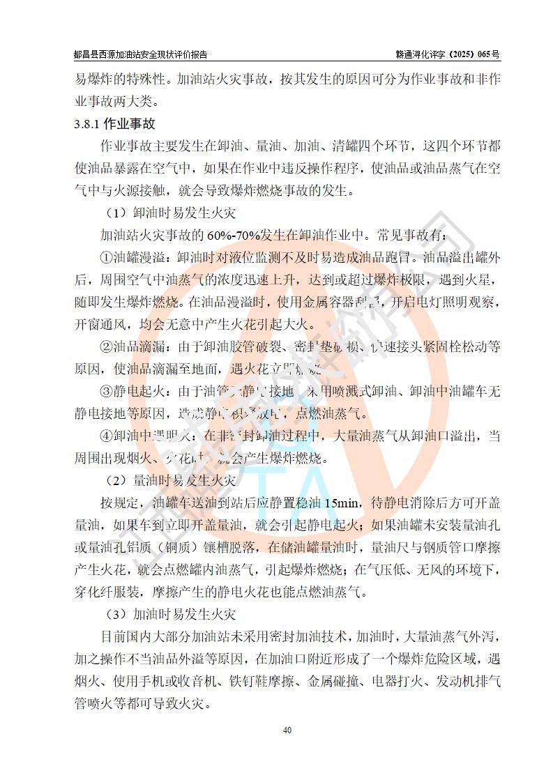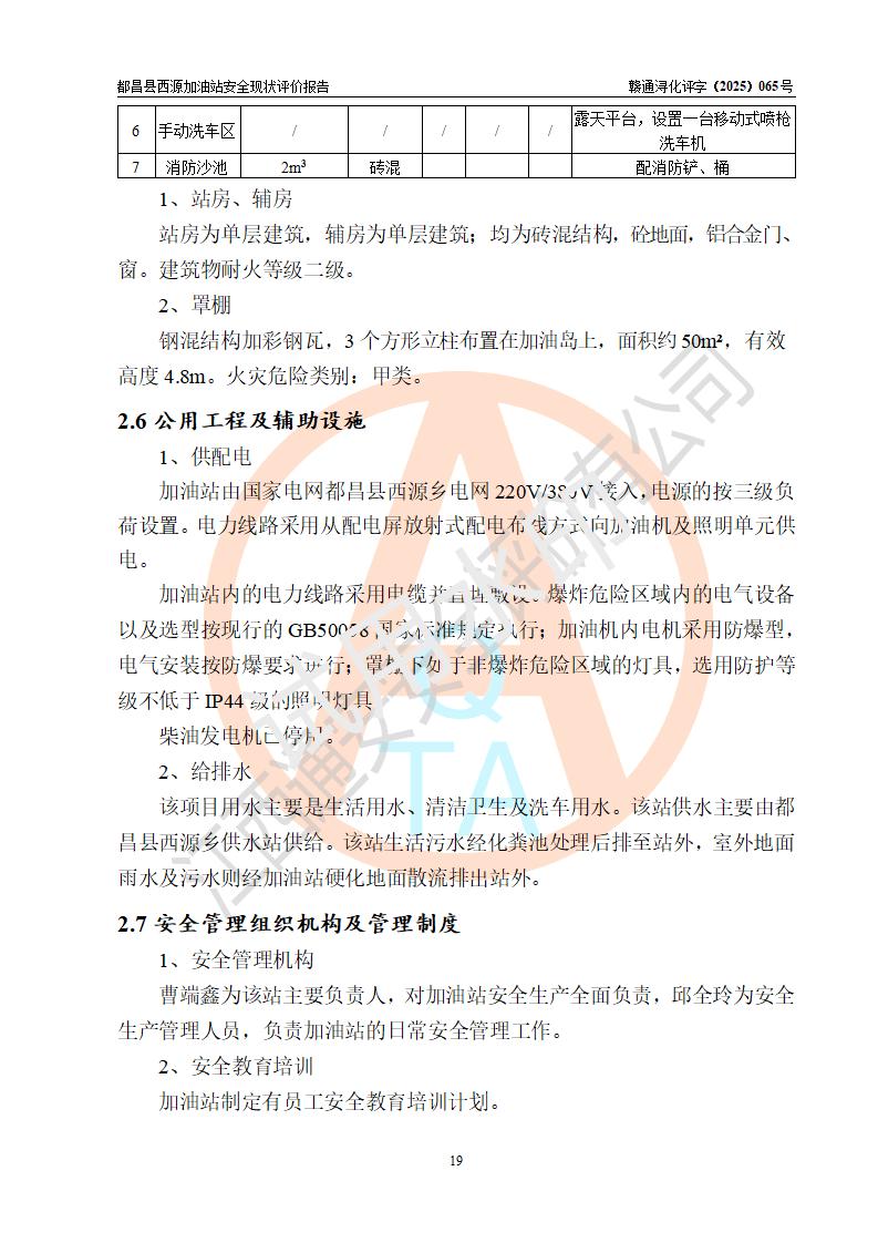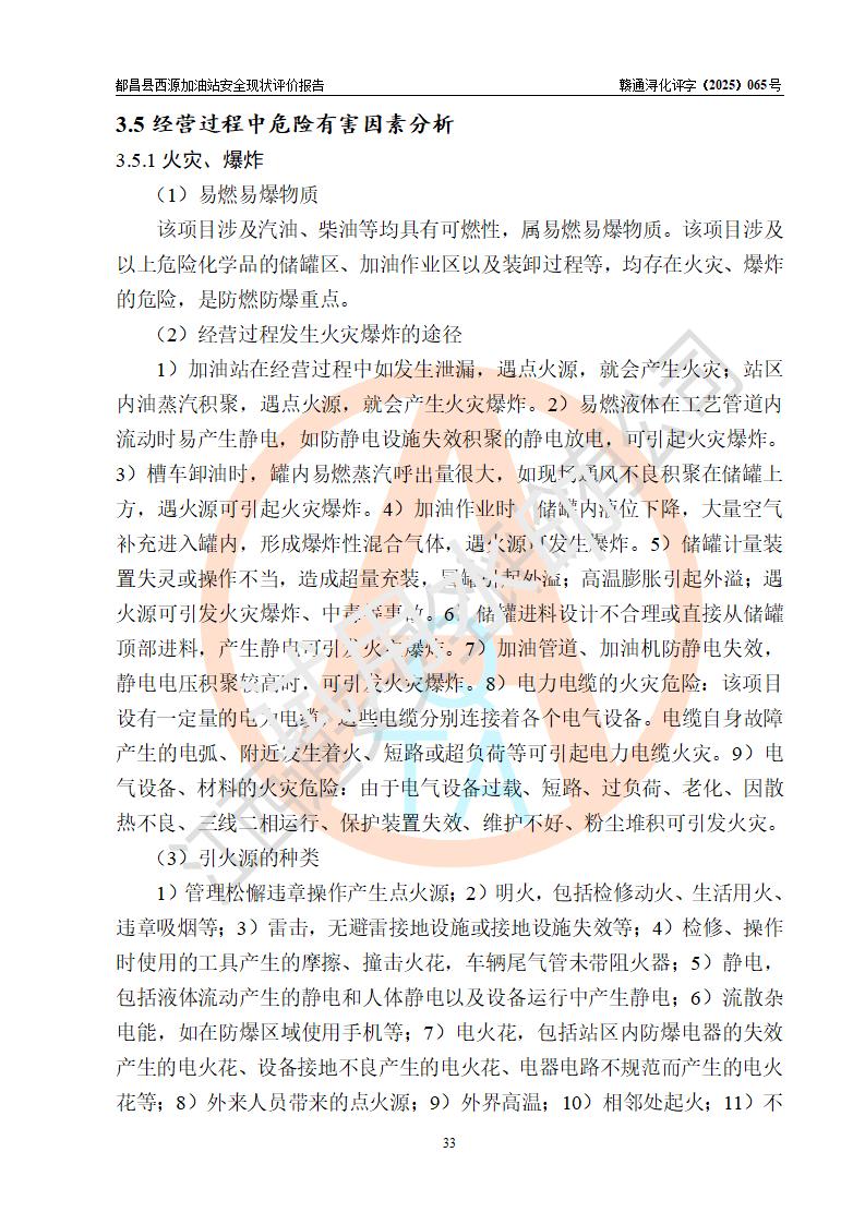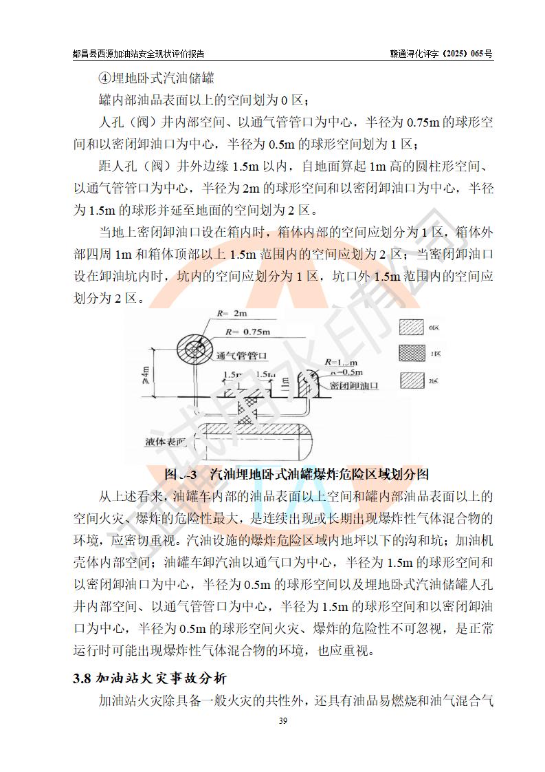 项目简介 | 都昌县西源加油站是一家专门从事成品油零售经营的个人独资企业,投资人:罗凑玲,经营场所位于都昌县西源乡西源路口。该加油站现有从业人员3人,其中安全管理人员1人,主要负责人曹端鑫。 该加油站站区占地面积约576m2,站区内设置有2台双枪程控燃油加油机及配套的工艺管线、50m3双层0#柴油储罐1台、30m3双层92#汽油储罐1台,油品储罐总容积为80m3(折算成汽油为55m3)。按现行《汽车加油加气加氢站技术标准》对加油站的等级划分原则,该站属于三级加油站。 该站由九江市行政审批局换发《危险化学品经营许可证》(证号:赣九行审经(甲)字[2023]000036号),**期限2023年04月24日至2025年09月19日。 | |||