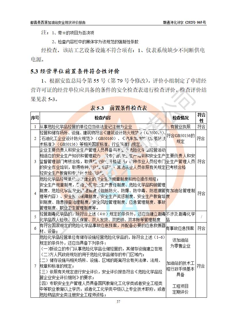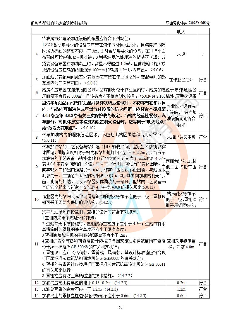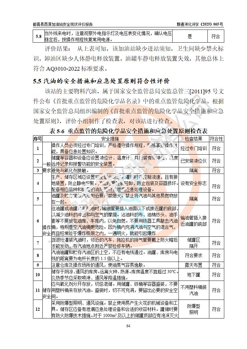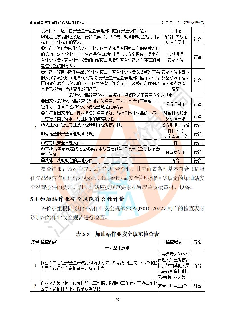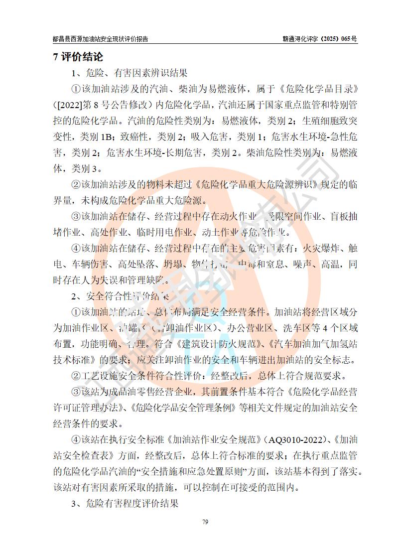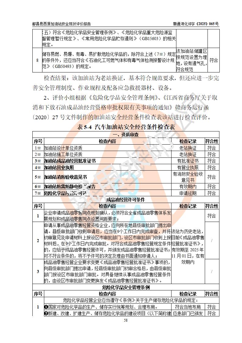 评价结论 | 都昌县西源加油站涉及的安全条件、安全经营条件、安全生产管理符合《危险化学品经营许可证管理办法》、《汽车加油加气加氢站技术标准》等**有关法规、标准、规范要求,能满足危险化学品经营安全条件。 | |||