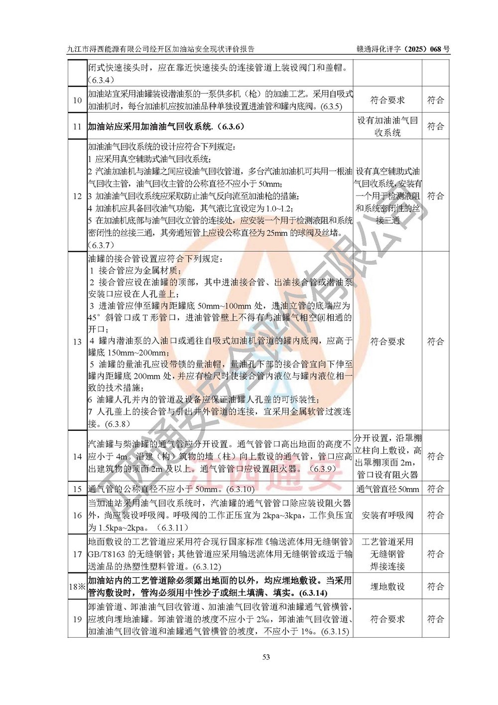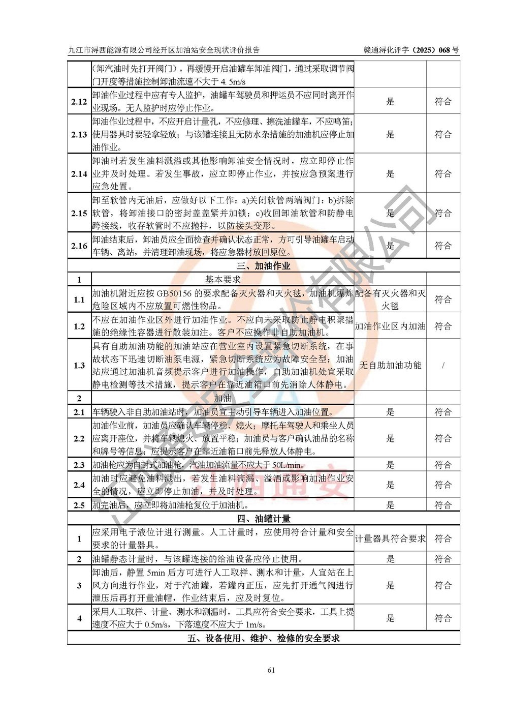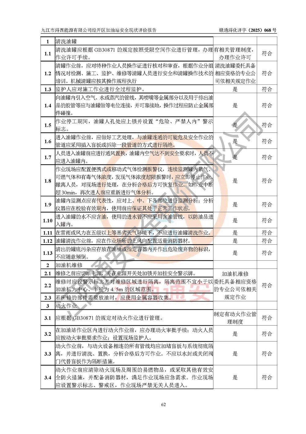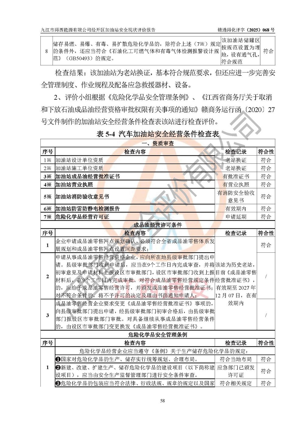 评价结论 | 九江市浔西能源有限公司经开区加油站涉及的安全条件、安全经营条件、安全生产管理符合《危险化学品经营许可证管理办法》、《汽车加油加气加氢站技术标准》等**有关法规、标准、规范要求,能满足危险化学品经营安全条件。 | |||
