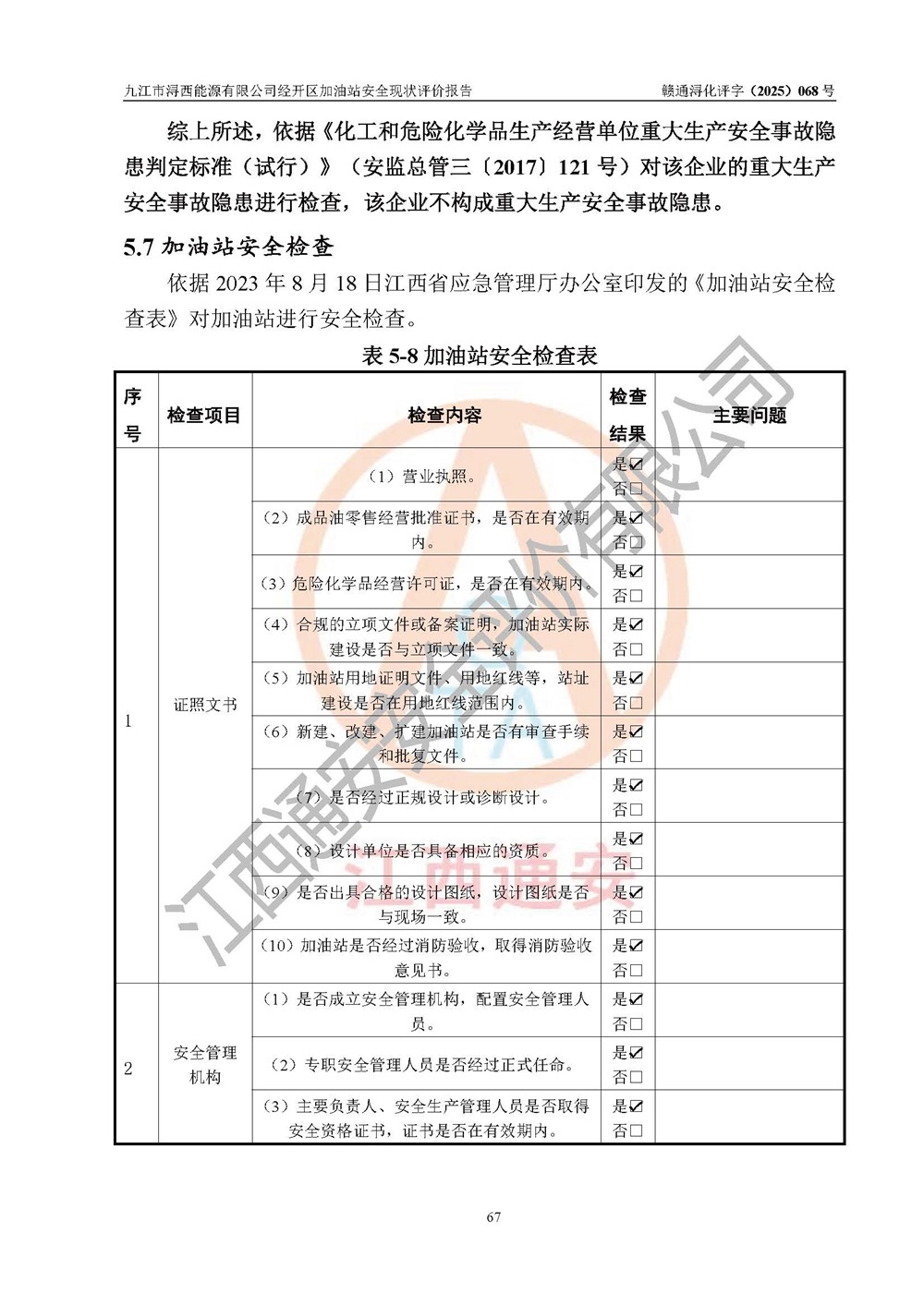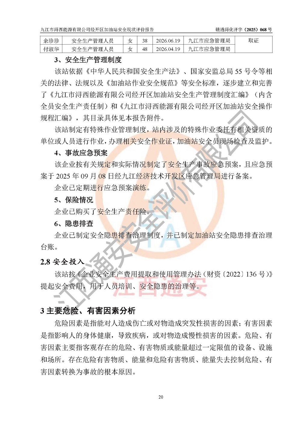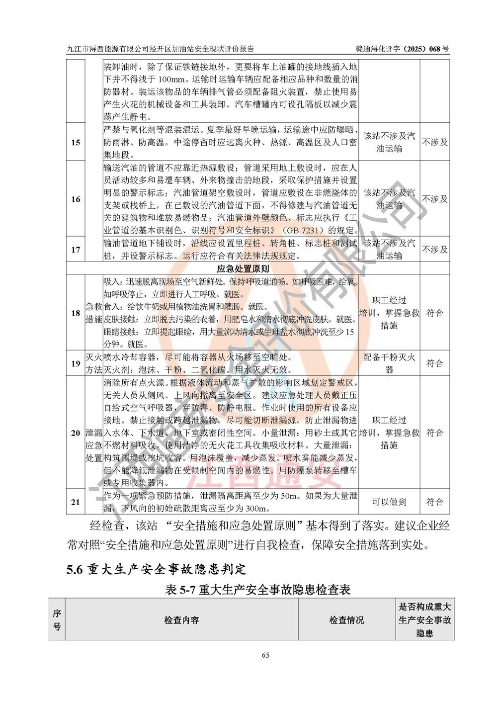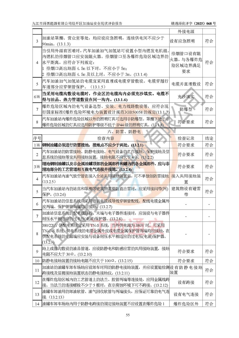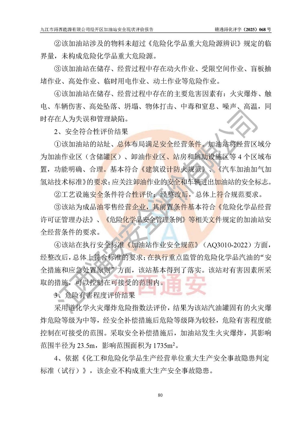 评价结论 | 九江市浔西能源有限公司经开区加油站涉及的安全条件、安全经营条件、安全生产管理符合《危险化学品经营许可证管理办法》、《汽车加油加气加氢站技术标准》等**有关法规、标准、规范要求,能满足危险化学品经营安全条件。 | |||