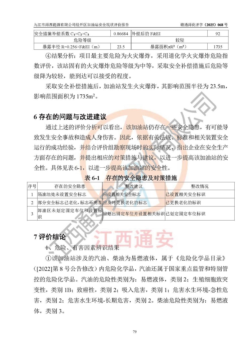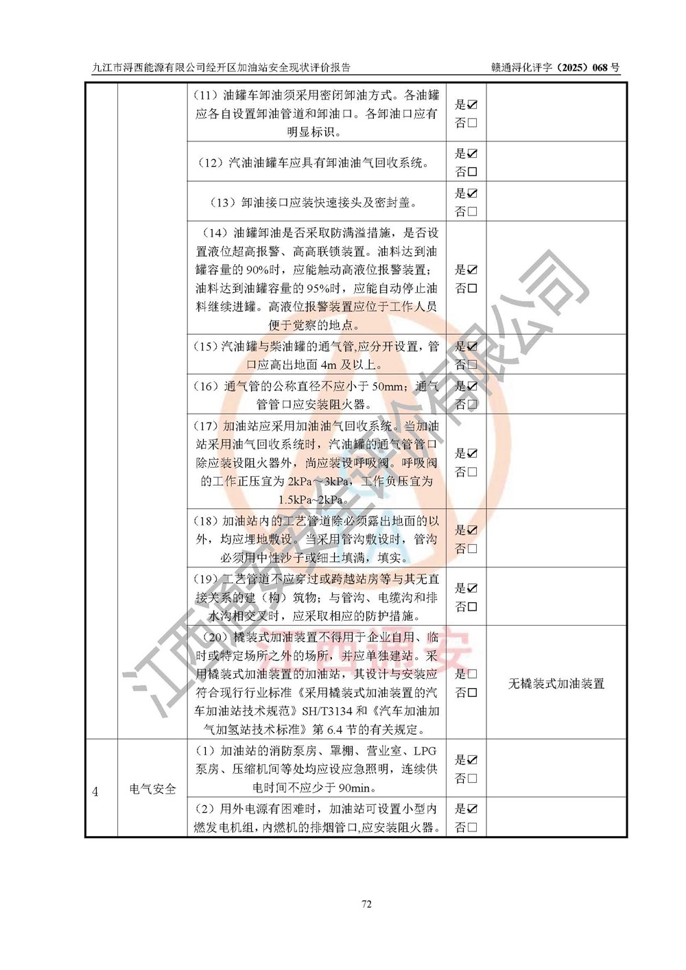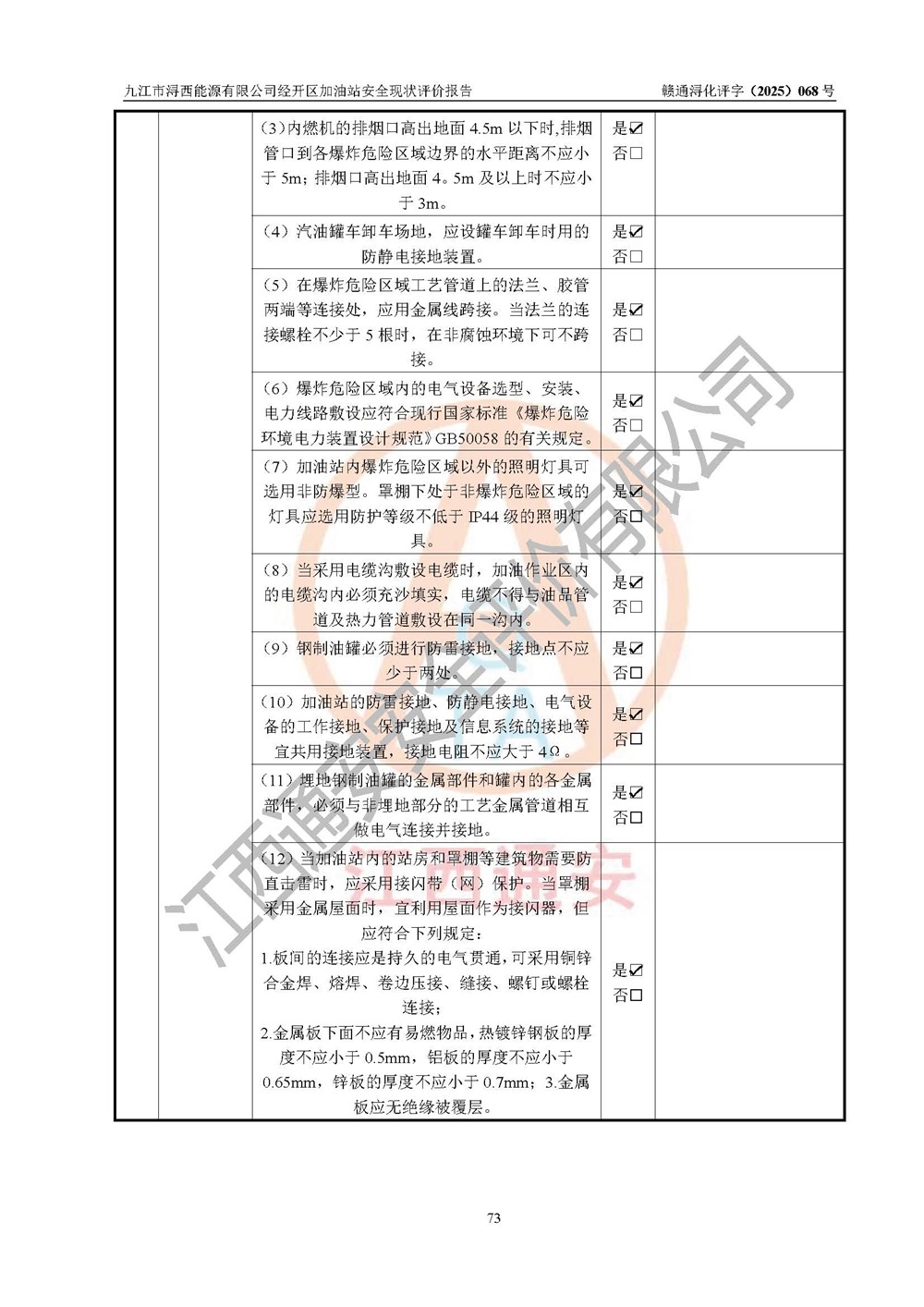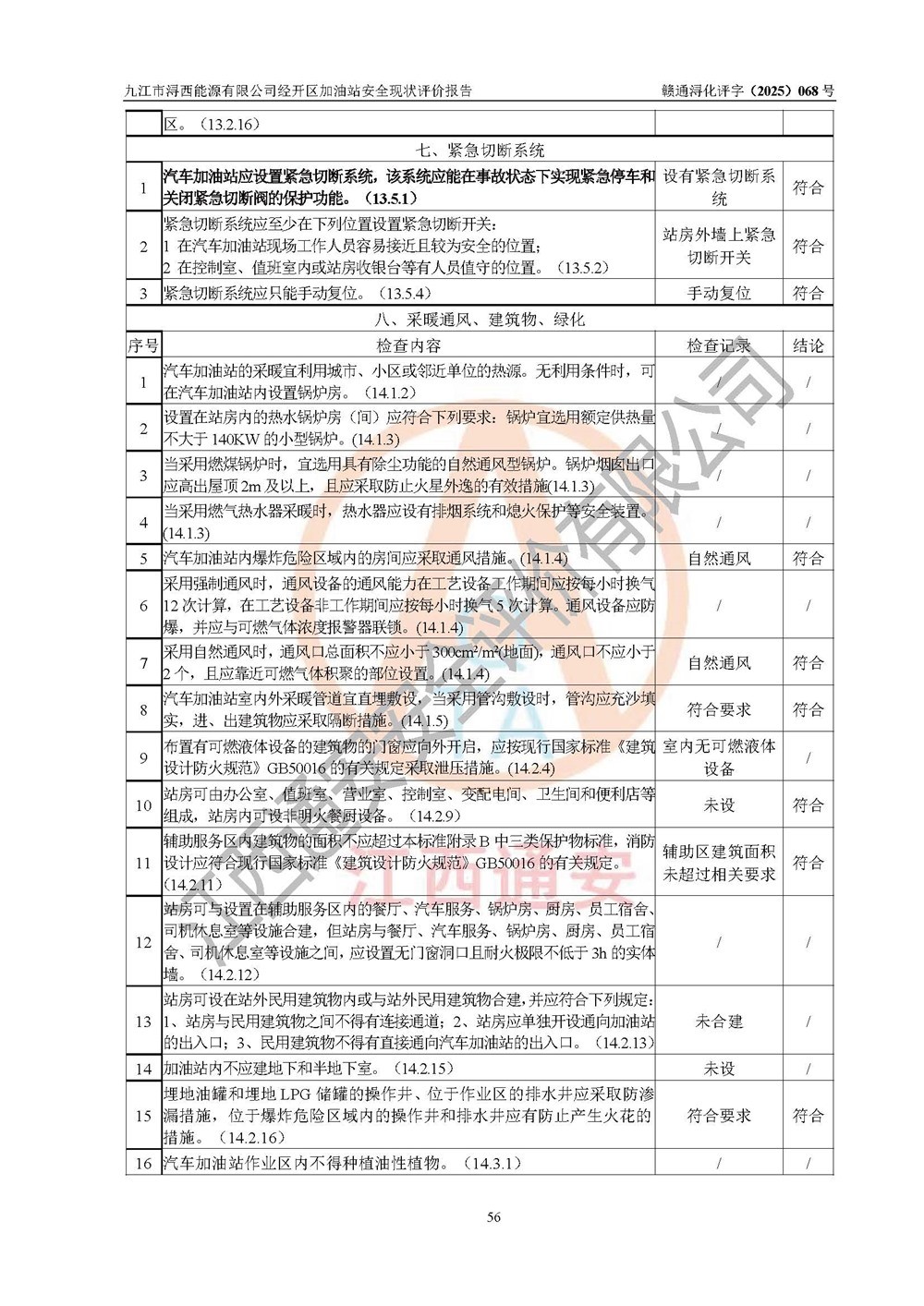 评价结论 | 九江市浔西能源有限公司经开区加油站涉及的安全条件、安全经营条件、安全生产管理符合《危险化学品经营许可证管理办法》、《汽车加油加气加氢站技术标准》等**有关法规、标准、规范要求,能满足危险化学品经营安全条件。 | |||