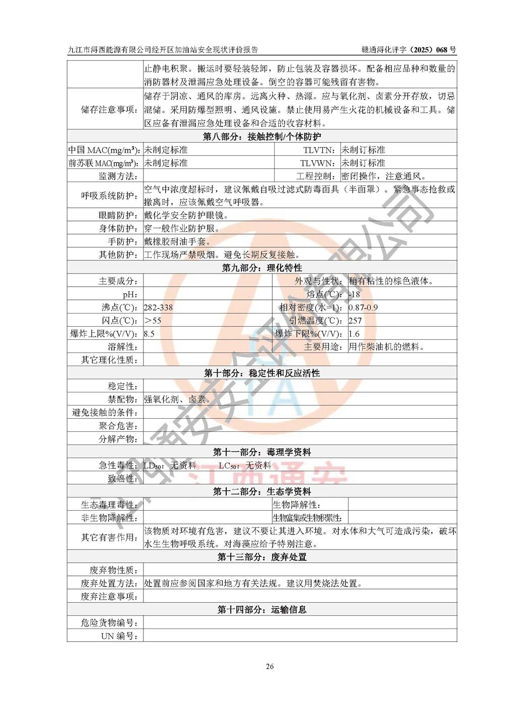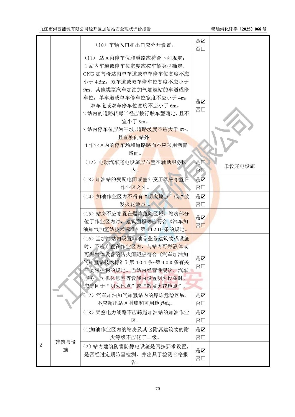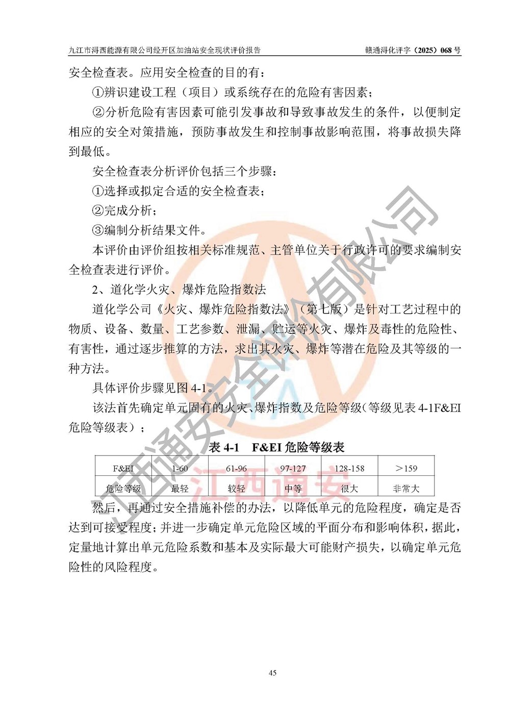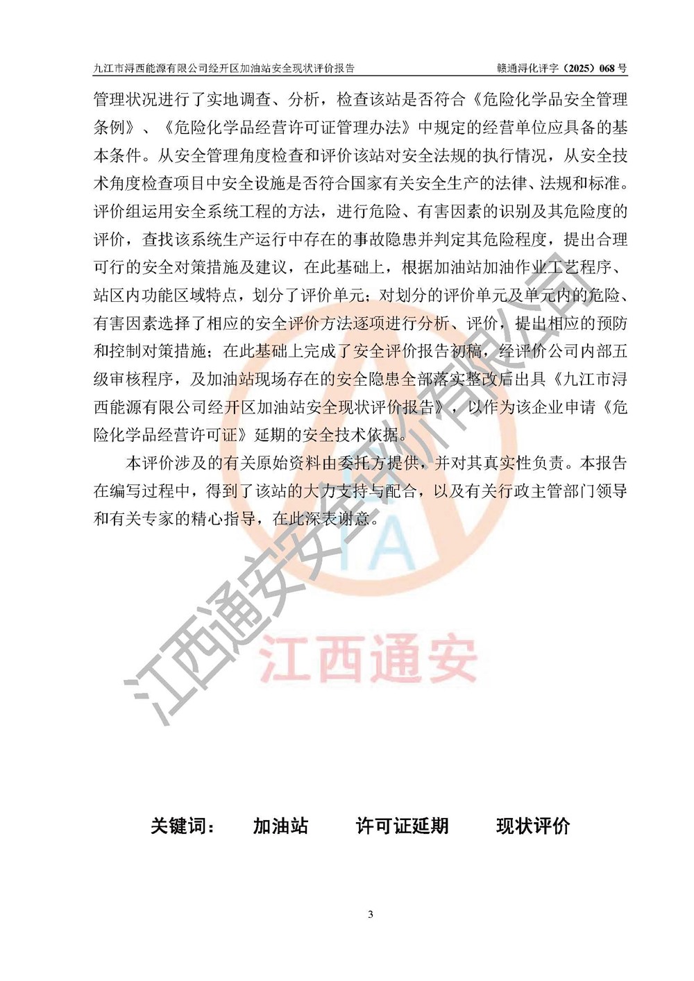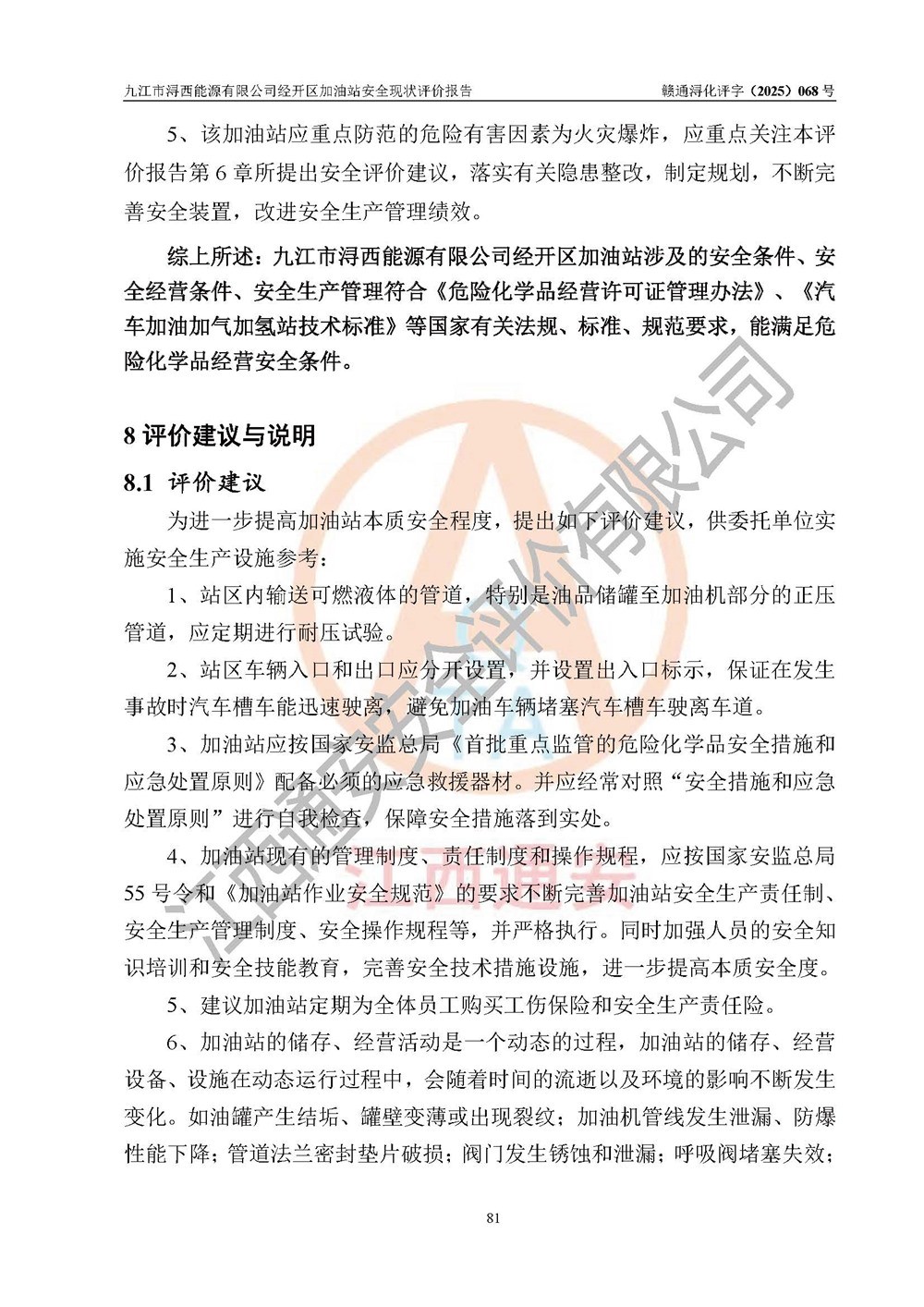 评价结论 | 九江市浔西能源有限公司经开区加油站涉及的安全条件、安全经营条件、安全生产管理符合《危险化学品经营许可证管理办法》、《汽车加油加气加氢站技术标准》等**有关法规、标准、规范要求,能满足危险化学品经营安全条件。 | |||