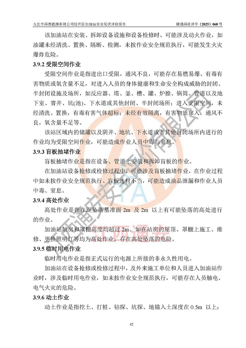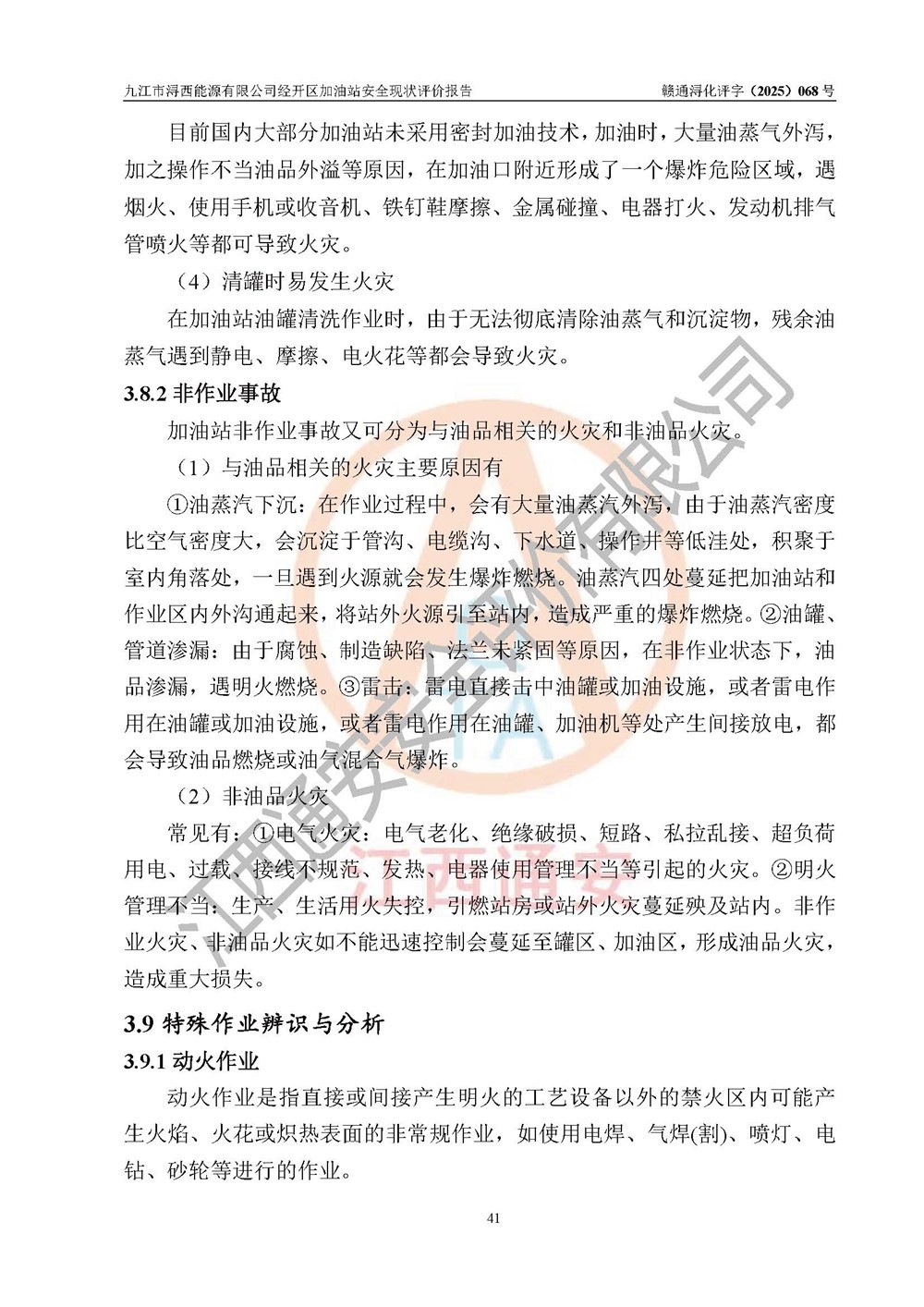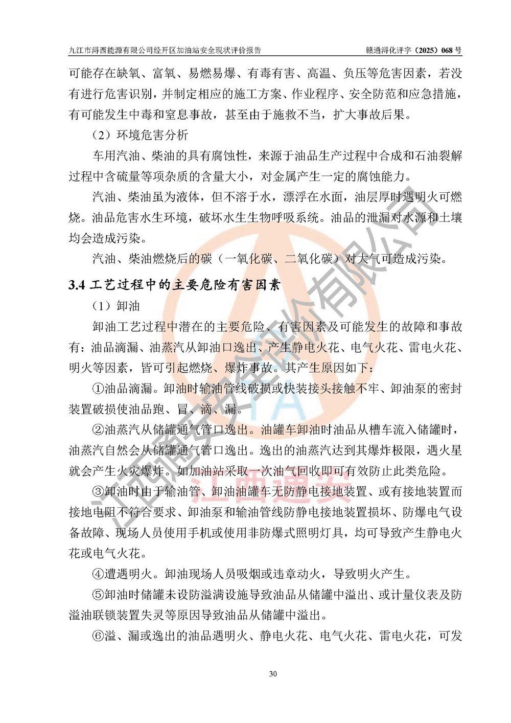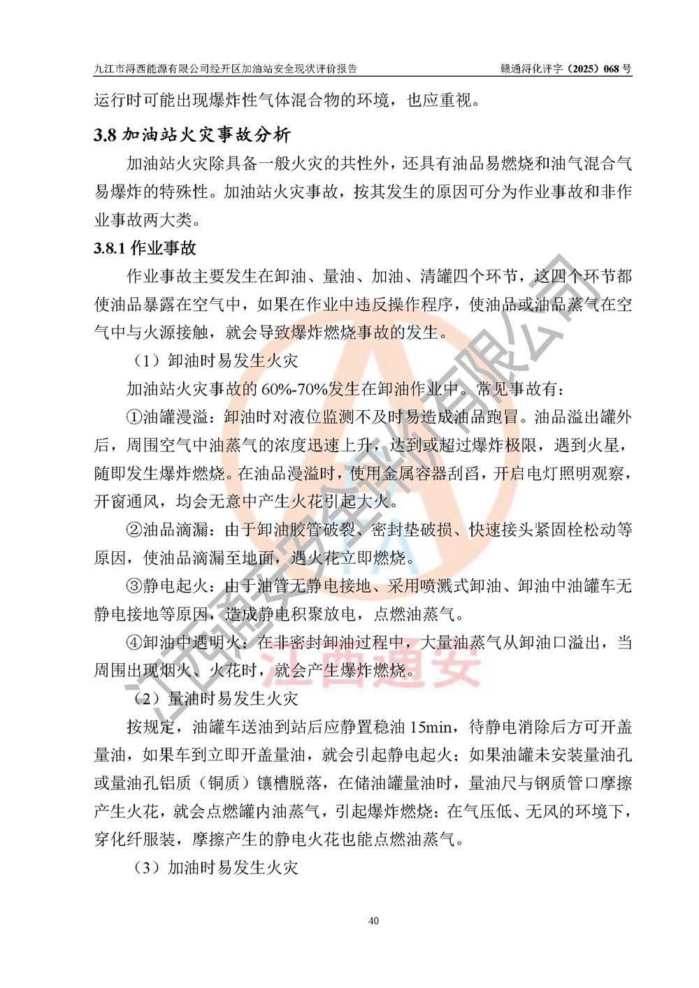 评价结论 | 九江市浔西能源有限公司经开区加油站涉及的安全条件、安全经营条件、安全生产管理符合《危险化学品经营许可证管理办法》、《汽车加油加气加氢站技术标准》等**有关法规、标准、规范要求,能满足危险化学品经营安全条件。 | |||
