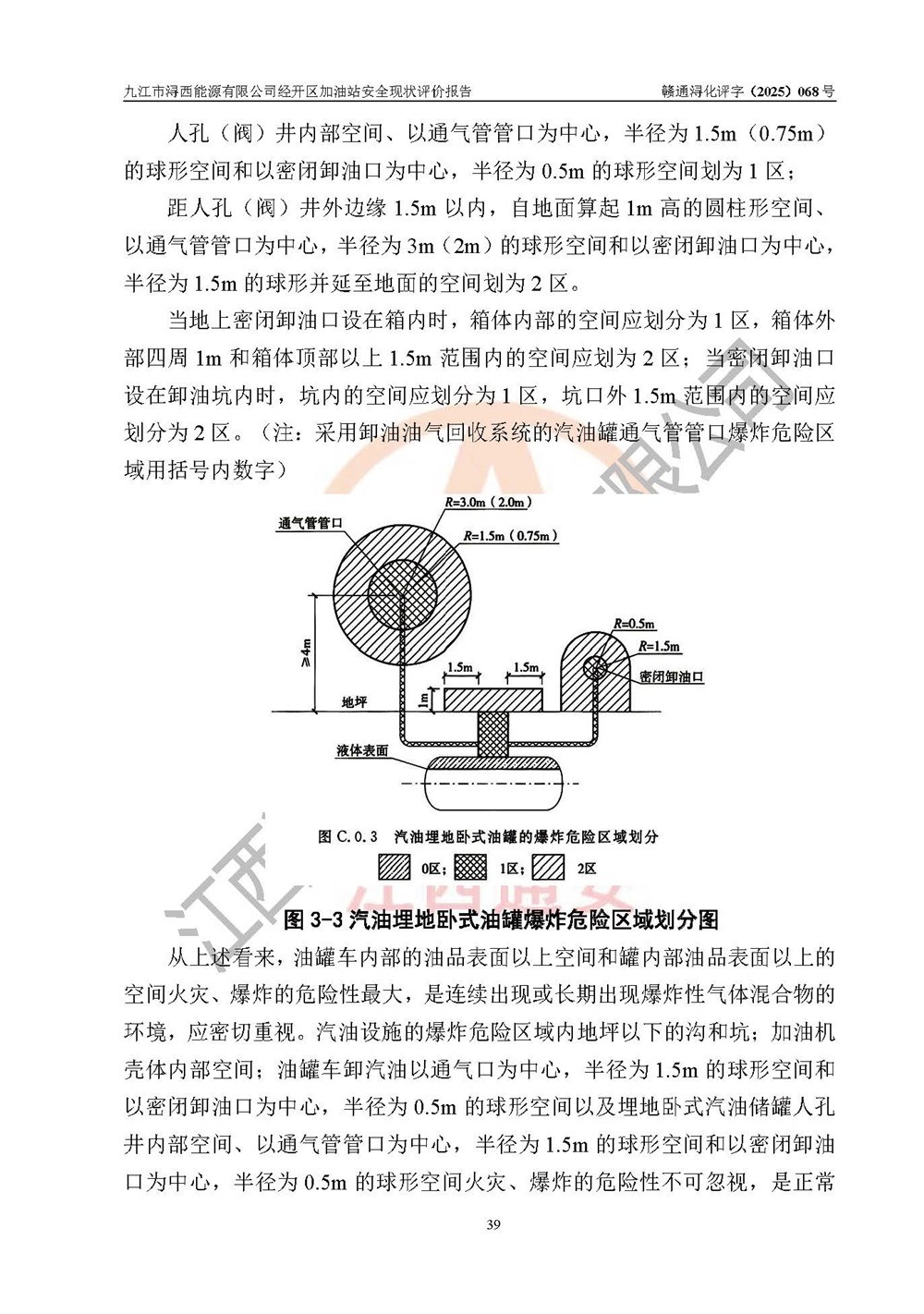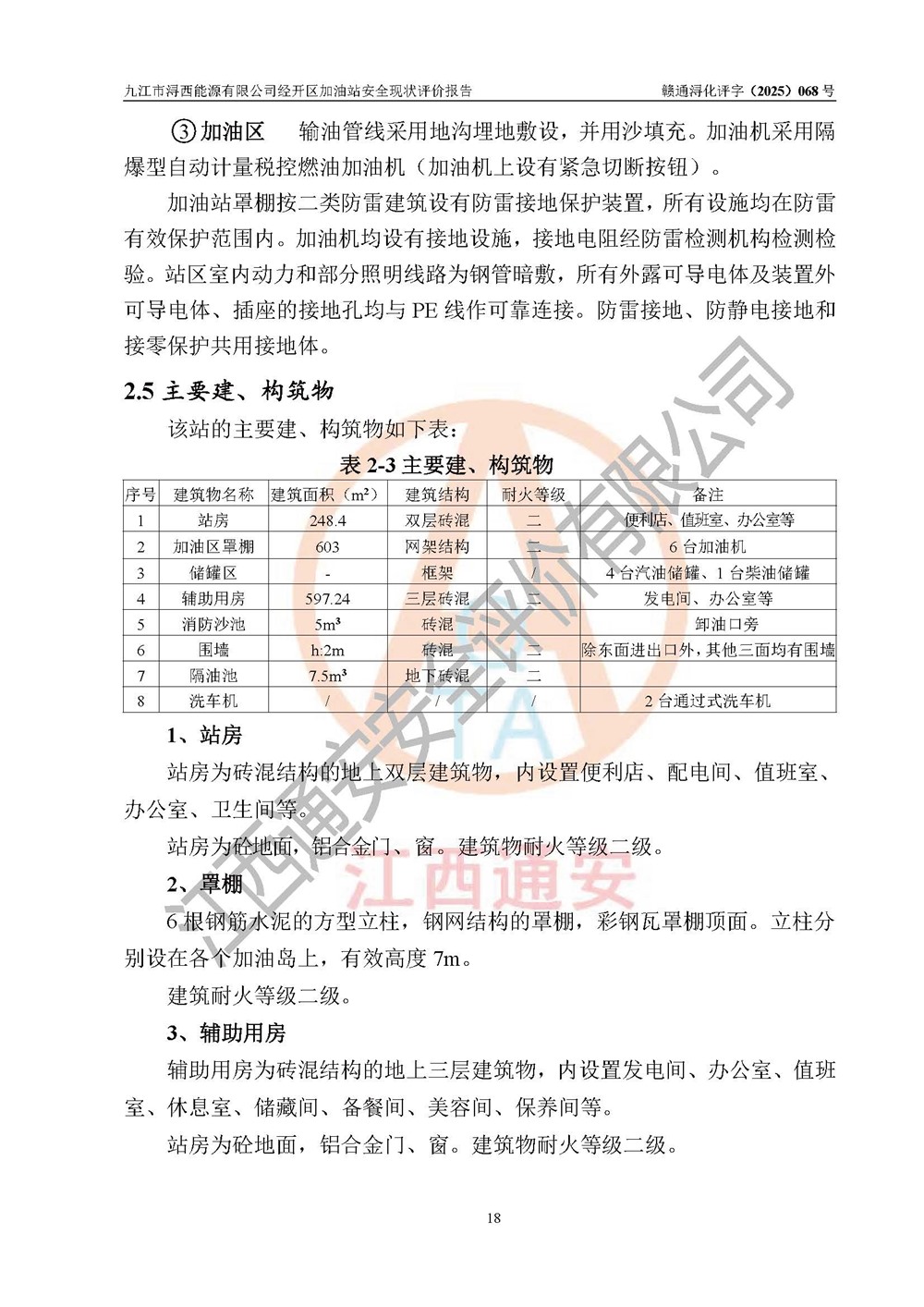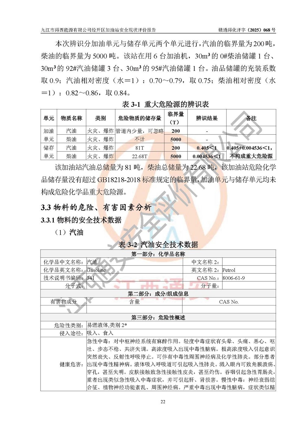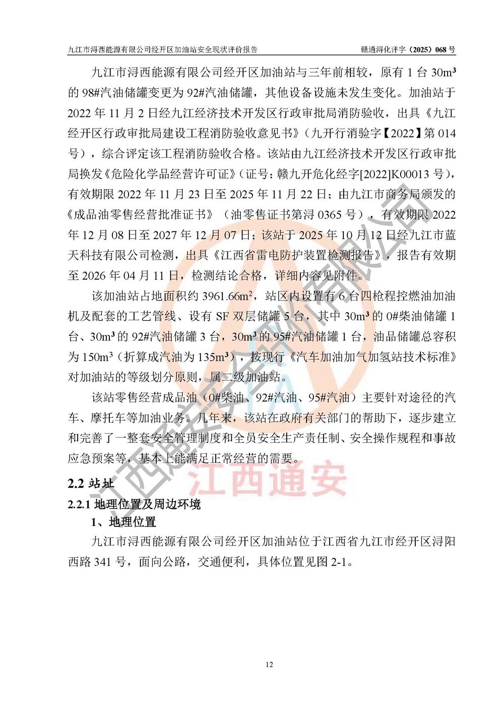 项目简介 | 九江市浔西能源有限公司经开区加油站是一家专门从事成品油零售经营的有限责任公司分公司(自然人投资或控股),经营场所位于江西省九江市经开区浔阳西路341号。现有从业人员15名,其中安全管理人员1人,加油站负责人黎晖。 该加油站占地面积约3961.66m2,站区内设置有6台四枪程控燃油加油机及配套的工艺管线、设有SF双层储罐5台,其中30m3的0#柴油储罐1台、30m3的92#汽油储罐3台,30m3的95#汽油储罐1台,油品储罐总容积为150m3(折算成汽油为135m3),按现行《汽车加油加气加氢站技术标准》对加油站的等级划分原则,属二级加油站。 该站由九江经济技术开发区行政审批局换发《危险化学品经营许可证》(证号:赣九开危化经字[2022]K00013号),**期限2022年11月23日至2025年11月22日日。 | |||