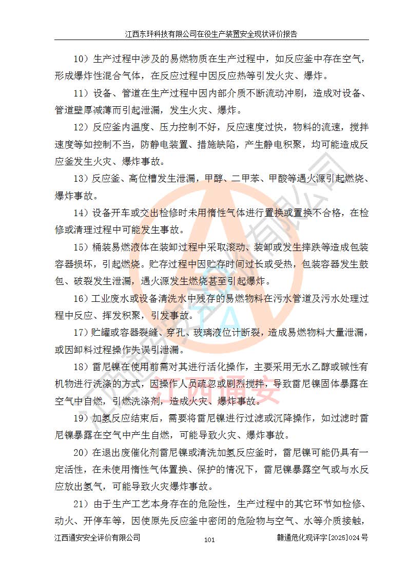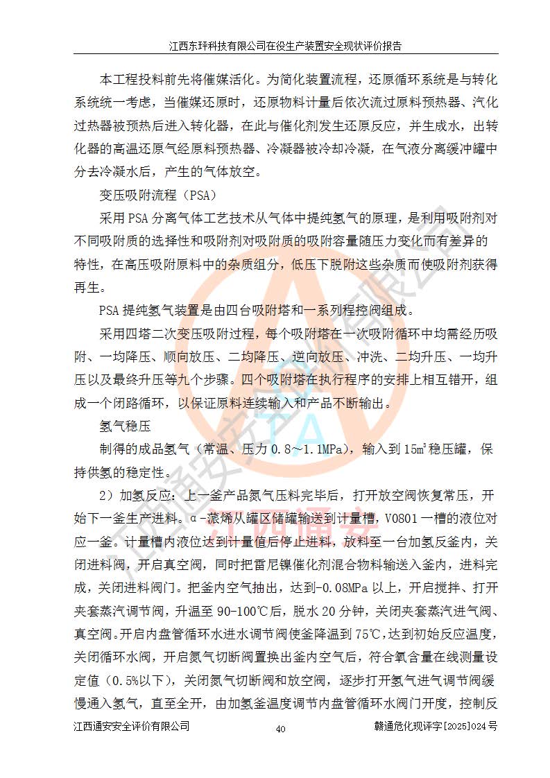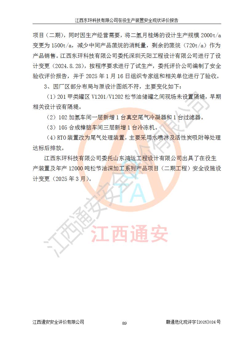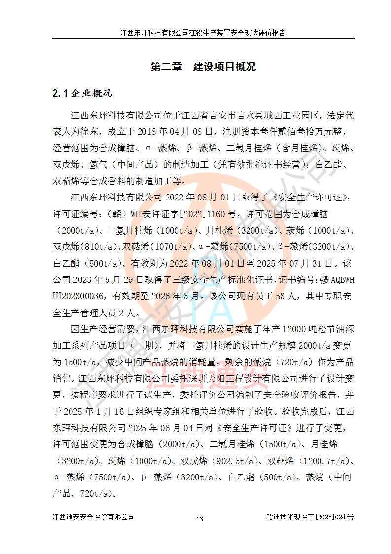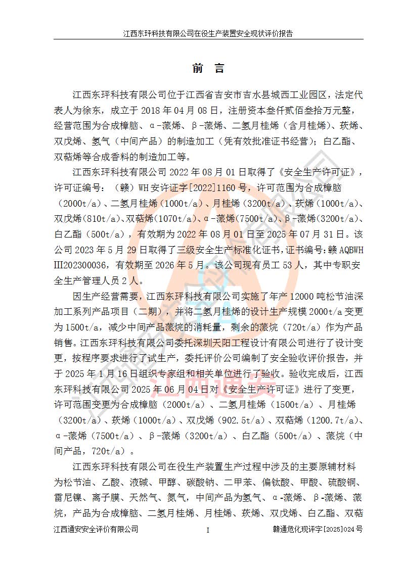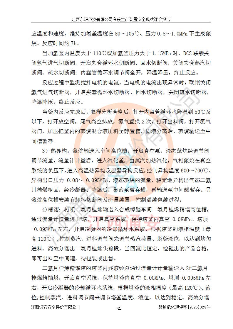 江西东玶科技有限公司位于江西省吉安市吉水县城西工业园区,法定**人为徐东,成立于2018年04月08日,注册资本叁仟贰佰叁拾万元整,经营范围为合成樟脑、α-蒎烯、β-蒎烯、二氢月桂烯(含月桂烯)、莰烯、双戊烯、氢气(中间产品)的制造加工(凭**批准证书经营);白乙酯、双萜烯等合成香料的制造加工等。 江西东玶科技有限公司2022年08月01日取得了《安全生产许可证》,许可证编号:(赣)WH安许证字[2022]1160号,许可范围为合成樟脑(2000t/a)、二氢月桂烯(1000t/a)、月桂烯(3200t/a)、莰烯(1000t/a)、双戊烯(810t/a)、双萜烯(1070t/a)、α-蒎烯(7500t/a)、β-蒎烯(3200t/a)、白乙酯(500t/a),**期为2022年08月01日至2025年07月31日。该公司2023年5月29日取得了三级安全生产标准化证书,证书编号:赣AQBWHⅢ202300036,**期至2026年5月。该公司现有员工53人,其中专职安全生产管理人员2人。 因生产经营需要,江西东玶科技有限公司实施了年产12000吨松节油深加工系列产品项目(二期),并将二氢月桂烯的设计生产规模2000t/a变更为1500t/a,减少中间产品蒎烷的消耗量,剩余的蒎烷(720t/a)作为产品销售。江西东玶科技有限公司委托深圳天阳工程设计有限公司进行了设计变更,按程序要求进行了试生产,委托评价公司编制了安全验收评价报告,并于2025年1月16日组织专家组和相关单位进行了验收。验收完成后,江西东玶科技有限公司2025年06月04日对《安全生产许可证》进行了变更,许可范围变更为合成樟脑(2000t/a)、二氢月桂烯(1500t/a)、月桂烯(3200t/a)、莰烯(1000t/a)、双戊烯(902.5t/a)、双萜烯(1200.7t/a)、α-蒎烯(7500t/a)、β-蒎烯(3200t/a)、白乙酯(500t/a)、蒎烷(中间产品,720t/a)。 江西东玶科技有限公司在役生产装置生产过程中涉及的主要原辅材料为松节油、乙酸、液碱、甲醇、碳酸钠、二甲苯、偏钛酸、甲酸、硫酸铜、雷尼镍、离子膜、天然气、氮气,中间产品为氢气、α-蒎烯、β-蒎烯、蒎烷,产品为合成樟脑、二氢月桂烯、月桂烯、莰烯、双戊烯、白乙酯、双萜烯,副产品为醋酸钠。根据《危险化学品目录》,该在役生产装置涉及的松节油、乙酸、液碱、甲醇、二甲苯、甲酸、雷尼镍、天然气(燃料)、氮气(压缩的)、柴油,中间产品α-蒎烯、β-蒎烯、氢气、蒎烷和产品中合成樟脑、二氢月桂烯、月桂烯、莰烯、双戊烯属于危险化学品。经辨识,甲醇、氢气和天然气(燃料)属于重点监管的危险化学品,甲醇属于特别管控的危险化学品,不涉及监控化学品、易制毒化学品、易制爆危险化学品、剧毒化学品和高毒物品,生产、储存单元不构成危险化学品重大危险源,涉及的加氢工艺属于重点监管的危险化工工艺。根据生产工艺特点及物料的理化特性可知,该在役生产装置生产过程中存在火灾与爆炸、中毒与窒息、触电、机械伤害、灼烫等危险有害因素。 该公司自2022年08月01日取得安全生产许可证以来,生产运行正常,未发生一般及以上生产安全事故。 |