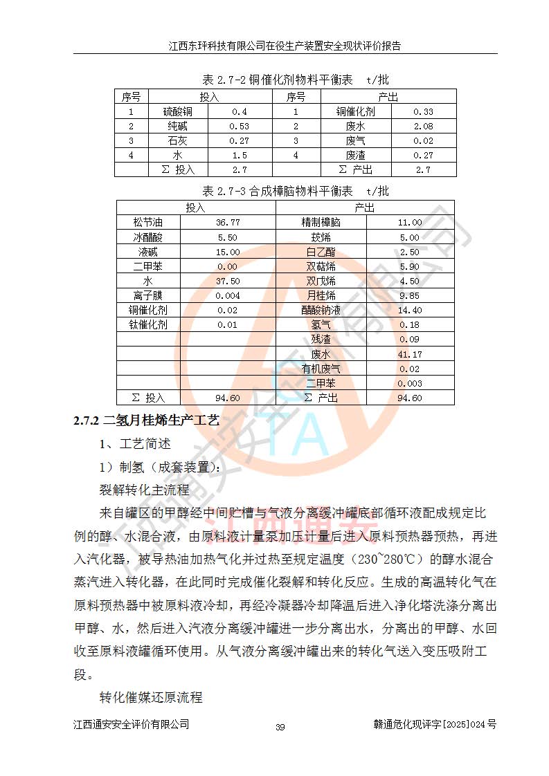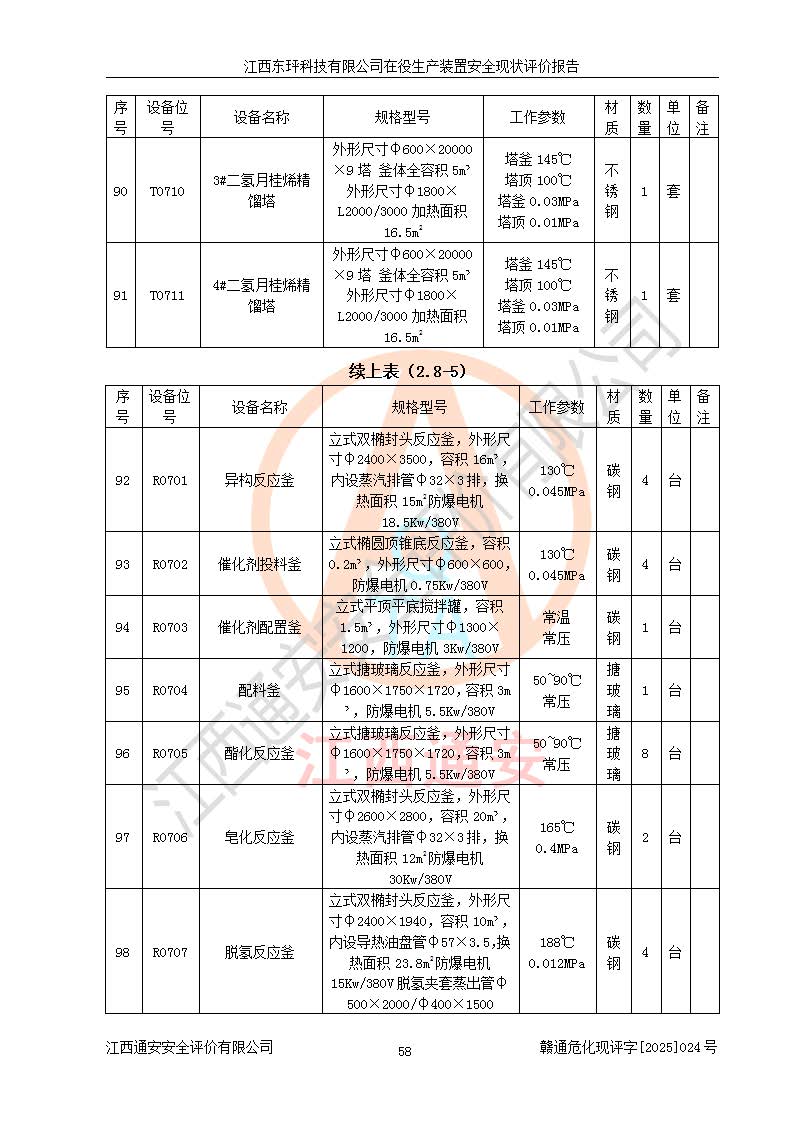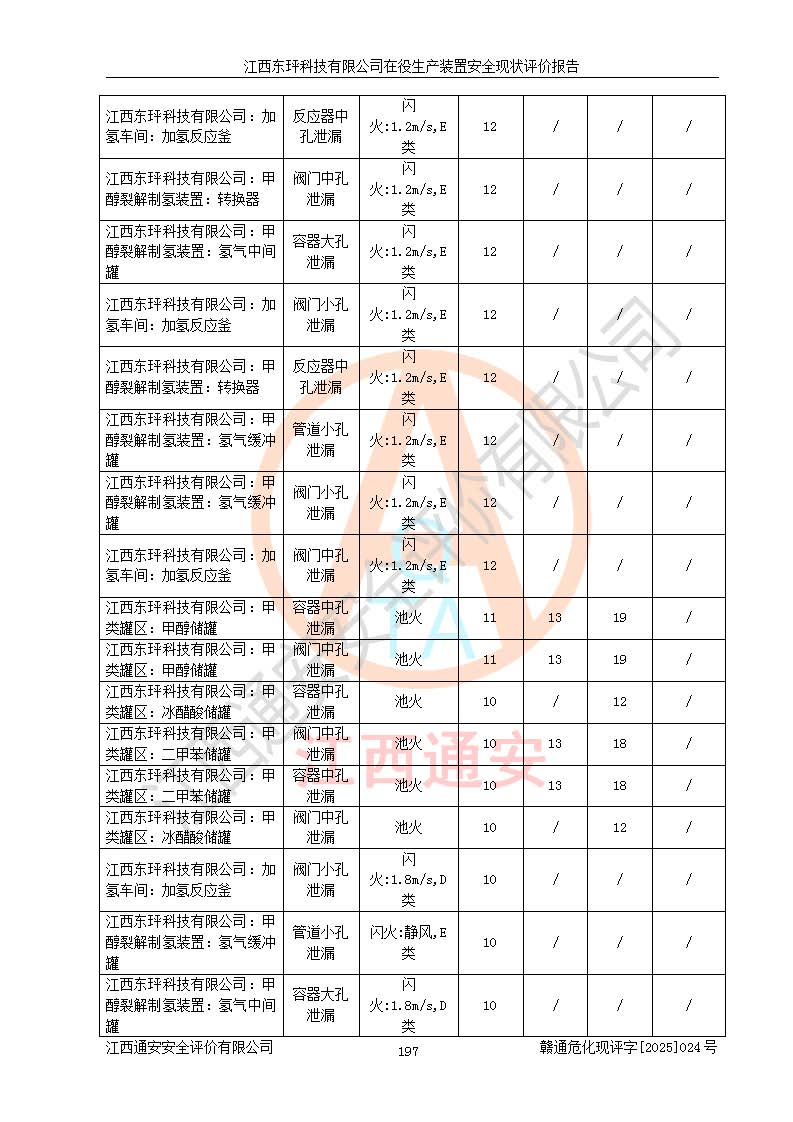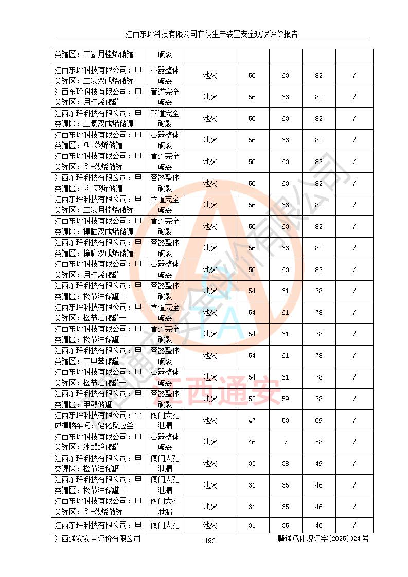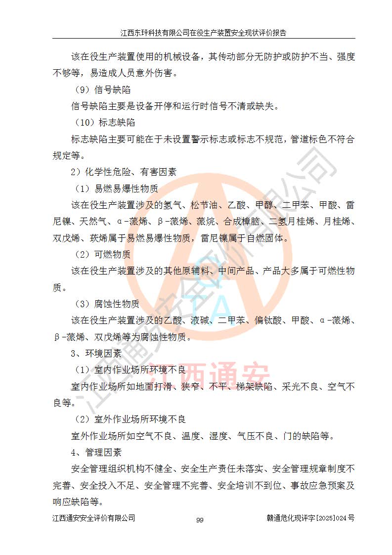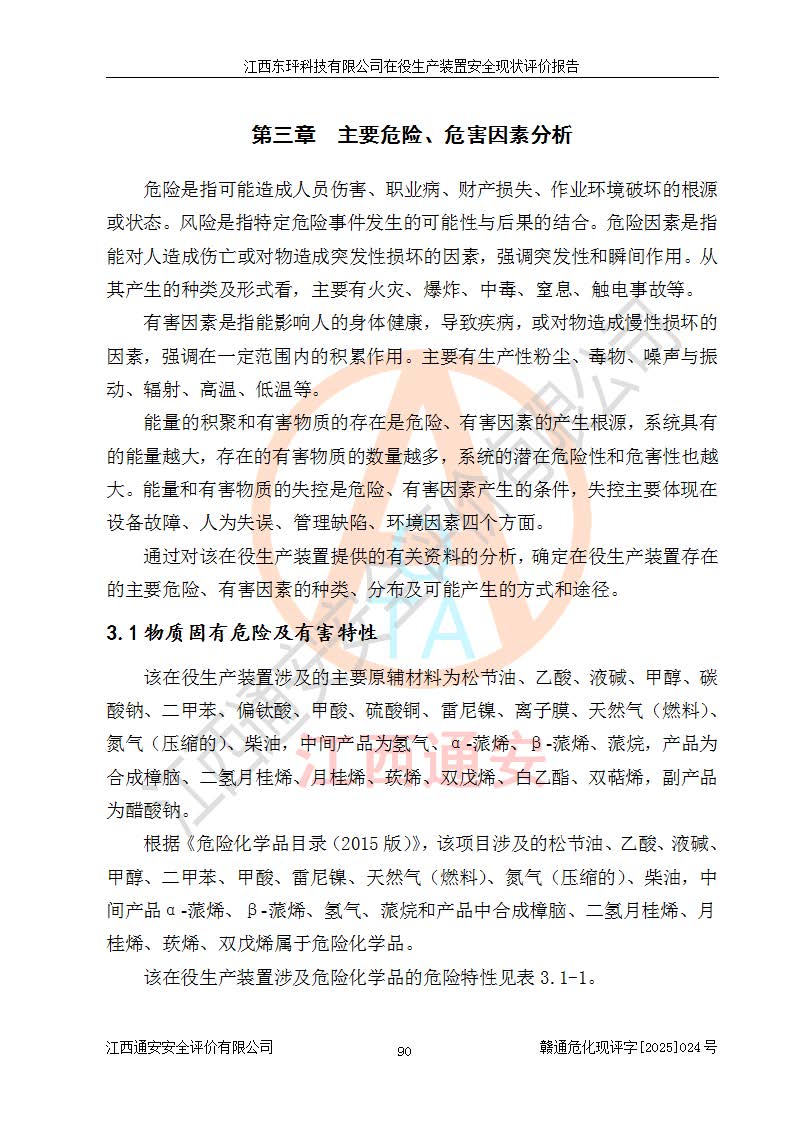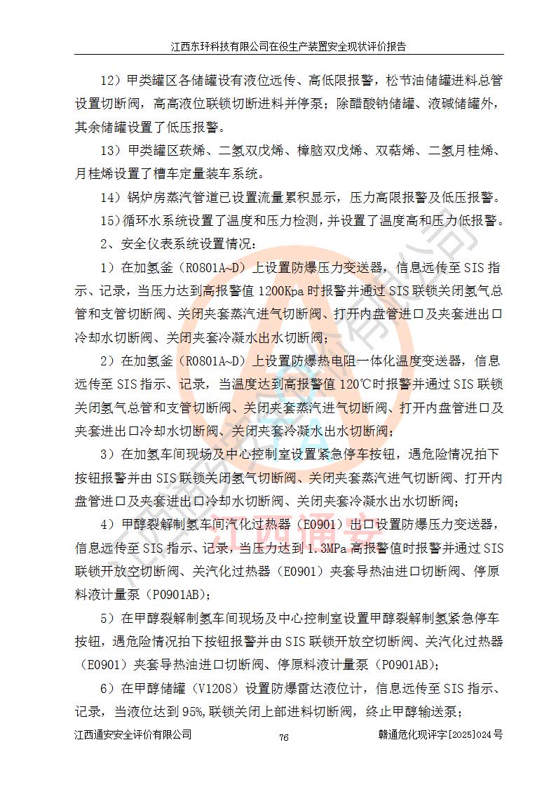 江西东玶科技有限公司位于江西省吉安市吉水县城西工业园区,法定**人为徐东,成立于2018年04月08日,注册资本叁仟贰佰叁拾万元整,经营范围为合成樟脑、α-蒎烯、β-蒎烯、二氢月桂烯(含月桂烯)、莰烯、双戊烯、氢气(中间产品)的制造加工(凭**批准证书经营);白乙酯、双萜烯等合成香料的制造加工等。 江西东玶科技有限公司2022年08月01日取得了《安全生产许可证》,许可证编号:(赣)WH安许证字[2022]1160号,许可范围为合成樟脑(2000t/a)、二氢月桂烯(1000t/a)、月桂烯(3200t/a)、莰烯(1000t/a)、双戊烯(810t/a)、双萜烯(1070t/a)、α-蒎烯(7500t/a)、β-蒎烯(3200t/a)、白乙酯(500t/a),**期为2022年08月01日至2025年07月31日。该公司2023年5月29日取得了三级安全生产标准化证书,证书编号:赣AQBWHⅢ202300036,**期至2026年5月。该公司现有员工53人,其中专职安全生产管理人员2人。 因生产经营需要,江西东玶科技有限公司实施了年产12000吨松节油深加工系列产品项目(二期),并将二氢月桂烯的设计生产规模2000t/a变更为1500t/a,减少中间产品蒎烷的消耗量,剩余的蒎烷(720t/a)作为产品销售。江西东玶科技有限公司委托深圳天阳工程设计有限公司进行了设计变更,按程序要求进行了试生产,委托评价公司编制了安全验收评价报告,并于2025年1月16日组织专家组和相关单位进行了验收。验收完成后,江西东玶科技有限公司2025年06月04日对《安全生产许可证》进行了变更,许可范围变更为合成樟脑(2000t/a)、二氢月桂烯(1500t/a)、月桂烯(3200t/a)、莰烯(1000t/a)、双戊烯(902.5t/a)、双萜烯(1200.7t/a)、α-蒎烯(7500t/a)、β-蒎烯(3200t/a)、白乙酯(500t/a)、蒎烷(中间产品,720t/a)。 江西东玶科技有限公司在役生产装置生产过程中涉及的主要原辅材料为松节油、乙酸、液碱、甲醇、碳酸钠、二甲苯、偏钛酸、甲酸、硫酸铜、雷尼镍、离子膜、天然气、氮气,中间产品为氢气、α-蒎烯、β-蒎烯、蒎烷,产品为合成樟脑、二氢月桂烯、月桂烯、莰烯、双戊烯、白乙酯、双萜烯,副产品为醋酸钠。根据《危险化学品目录》,该在役生产装置涉及的松节油、乙酸、液碱、甲醇、二甲苯、甲酸、雷尼镍、天然气(燃料)、氮气(压缩的)、柴油,中间产品α-蒎烯、β-蒎烯、氢气、蒎烷和产品中合成樟脑、二氢月桂烯、月桂烯、莰烯、双戊烯属于危险化学品。经辨识,甲醇、氢气和天然气(燃料)属于重点监管的危险化学品,甲醇属于特别管控的危险化学品,不涉及监控化学品、易制毒化学品、易制爆危险化学品、剧毒化学品和高毒物品,生产、储存单元不构成危险化学品重大危险源,涉及的加氢工艺属于重点监管的危险化工工艺。根据生产工艺特点及物料的理化特性可知,该在役生产装置生产过程中存在火灾与爆炸、中毒与窒息、触电、机械伤害、灼烫等危险有害因素。 该公司自2022年08月01日取得安全生产许可证以来,生产运行正常,未发生一般及以上生产安全事故。 |