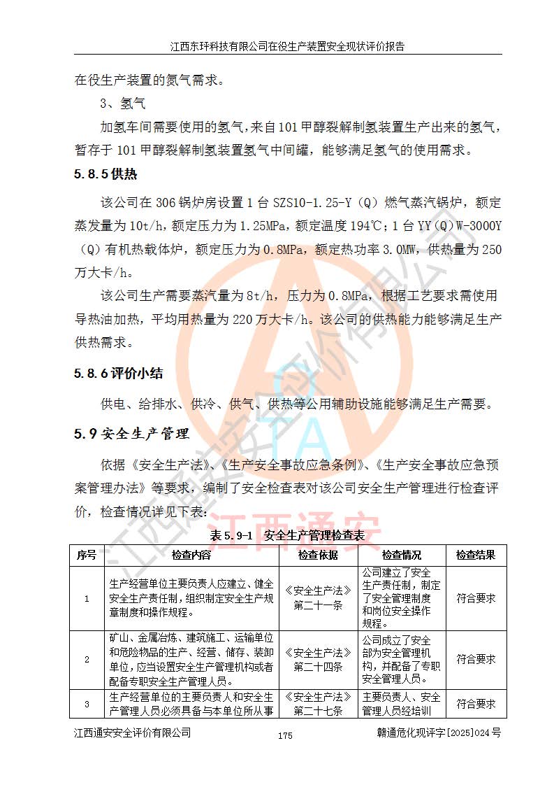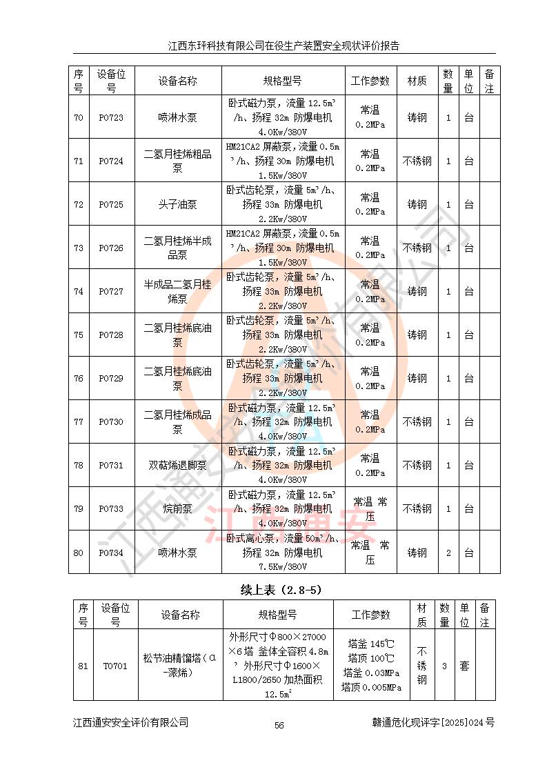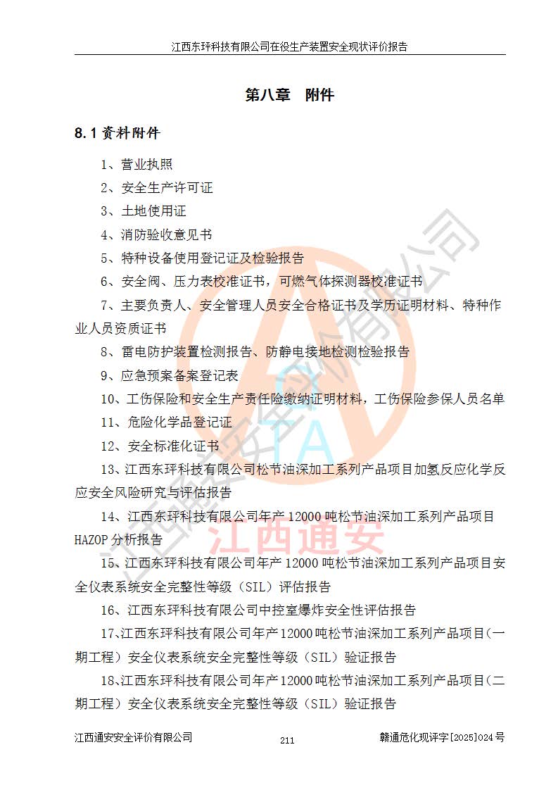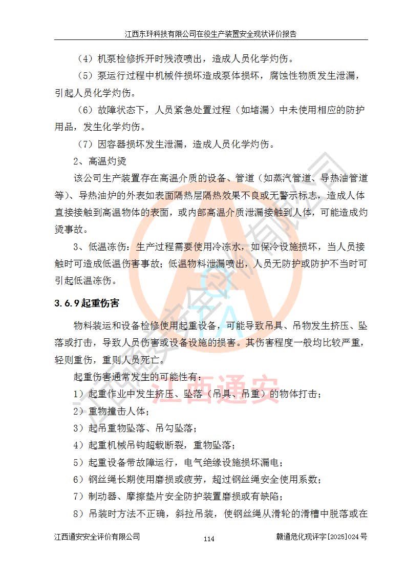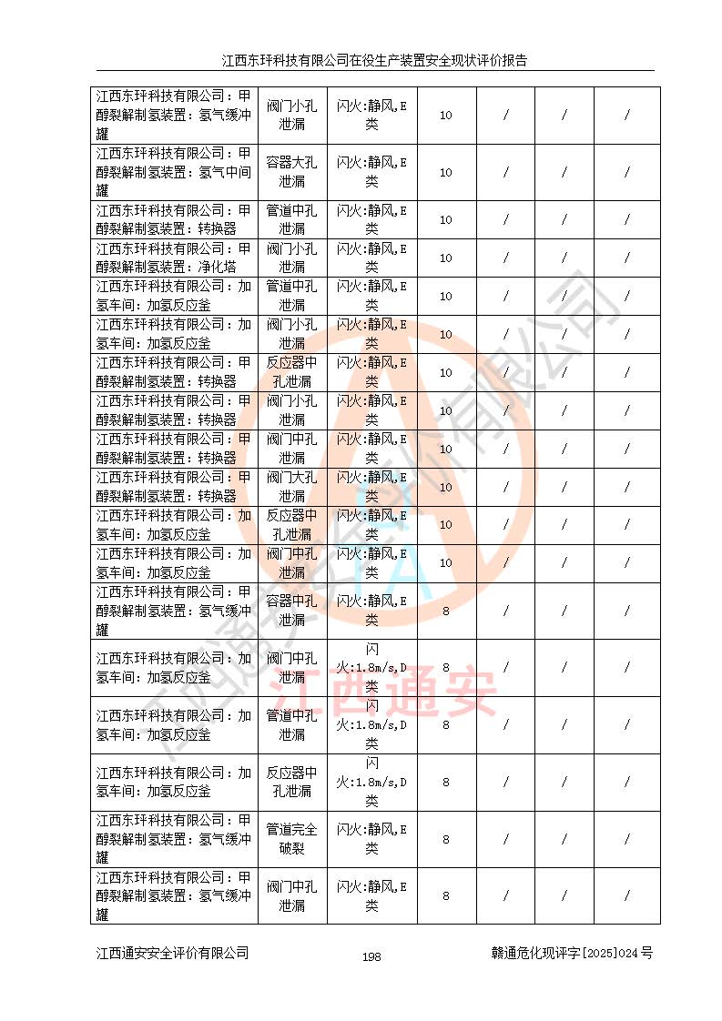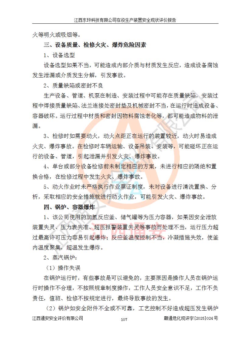 江西东玶科技有限公司位于江西省吉安市吉水县城西工业园区,法定**人为徐东,成立于2018年04月08日,注册资本叁仟贰佰叁拾万元整,经营范围为合成樟脑、α-蒎烯、β-蒎烯、二氢月桂烯(含月桂烯)、莰烯、双戊烯、氢气(中间产品)的制造加工(凭**批准证书经营);白乙酯、双萜烯等合成香料的制造加工等。 江西东玶科技有限公司2022年08月01日取得了《安全生产许可证》,许可证编号:(赣)WH安许证字[2022]1160号,许可范围为合成樟脑(2000t/a)、二氢月桂烯(1000t/a)、月桂烯(3200t/a)、莰烯(1000t/a)、双戊烯(810t/a)、双萜烯(1070t/a)、α-蒎烯(7500t/a)、β-蒎烯(3200t/a)、白乙酯(500t/a),**期为2022年08月01日至2025年07月31日。该公司2023年5月29日取得了三级安全生产标准化证书,证书编号:赣AQBWHⅢ202300036,**期至2026年5月。该公司现有员工53人,其中专职安全生产管理人员2人。 因生产经营需要,江西东玶科技有限公司实施了年产12000吨松节油深加工系列产品项目(二期),并将二氢月桂烯的设计生产规模2000t/a变更为1500t/a,减少中间产品蒎烷的消耗量,剩余的蒎烷(720t/a)作为产品销售。江西东玶科技有限公司委托深圳天阳工程设计有限公司进行了设计变更,按程序要求进行了试生产,委托评价公司编制了安全验收评价报告,并于2025年1月16日组织专家组和相关单位进行了验收。验收完成后,江西东玶科技有限公司2025年06月04日对《安全生产许可证》进行了变更,许可范围变更为合成樟脑(2000t/a)、二氢月桂烯(1500t/a)、月桂烯(3200t/a)、莰烯(1000t/a)、双戊烯(902.5t/a)、双萜烯(1200.7t/a)、α-蒎烯(7500t/a)、β-蒎烯(3200t/a)、白乙酯(500t/a)、蒎烷(中间产品,720t/a)。 江西东玶科技有限公司在役生产装置生产过程中涉及的主要原辅材料为松节油、乙酸、液碱、甲醇、碳酸钠、二甲苯、偏钛酸、甲酸、硫酸铜、雷尼镍、离子膜、天然气、氮气,中间产品为氢气、α-蒎烯、β-蒎烯、蒎烷,产品为合成樟脑、二氢月桂烯、月桂烯、莰烯、双戊烯、白乙酯、双萜烯,副产品为醋酸钠。根据《危险化学品目录》,该在役生产装置涉及的松节油、乙酸、液碱、甲醇、二甲苯、甲酸、雷尼镍、天然气(燃料)、氮气(压缩的)、柴油,中间产品α-蒎烯、β-蒎烯、氢气、蒎烷和产品中合成樟脑、二氢月桂烯、月桂烯、莰烯、双戊烯属于危险化学品。经辨识,甲醇、氢气和天然气(燃料)属于重点监管的危险化学品,甲醇属于特别管控的危险化学品,不涉及监控化学品、易制毒化学品、易制爆危险化学品、剧毒化学品和高毒物品,生产、储存单元不构成危险化学品重大危险源,涉及的加氢工艺属于重点监管的危险化工工艺。根据生产工艺特点及物料的理化特性可知,该在役生产装置生产过程中存在火灾与爆炸、中毒与窒息、触电、机械伤害、灼烫等危险有害因素。 该公司自2022年08月01日取得安全生产许可证以来,生产运行正常,未发生一般及以上生产安全事故。 |