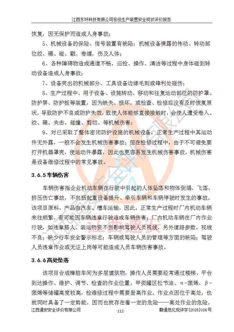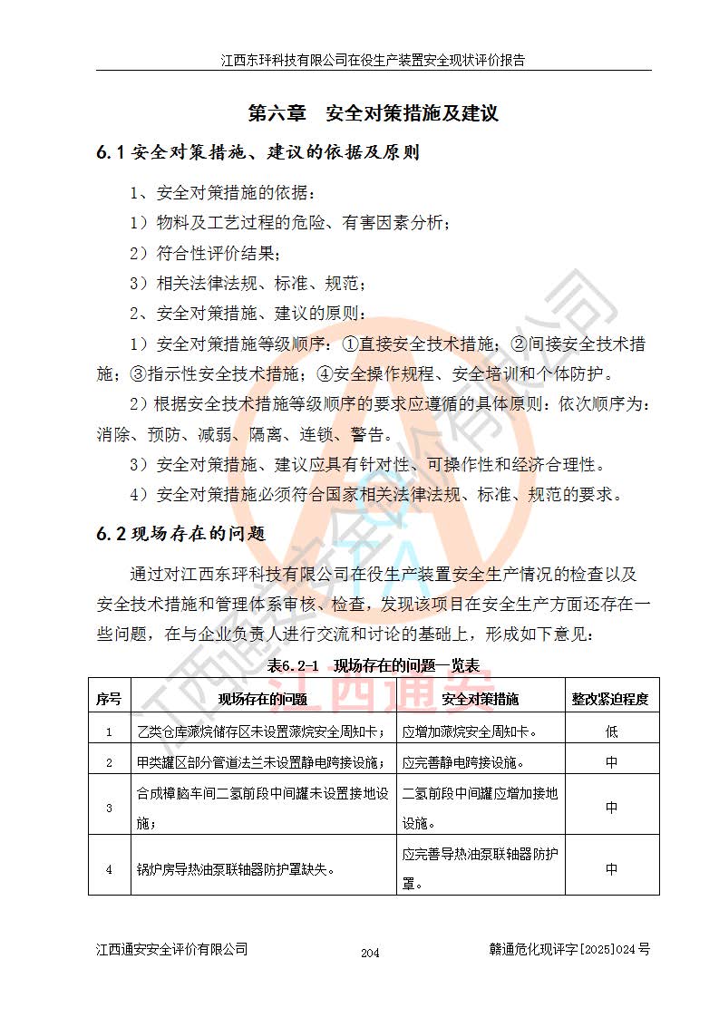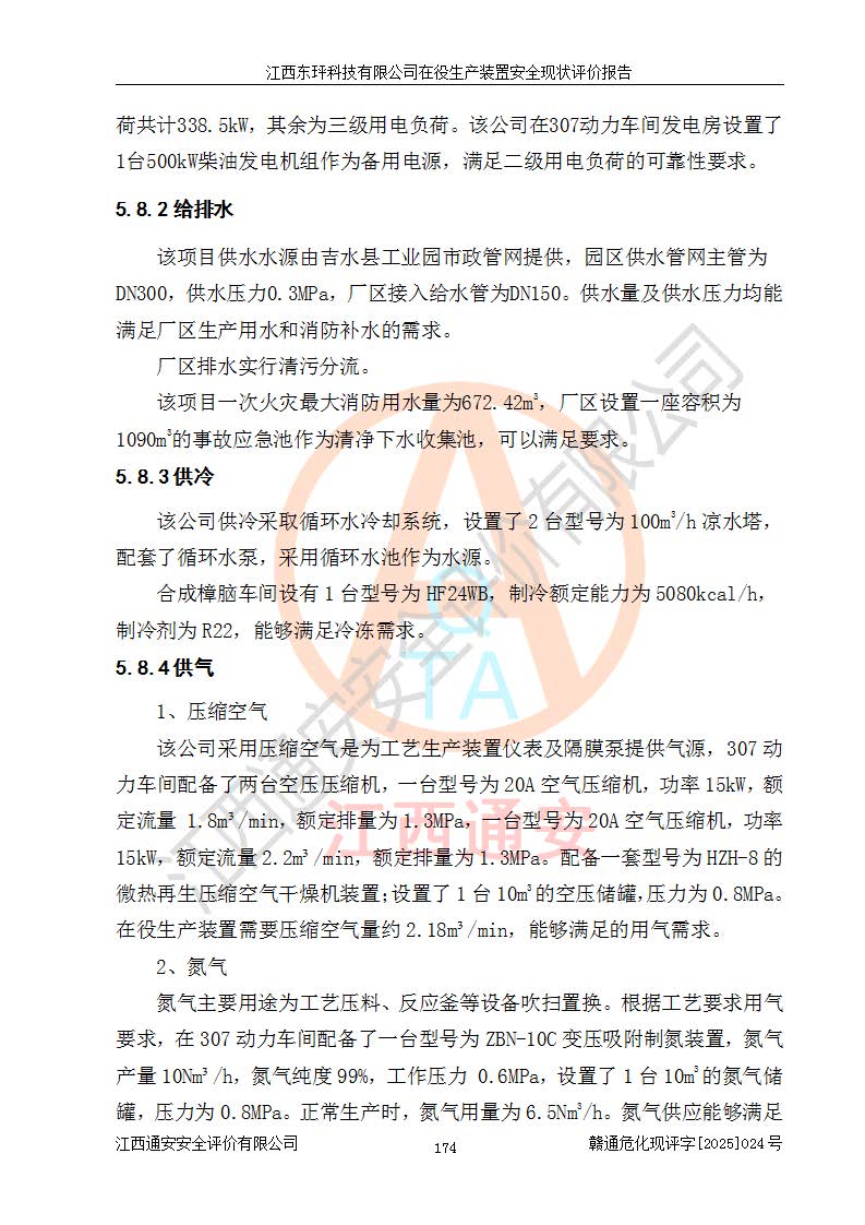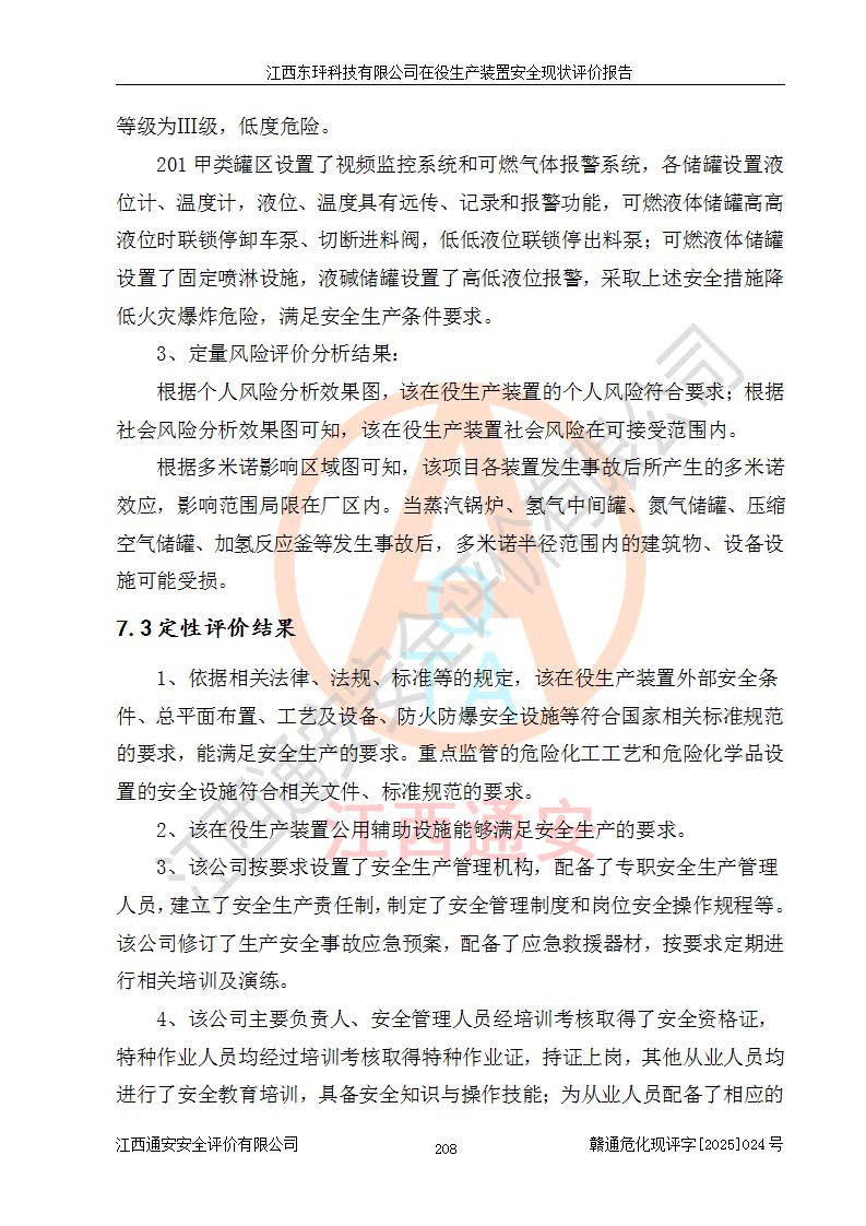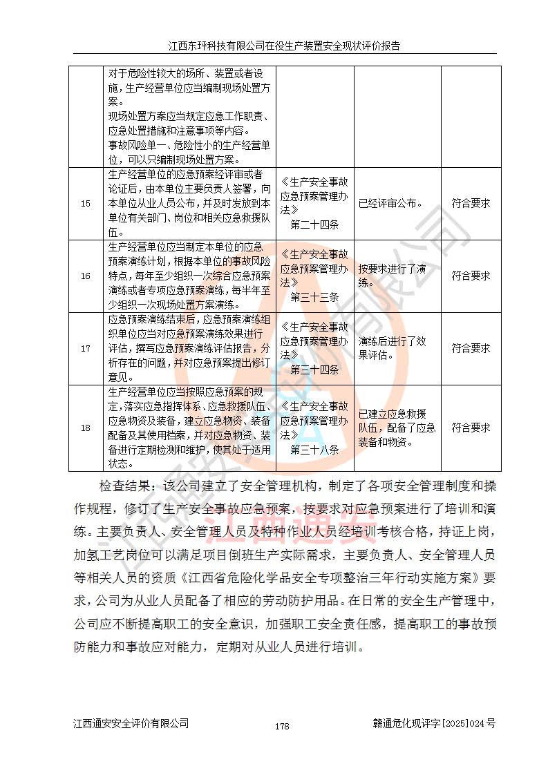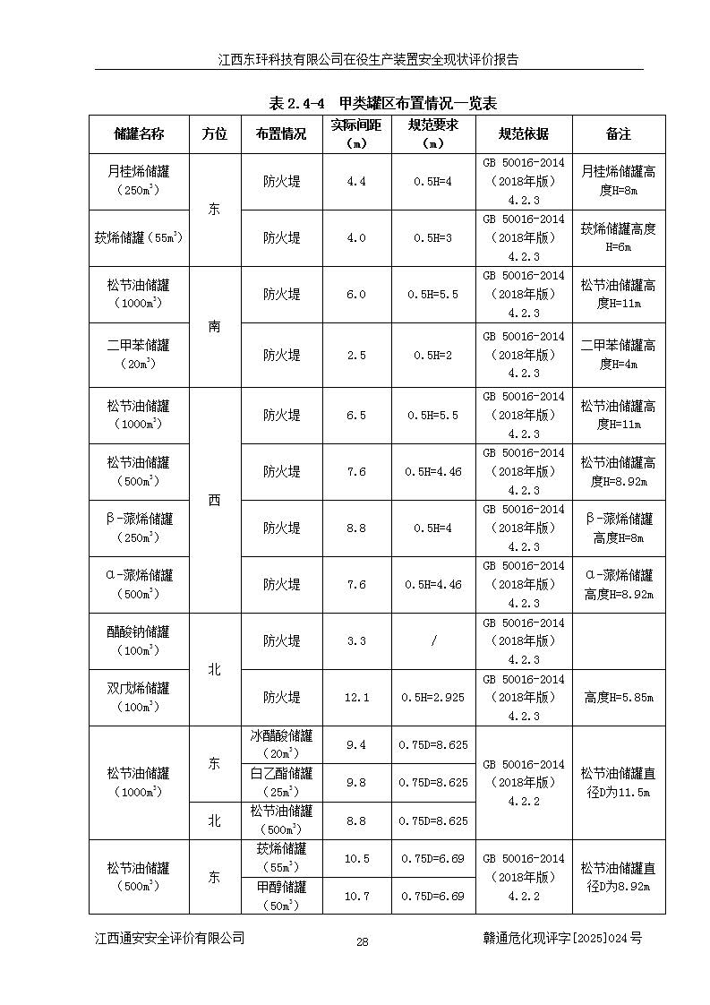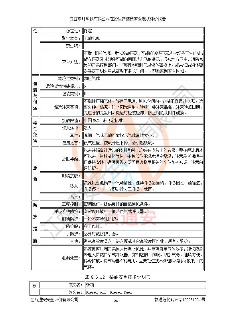 江西东玶科技有限公司位于江西省吉安市吉水县城西工业园区,法定**人为徐东,成立于2018年04月08日,注册资本叁仟贰佰叁拾万元整,经营范围为合成樟脑、α-蒎烯、β-蒎烯、二氢月桂烯(含月桂烯)、莰烯、双戊烯、氢气(中间产品)的制造加工(凭**批准证书经营);白乙酯、双萜烯等合成香料的制造加工等。 江西东玶科技有限公司2022年08月01日取得了《安全生产许可证》,许可证编号:(赣)WH安许证字[2022]1160号,许可范围为合成樟脑(2000t/a)、二氢月桂烯(1000t/a)、月桂烯(3200t/a)、莰烯(1000t/a)、双戊烯(810t/a)、双萜烯(1070t/a)、α-蒎烯(7500t/a)、β-蒎烯(3200t/a)、白乙酯(500t/a),**期为2022年08月01日至2025年07月31日。该公司2023年5月29日取得了三级安全生产标准化证书,证书编号:赣AQBWHⅢ202300036,**期至2026年5月。该公司现有员工53人,其中专职安全生产管理人员2人。 因生产经营需要,江西东玶科技有限公司实施了年产12000吨松节油深加工系列产品项目(二期),并将二氢月桂烯的设计生产规模2000t/a变更为1500t/a,减少中间产品蒎烷的消耗量,剩余的蒎烷(720t/a)作为产品销售。江西东玶科技有限公司委托深圳天阳工程设计有限公司进行了设计变更,按程序要求进行了试生产,委托评价公司编制了安全验收评价报告,并于2025年1月16日组织专家组和相关单位进行了验收。验收完成后,江西东玶科技有限公司2025年06月04日对《安全生产许可证》进行了变更,许可范围变更为合成樟脑(2000t/a)、二氢月桂烯(1500t/a)、月桂烯(3200t/a)、莰烯(1000t/a)、双戊烯(902.5t/a)、双萜烯(1200.7t/a)、α-蒎烯(7500t/a)、β-蒎烯(3200t/a)、白乙酯(500t/a)、蒎烷(中间产品,720t/a)。 江西东玶科技有限公司在役生产装置生产过程中涉及的主要原辅材料为松节油、乙酸、液碱、甲醇、碳酸钠、二甲苯、偏钛酸、甲酸、硫酸铜、雷尼镍、离子膜、天然气、氮气,中间产品为氢气、α-蒎烯、β-蒎烯、蒎烷,产品为合成樟脑、二氢月桂烯、月桂烯、莰烯、双戊烯、白乙酯、双萜烯,副产品为醋酸钠。根据《危险化学品目录》,该在役生产装置涉及的松节油、乙酸、液碱、甲醇、二甲苯、甲酸、雷尼镍、天然气(燃料)、氮气(压缩的)、柴油,中间产品α-蒎烯、β-蒎烯、氢气、蒎烷和产品中合成樟脑、二氢月桂烯、月桂烯、莰烯、双戊烯属于危险化学品。经辨识,甲醇、氢气和天然气(燃料)属于重点监管的危险化学品,甲醇属于特别管控的危险化学品,不涉及监控化学品、易制毒化学品、易制爆危险化学品、剧毒化学品和高毒物品,生产、储存单元不构成危险化学品重大危险源,涉及的加氢工艺属于重点监管的危险化工工艺。根据生产工艺特点及物料的理化特性可知,该在役生产装置生产过程中存在火灾与爆炸、中毒与窒息、触电、机械伤害、灼烫等危险有害因素。 该公司自2022年08月01日取得安全生产许可证以来,生产运行正常,未发生一般及以上生产安全事故。 |