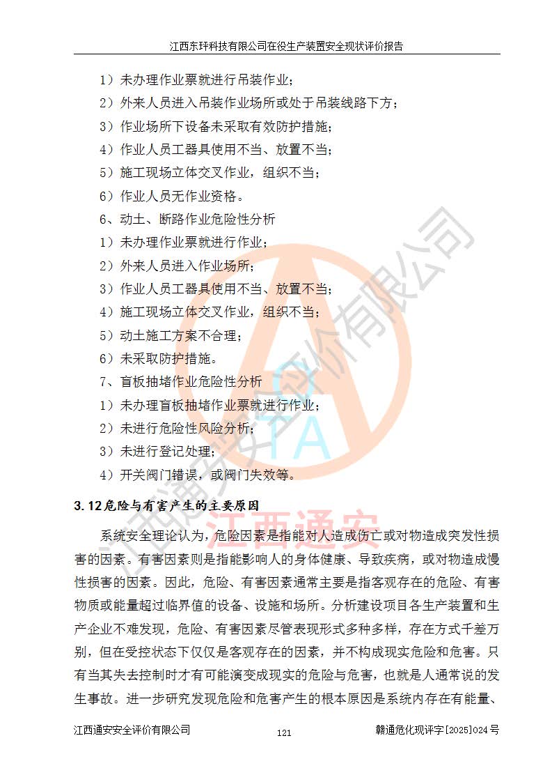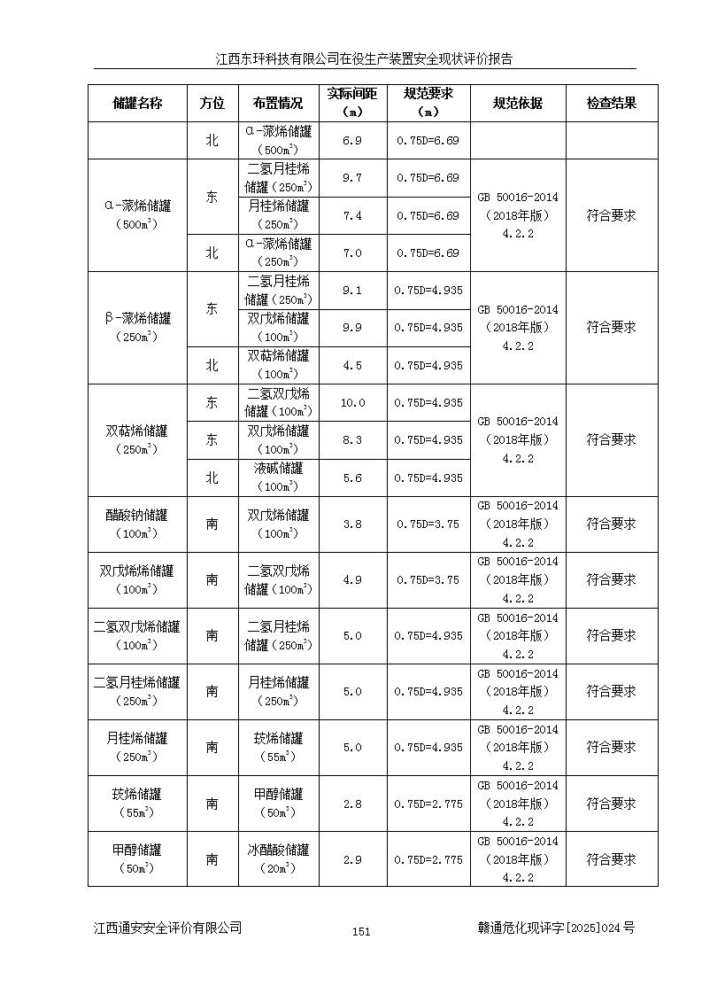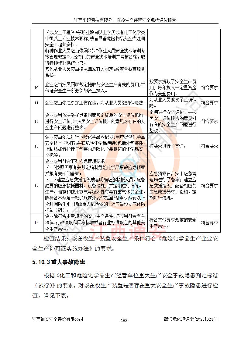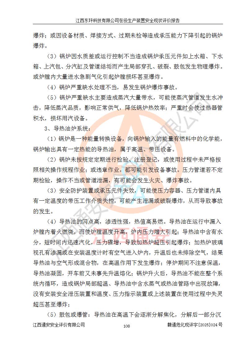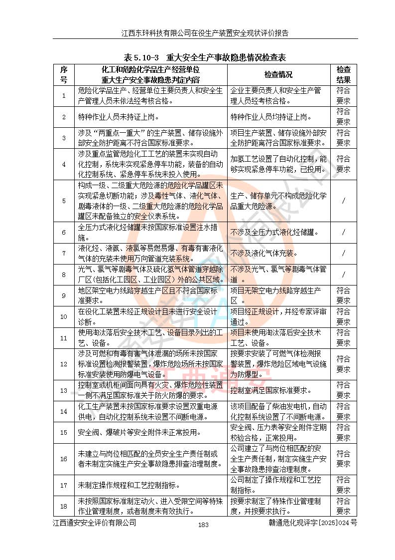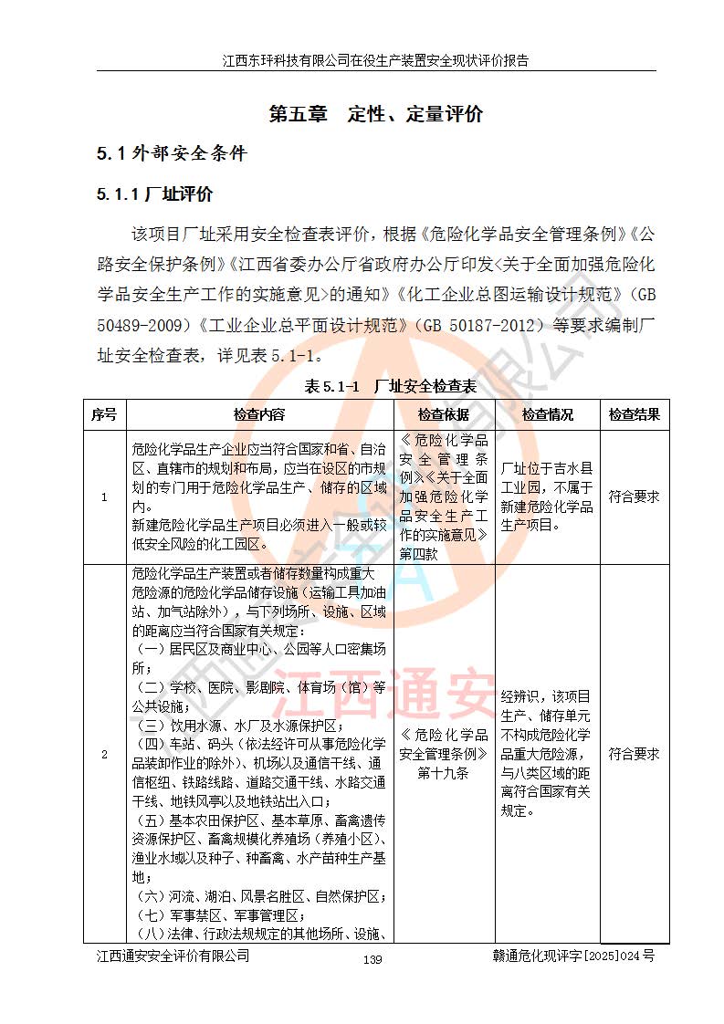 江西东玶科技有限公司位于江西省吉安市吉水县城西工业园区,法定**人为徐东,成立于2018年04月08日,注册资本叁仟贰佰叁拾万元整,经营范围为合成樟脑、α-蒎烯、β-蒎烯、二氢月桂烯(含月桂烯)、莰烯、双戊烯、氢气(中间产品)的制造加工(凭**批准证书经营);白乙酯、双萜烯等合成香料的制造加工等。 江西东玶科技有限公司2022年08月01日取得了《安全生产许可证》,许可证编号:(赣)WH安许证字[2022]1160号,许可范围为合成樟脑(2000t/a)、二氢月桂烯(1000t/a)、月桂烯(3200t/a)、莰烯(1000t/a)、双戊烯(810t/a)、双萜烯(1070t/a)、α-蒎烯(7500t/a)、β-蒎烯(3200t/a)、白乙酯(500t/a),**期为2022年08月01日至2025年07月31日。该公司2023年5月29日取得了三级安全生产标准化证书,证书编号:赣AQBWHⅢ202300036,**期至2026年5月。该公司现有员工53人,其中专职安全生产管理人员2人。 因生产经营需要,江西东玶科技有限公司实施了年产12000吨松节油深加工系列产品项目(二期),并将二氢月桂烯的设计生产规模2000t/a变更为1500t/a,减少中间产品蒎烷的消耗量,剩余的蒎烷(720t/a)作为产品销售。江西东玶科技有限公司委托深圳天阳工程设计有限公司进行了设计变更,按程序要求进行了试生产,委托评价公司编制了安全验收评价报告,并于2025年1月16日组织专家组和相关单位进行了验收。验收完成后,江西东玶科技有限公司2025年06月04日对《安全生产许可证》进行了变更,许可范围变更为合成樟脑(2000t/a)、二氢月桂烯(1500t/a)、月桂烯(3200t/a)、莰烯(1000t/a)、双戊烯(902.5t/a)、双萜烯(1200.7t/a)、α-蒎烯(7500t/a)、β-蒎烯(3200t/a)、白乙酯(500t/a)、蒎烷(中间产品,720t/a)。 江西东玶科技有限公司在役生产装置生产过程中涉及的主要原辅材料为松节油、乙酸、液碱、甲醇、碳酸钠、二甲苯、偏钛酸、甲酸、硫酸铜、雷尼镍、离子膜、天然气、氮气,中间产品为氢气、α-蒎烯、β-蒎烯、蒎烷,产品为合成樟脑、二氢月桂烯、月桂烯、莰烯、双戊烯、白乙酯、双萜烯,副产品为醋酸钠。根据《危险化学品目录》,该在役生产装置涉及的松节油、乙酸、液碱、甲醇、二甲苯、甲酸、雷尼镍、天然气(燃料)、氮气(压缩的)、柴油,中间产品α-蒎烯、β-蒎烯、氢气、蒎烷和产品中合成樟脑、二氢月桂烯、月桂烯、莰烯、双戊烯属于危险化学品。经辨识,甲醇、氢气和天然气(燃料)属于重点监管的危险化学品,甲醇属于特别管控的危险化学品,不涉及监控化学品、易制毒化学品、易制爆危险化学品、剧毒化学品和高毒物品,生产、储存单元不构成危险化学品重大危险源,涉及的加氢工艺属于重点监管的危险化工工艺。根据生产工艺特点及物料的理化特性可知,该在役生产装置生产过程中存在火灾与爆炸、中毒与窒息、触电、机械伤害、灼烫等危险有害因素。 该公司自2022年08月01日取得安全生产许可证以来,生产运行正常,未发生一般及以上生产安全事故。 |