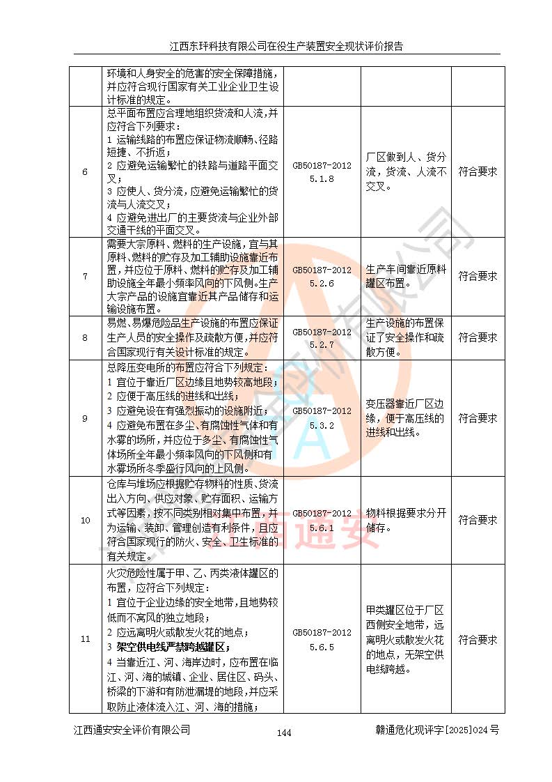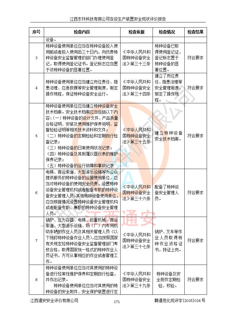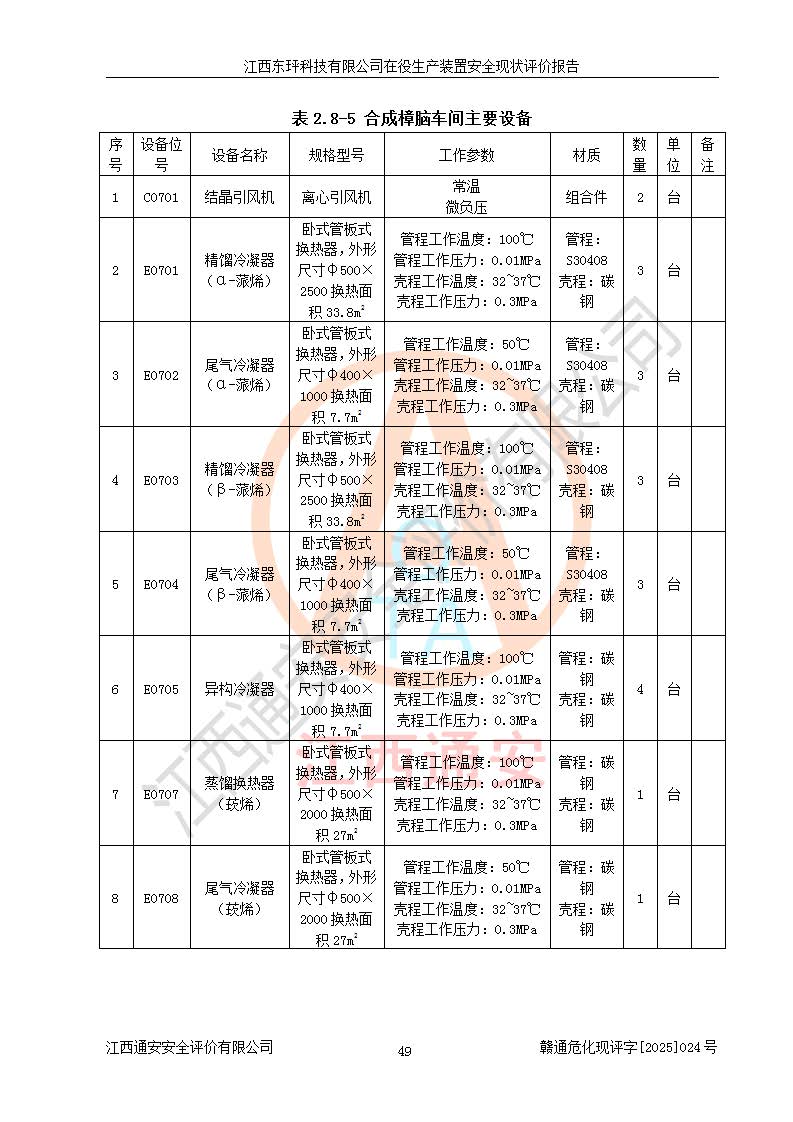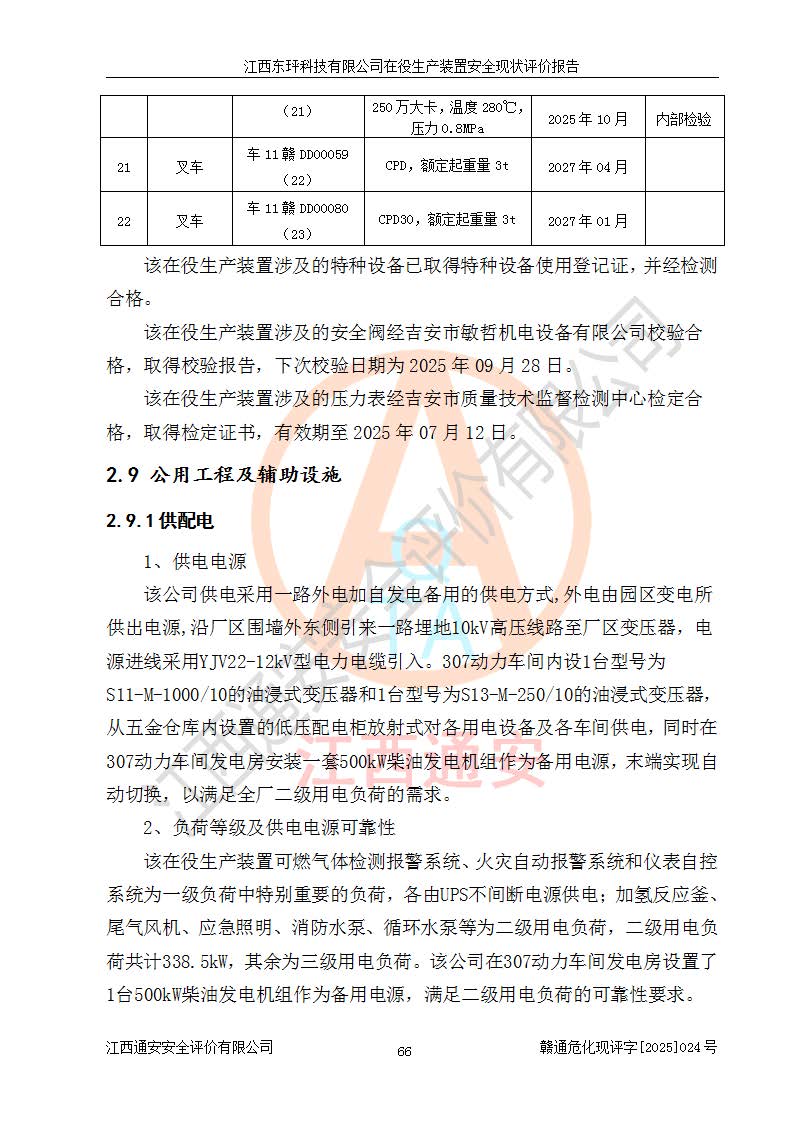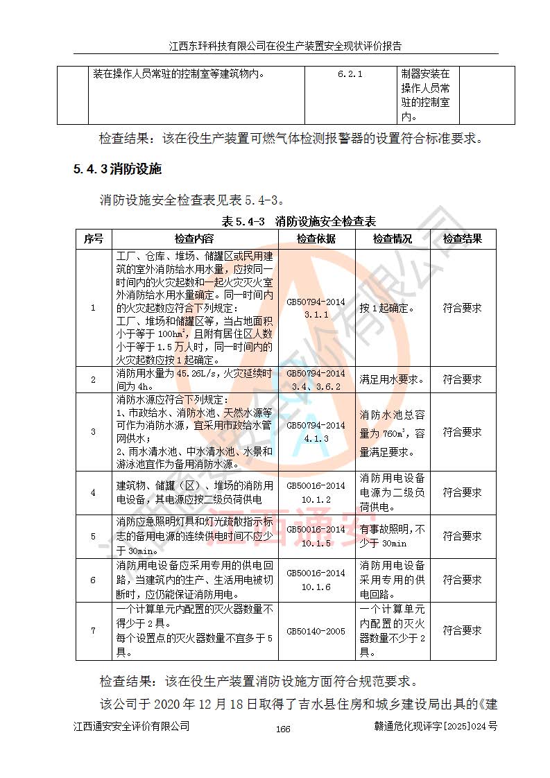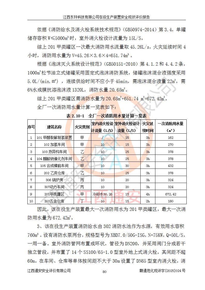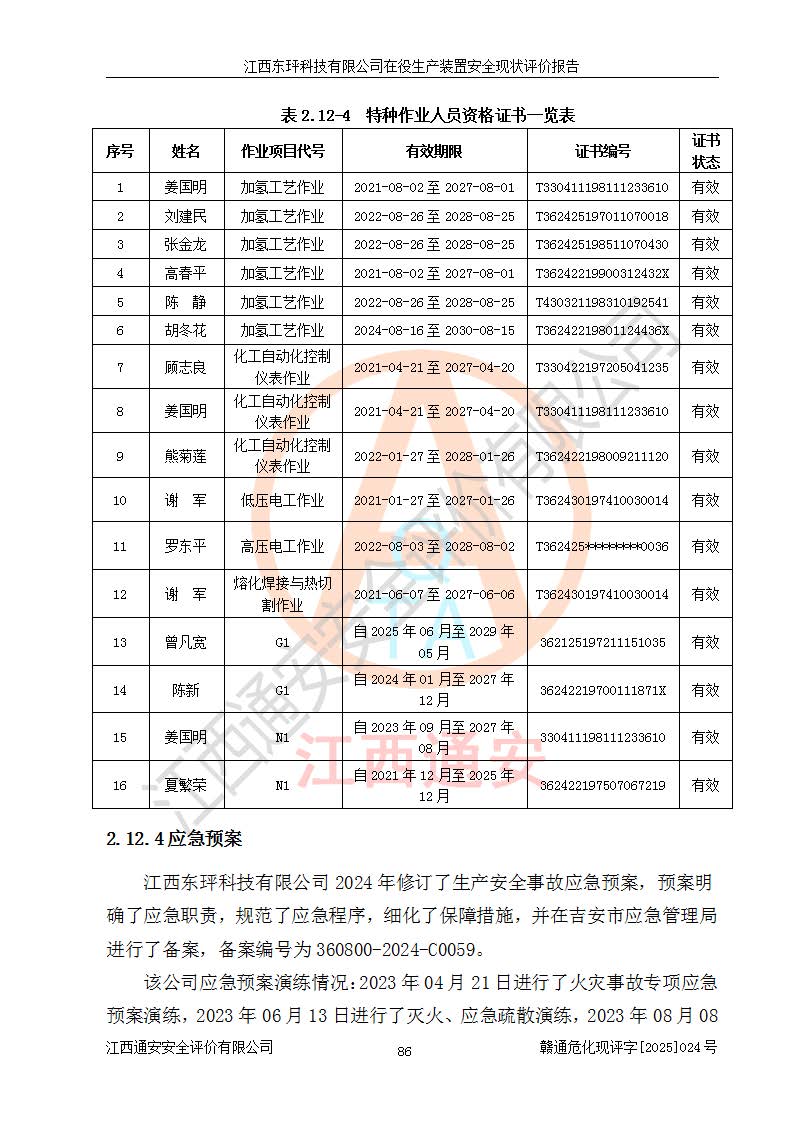 江西东玶科技有限公司位于江西省吉安市吉水县城西工业园区,法定**人为徐东,成立于2018年04月08日,注册资本叁仟贰佰叁拾万元整,经营范围为合成樟脑、α-蒎烯、β-蒎烯、二氢月桂烯(含月桂烯)、莰烯、双戊烯、氢气(中间产品)的制造加工(凭**批准证书经营);白乙酯、双萜烯等合成香料的制造加工等。 江西东玶科技有限公司2022年08月01日取得了《安全生产许可证》,许可证编号:(赣)WH安许证字[2022]1160号,许可范围为合成樟脑(2000t/a)、二氢月桂烯(1000t/a)、月桂烯(3200t/a)、莰烯(1000t/a)、双戊烯(810t/a)、双萜烯(1070t/a)、α-蒎烯(7500t/a)、β-蒎烯(3200t/a)、白乙酯(500t/a),**期为2022年08月01日至2025年07月31日。该公司2023年5月29日取得了三级安全生产标准化证书,证书编号:赣AQBWHⅢ202300036,**期至2026年5月。该公司现有员工53人,其中专职安全生产管理人员2人。 因生产经营需要,江西东玶科技有限公司实施了年产12000吨松节油深加工系列产品项目(二期),并将二氢月桂烯的设计生产规模2000t/a变更为1500t/a,减少中间产品蒎烷的消耗量,剩余的蒎烷(720t/a)作为产品销售。江西东玶科技有限公司委托深圳天阳工程设计有限公司进行了设计变更,按程序要求进行了试生产,委托评价公司编制了安全验收评价报告,并于2025年1月16日组织专家组和相关单位进行了验收。验收完成后,江西东玶科技有限公司2025年06月04日对《安全生产许可证》进行了变更,许可范围变更为合成樟脑(2000t/a)、二氢月桂烯(1500t/a)、月桂烯(3200t/a)、莰烯(1000t/a)、双戊烯(902.5t/a)、双萜烯(1200.7t/a)、α-蒎烯(7500t/a)、β-蒎烯(3200t/a)、白乙酯(500t/a)、蒎烷(中间产品,720t/a)。 江西东玶科技有限公司在役生产装置生产过程中涉及的主要原辅材料为松节油、乙酸、液碱、甲醇、碳酸钠、二甲苯、偏钛酸、甲酸、硫酸铜、雷尼镍、离子膜、天然气、氮气,中间产品为氢气、α-蒎烯、β-蒎烯、蒎烷,产品为合成樟脑、二氢月桂烯、月桂烯、莰烯、双戊烯、白乙酯、双萜烯,副产品为醋酸钠。根据《危险化学品目录》,该在役生产装置涉及的松节油、乙酸、液碱、甲醇、二甲苯、甲酸、雷尼镍、天然气(燃料)、氮气(压缩的)、柴油,中间产品α-蒎烯、β-蒎烯、氢气、蒎烷和产品中合成樟脑、二氢月桂烯、月桂烯、莰烯、双戊烯属于危险化学品。经辨识,甲醇、氢气和天然气(燃料)属于重点监管的危险化学品,甲醇属于特别管控的危险化学品,不涉及监控化学品、易制毒化学品、易制爆危险化学品、剧毒化学品和高毒物品,生产、储存单元不构成危险化学品重大危险源,涉及的加氢工艺属于重点监管的危险化工工艺。根据生产工艺特点及物料的理化特性可知,该在役生产装置生产过程中存在火灾与爆炸、中毒与窒息、触电、机械伤害、灼烫等危险有害因素。 该公司自2022年08月01日取得安全生产许可证以来,生产运行正常,未发生一般及以上生产安全事故。 |