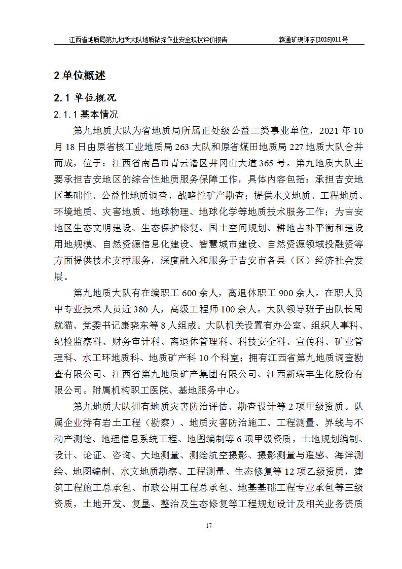 项目简介 | 江西省地质局第九地质大队(以下简称“第九地质大队”)为省地质局所属正处级公益二类事业单位,2021年10月18日由原省核工业地质局263大队和原省煤田地质局227地质大队合并而成,位于:江西省南昌市青云谱区井冈山大道365号。第九地质大队主要承担吉安地区的综合性地质服务保障工作,具体内容包括:承担吉安地区基础性、公益性地质调查,战略性矿产勘查;提供水文地质、工程地质、环境地质、灾害地质、地球物理、地球化学等地质技术服务工作;为吉安地区生态文明建设、生态保护修复、国土空间规划、耕地占补平衡和建设用地规模、自然资源信息化建设、智慧城市建设、自然资源领域投融资等方面提供技术支撑服务,深度融入和服务于吉安市各县(区)经济社会发展。 第九地质大队有在编职工600余人,离退休职工900余人。在职人员中专业技术人员近380人,高级工程师100余人。大队**班子由队长周就猫、党委书记康晓东等8人组成。大队机关设置有办公室、组织人事科、纪检监察科、财务审计科、离退休管理科、科技安全科、宣传科、矿业管理科、水工环地质科、地质矿产科10个科室;拥有江西省第九地质调查勘查有限公司、江西省第九地质矿产集团有限公司、江西新瑞丰生化股份有限公司。附属机构职工医院、基地服务中心。 第九地质大队拥有地质灾害防治评估、勘查设计等2项**资质。队属企业持有岩土工程(勘察)、地质灾害防治施工、工程测量、界线与不动产测绘、地理信息系统工程、地图编制等6项**资质,土地规划编制、设计、论证、咨询、大地测量、测绘航空摄影、摄影测量与遥感、海洋测绘、地图编制、水文地质勘察、工程测量、生态修复等12项乙级资质,建筑工程施工总承包、市政公用工程总承包、地基基础工程专业承包等三级资质,土地开发、复垦、整治及生态修复等工程规划设计及相关业务资质证书、不动产登记代理人注册证书。 该大队上一轮安全生产许可证**期为2022年8月26日至2025年8月25日,许可范围:地质钻探作业。该单位由于安全生产许可证**期将于2025年8月到期,特此重新申请安全生产许可证。按照《安全生产法》《矿山安全法》和《关于做好非煤矿山企业安全生产许可证延期换证工作的通知》等有关规定,该单位在申请安全生产许可证前应进行安全现状评价。 | |||||
