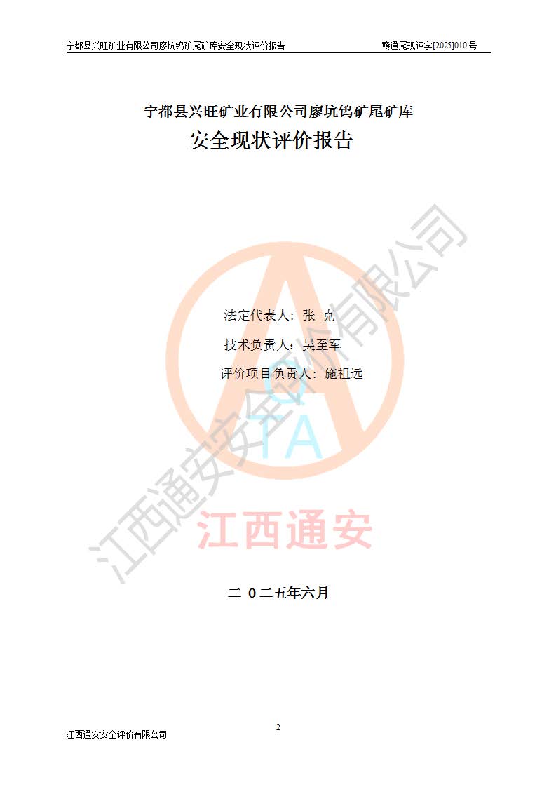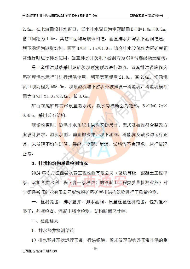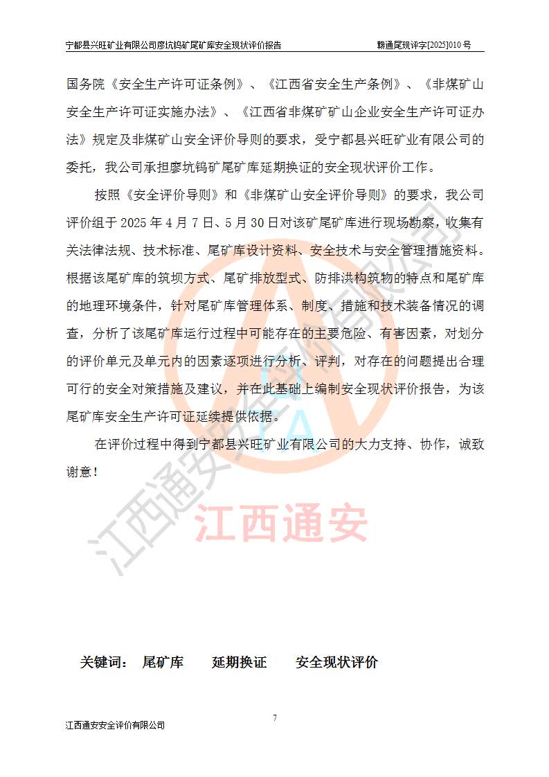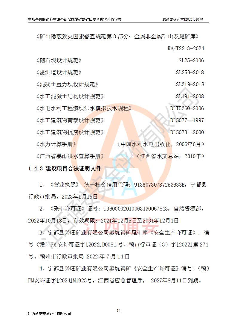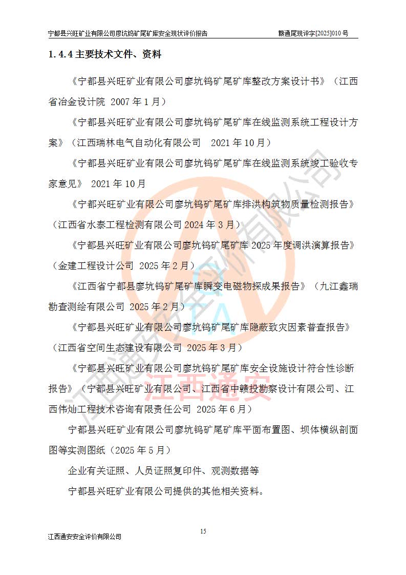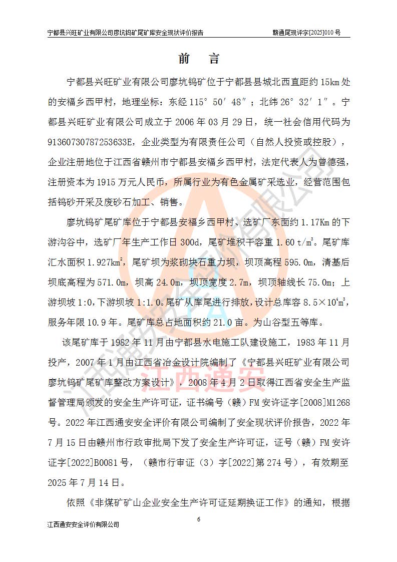 宁都县兴旺矿业有限公司廖坑钨矿位于宁都县县城北西直距约15km处的安福乡西甲村,地理坐标:东经115°50′48″;北纬26°32′1″。宁都县兴旺矿业有限公司成立于2006年03月29日,统一社会信用代码为91360730787253633E,企业类型为有限责任公司(自然人投资或控股),企业注册地位于江西省赣州市宁都县安福乡西甲村,法定**人为曾德强,注册资本为1915万元人民币,所属行业为有色金属矿采选业,经营范围包括钨砂开采及废砂石加工、销售。 廖坑钨矿尾矿库位于宁都县安福乡西甲村、选矿厂东面约1.17Km的下游沟谷中,选矿厂年生产工作日300d,尾矿堆积干容重1.60 t/m3。尾矿库汇水面积1.927km2,尾矿坝为浆砌块石重力坝,坝顶高程595.0m,清基后坝底高程为571.0m,坝高24.0m,坝顶宽度2.7m,坝顶轴线长75.0m;上游坝坡1:0,下游坝坡1:1.0。尾矿从库尾进行排放,设计总库容8.5×104m3,服务年限10.9年。尾矿库总占地面积约21.0亩。为山谷型五等库。 该尾矿库于1982年11月由宁都县水电施工队建设施工,1983年11月投产,2007年1月由江西省冶金设计院编制了《宁都县兴旺矿业有限公司廖坑钨矿尾矿库整改方案设计》,2008年4月2日取得江西省安全生产监督管理局颁发的安全生产许可证,证书编号(赣)FM安许证字[2008]M1268号。2022年江西通安安全评价有限公司编制了安全现状评价报告,2022年7月15日由赣州市行政审批局下发了安全生产许可证,证号(赣)FM安许证字[2022]B0081号,(赣市行审证(3)字[2022]第274号),**期至2025年7月14日。 依照《非煤矿矿山企业安全生产许可证延期换证工作》的通知,根据***《安全生产许可证条例》、《江西省安全生产条例》、《非煤矿山安全生产许可证实施办法》、《江西省非煤矿矿山企业安全生产许可证办法》规定及非煤矿山安全评价导则的要求,受宁都县兴旺矿业有限公司的委托,我公司承担廖坑钨矿尾矿库延期换证的安全现状评价工作。 |