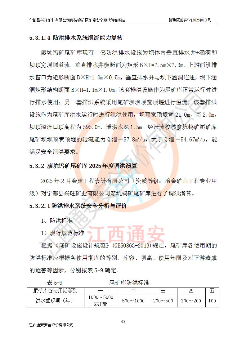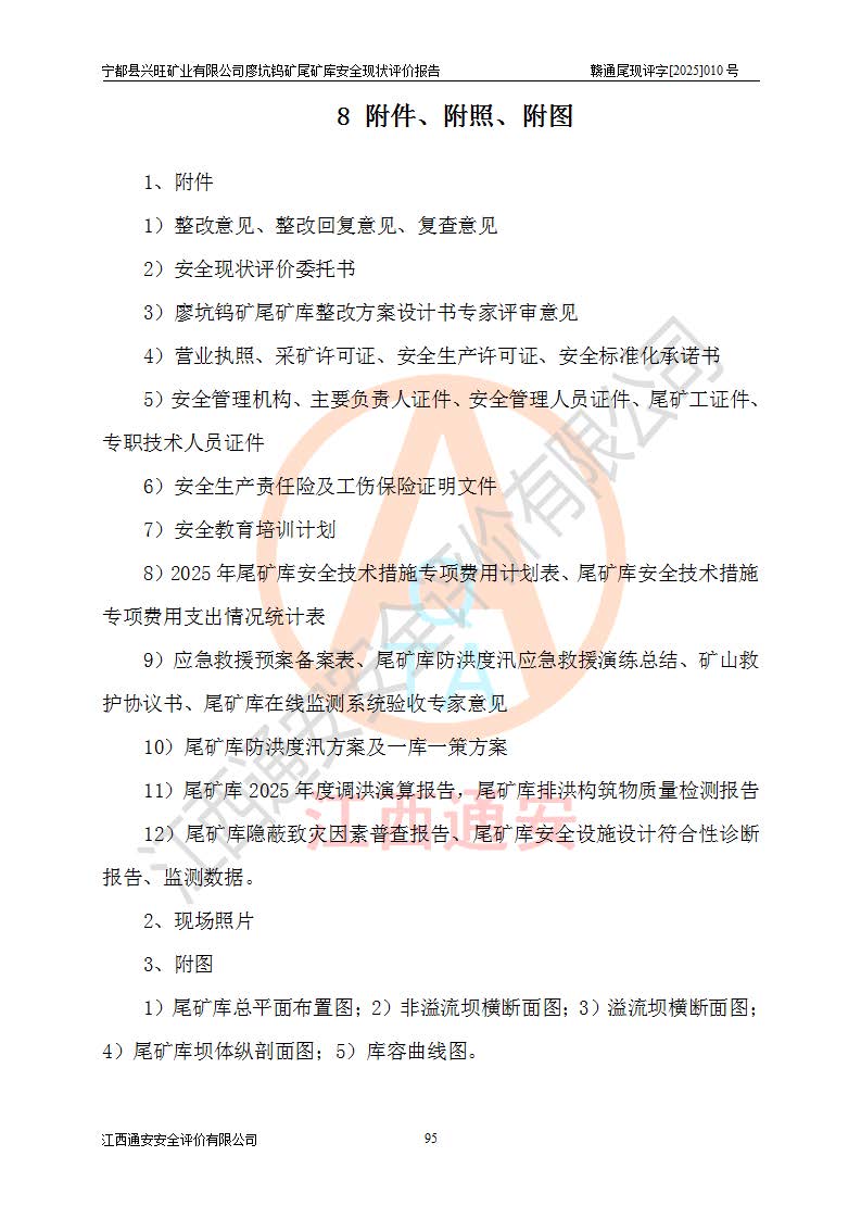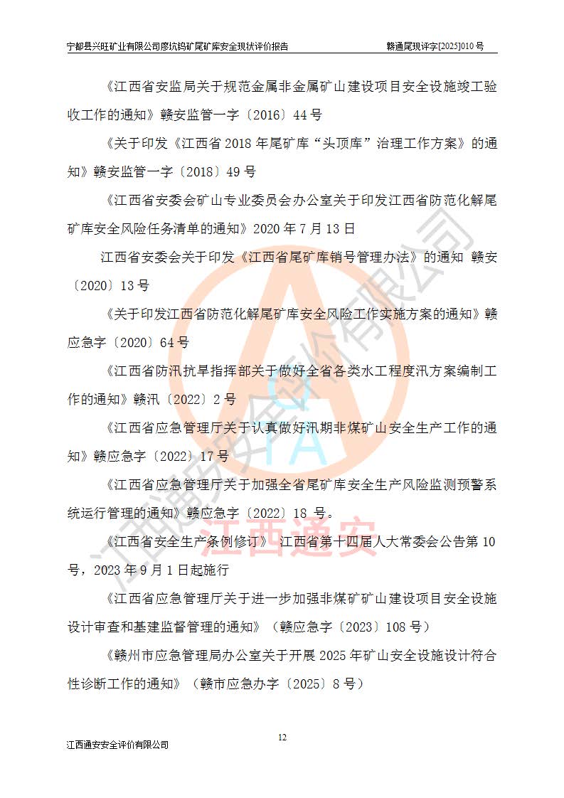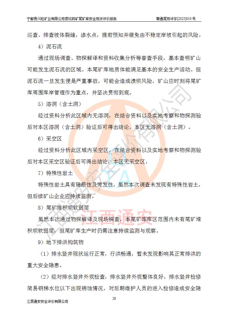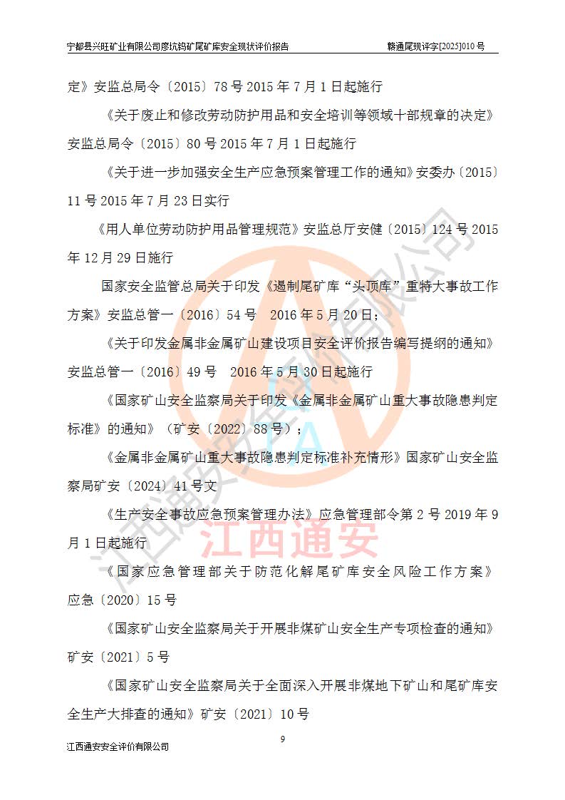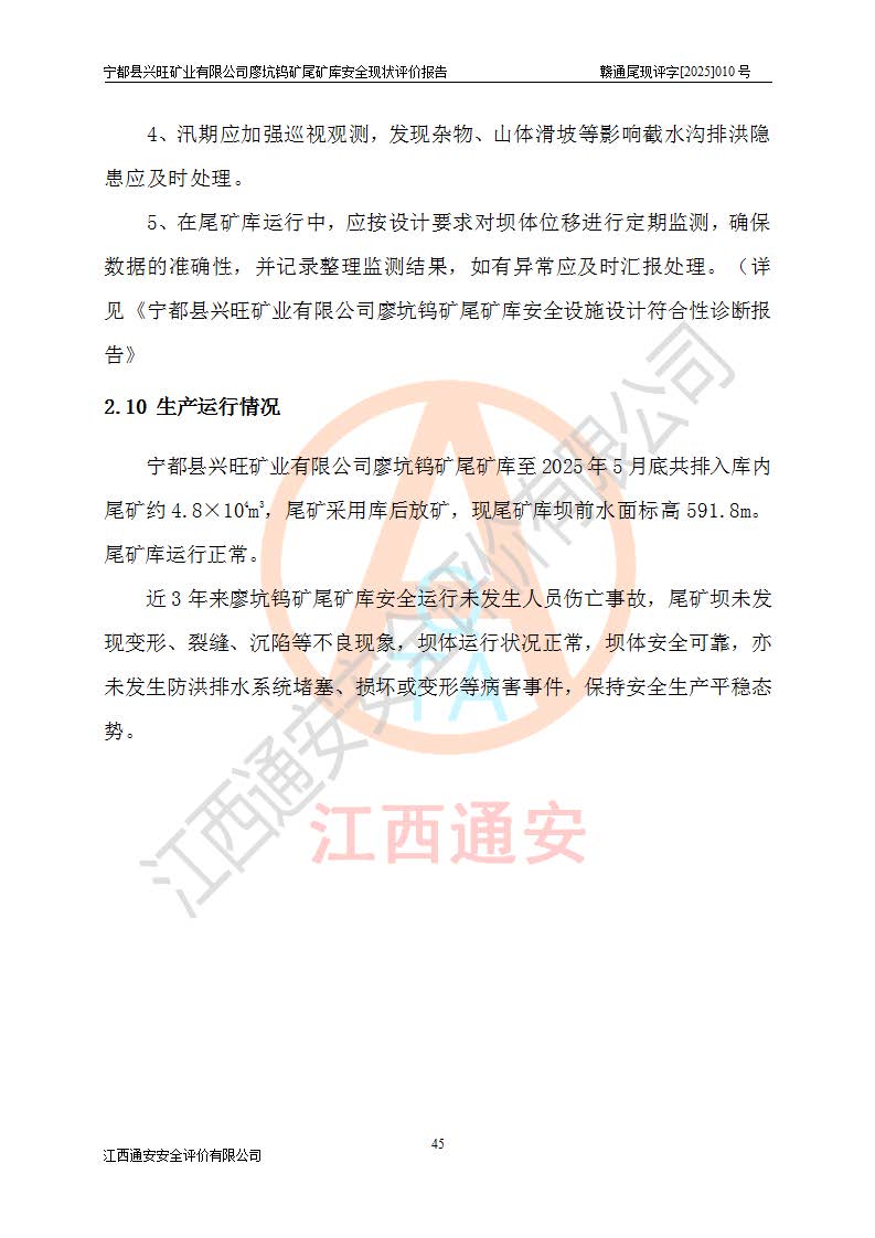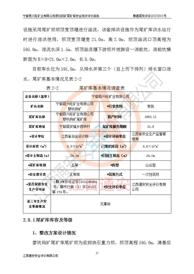 宁都县兴旺矿业有限公司廖坑钨矿位于宁都县县城北西直距约15km处的安福乡西甲村,地理坐标:东经115°50′48″;北纬26°32′1″。宁都县兴旺矿业有限公司成立于2006年03月29日,统一社会信用代码为91360730787253633E,企业类型为有限责任公司(自然人投资或控股),企业注册地位于江西省赣州市宁都县安福乡西甲村,法定**人为曾德强,注册资本为1915万元人民币,所属行业为有色金属矿采选业,经营范围包括钨砂开采及废砂石加工、销售。 廖坑钨矿尾矿库位于宁都县安福乡西甲村、选矿厂东面约1.17Km的下游沟谷中,选矿厂年生产工作日300d,尾矿堆积干容重1.60 t/m3。尾矿库汇水面积1.927km2,尾矿坝为浆砌块石重力坝,坝顶高程595.0m,清基后坝底高程为571.0m,坝高24.0m,坝顶宽度2.7m,坝顶轴线长75.0m;上游坝坡1:0,下游坝坡1:1.0。尾矿从库尾进行排放,设计总库容8.5×104m3,服务年限10.9年。尾矿库总占地面积约21.0亩。为山谷型五等库。 该尾矿库于1982年11月由宁都县水电施工队建设施工,1983年11月投产,2007年1月由江西省冶金设计院编制了《宁都县兴旺矿业有限公司廖坑钨矿尾矿库整改方案设计》,2008年4月2日取得江西省安全生产监督管理局颁发的安全生产许可证,证书编号(赣)FM安许证字[2008]M1268号。2022年江西通安安全评价有限公司编制了安全现状评价报告,2022年7月15日由赣州市行政审批局下发了安全生产许可证,证号(赣)FM安许证字[2022]B0081号,(赣市行审证(3)字[2022]第274号),**期至2025年7月14日。 依照《非煤矿矿山企业安全生产许可证延期换证工作》的通知,根据***《安全生产许可证条例》、《江西省安全生产条例》、《非煤矿山安全生产许可证实施办法》、《江西省非煤矿矿山企业安全生产许可证办法》规定及非煤矿山安全评价导则的要求,受宁都县兴旺矿业有限公司的委托,我公司承担廖坑钨矿尾矿库延期换证的安全现状评价工作。 |