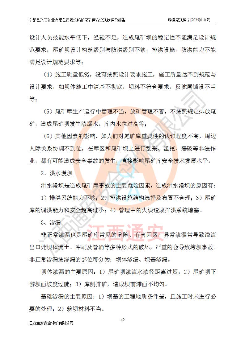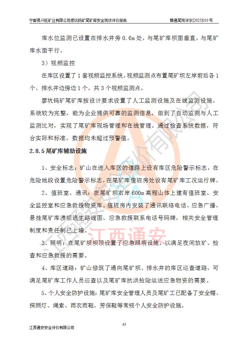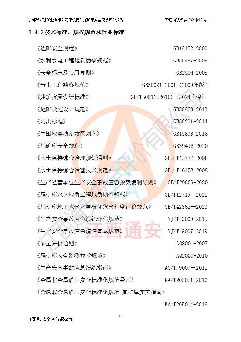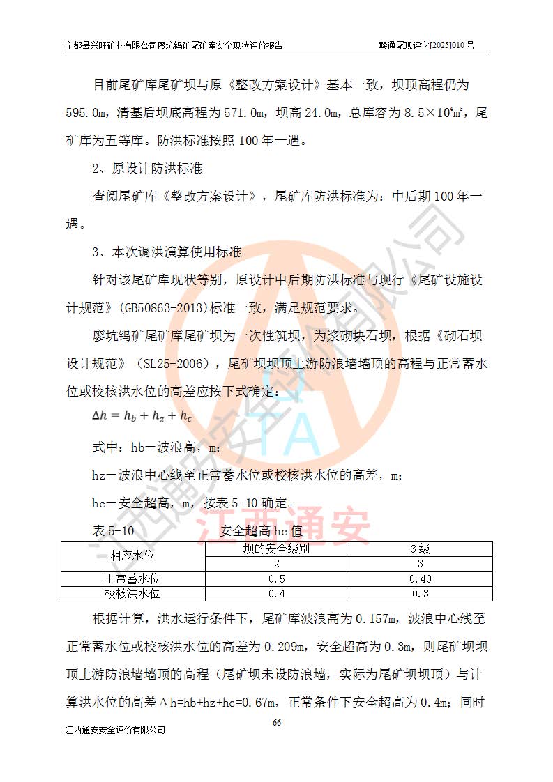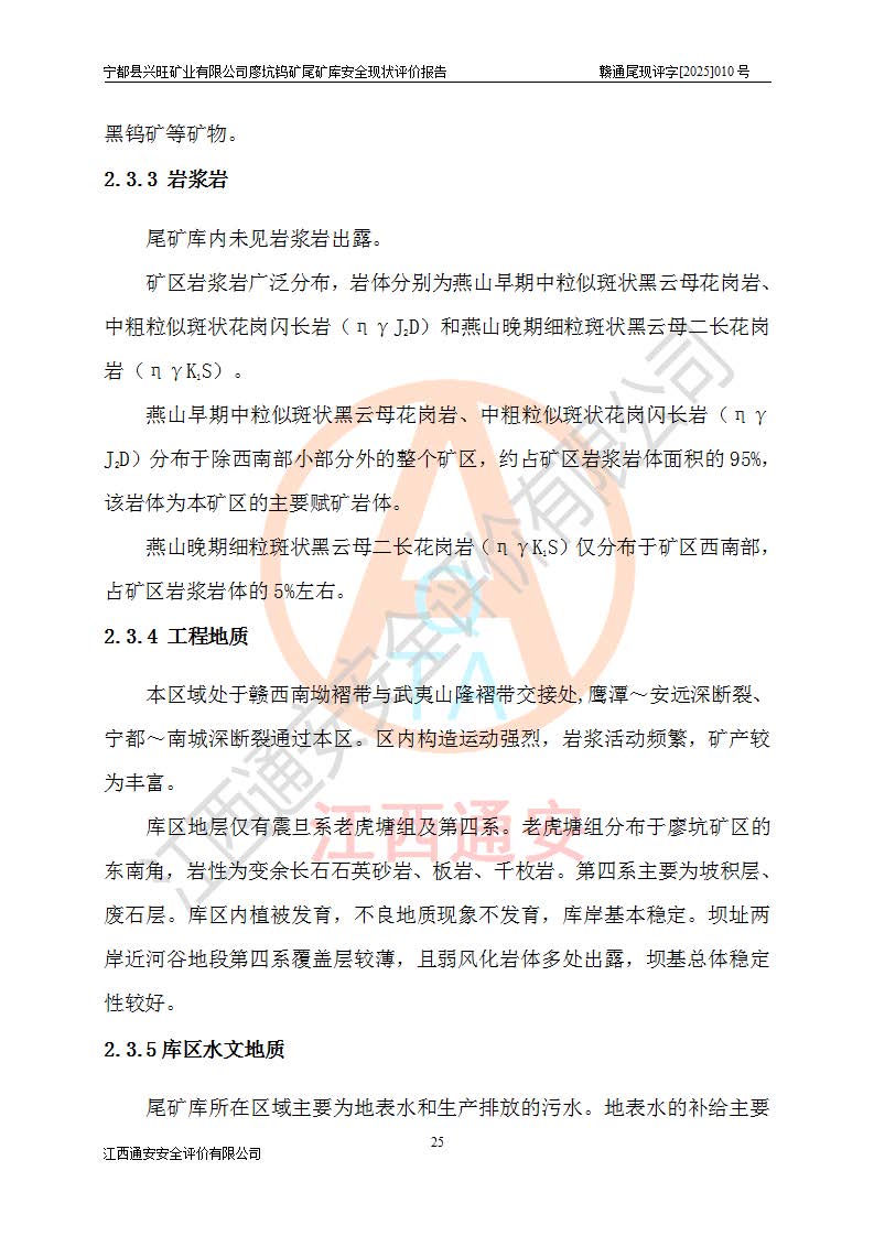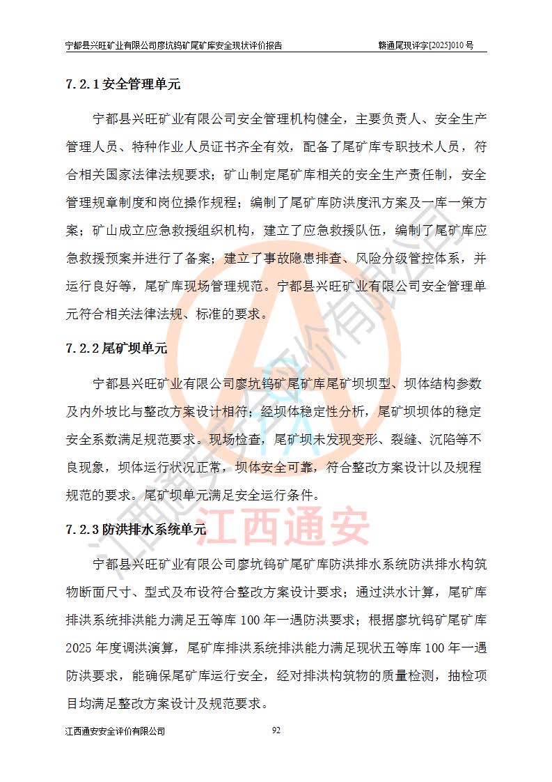 宁都县兴旺矿业有限公司廖坑钨矿位于宁都县县城北西直距约15km处的安福乡西甲村,地理坐标:东经115°50′48″;北纬26°32′1″。宁都县兴旺矿业有限公司成立于2006年03月29日,统一社会信用代码为91360730787253633E,企业类型为有限责任公司(自然人投资或控股),企业注册地位于江西省赣州市宁都县安福乡西甲村,法定**人为曾德强,注册资本为1915万元人民币,所属行业为有色金属矿采选业,经营范围包括钨砂开采及废砂石加工、销售。 廖坑钨矿尾矿库位于宁都县安福乡西甲村、选矿厂东面约1.17Km的下游沟谷中,选矿厂年生产工作日300d,尾矿堆积干容重1.60 t/m3。尾矿库汇水面积1.927km2,尾矿坝为浆砌块石重力坝,坝顶高程595.0m,清基后坝底高程为571.0m,坝高24.0m,坝顶宽度2.7m,坝顶轴线长75.0m;上游坝坡1:0,下游坝坡1:1.0。尾矿从库尾进行排放,设计总库容8.5×104m3,服务年限10.9年。尾矿库总占地面积约21.0亩。为山谷型五等库。 该尾矿库于1982年11月由宁都县水电施工队建设施工,1983年11月投产,2007年1月由江西省冶金设计院编制了《宁都县兴旺矿业有限公司廖坑钨矿尾矿库整改方案设计》,2008年4月2日取得江西省安全生产监督管理局颁发的安全生产许可证,证书编号(赣)FM安许证字[2008]M1268号。2022年江西通安安全评价有限公司编制了安全现状评价报告,2022年7月15日由赣州市行政审批局下发了安全生产许可证,证号(赣)FM安许证字[2022]B0081号,(赣市行审证(3)字[2022]第274号),**期至2025年7月14日。 依照《非煤矿矿山企业安全生产许可证延期换证工作》的通知,根据***《安全生产许可证条例》、《江西省安全生产条例》、《非煤矿山安全生产许可证实施办法》、《江西省非煤矿矿山企业安全生产许可证办法》规定及非煤矿山安全评价导则的要求,受宁都县兴旺矿业有限公司的委托,我公司承担廖坑钨矿尾矿库延期换证的安全现状评价工作。 |