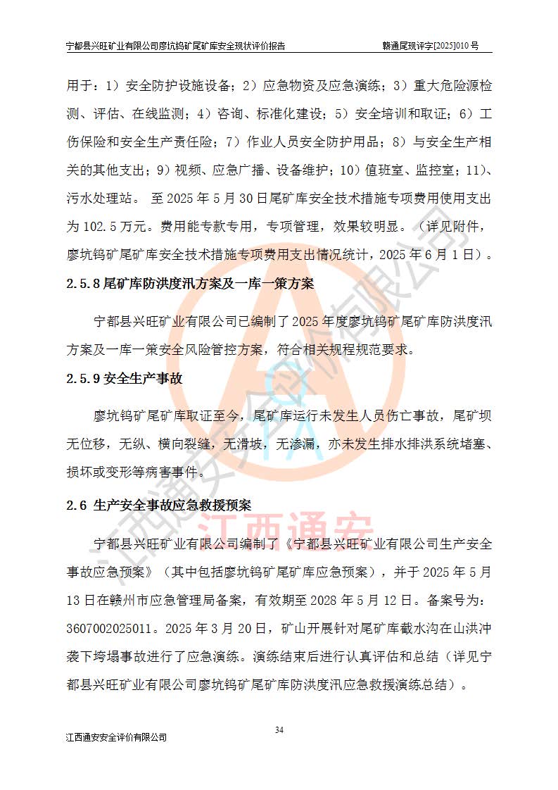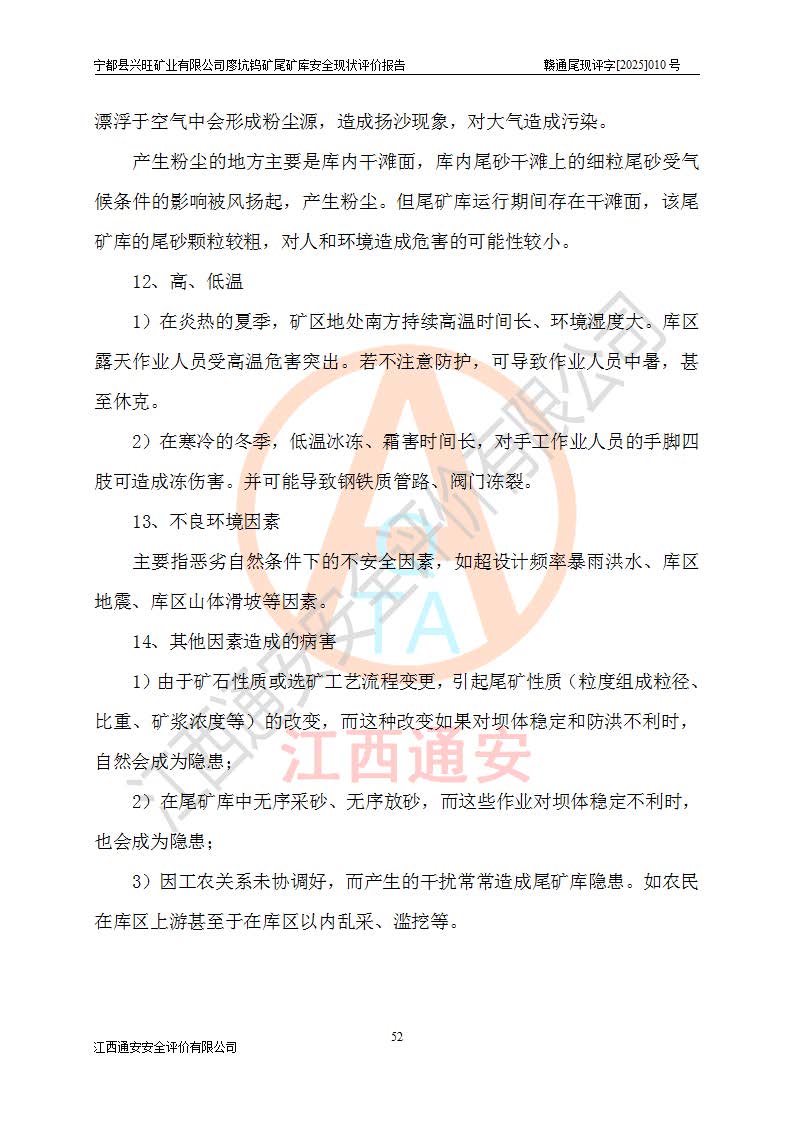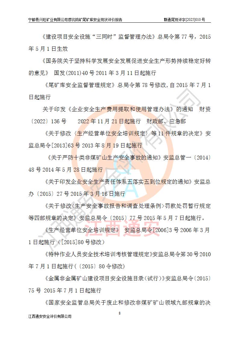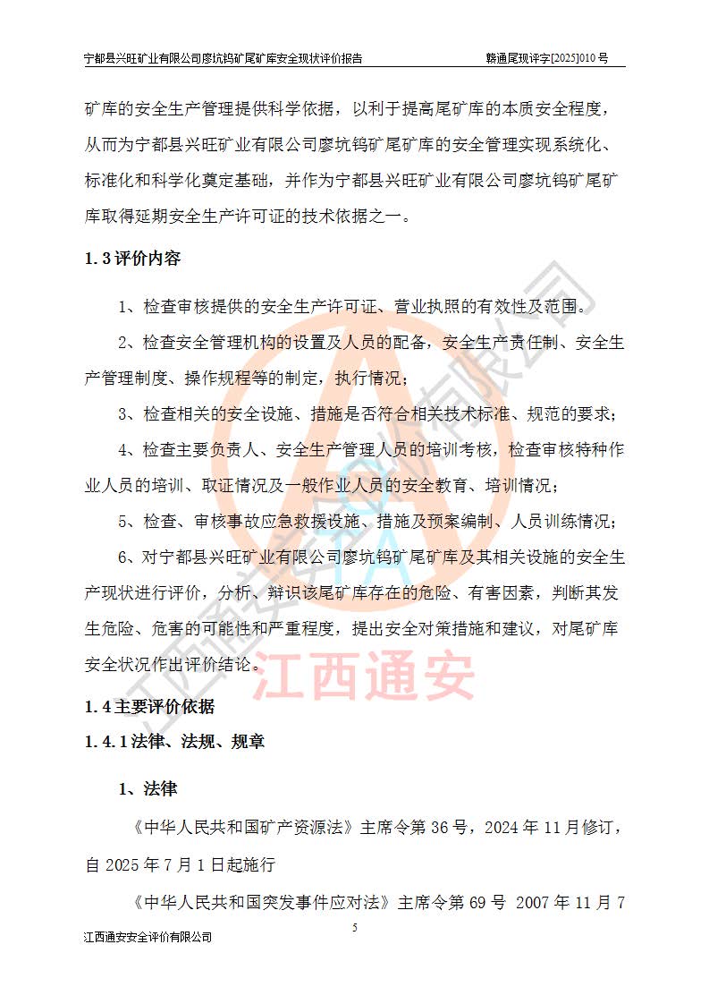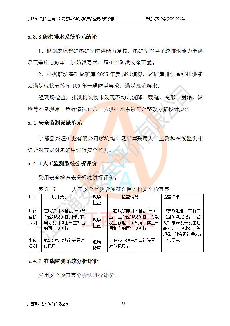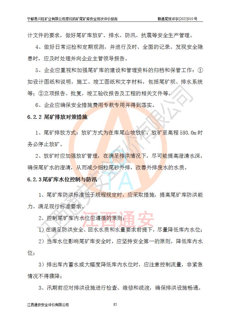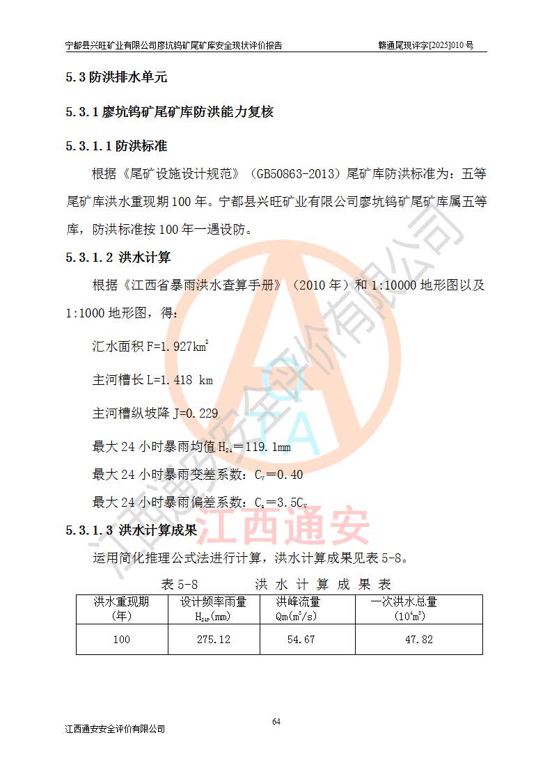 宁都县兴旺矿业有限公司廖坑钨矿位于宁都县县城北西直距约15km处的安福乡西甲村,地理坐标:东经115°50′48″;北纬26°32′1″。宁都县兴旺矿业有限公司成立于2006年03月29日,统一社会信用代码为91360730787253633E,企业类型为有限责任公司(自然人投资或控股),企业注册地位于江西省赣州市宁都县安福乡西甲村,法定**人为曾德强,注册资本为1915万元人民币,所属行业为有色金属矿采选业,经营范围包括钨砂开采及废砂石加工、销售。 廖坑钨矿尾矿库位于宁都县安福乡西甲村、选矿厂东面约1.17Km的下游沟谷中,选矿厂年生产工作日300d,尾矿堆积干容重1.60 t/m3。尾矿库汇水面积1.927km2,尾矿坝为浆砌块石重力坝,坝顶高程595.0m,清基后坝底高程为571.0m,坝高24.0m,坝顶宽度2.7m,坝顶轴线长75.0m;上游坝坡1:0,下游坝坡1:1.0。尾矿从库尾进行排放,设计总库容8.5×104m3,服务年限10.9年。尾矿库总占地面积约21.0亩。为山谷型五等库。 该尾矿库于1982年11月由宁都县水电施工队建设施工,1983年11月投产,2007年1月由江西省冶金设计院编制了《宁都县兴旺矿业有限公司廖坑钨矿尾矿库整改方案设计》,2008年4月2日取得江西省安全生产监督管理局颁发的安全生产许可证,证书编号(赣)FM安许证字[2008]M1268号。2022年江西通安安全评价有限公司编制了安全现状评价报告,2022年7月15日由赣州市行政审批局下发了安全生产许可证,证号(赣)FM安许证字[2022]B0081号,(赣市行审证(3)字[2022]第274号),**期至2025年7月14日。 依照《非煤矿矿山企业安全生产许可证延期换证工作》的通知,根据***《安全生产许可证条例》、《江西省安全生产条例》、《非煤矿山安全生产许可证实施办法》、《江西省非煤矿矿山企业安全生产许可证办法》规定及非煤矿山安全评价导则的要求,受宁都县兴旺矿业有限公司的委托,我公司承担廖坑钨矿尾矿库延期换证的安全现状评价工作。 |