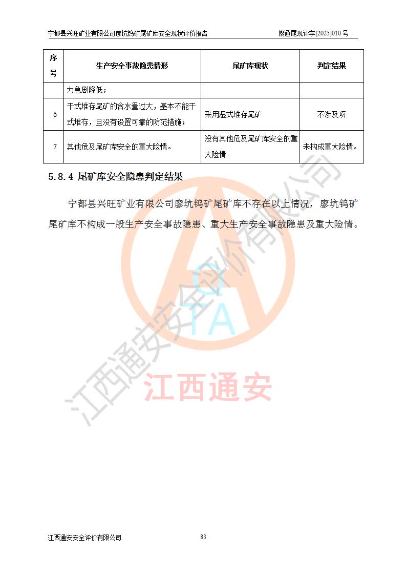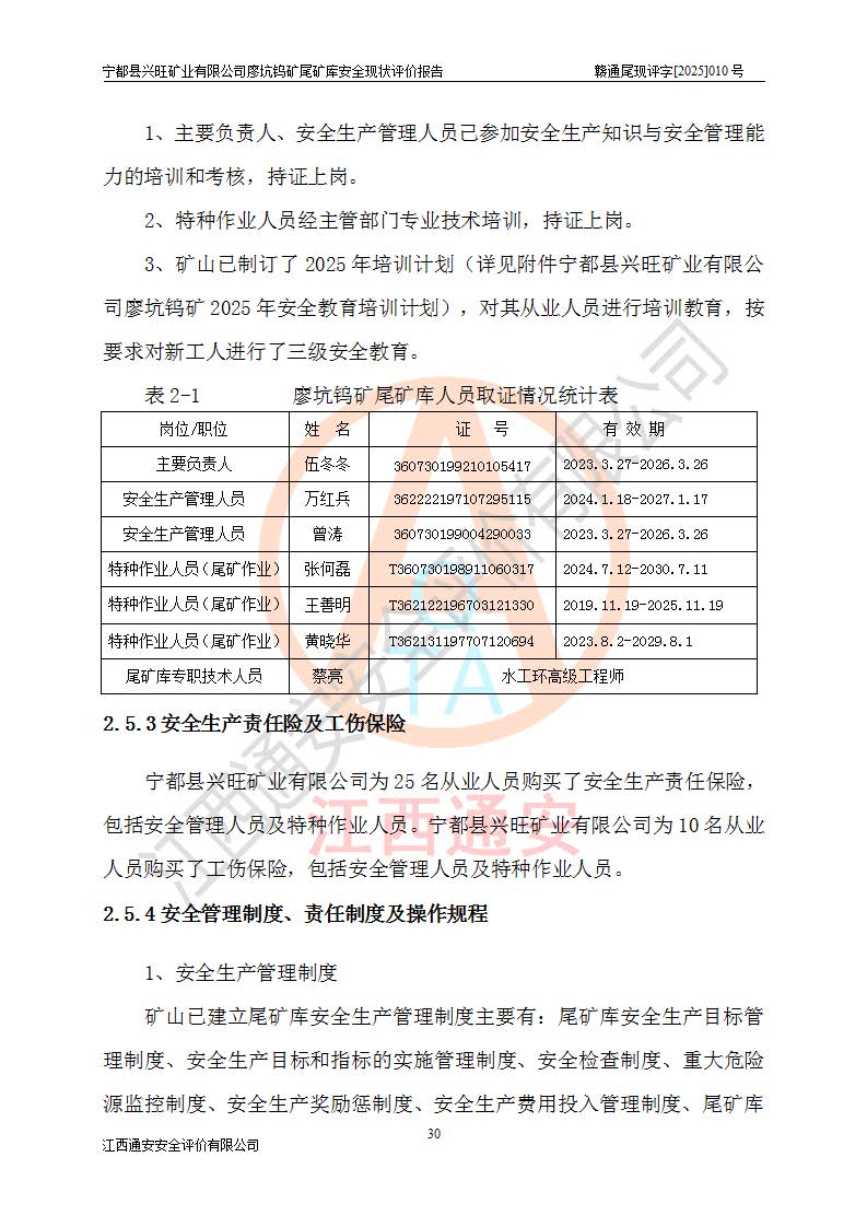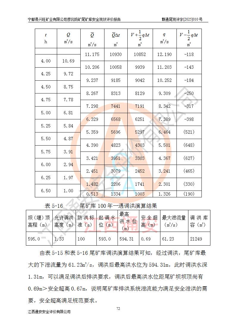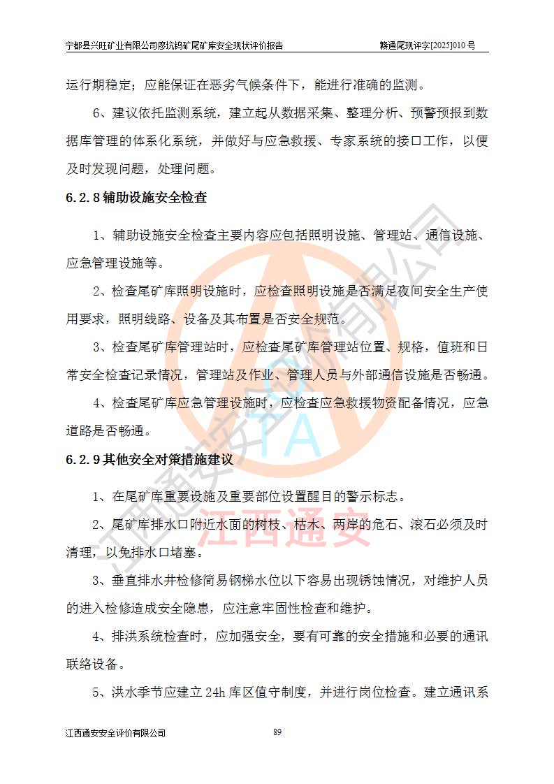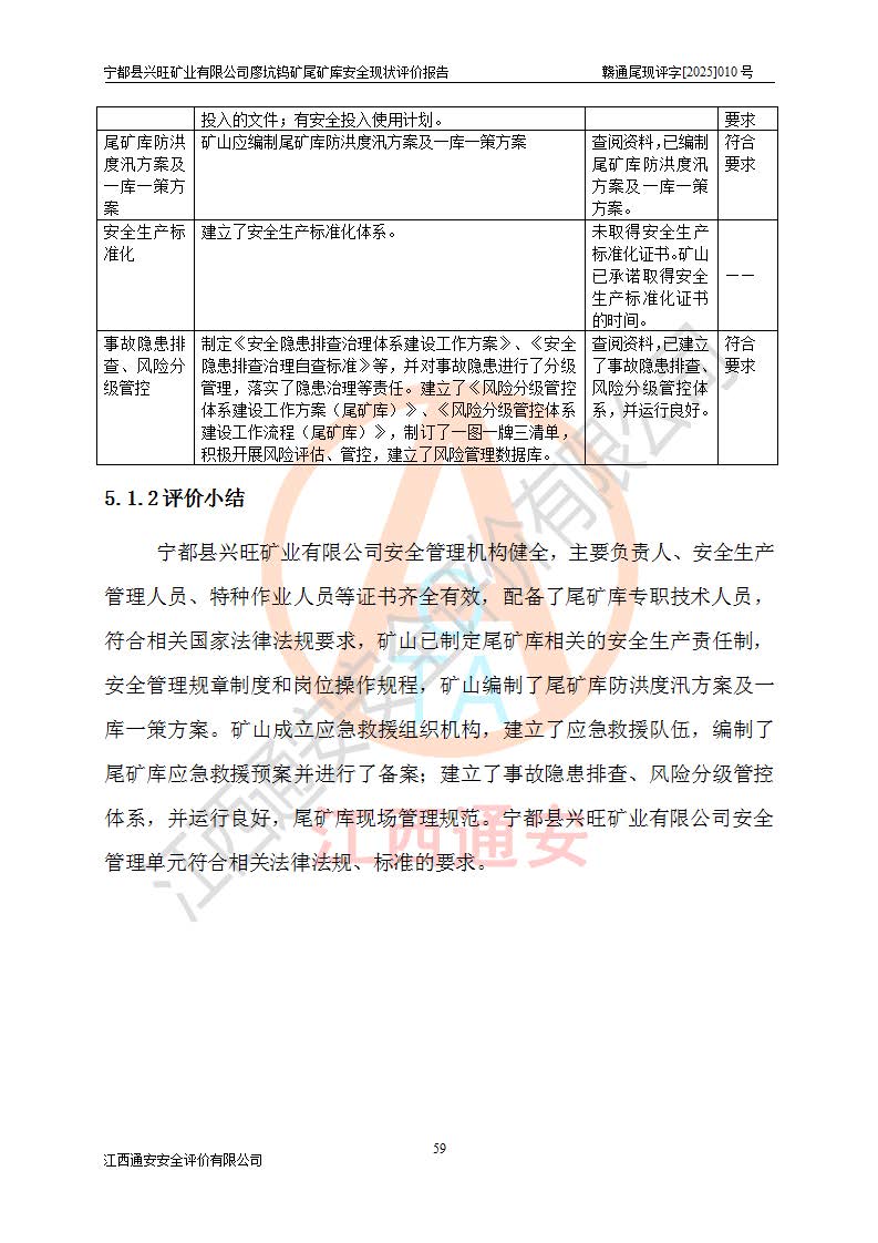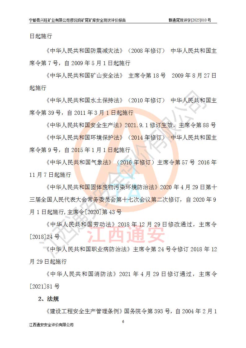 宁都县兴旺矿业有限公司廖坑钨矿位于宁都县县城北西直距约15km处的安福乡西甲村,地理坐标:东经115°50′48″;北纬26°32′1″。宁都县兴旺矿业有限公司成立于2006年03月29日,统一社会信用代码为91360730787253633E,企业类型为有限责任公司(自然人投资或控股),企业注册地位于江西省赣州市宁都县安福乡西甲村,法定**人为曾德强,注册资本为1915万元人民币,所属行业为有色金属矿采选业,经营范围包括钨砂开采及废砂石加工、销售。 廖坑钨矿尾矿库位于宁都县安福乡西甲村、选矿厂东面约1.17Km的下游沟谷中,选矿厂年生产工作日300d,尾矿堆积干容重1.60 t/m3。尾矿库汇水面积1.927km2,尾矿坝为浆砌块石重力坝,坝顶高程595.0m,清基后坝底高程为571.0m,坝高24.0m,坝顶宽度2.7m,坝顶轴线长75.0m;上游坝坡1:0,下游坝坡1:1.0。尾矿从库尾进行排放,设计总库容8.5×104m3,服务年限10.9年。尾矿库总占地面积约21.0亩。为山谷型五等库。 该尾矿库于1982年11月由宁都县水电施工队建设施工,1983年11月投产,2007年1月由江西省冶金设计院编制了《宁都县兴旺矿业有限公司廖坑钨矿尾矿库整改方案设计》,2008年4月2日取得江西省安全生产监督管理局颁发的安全生产许可证,证书编号(赣)FM安许证字[2008]M1268号。2022年江西通安安全评价有限公司编制了安全现状评价报告,2022年7月15日由赣州市行政审批局下发了安全生产许可证,证号(赣)FM安许证字[2022]B0081号,(赣市行审证(3)字[2022]第274号),**期至2025年7月14日。 依照《非煤矿矿山企业安全生产许可证延期换证工作》的通知,根据***《安全生产许可证条例》、《江西省安全生产条例》、《非煤矿山安全生产许可证实施办法》、《江西省非煤矿矿山企业安全生产许可证办法》规定及非煤矿山安全评价导则的要求,受宁都县兴旺矿业有限公司的委托,我公司承担廖坑钨矿尾矿库延期换证的安全现状评价工作。 |