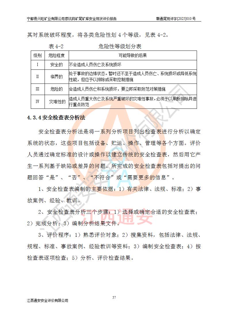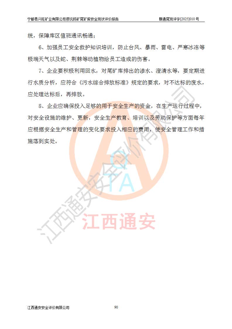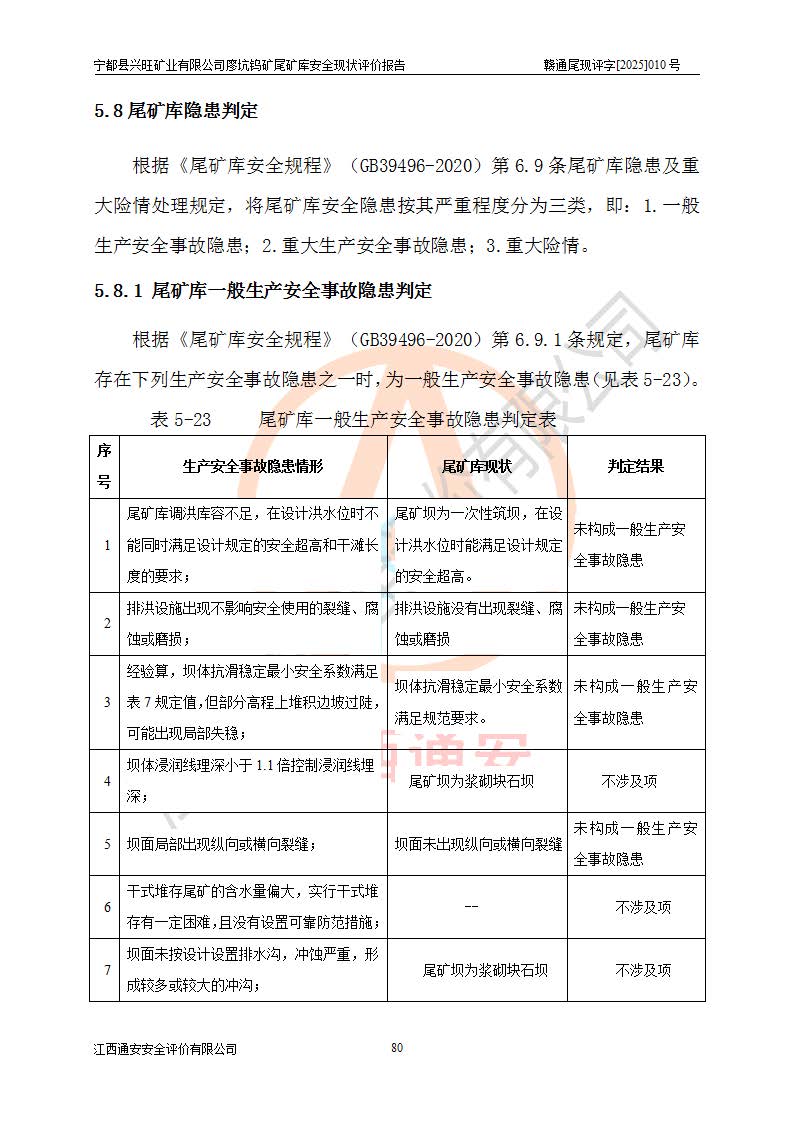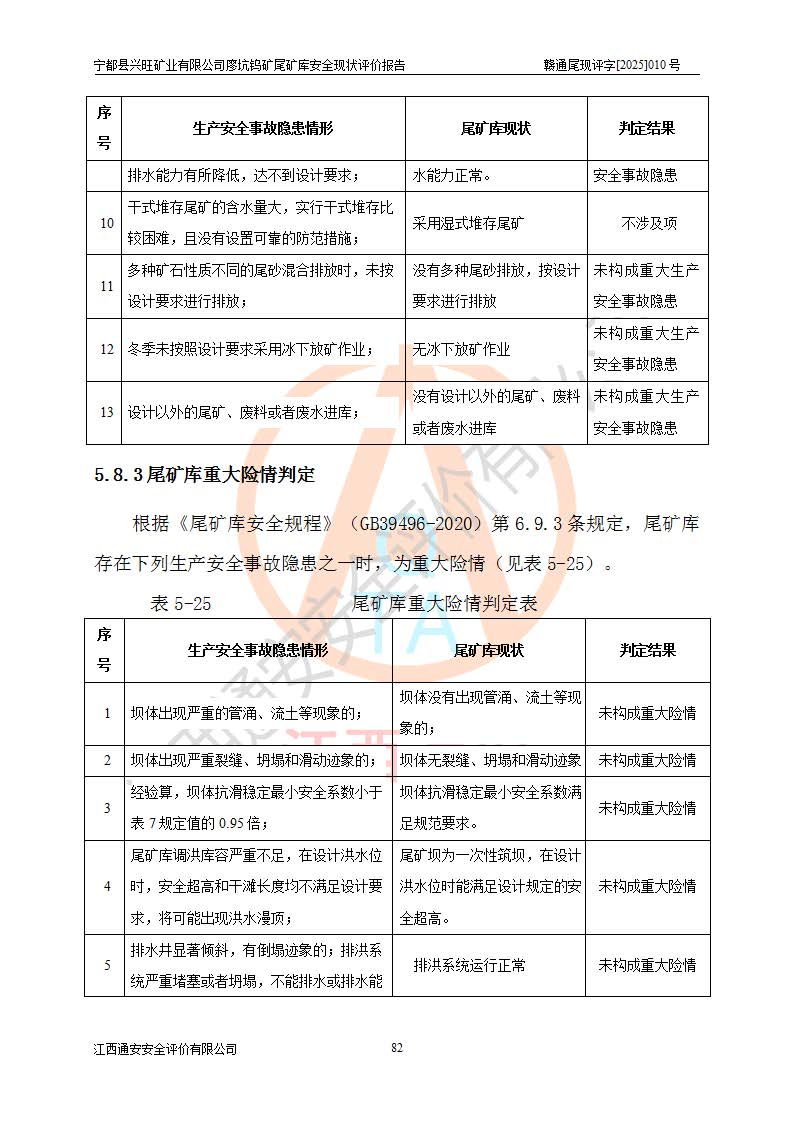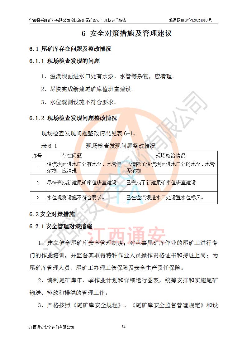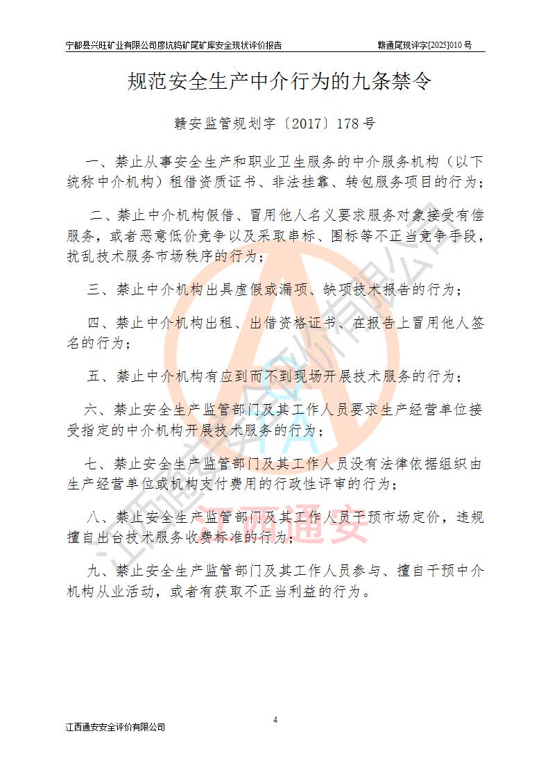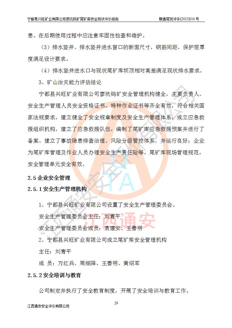 宁都县兴旺矿业有限公司廖坑钨矿位于宁都县县城北西直距约15km处的安福乡西甲村,地理坐标:东经115°50′48″;北纬26°32′1″。宁都县兴旺矿业有限公司成立于2006年03月29日,统一社会信用代码为91360730787253633E,企业类型为有限责任公司(自然人投资或控股),企业注册地位于江西省赣州市宁都县安福乡西甲村,法定**人为曾德强,注册资本为1915万元人民币,所属行业为有色金属矿采选业,经营范围包括钨砂开采及废砂石加工、销售。 廖坑钨矿尾矿库位于宁都县安福乡西甲村、选矿厂东面约1.17Km的下游沟谷中,选矿厂年生产工作日300d,尾矿堆积干容重1.60 t/m3。尾矿库汇水面积1.927km2,尾矿坝为浆砌块石重力坝,坝顶高程595.0m,清基后坝底高程为571.0m,坝高24.0m,坝顶宽度2.7m,坝顶轴线长75.0m;上游坝坡1:0,下游坝坡1:1.0。尾矿从库尾进行排放,设计总库容8.5×104m3,服务年限10.9年。尾矿库总占地面积约21.0亩。为山谷型五等库。 该尾矿库于1982年11月由宁都县水电施工队建设施工,1983年11月投产,2007年1月由江西省冶金设计院编制了《宁都县兴旺矿业有限公司廖坑钨矿尾矿库整改方案设计》,2008年4月2日取得江西省安全生产监督管理局颁发的安全生产许可证,证书编号(赣)FM安许证字[2008]M1268号。2022年江西通安安全评价有限公司编制了安全现状评价报告,2022年7月15日由赣州市行政审批局下发了安全生产许可证,证号(赣)FM安许证字[2022]B0081号,(赣市行审证(3)字[2022]第274号),**期至2025年7月14日。 依照《非煤矿矿山企业安全生产许可证延期换证工作》的通知,根据***《安全生产许可证条例》、《江西省安全生产条例》、《非煤矿山安全生产许可证实施办法》、《江西省非煤矿矿山企业安全生产许可证办法》规定及非煤矿山安全评价导则的要求,受宁都县兴旺矿业有限公司的委托,我公司承担廖坑钨矿尾矿库延期换证的安全现状评价工作。 |