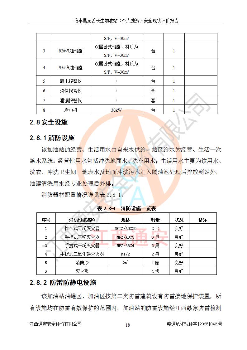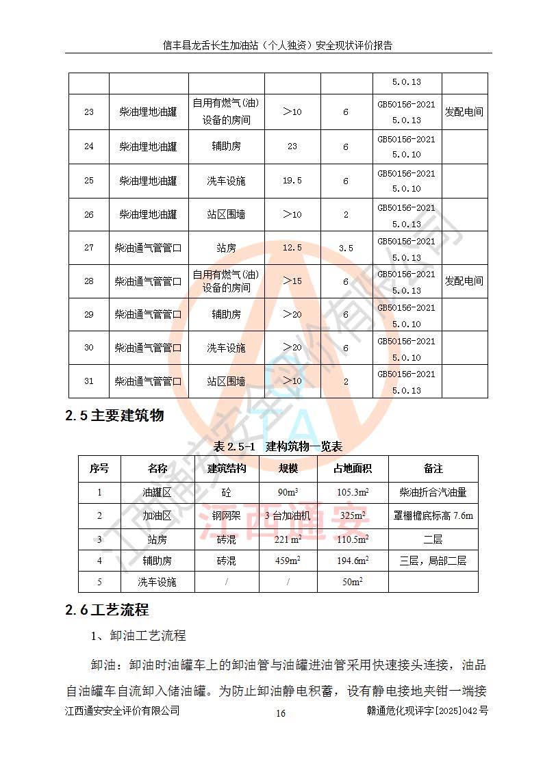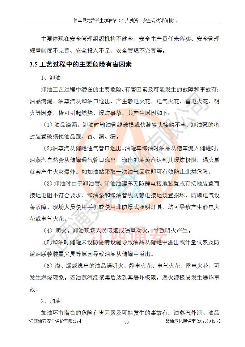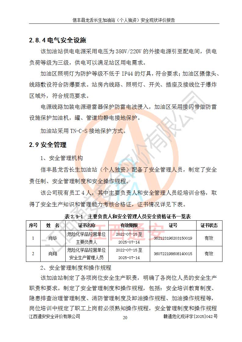 项目简介 | 信丰县龙舌长生加油站(个人独资)成立于2025年05月20日,由信丰县龙舌加油站核准登记为个人独资企业,地址位于赣州市信丰县嘉定镇长生村龙舌路大穴场,投资人为肖华,现有员工4人,其中安全管理人员1人,注册资本叁拾万元整,经营范围为一般项目:润滑油销售等。 信丰县龙舌长生加油站(个人独资),即信丰县龙舌加油站2022年10月24日取得了危险化学品经营许可证,证书编号为(赣)信行审危许字[2022]038号,经营方式为零售,许可范围为汽油、柴油,**期限为2022年10月25日至2025年10月24日。该加油站2020年08月17日取得了成品油零售经营批准证书,编号为油零售证书第虔0039号,**期限为2020年06月23日至2025年06月22日。加油站设有4台埋地油罐,分别为2台30m30#柴油卧式储罐、1台30m392#汽油卧式油罐和1台30m395#汽油卧式油罐,总储存能力为90m³(柴油折半),为三级加油站。加油区设有3台双枪加油机。该加油站目前运行正常。 | |||