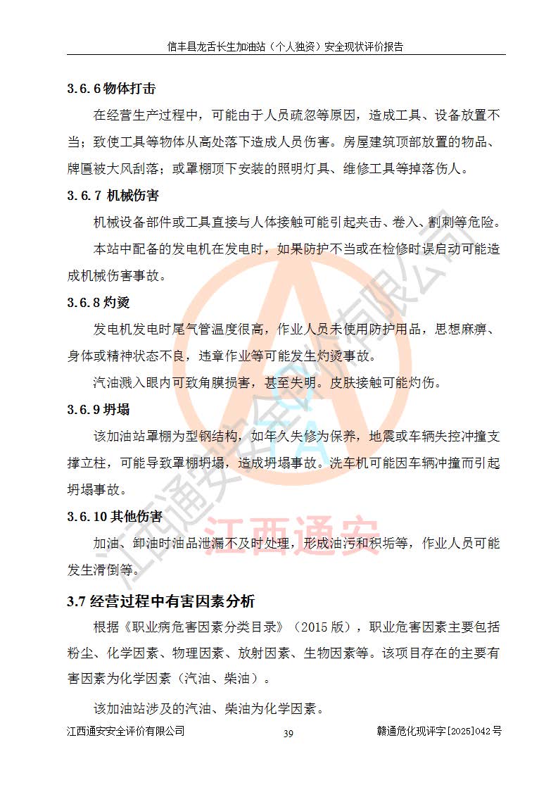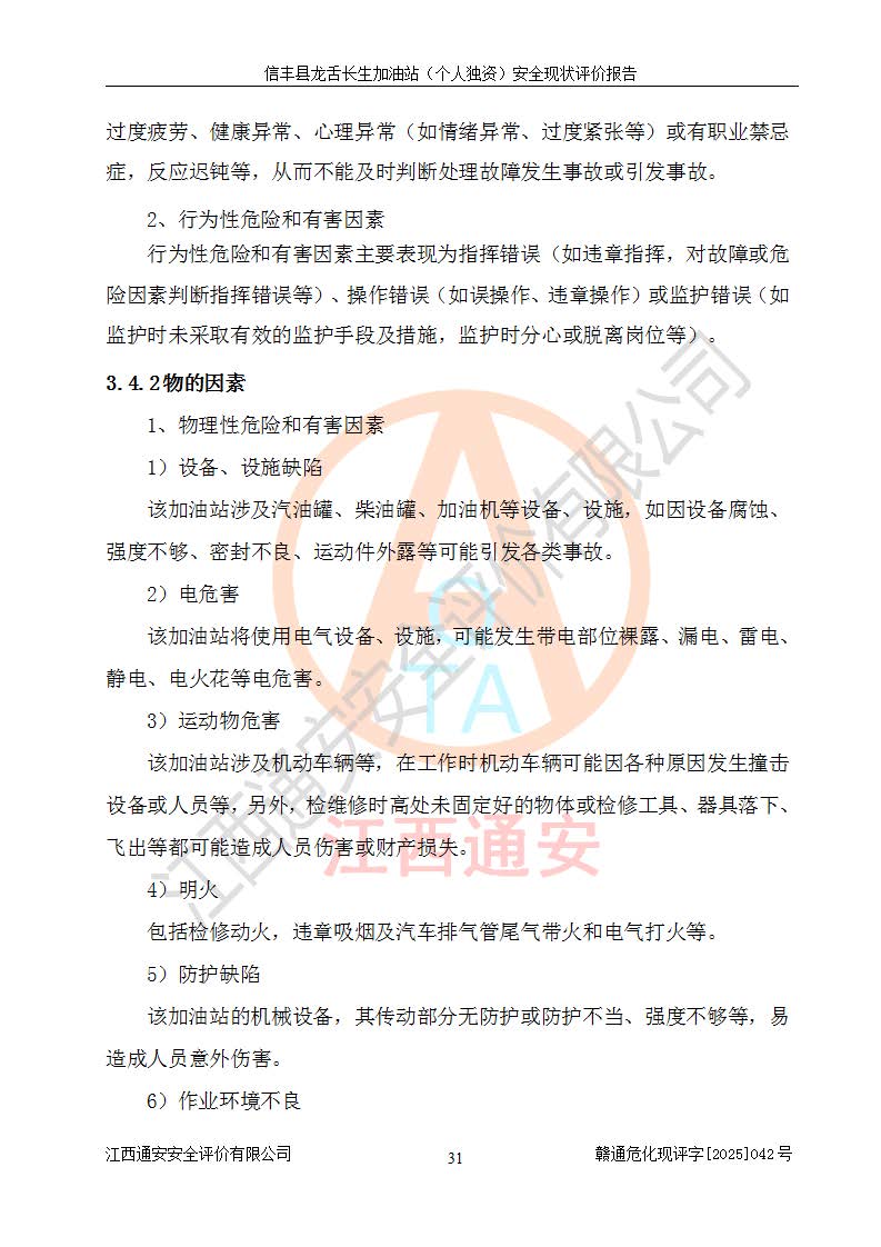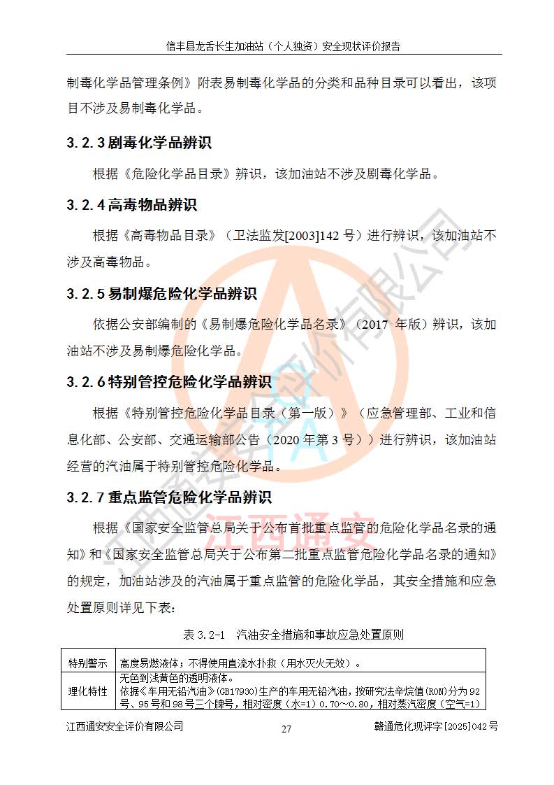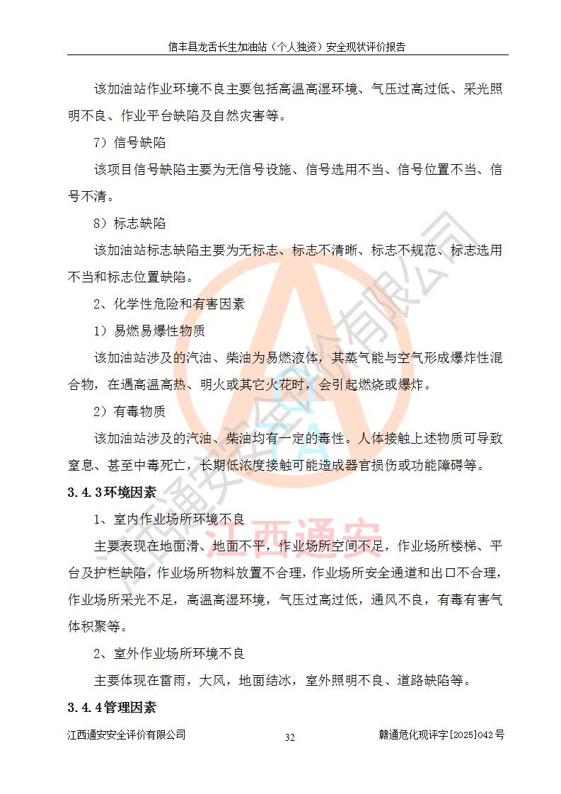 项目简介 | 信丰县龙舌长生加油站(个人独资)成立于2025年05月20日,由信丰县龙舌加油站核准登记为个人独资企业,地址位于赣州市信丰县嘉定镇长生村龙舌路大穴场,投资人为肖华,现有员工4人,其中安全管理人员1人,注册资本叁拾万元整,经营范围为一般项目:润滑油销售等。 信丰县龙舌长生加油站(个人独资),即信丰县龙舌加油站2022年10月24日取得了危险化学品经营许可证,证书编号为(赣)信行审危许字[2022]038号,经营方式为零售,许可范围为汽油、柴油,**期限为2022年10月25日至2025年10月24日。该加油站2020年08月17日取得了成品油零售经营批准证书,编号为油零售证书第虔0039号,**期限为2020年06月23日至2025年06月22日。加油站设有4台埋地油罐,分别为2台30m30#柴油卧式储罐、1台30m392#汽油卧式油罐和1台30m395#汽油卧式油罐,总储存能力为90m³(柴油折半),为三级加油站。加油区设有3台双枪加油机。该加油站目前运行正常。 | |||