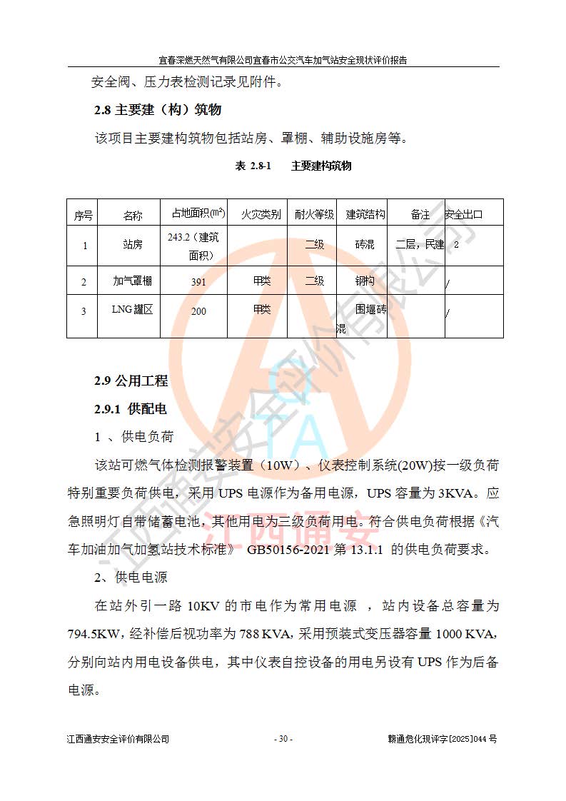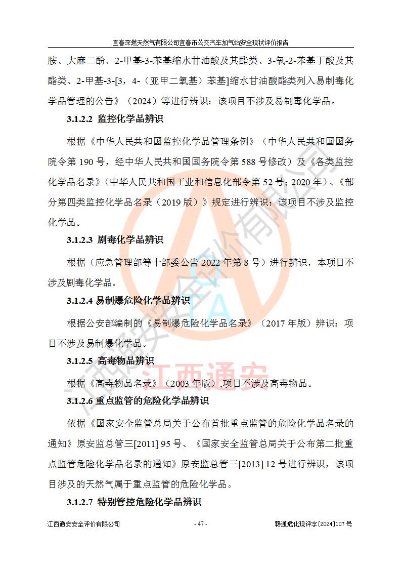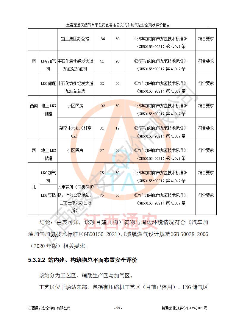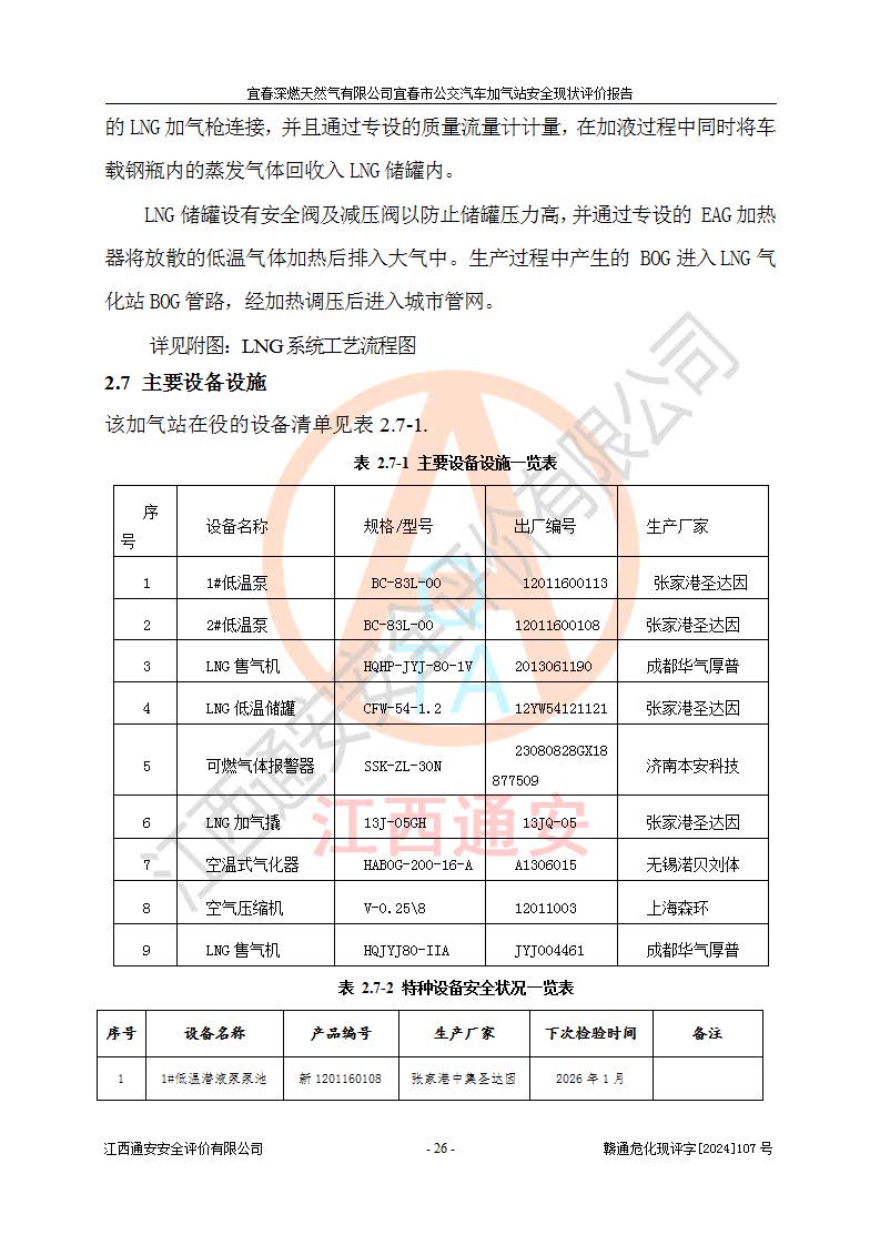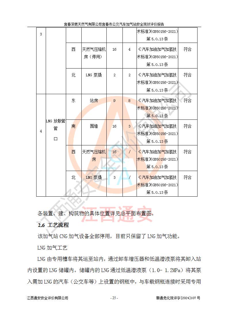 项目简介 | 宜春深燃天然气有限公司宜春市公交汽车加气站成立于2014年01月27日,注册地位于江西省宜春经济技术开发区,负责人为陈建刚。经营范围包括管道燃气业务经营,燃气输配管网的投资、建设和经营;宜春市城市天然气利用工程的开发、建设、经营;燃气器具、五金销售;承担燃气管道安装工程。(依法须经批准的项目,经相关部门批准后方可开展经营活动)。 宜春深燃天然气有限公司在江西省宜春市经济开发区经发大道西侧建有宜春市公交汽车加气站项目,该站于2013年8月20日建成,10月投产该加气站占地面积4774.32m2,为综合性天然气加气站,由于市场原因,CNG加气设备**停用,系统管道已**切断,目前只保留了LNG加气功能。本站设一个容积60m3的LNG储罐,两台LNG加气机,加气站储存总容积60m3 ,目前只作为LNG加气站使用的情况下,依据《汽车加油加气加氢技术标准》(GB50156-2021)该加气站为二级加气站。 宜春深燃天然气有限公司宜春市公交汽车加气站于2024年9月29日取得了燃气经营许可证,编号202308010011J,经营区域包括宜春市中心城区,许可证**期限为2024年9月29日至2026年1月22日,目前正在办理许可证延期手续。 根据《危险化学品目录》(2015年版)、应急管理部办公厅关于修改《危险化学品目录(2015年版)实施指南(试行)》涉及柴油部分内容的通知(应急厅函[2022]300号)和应急管理部 工业和信息化部 公安部 生态环境部 交通运输部 农业农村部 卫生健康委 市场监管总局 铁路局 民航局公告2022年第8号《决定调整《危险化学品目录(2015版)》,将“1674柴油[闭杯闪点≤60℃]”调整为“1674柴油”》的文件规定,该项目涉及危险化学品天然气(74-82-8),其中天然气属于重点监管的危险化学品。 根据《**安全监管总局关于公布首批重点监管的危险化工工艺目录的通知》(安监总管三【2009】116号)、《**安全监管总局关于公布第二批重点监管危险化工工艺目录和调整首批重点监管危险化工工艺中部分典型工艺的通知》(安监总管三【2013】3号)文件要求:该项目不涉及重点监管的危险化工工艺。 根据《危险化学品重大危险源辨识》(GB 18218-2018)进行辨识,该项目生产单元和储存设施单元不构成危险化学品重大危险源。