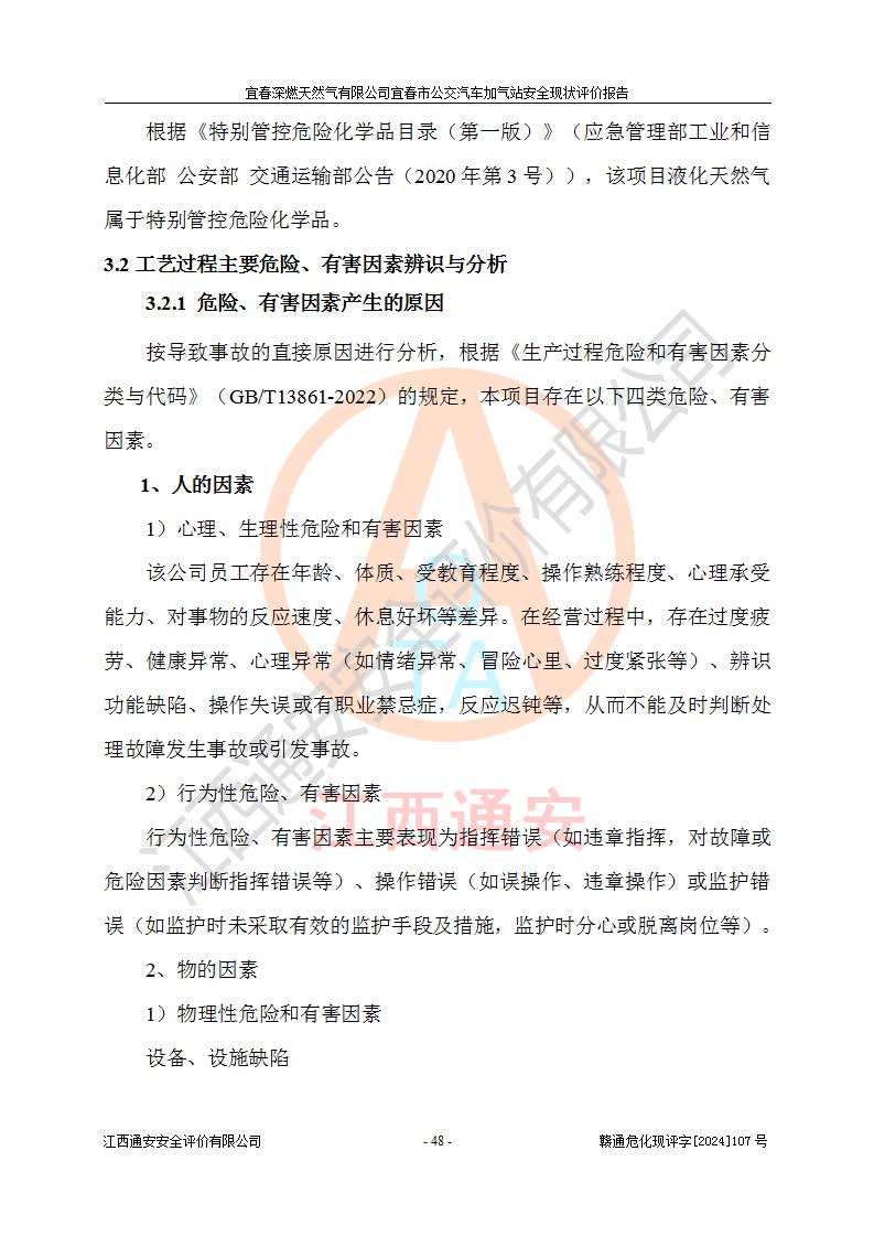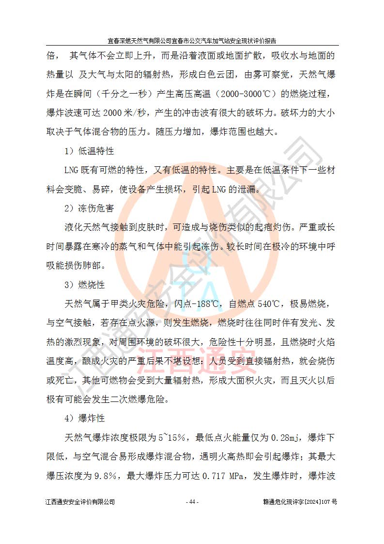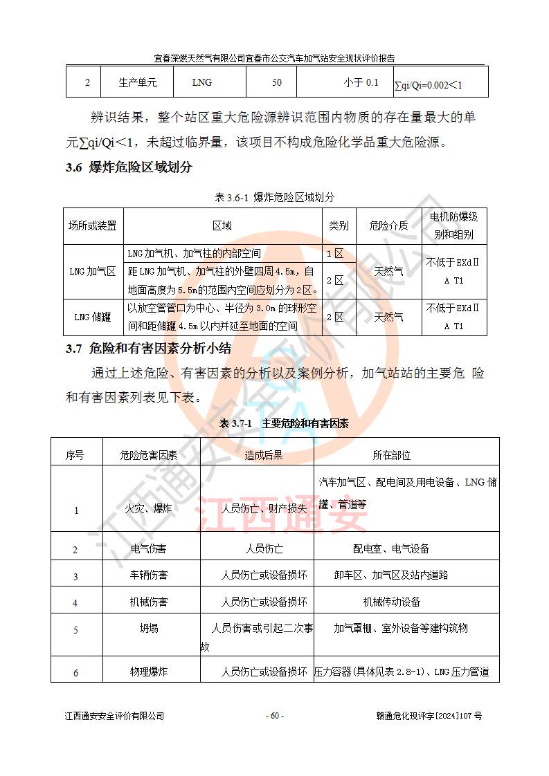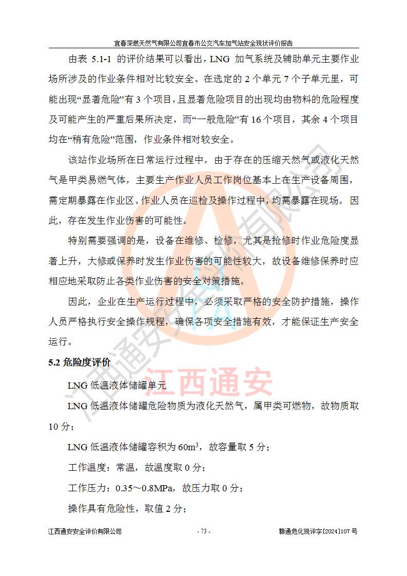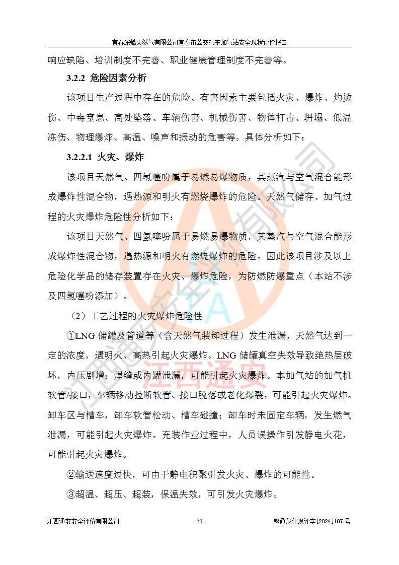 其它 | 1、主要危险、危害因素辨识结果 宜春深燃天然气有限公司宜春市公交汽车加气站在生产经营过程中存在的主要危险有:火灾、爆炸、灼烫伤、中毒窒息、高处坠落、**伤害、机械伤害、物体打击、坍塌、低温冻伤、容器爆炸等,存在的主要危害因素有:化学因素、物理因素(噪声、高温等)等,同时存在人为失误和管理缺陷。应重点防范的主要危险为火灾与爆炸、容器爆炸。 2、危险化学品辨识结果 经辨识,该加气站涉及的天然气属于危险化学品,天然气属于重点监管的危险化学品和特别管控危险化学品,不涉及监控化学品、易制毒化学品、易制爆危险化学品、剧毒化学品和高毒物品等危险化学品。 3、危险化学品重大危险源辨识结果 根据《危险化学品重大危险源辨识》和《危险化学品重大危险源监督管理暂行规定》(2011)(40号令)得出结论如下:该加气站不构成重大危险源。 4、重点监管危险化工工艺辨识结果 根据《**安全监管总局关于公布首批重点监管的危险化学品名录的通知》安监总管三[2011] 95号、《**安全监管总局关于公布第二批重点监管危险化学品名录的通知》安监总管三[2013] 12号进行辨识,该天然气加气站不涉及重点监管的危险化工工艺。 5、作业条件危险性分析结果: 在选定的2个单元7个子单元里,可能出现“显著危险”有3个项目,且显著危险项目的出现均由物料的危险程度及可能产生的严重后果所决定,而“一般危险”有16个项目,其余4个项目均在“稍有危险”范围,作业条件相对较安全。 6、危险度评价结果:该加气站LNG储罐属**危险。 7、采用检查表评价法对该加气站周边环境、总图运输、LNG工艺装置区、加气区、公用辅助设施及安全管理进行定性评价,评价结果如下: (1)宜春深燃天然气有限公司宜春市公交汽车加气站站址符合规划要求,与站外建构筑物的距离符合有关标准、规范的要求。外部安全距离内无GB36894-2018中第3.1条所列的防护目标。 (2)总图布置分区明确,布局合理,满足规范要求。 (3)该加气站加气机运行稳定,安全保护装置应经常检查完好**。储罐等压力容器和安全附件均定期进行检测,不带病运行。现场提出的安全隐患企业经整改后符合相关规范的要求。 (4)该项目消防安全设施设置符合规范要求。 (5)该项目电气安全设施能满足安全要求,按要求设置了防雷防静电设施,并经检测合格。防火防爆设施,LNG工艺装置的自控仪表系统、天然气防泄漏设施、电气防爆措施等安全防护设施,在现场检查时发现存在安全隐患,企业经经整改后符合相关规范的要求。 (6)该项目公用工程能够满足安全经营的基本需要,符合安全经营的条件。 评价结论:综合结论:宜春深燃天然气有限公司宜春市公交汽车加气站的安全设施及安全管理符合法律、法规、标准的要求,安全风险是受控制的,其风险程度是可以接受的,满足燃气经营的安全条件。