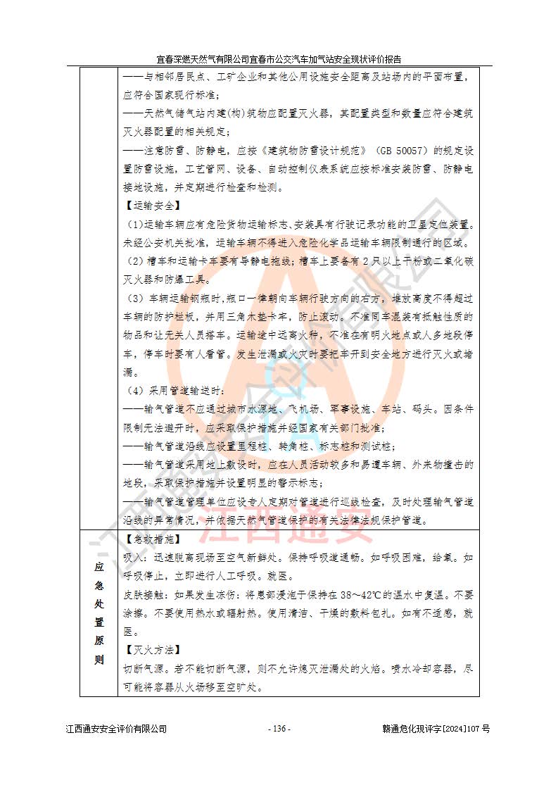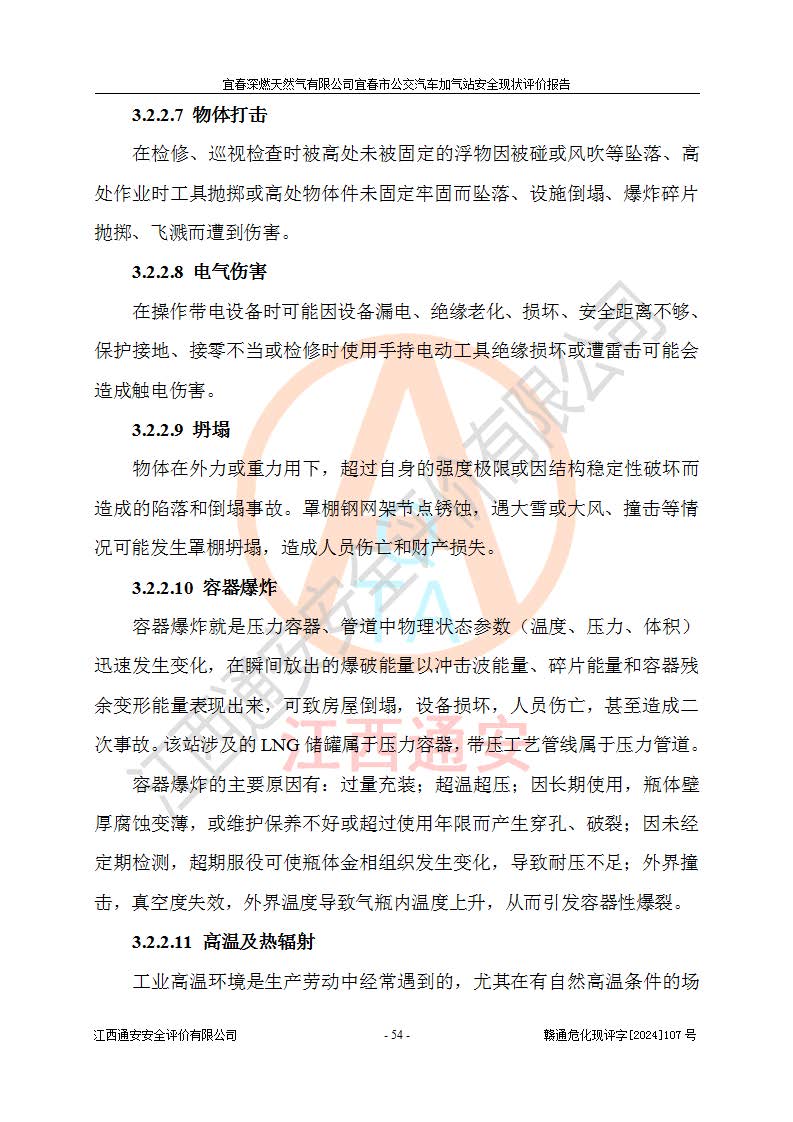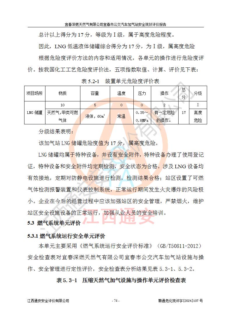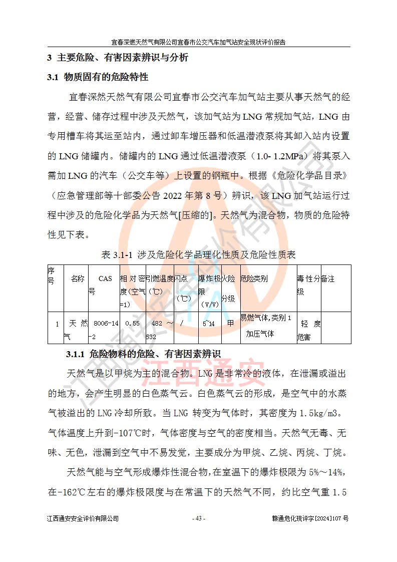 其它 | 1、主要危险、危害因素辨识结果 宜春深燃天然气有限公司宜春市公交汽车加气站在生产经营过程中存在的主要危险有:火灾、爆炸、灼烫伤、中毒窒息、高处坠落、**伤害、机械伤害、物体打击、坍塌、低温冻伤、容器爆炸等,存在的主要危害因素有:化学因素、物理因素(噪声、高温等)等,同时存在人为失误和管理缺陷。应重点防范的主要危险为火灾与爆炸、容器爆炸。 2、危险化学品辨识结果 经辨识,该加气站涉及的天然气属于危险化学品,天然气属于重点监管的危险化学品和特别管控危险化学品,不涉及监控化学品、易制毒化学品、易制爆危险化学品、剧毒化学品和高毒物品等危险化学品。 3、危险化学品重大危险源辨识结果 根据《危险化学品重大危险源辨识》和《危险化学品重大危险源监督管理暂行规定》(2011)(40号令)得出结论如下:该加气站不构成重大危险源。 4、重点监管危险化工工艺辨识结果 根据《**安全监管总局关于公布首批重点监管的危险化学品名录的通知》安监总管三[2011] 95号、《**安全监管总局关于公布第二批重点监管危险化学品名录的通知》安监总管三[2013] 12号进行辨识,该天然气加气站不涉及重点监管的危险化工工艺。 5、作业条件危险性分析结果: 在选定的2个单元7个子单元里,可能出现“显著危险”有3个项目,且显著危险项目的出现均由物料的危险程度及可能产生的严重后果所决定,而“一般危险”有16个项目,其余4个项目均在“稍有危险”范围,作业条件相对较安全。 6、危险度评价结果:该加气站LNG储罐属**危险。 7、采用检查表评价法对该加气站周边环境、总图运输、LNG工艺装置区、加气区、公用辅助设施及安全管理进行定性评价,评价结果如下: (1)宜春深燃天然气有限公司宜春市公交汽车加气站站址符合规划要求,与站外建构筑物的距离符合有关标准、规范的要求。外部安全距离内无GB36894-2018中第3.1条所列的防护目标。 (2)总图布置分区明确,布局合理,满足规范要求。 (3)该加气站加气机运行稳定,安全保护装置应经常检查完好**。储罐等压力容器和安全附件均定期进行检测,不带病运行。现场提出的安全隐患企业经整改后符合相关规范的要求。 (4)该项目消防安全设施设置符合规范要求。 (5)该项目电气安全设施能满足安全要求,按要求设置了防雷防静电设施,并经检测合格。防火防爆设施,LNG工艺装置的自控仪表系统、天然气防泄漏设施、电气防爆措施等安全防护设施,在现场检查时发现存在安全隐患,企业经经整改后符合相关规范的要求。 (6)该项目公用工程能够满足安全经营的基本需要,符合安全经营的条件。 评价结论:综合结论:宜春深燃天然气有限公司宜春市公交汽车加气站的安全设施及安全管理符合法律、法规、标准的要求,安全风险是受控制的,其风险程度是可以接受的,满足燃气经营的安全条件。