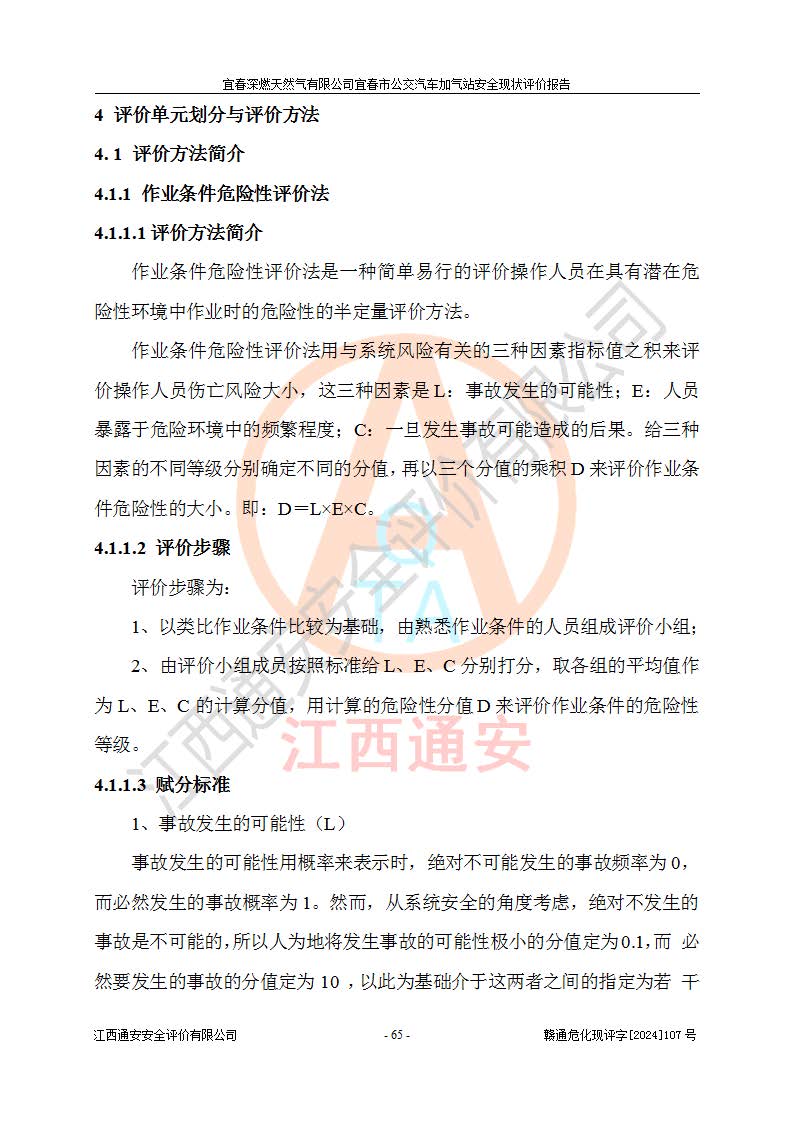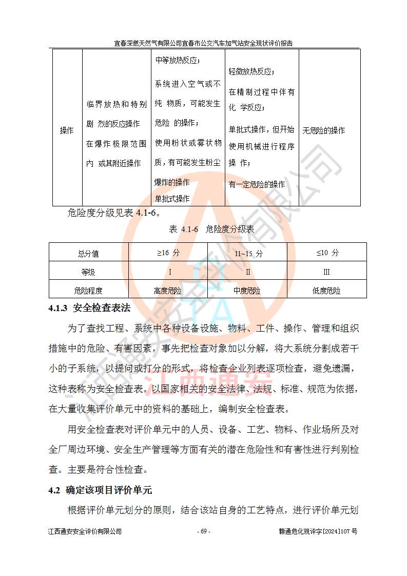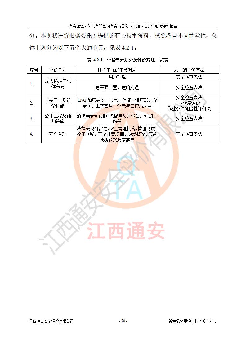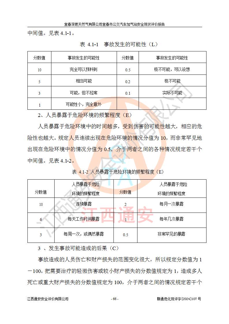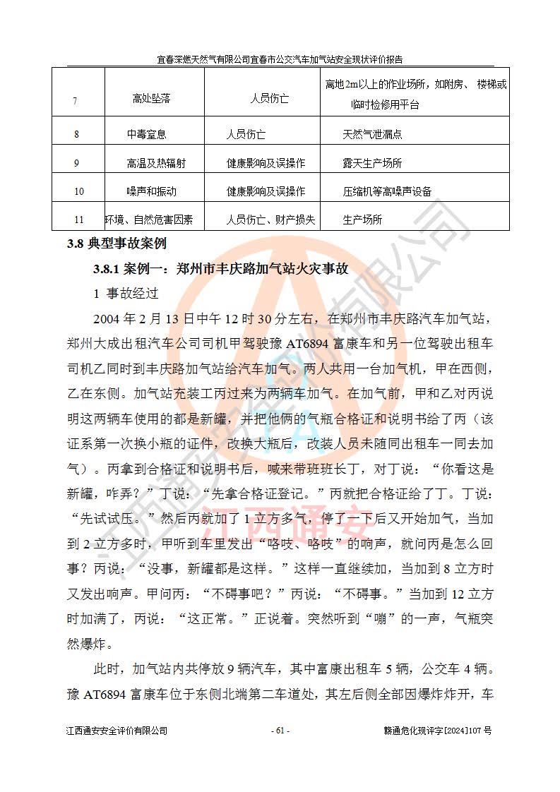 其它 | 1、主要危险、危害因素辨识结果 宜春深燃天然气有限公司宜春市公交汽车加气站在生产经营过程中存在的主要危险有:火灾、爆炸、灼烫伤、中毒窒息、高处坠落、**伤害、机械伤害、物体打击、坍塌、低温冻伤、容器爆炸等,存在的主要危害因素有:化学因素、物理因素(噪声、高温等)等,同时存在人为失误和管理缺陷。应重点防范的主要危险为火灾与爆炸、容器爆炸。 2、危险化学品辨识结果 经辨识,该加气站涉及的天然气属于危险化学品,天然气属于重点监管的危险化学品和特别管控危险化学品,不涉及监控化学品、易制毒化学品、易制爆危险化学品、剧毒化学品和高毒物品等危险化学品。 3、危险化学品重大危险源辨识结果 根据《危险化学品重大危险源辨识》和《危险化学品重大危险源监督管理暂行规定》(2011)(40号令)得出结论如下:该加气站不构成重大危险源。 4、重点监管危险化工工艺辨识结果 根据《**安全监管总局关于公布首批重点监管的危险化学品名录的通知》安监总管三[2011] 95号、《**安全监管总局关于公布第二批重点监管危险化学品名录的通知》安监总管三[2013] 12号进行辨识,该天然气加气站不涉及重点监管的危险化工工艺。 5、作业条件危险性分析结果: 在选定的2个单元7个子单元里,可能出现“显著危险”有3个项目,且显著危险项目的出现均由物料的危险程度及可能产生的严重后果所决定,而“一般危险”有16个项目,其余4个项目均在“稍有危险”范围,作业条件相对较安全。 6、危险度评价结果:该加气站LNG储罐属**危险。 7、采用检查表评价法对该加气站周边环境、总图运输、LNG工艺装置区、加气区、公用辅助设施及安全管理进行定性评价,评价结果如下: (1)宜春深燃天然气有限公司宜春市公交汽车加气站站址符合规划要求,与站外建构筑物的距离符合有关标准、规范的要求。外部安全距离内无GB36894-2018中第3.1条所列的防护目标。 (2)总图布置分区明确,布局合理,满足规范要求。 (3)该加气站加气机运行稳定,安全保护装置应经常检查完好**。储罐等压力容器和安全附件均定期进行检测,不带病运行。现场提出的安全隐患企业经整改后符合相关规范的要求。 (4)该项目消防安全设施设置符合规范要求。 (5)该项目电气安全设施能满足安全要求,按要求设置了防雷防静电设施,并经检测合格。防火防爆设施,LNG工艺装置的自控仪表系统、天然气防泄漏设施、电气防爆措施等安全防护设施,在现场检查时发现存在安全隐患,企业经经整改后符合相关规范的要求。 (6)该项目公用工程能够满足安全经营的基本需要,符合安全经营的条件。 评价结论:综合结论:宜春深燃天然气有限公司宜春市公交汽车加气站的安全设施及安全管理符合法律、法规、标准的要求,安全风险是受控制的,其风险程度是可以接受的,满足燃气经营的安全条件。
