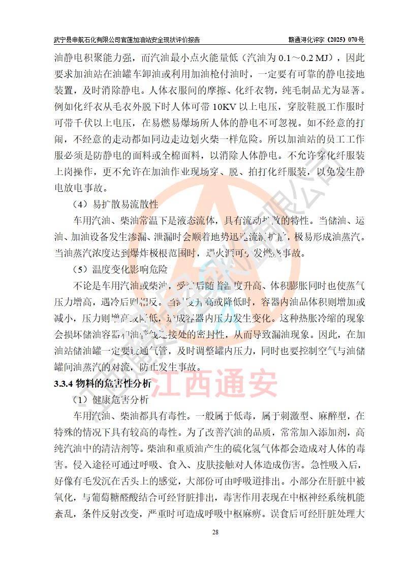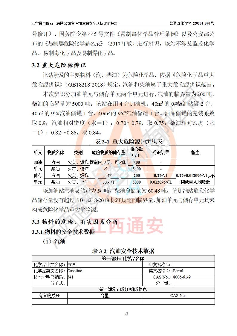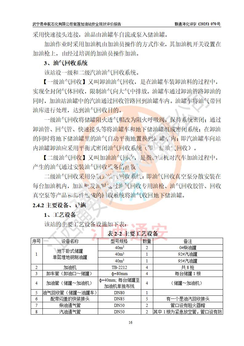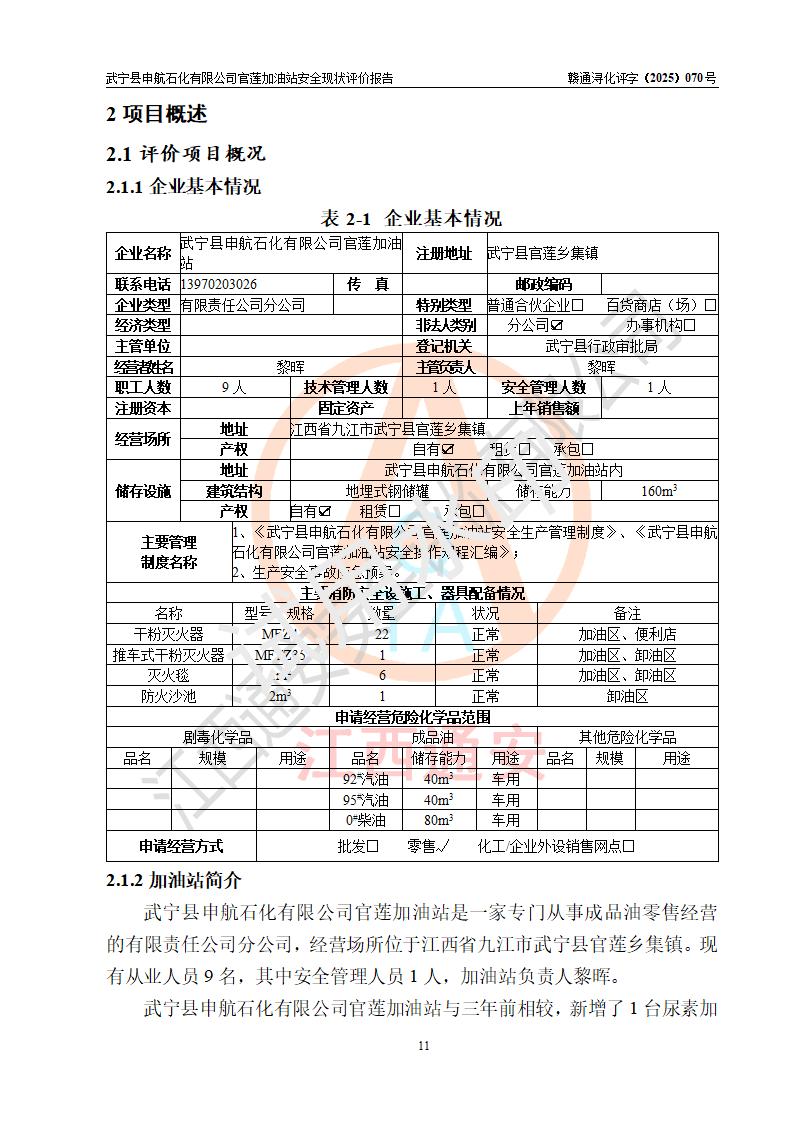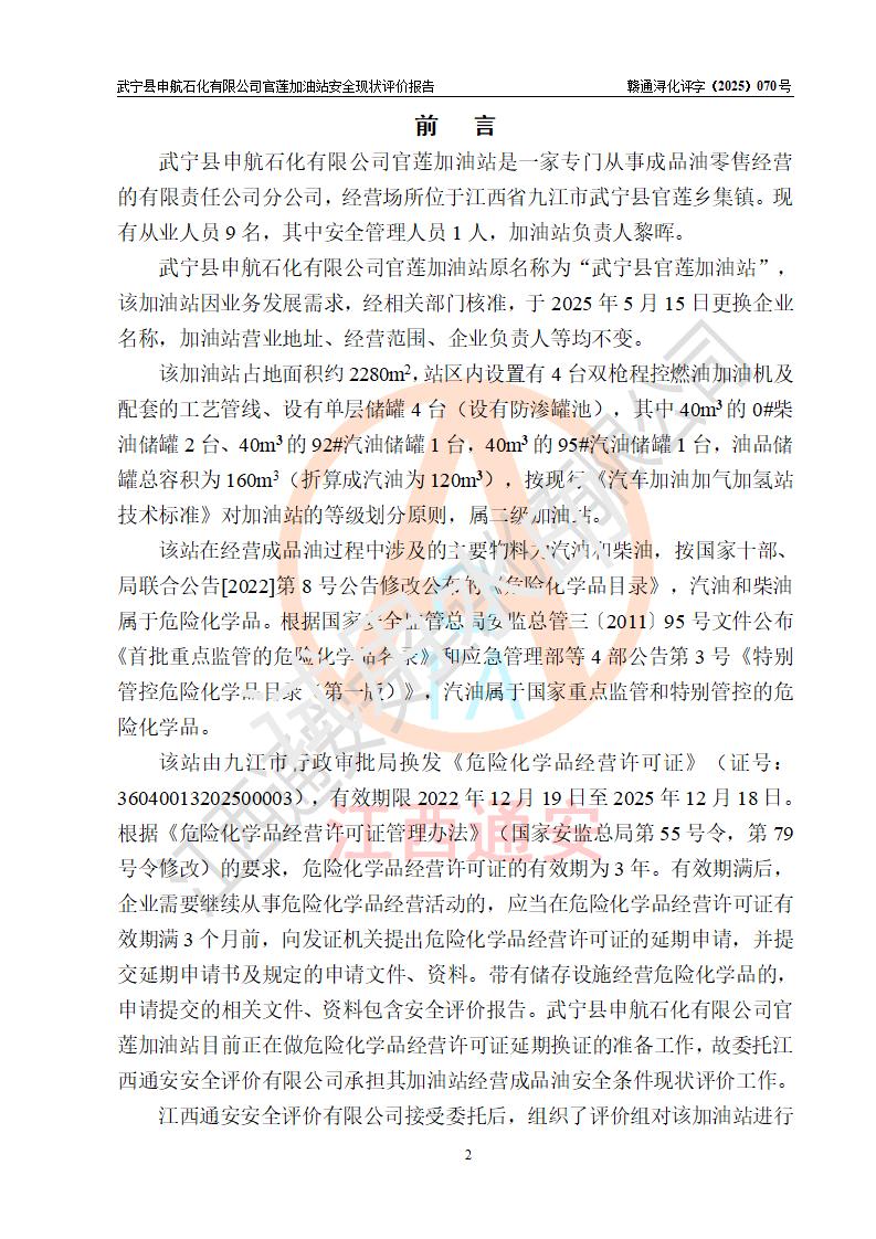 项目简介 | 武宁县申航石化有限公司官莲加油站是一家专门从事成品油零售经营的有限责任公司分公司,经营场所位于江西省九江市武宁县官莲乡集镇。现有从业人员9名,其中安全管理人员1人,加油站负责人黎晖。 该加油站占地面积约2280m2,站区内设置有4台双枪程控燃油加油机及配套的工艺管线、设有单层储罐4台(设有防渗罐池),其中40m3的0#柴油储罐2台、40m3的92#汽油储罐1台,40m3的95#汽油储罐1台,油品储罐总容积为160m3(折算成汽油为120m3),按现行《汽车加油加气加氢站技术标准》对加油站的等级划分原则,属二级加油站。 该站由九江市行政审批局换发《危险化学品经营许可证》(证号:36040013202500003),**期限2022年12月19日至2025年12月18日。 | |||