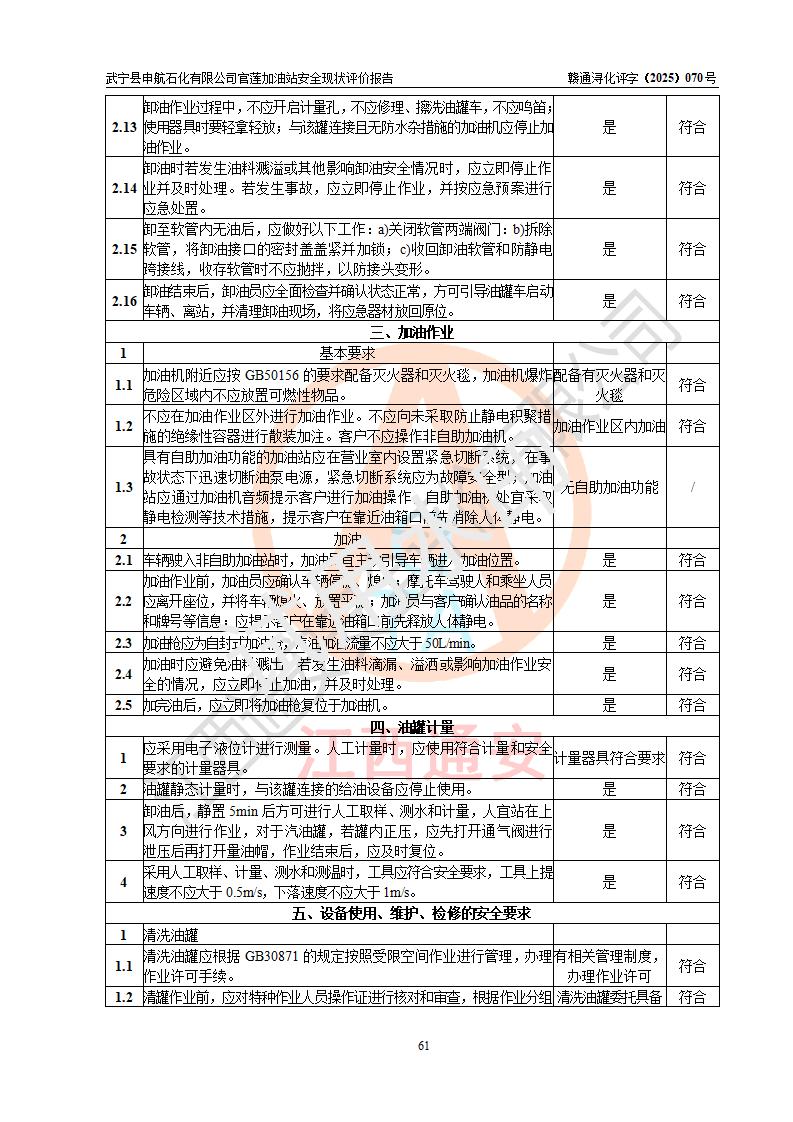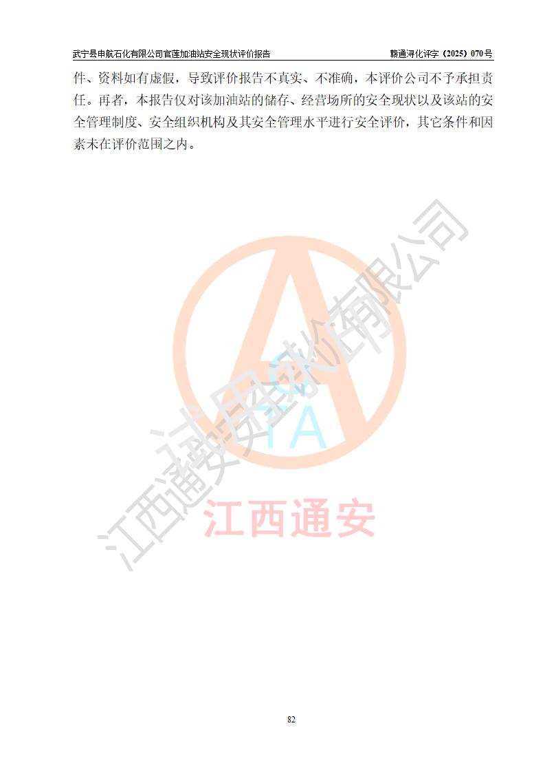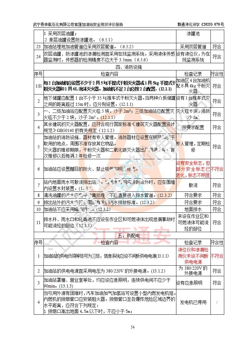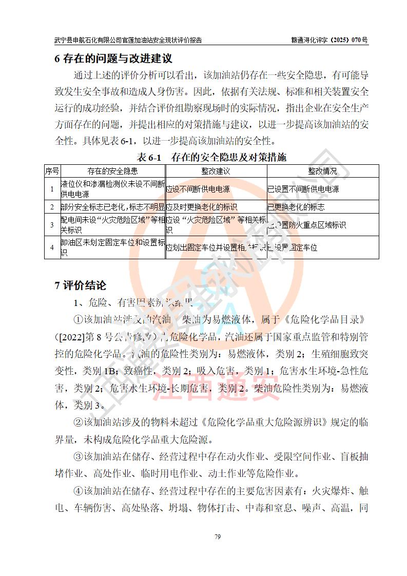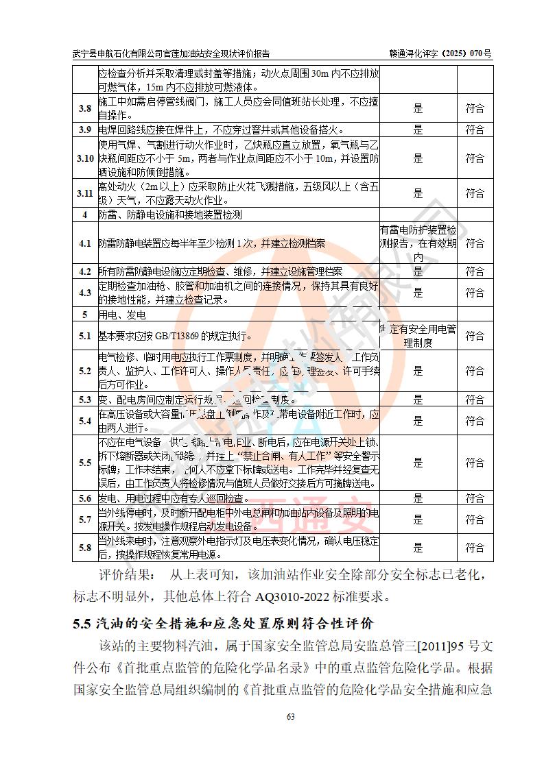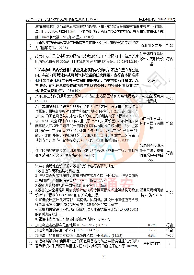 评价结论 | 武宁县申航石化有限公司官莲加油站涉及的安全条件、安全经营条件、安全生产管理符合《危险化学品经营许可证管理办法》、《汽车加油加气加氢站技术标准》等**有关法规、标准、规范要求,能满足危险化学品经营安全条件。 | |||