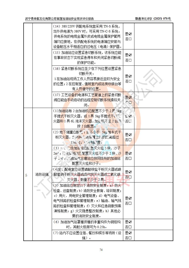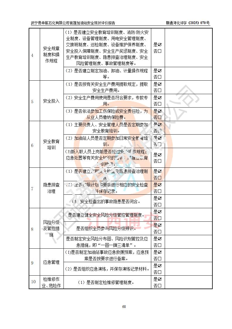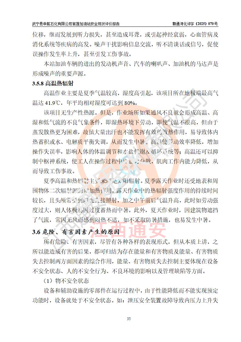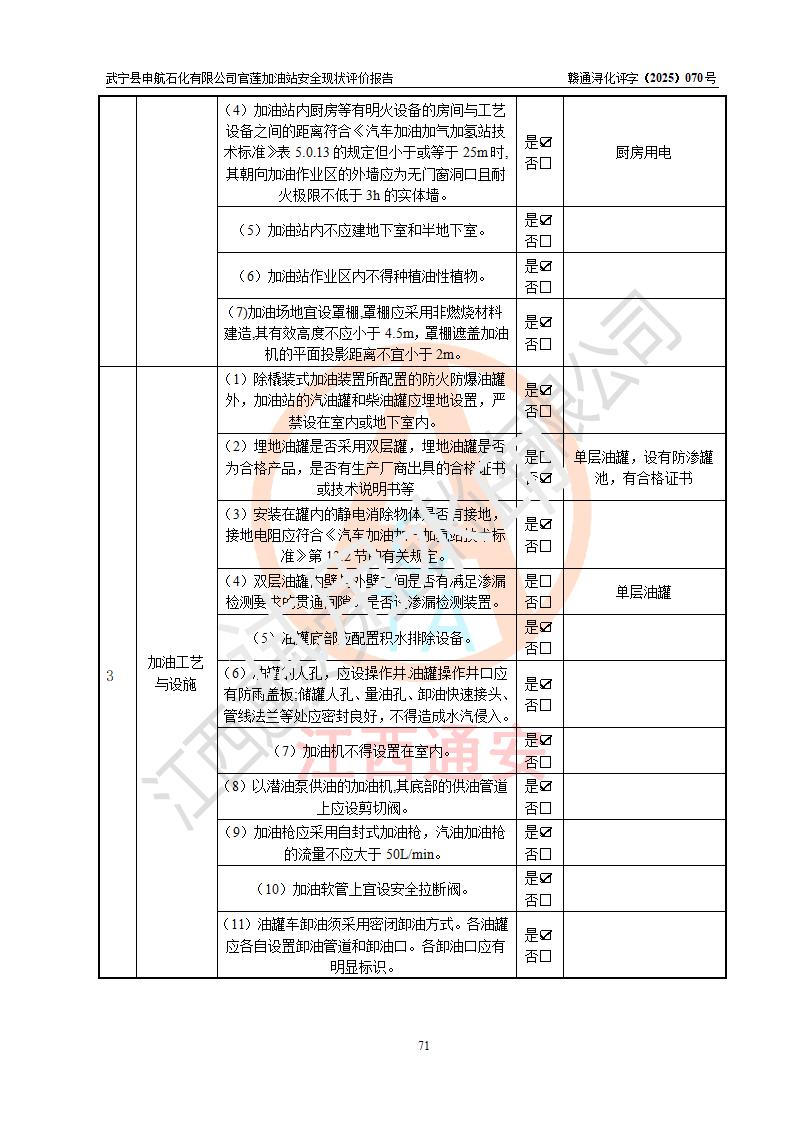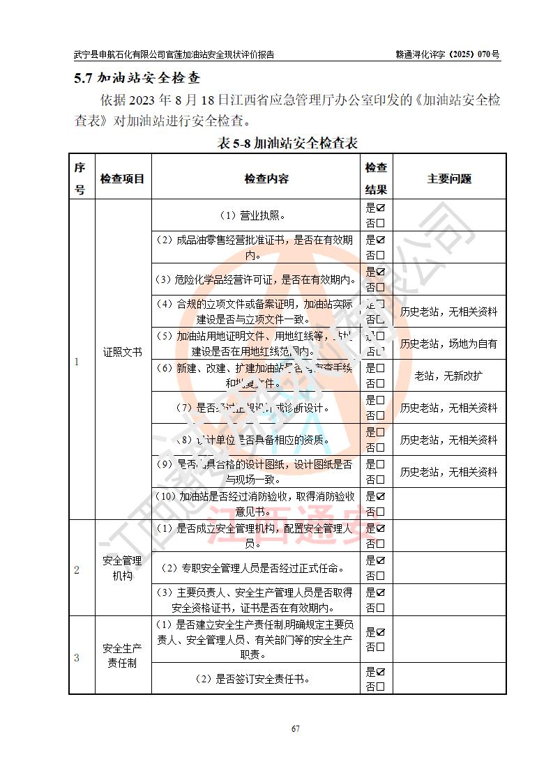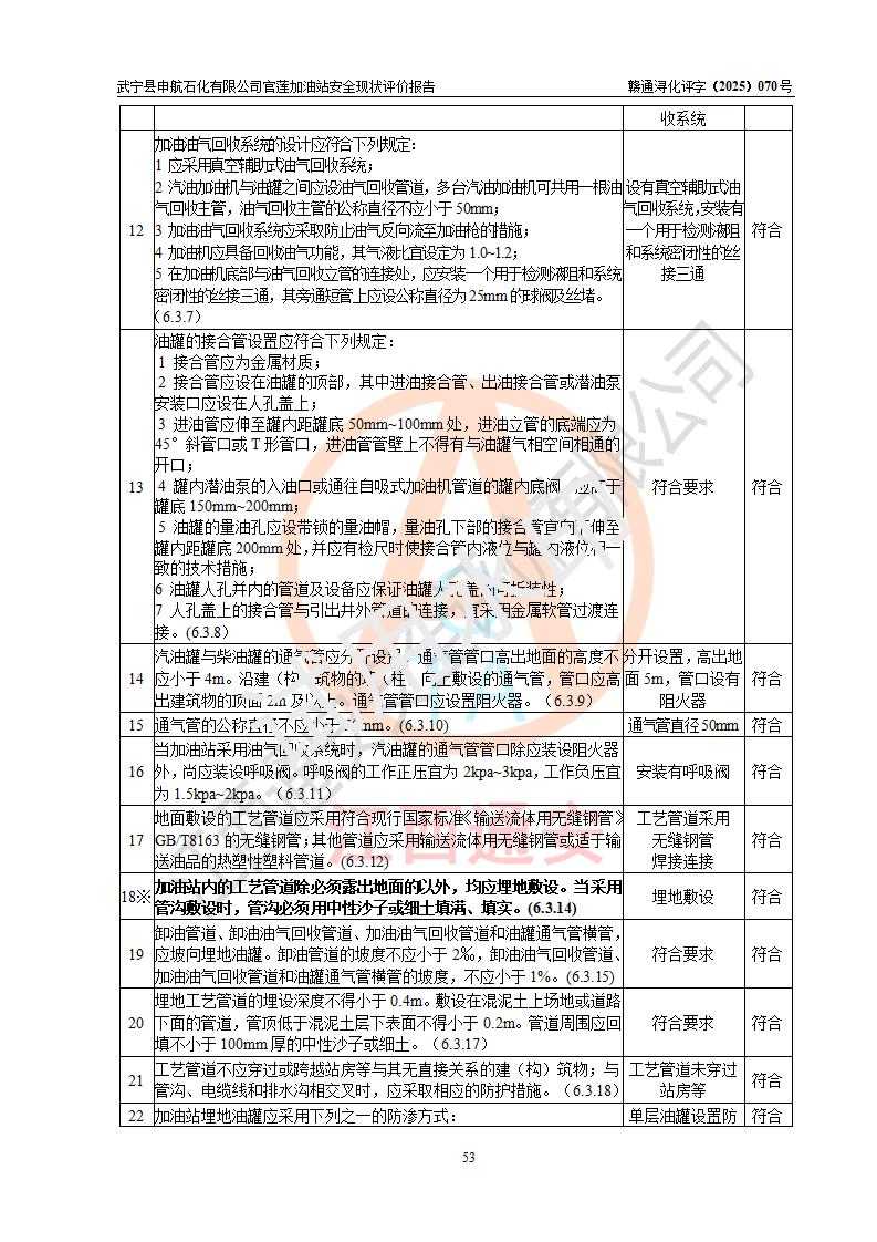 评价结论 | 武宁县申航石化有限公司官莲加油站涉及的安全条件、安全经营条件、安全生产管理符合《危险化学品经营许可证管理办法》、《汽车加油加气加氢站技术标准》等**有关法规、标准、规范要求,能满足危险化学品经营安全条件。 | |||