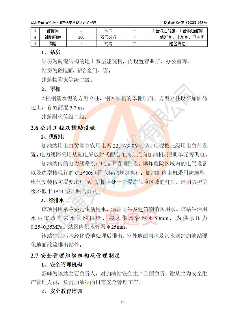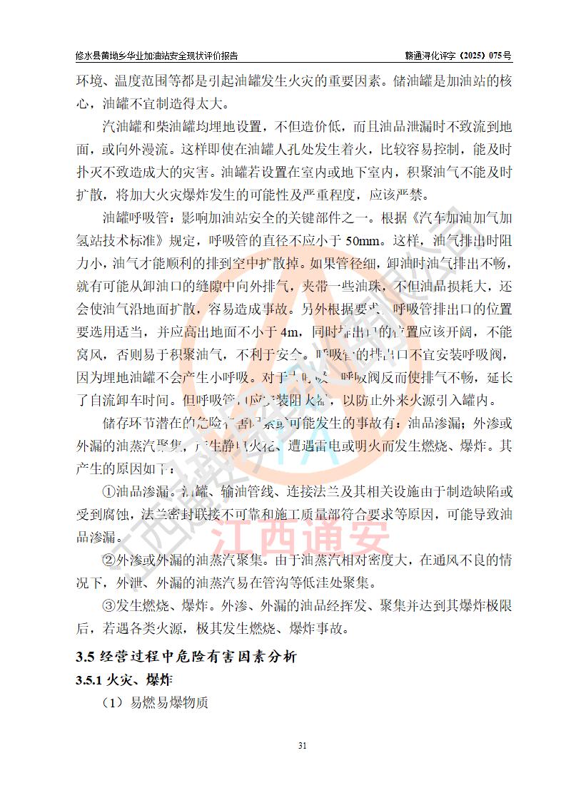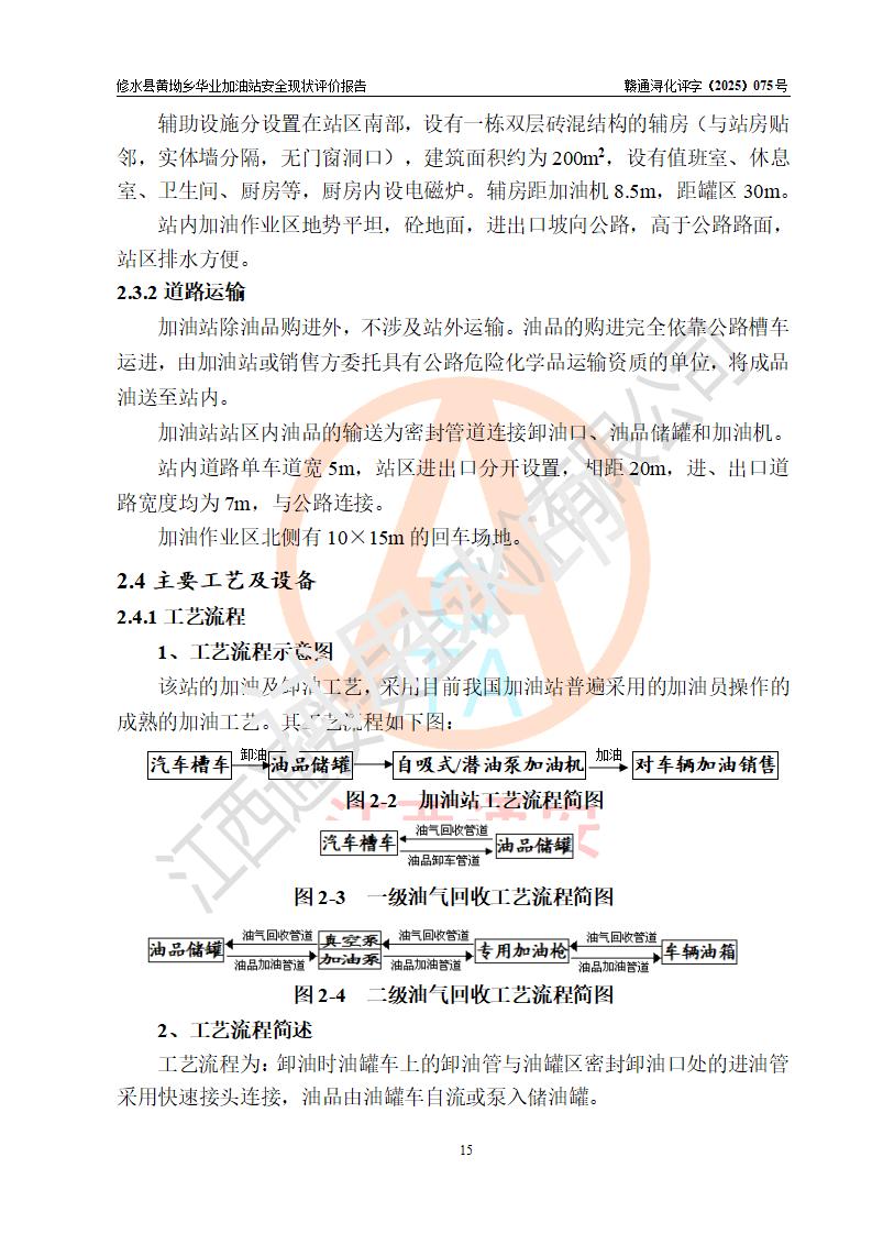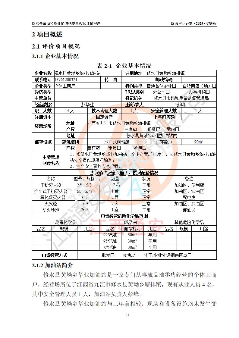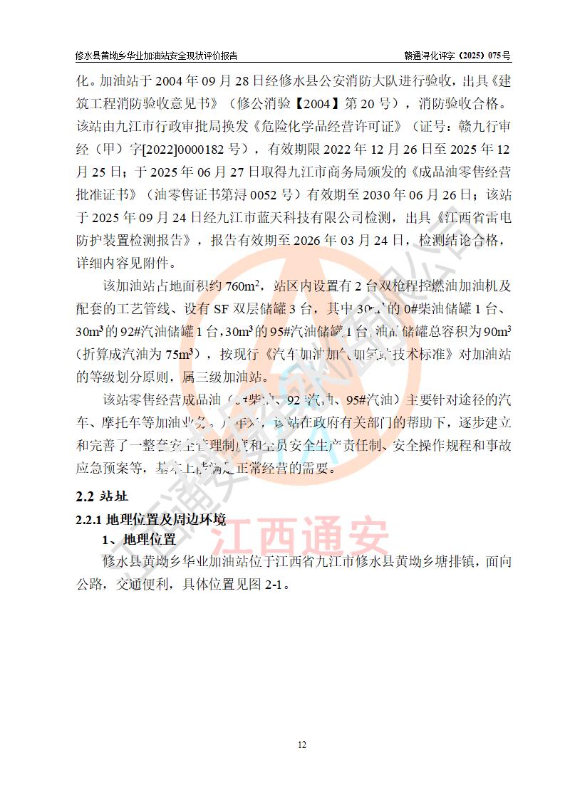 项目简介 | 修水县黄坳乡华业加油站是一家专门从事成品油零售经营的个体工商户,经营场所位于江西省九江市修水县黄坳乡塘排镇。现有从业人员4名,其中安全管理人员1人,加油站负责人彭峰。 该加油站占地面积约760m2,站区内设置有2台双枪程控燃油加油机及配套的工艺管线、设有SF双层储罐3台,其中30m3的0#柴油储罐1台、30m3的92#汽油储罐1台,30m3的95#汽油储罐1台,油品储罐总容积为90m3(折算成汽油为75m3),按现行《汽车加油加气加氢站技术标准》对加油站的等级划分原则,属三级加油站。 该站由九江市行政审批局换发《危险化学品经营许可证》(证号:赣九行审经(甲)字[2022]0000182号),**期限2022年12月26日至2025年12月25日。 | |||