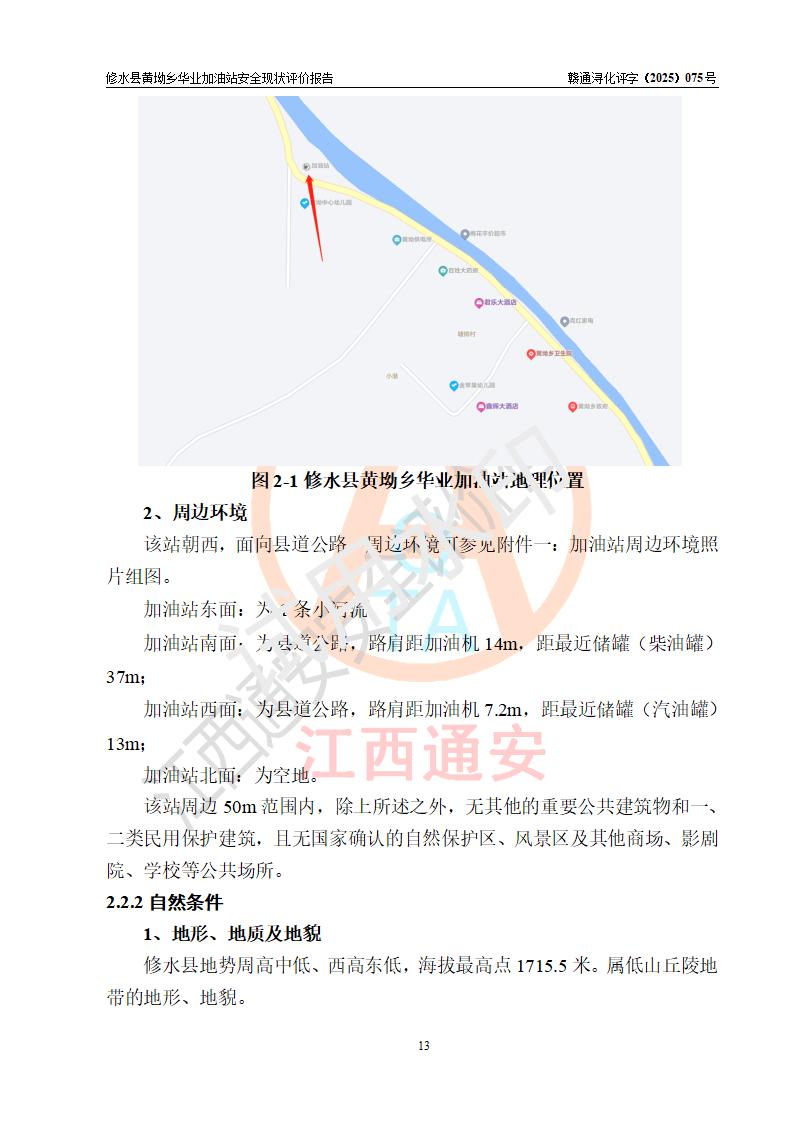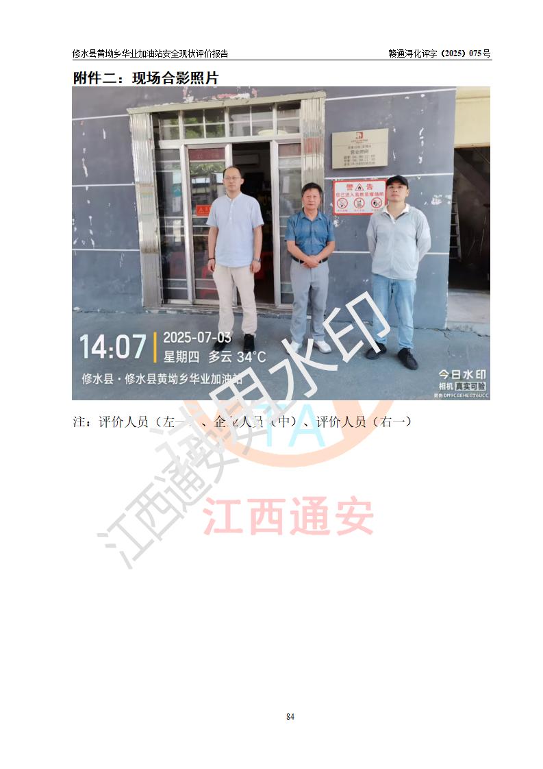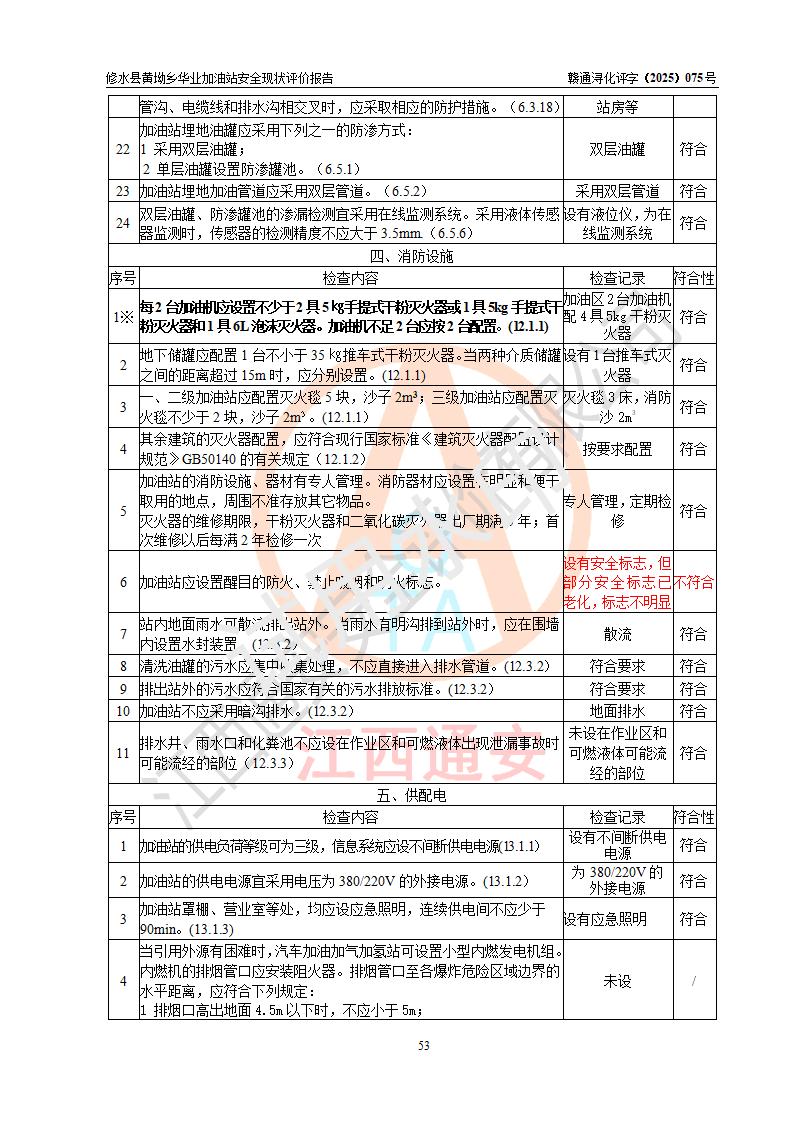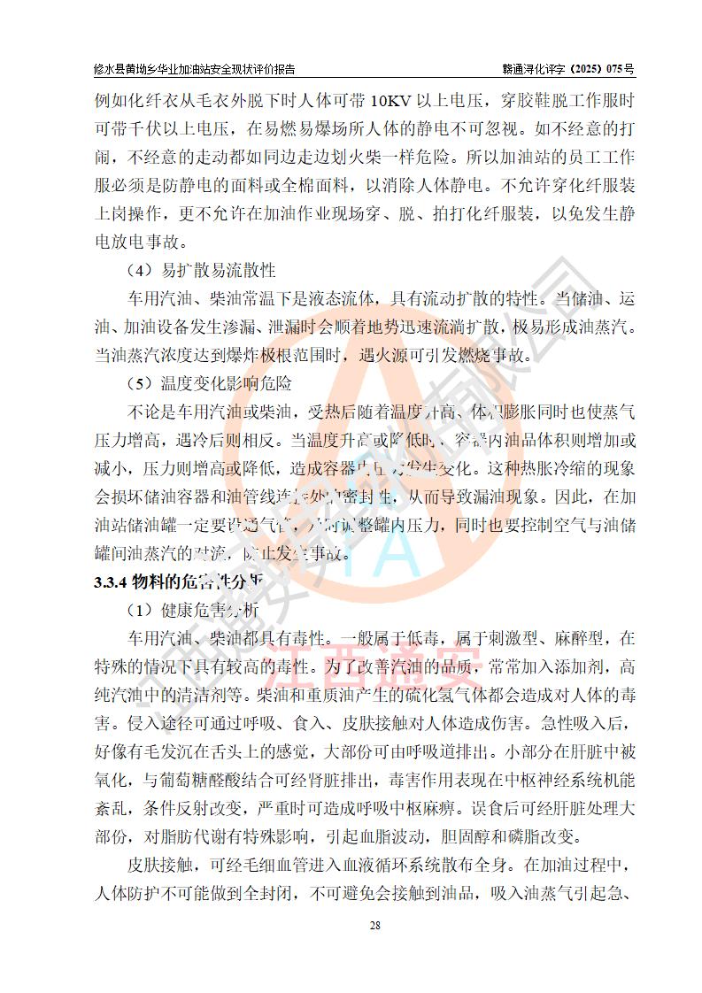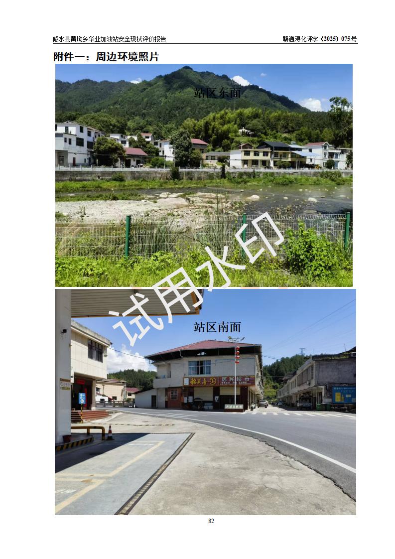 项目简介 | 修水县黄坳乡华业加油站是一家专门从事成品油零售经营的个体工商户,经营场所位于江西省九江市修水县黄坳乡塘排镇。现有从业人员4名,其中安全管理人员1人,加油站负责人彭峰。 该加油站占地面积约760m2,站区内设置有2台双枪程控燃油加油机及配套的工艺管线、设有SF双层储罐3台,其中30m3的0#柴油储罐1台、30m3的92#汽油储罐1台,30m3的95#汽油储罐1台,油品储罐总容积为90m3(折算成汽油为75m3),按现行《汽车加油加气加氢站技术标准》对加油站的等级划分原则,属三级加油站。 该站由九江市行政审批局换发《危险化学品经营许可证》(证号:赣九行审经(甲)字[2022]0000182号),**期限2022年12月26日至2025年12月25日。 | |||