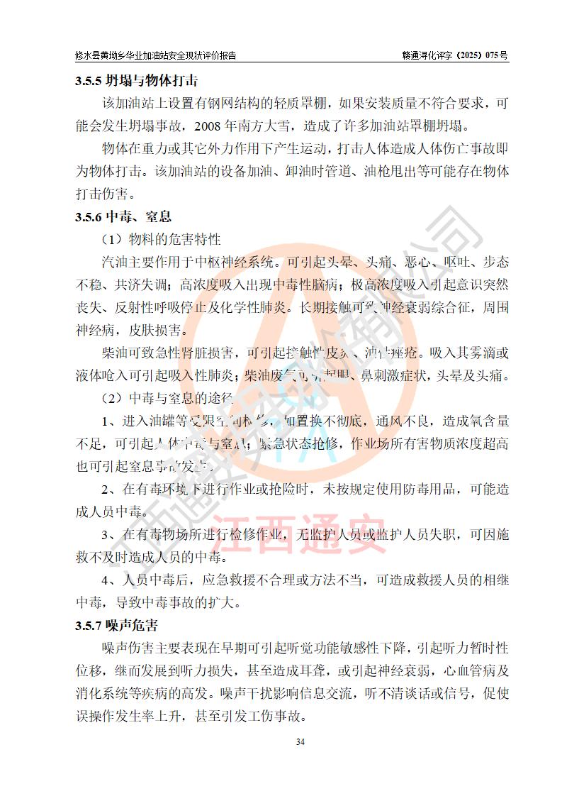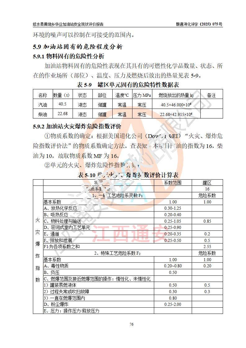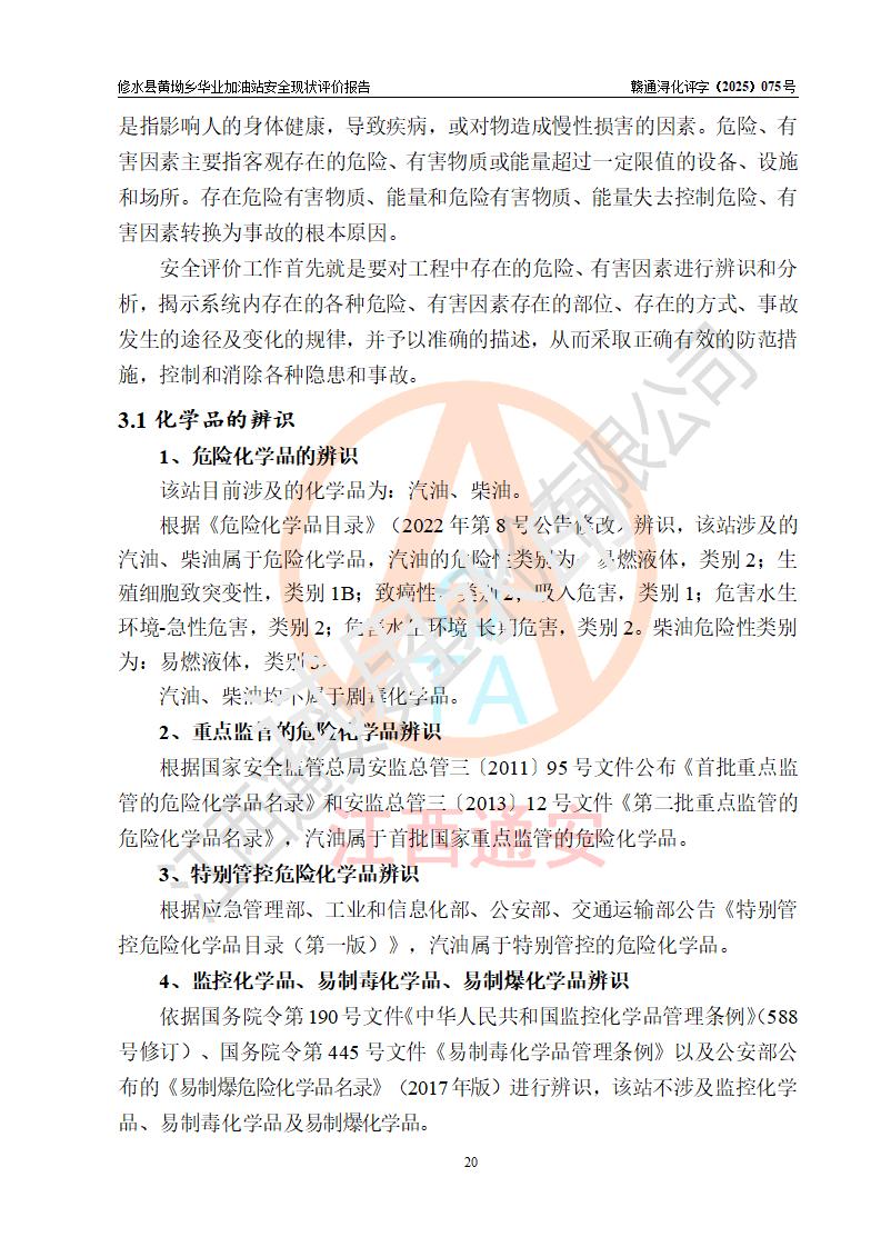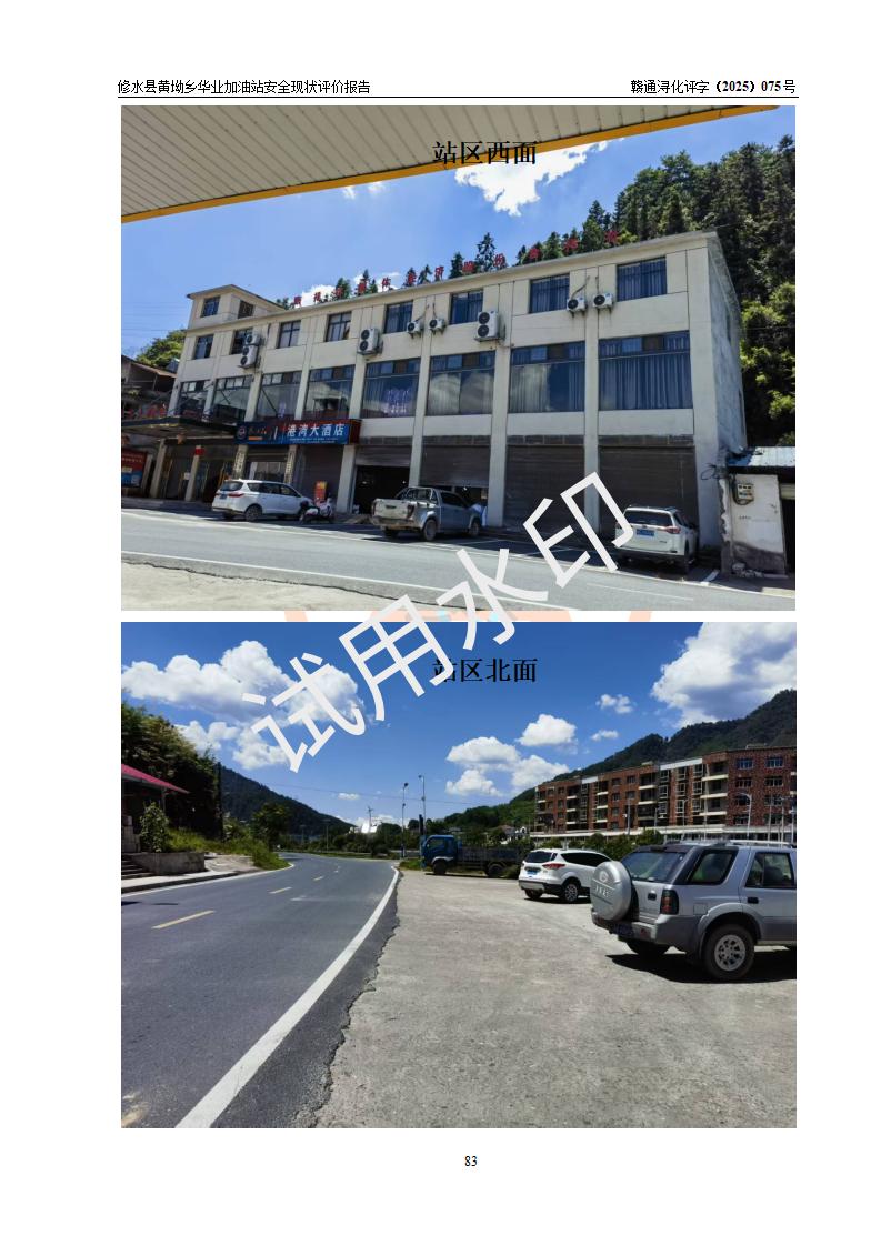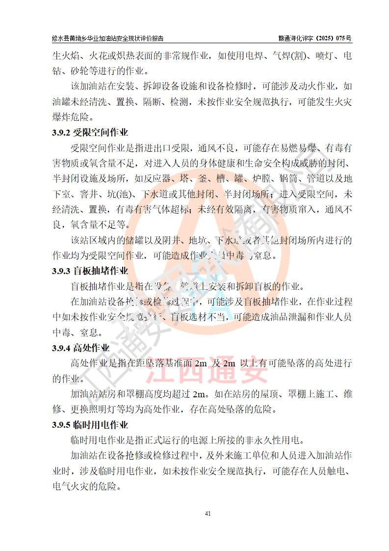 项目简介 | 修水县黄坳乡华业加油站是一家专门从事成品油零售经营的个体工商户,经营场所位于江西省九江市修水县黄坳乡塘排镇。现有从业人员4名,其中安全管理人员1人,加油站负责人彭峰。 该加油站占地面积约760m2,站区内设置有2台双枪程控燃油加油机及配套的工艺管线、设有SF双层储罐3台,其中30m3的0#柴油储罐1台、30m3的92#汽油储罐1台,30m3的95#汽油储罐1台,油品储罐总容积为90m3(折算成汽油为75m3),按现行《汽车加油加气加氢站技术标准》对加油站的等级划分原则,属三级加油站。 该站由九江市行政审批局换发《危险化学品经营许可证》(证号:赣九行审经(甲)字[2022]0000182号),**期限2022年12月26日至2025年12月25日。 | |||