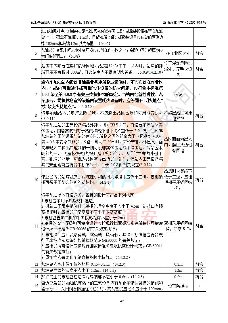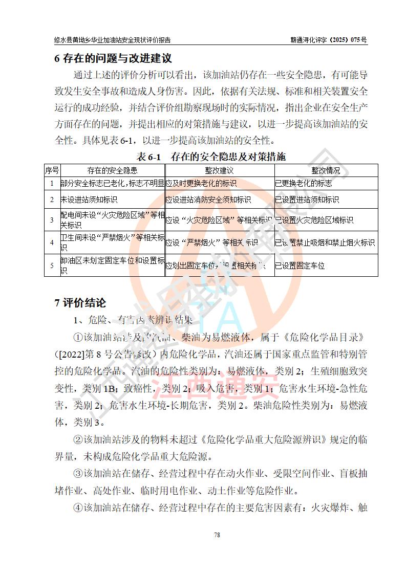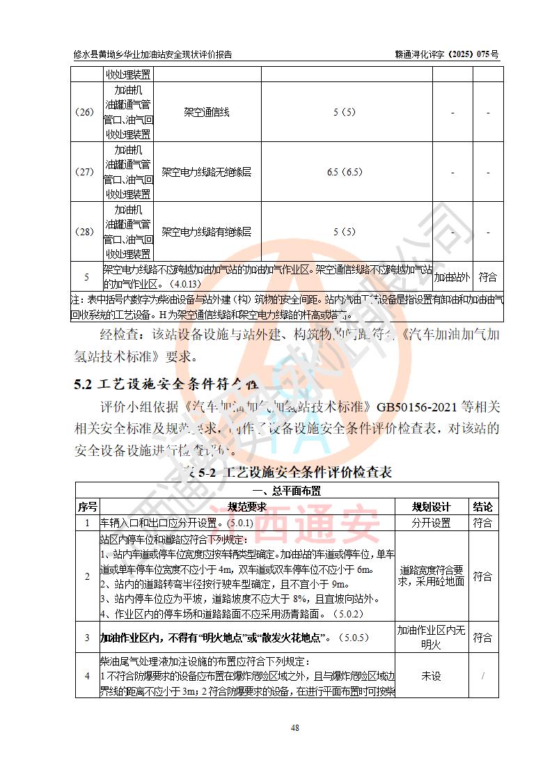 评价结论 | 修水县黄坳乡华业加油站涉及的安全条件、安全经营条件、安全生产管理符合《危险化学品经营许可证管理办法》、《汽车加油加气加氢站技术标准》等**有关法规、标准、规范要求,能满足危险化学品经营安全条件。 | |||